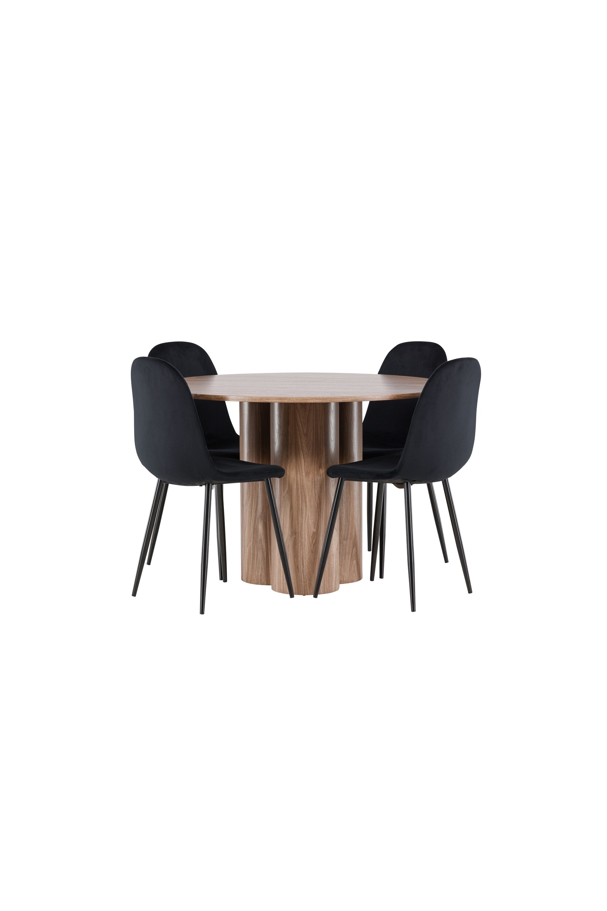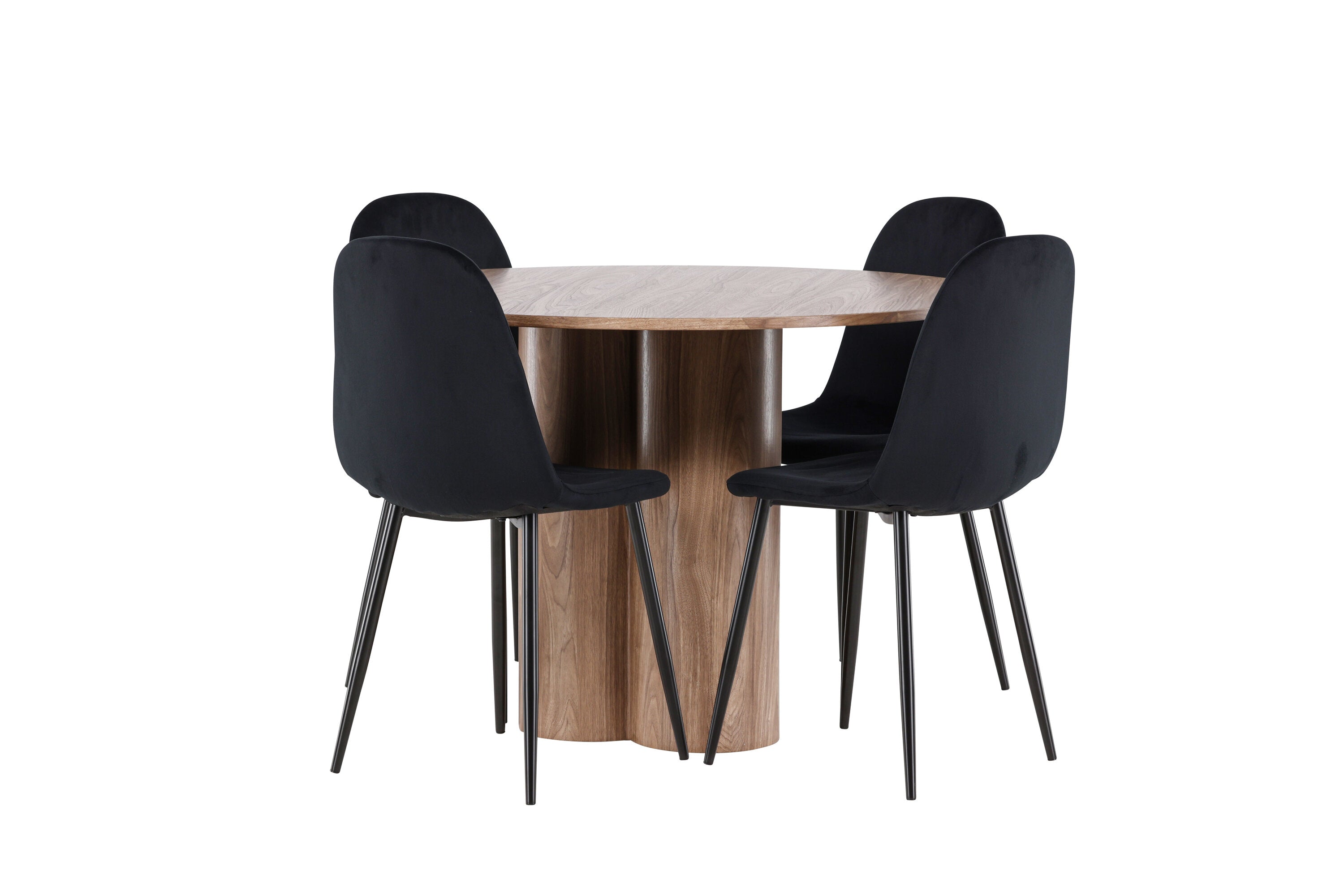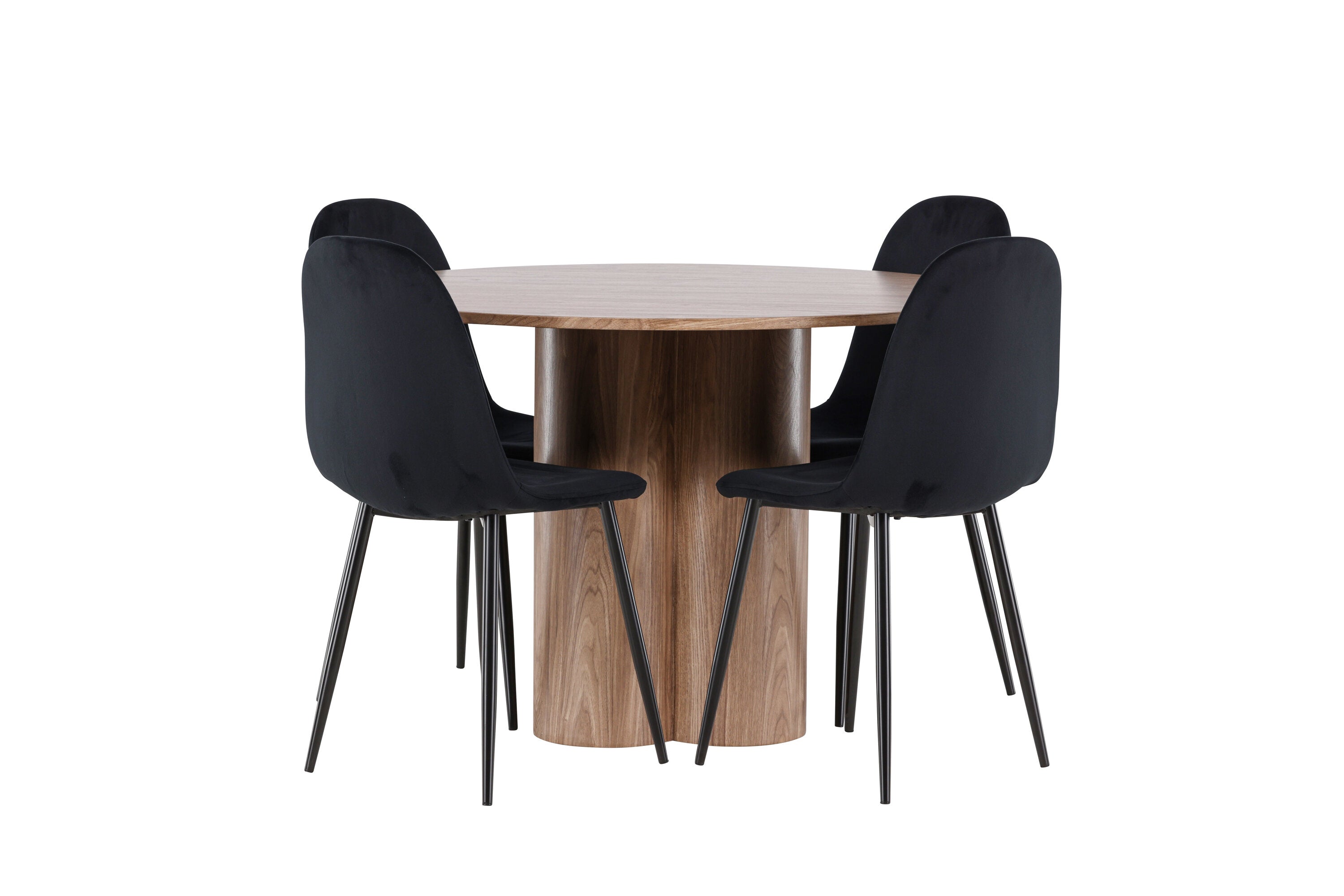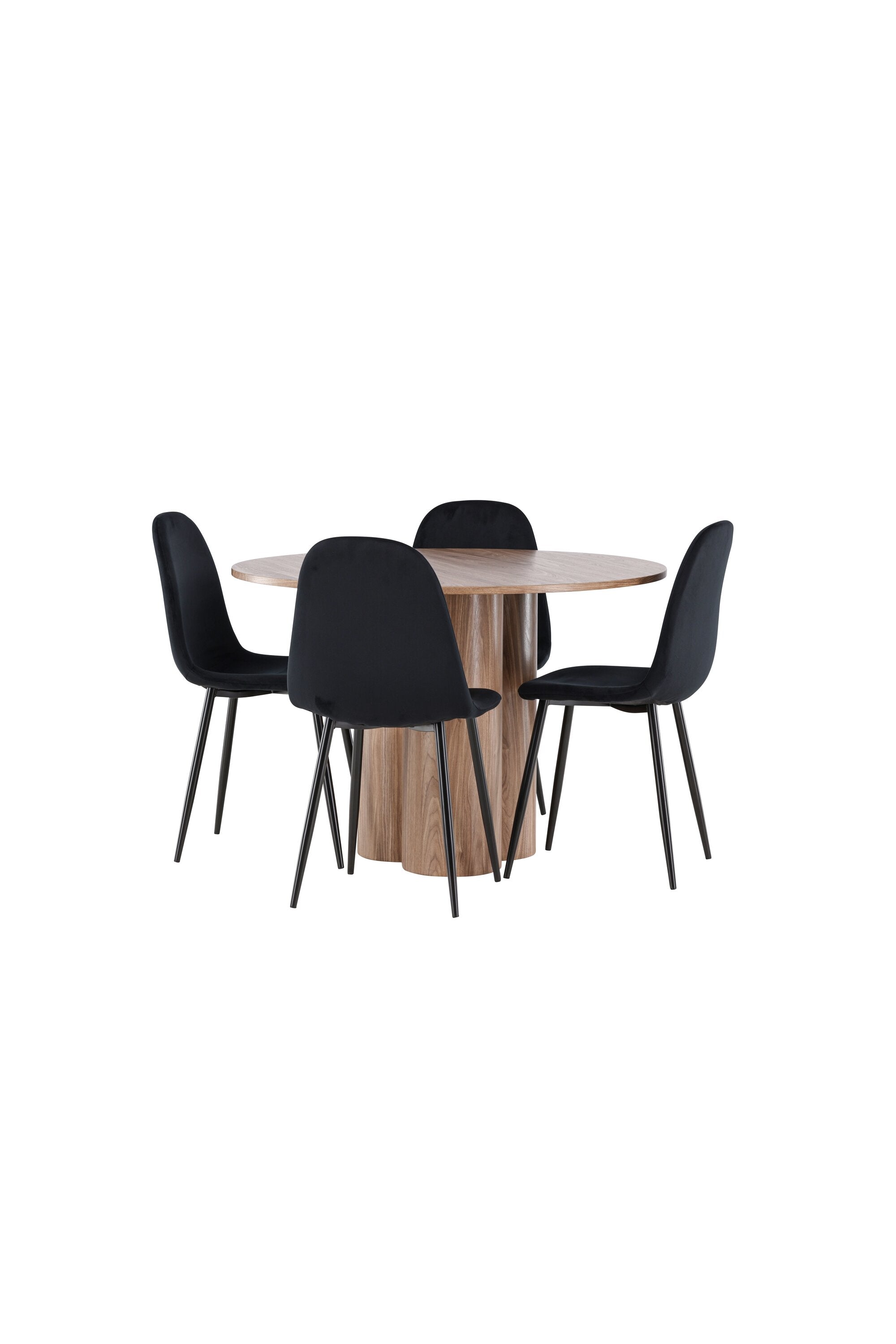 Proměňte svou jídelnu pomocí elegantního jídelního setu, který obsahuje stůl Olivia a židle Polar. Tato sofistikovaná kombinace moderního designu a luxusních materiálů vytváří dokonalé prostředí jak pro každodenní stolování, tak pro slavnostní příležitosti. Stůl Olivia je stylovým a nadčasovým doplňkem vašeho domova. Díky své mocha barvě a MDF konstrukci působí stůl teplým a příjemným dojmem. Deska stolu má průměr 110 cm, poskytuje dostatek prostoru pro pohodlné usazení čtyř osob a přitom je stále dostatečně kompaktní, aby se vešla i do menších prostor. Stůl Olivia stojí stabilně na pevné základně a snadno se čistí, takže je praktický i elegantní. Židle Polar svým luxusním designem doplňují stůl Olivia. Tyto židle jsou čalouněné černým sametem a mají elegantní černé nohy, které nabízejí exkluzivní a pohodlné sezení. Jemný samet v kombinaci s moka tónem stolu vytváří harmonickou a elegantní atmosféru ve vaší jídelně. Židle Polar jsou navrženy s ohledem na estetiku i pohodlí, takže jsou ideální pro dlouhé a příjemné večeře. S jídelním setem Olivia a židlemi Polar získáte kompletní jídelní kout, který kombinuje funkčnost s elegantním designem. Tato jídelní souprava se nepochybně stane ústředním bodem vašeho domova, kde se může scházet rodina a přátelé u lahodného jídla a příjemné společnosti.
