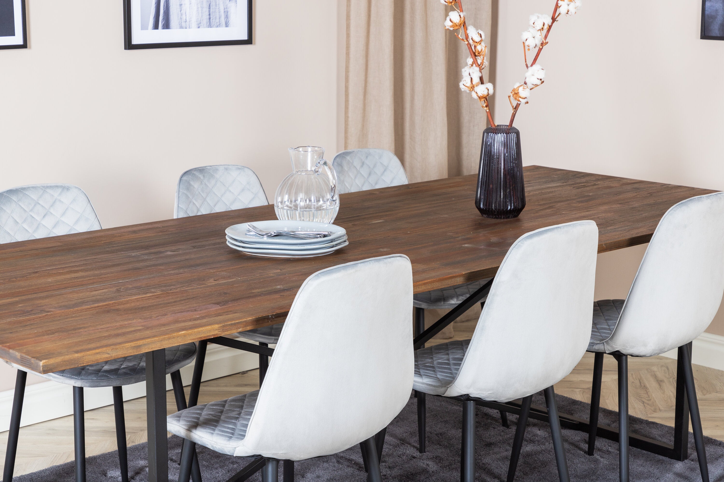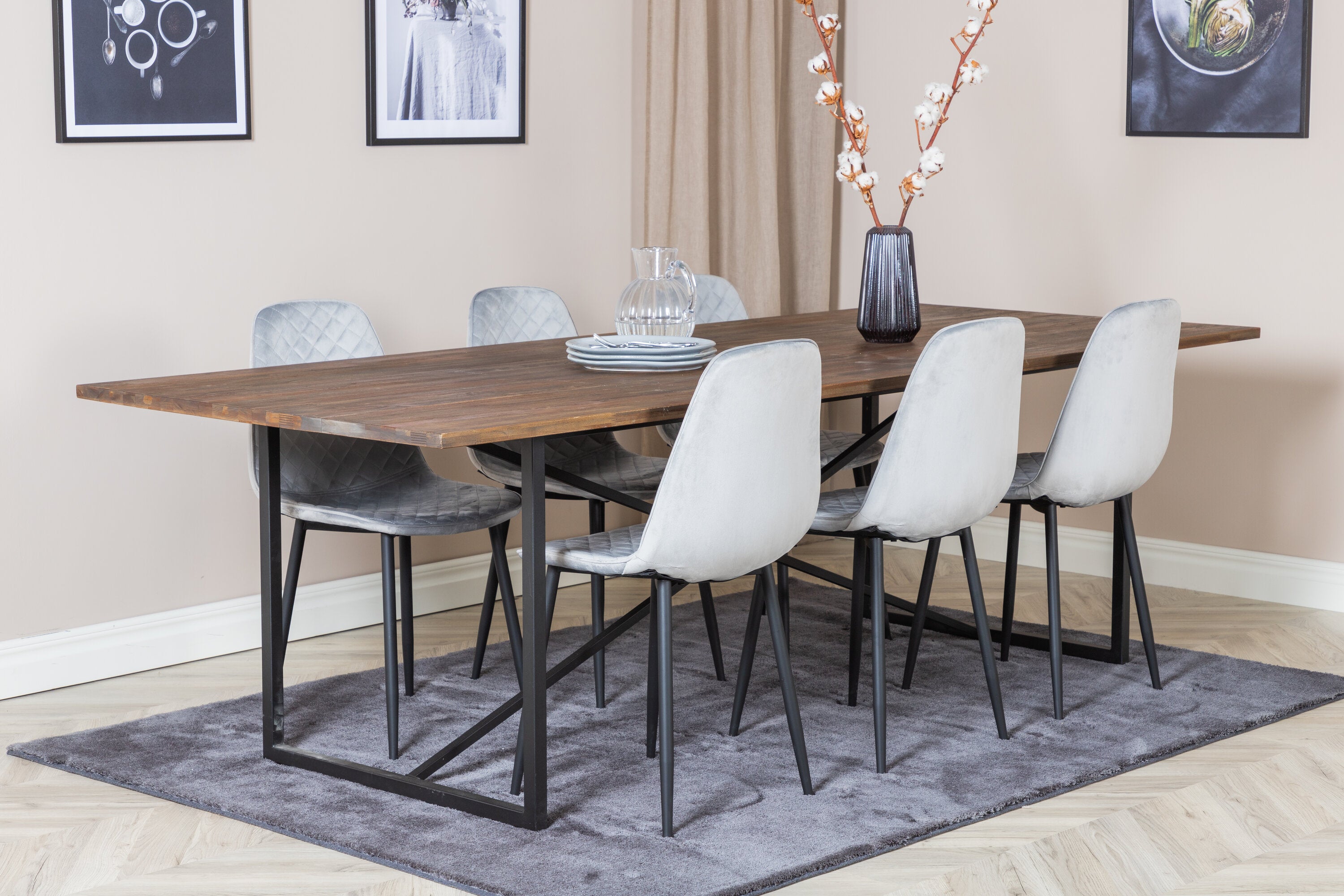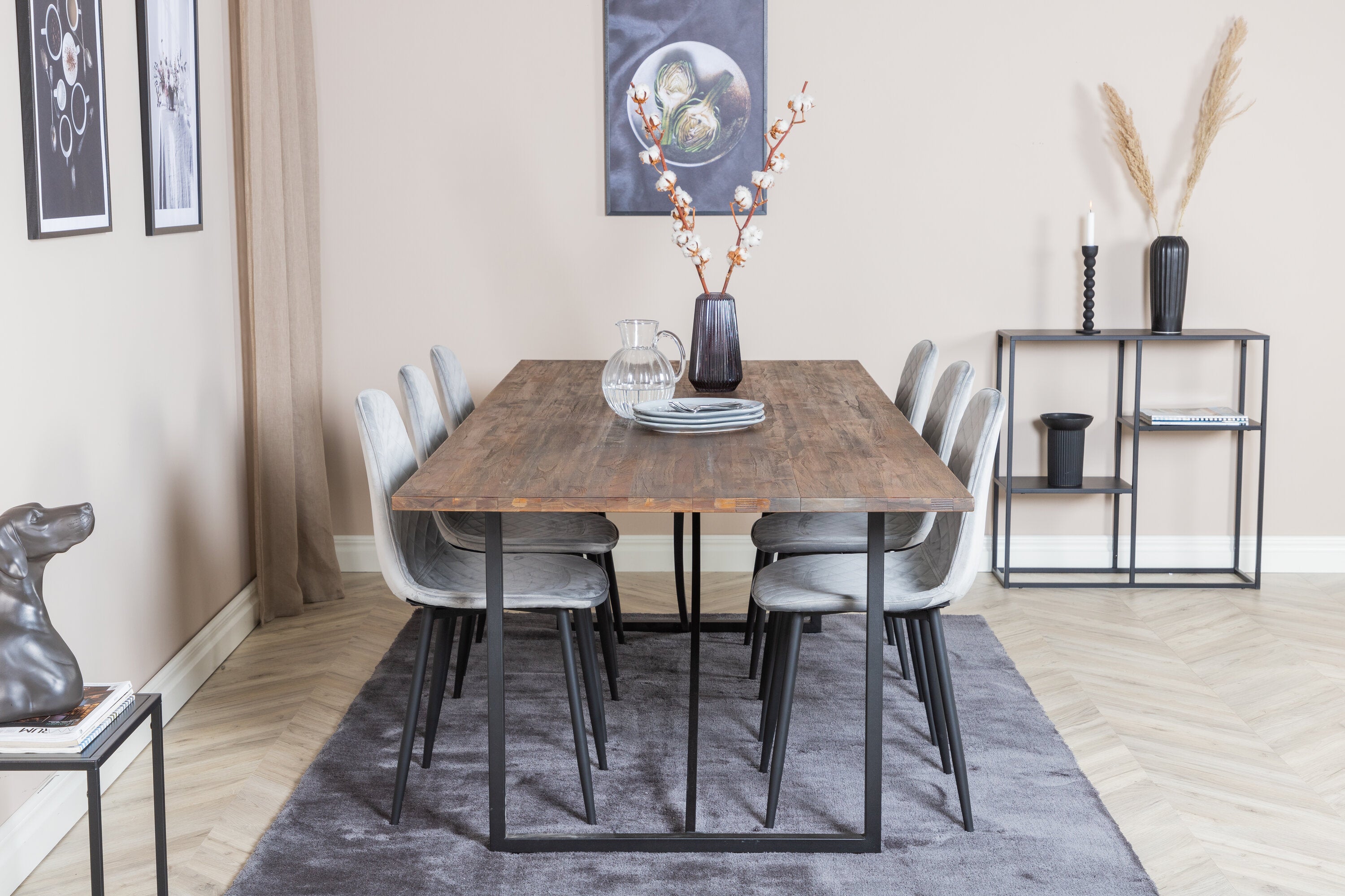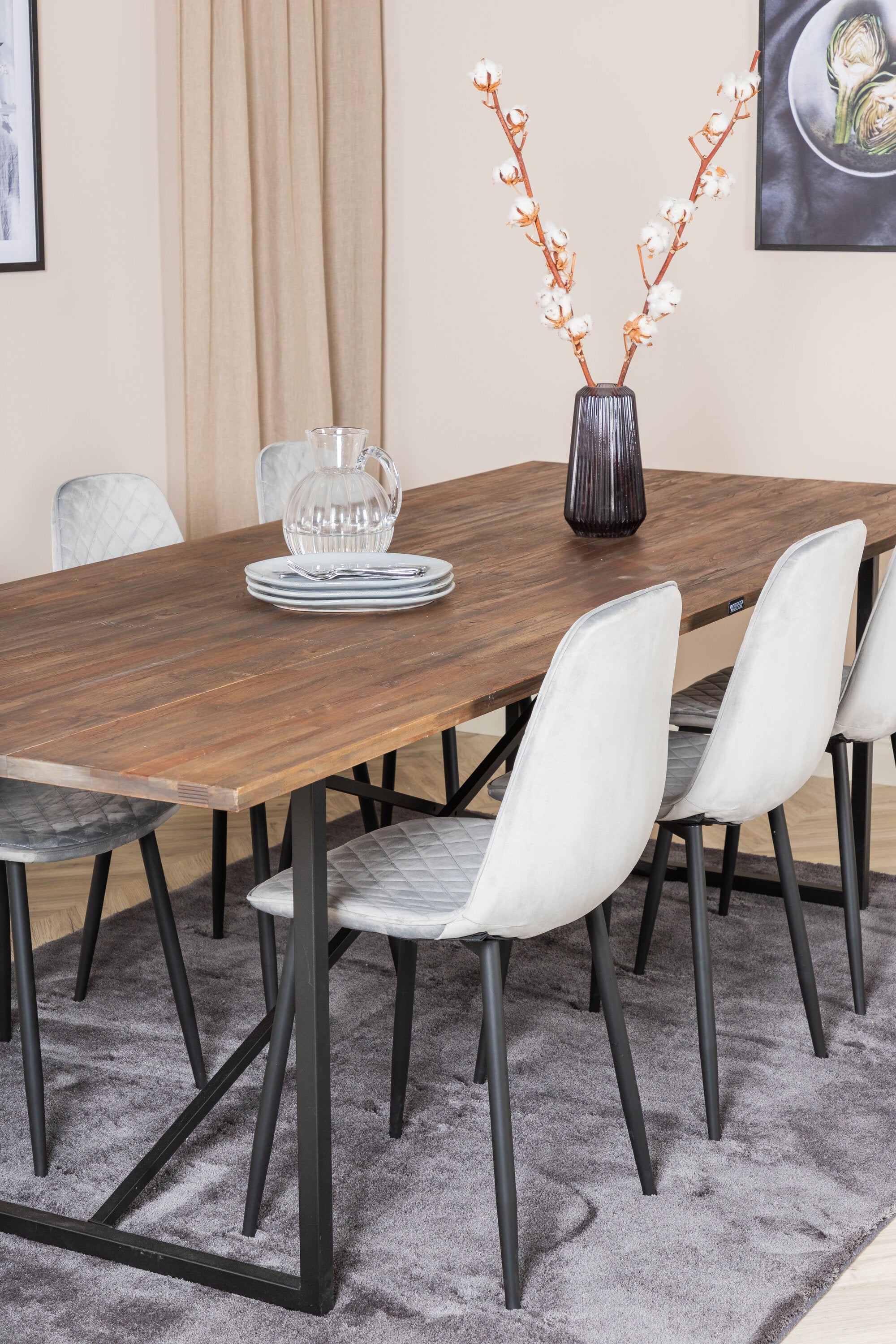 Jídelní stůl Padang - 250*100*H76 - Tmavý teak / Černá+Polar Diamond Jídelní židle - Černé nohy - Šedá Velvet_6