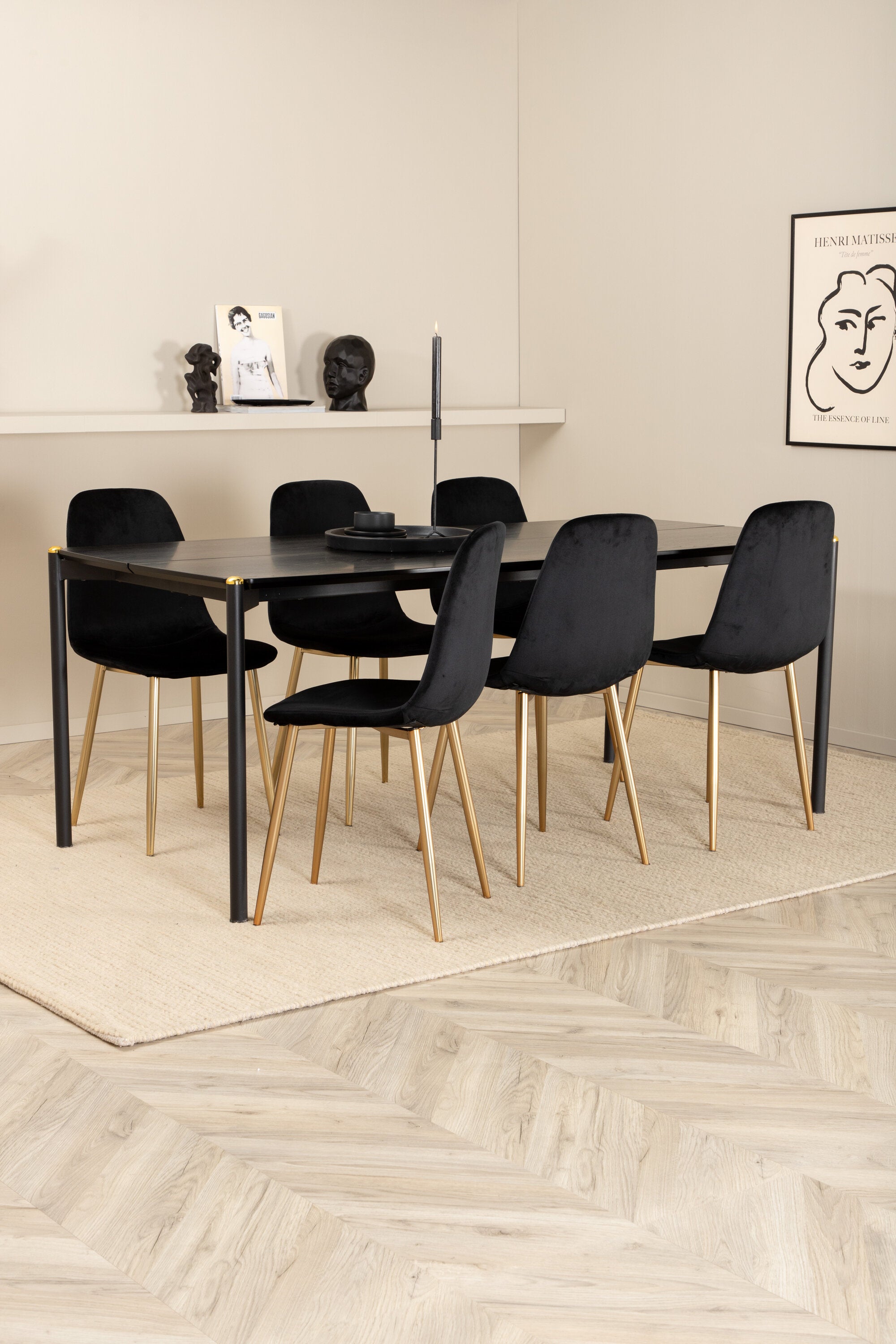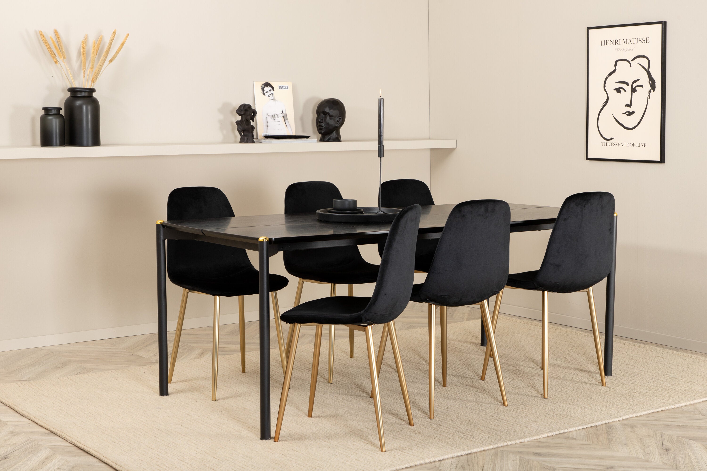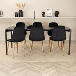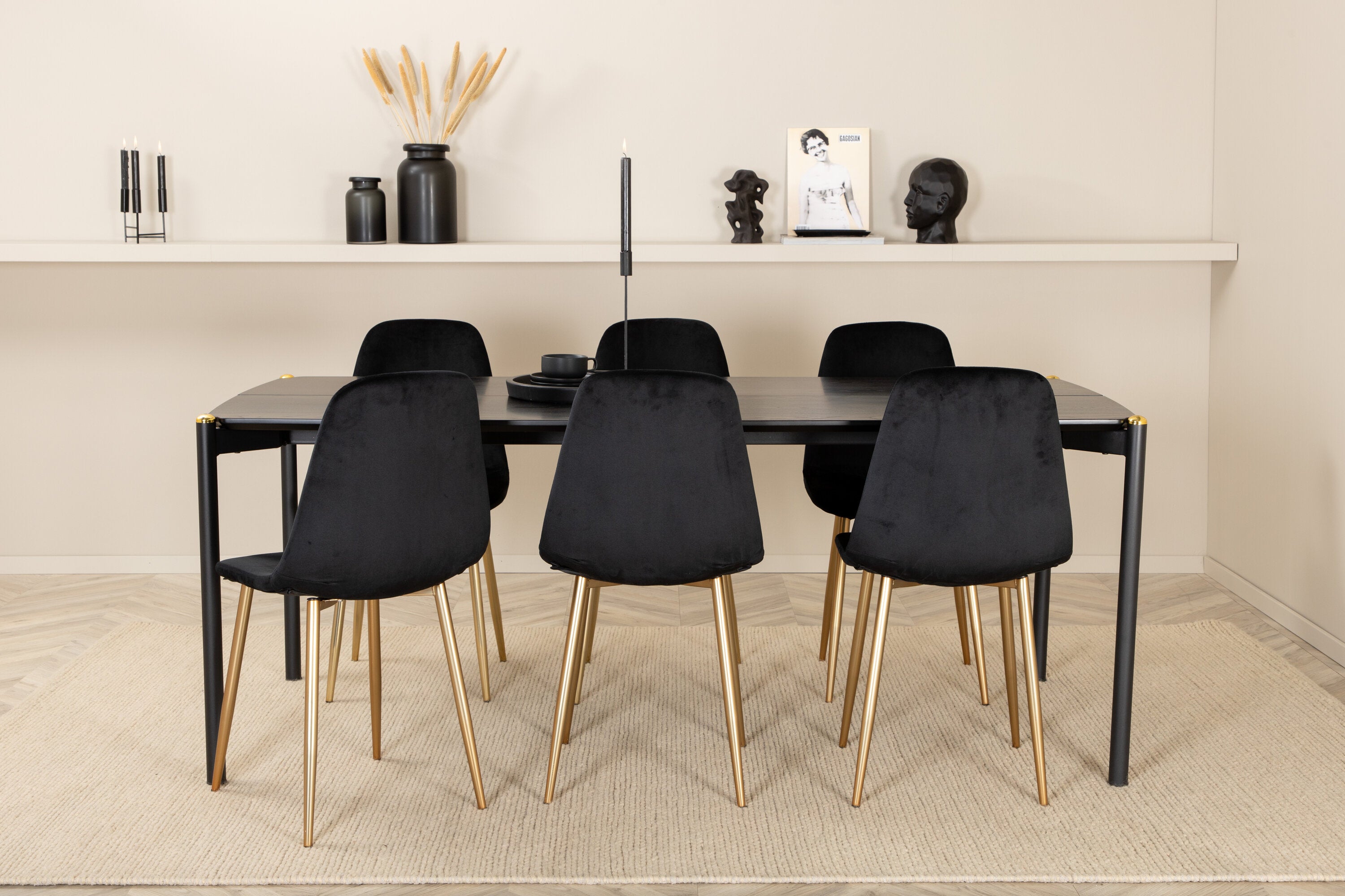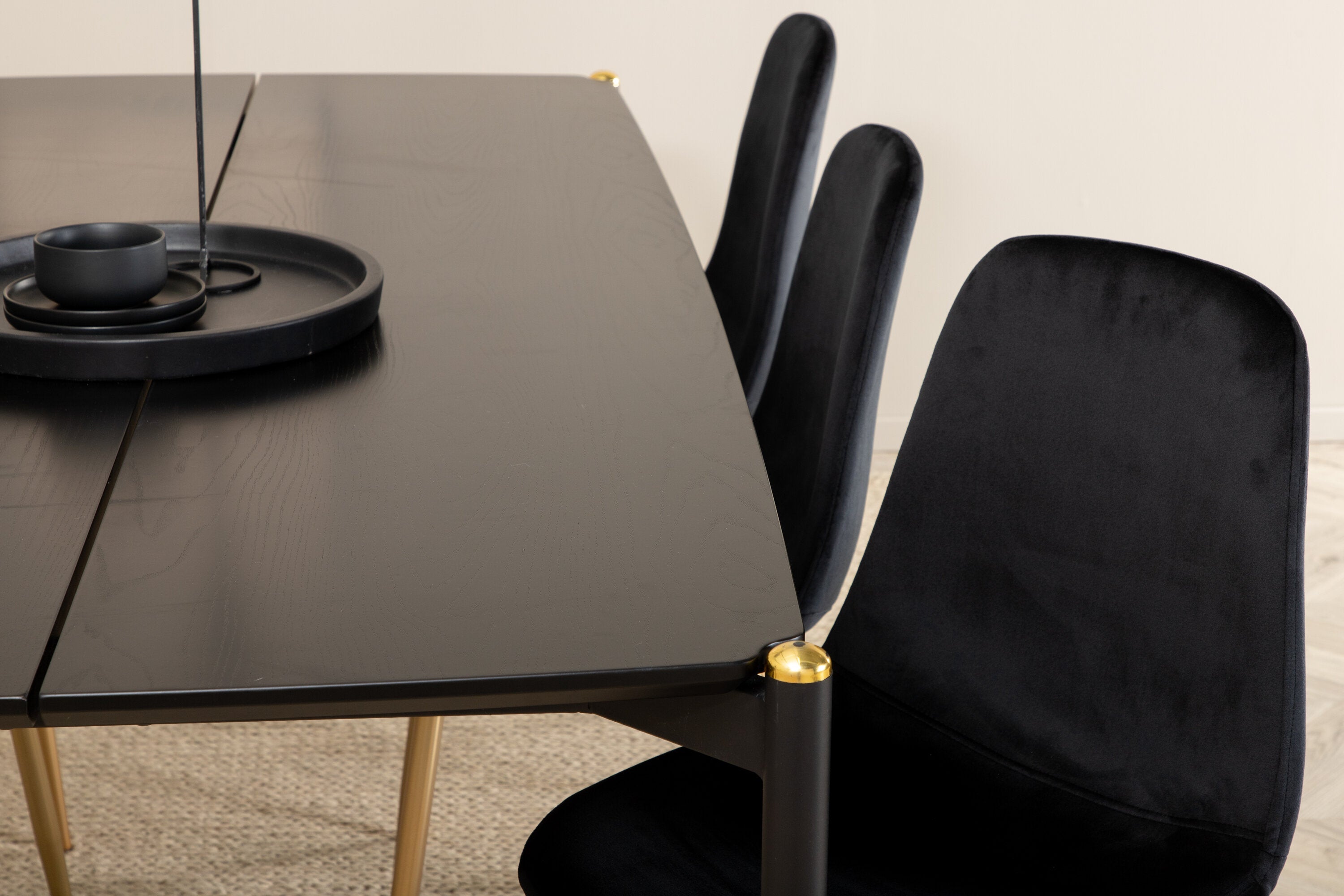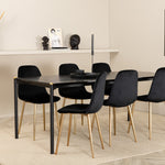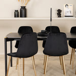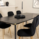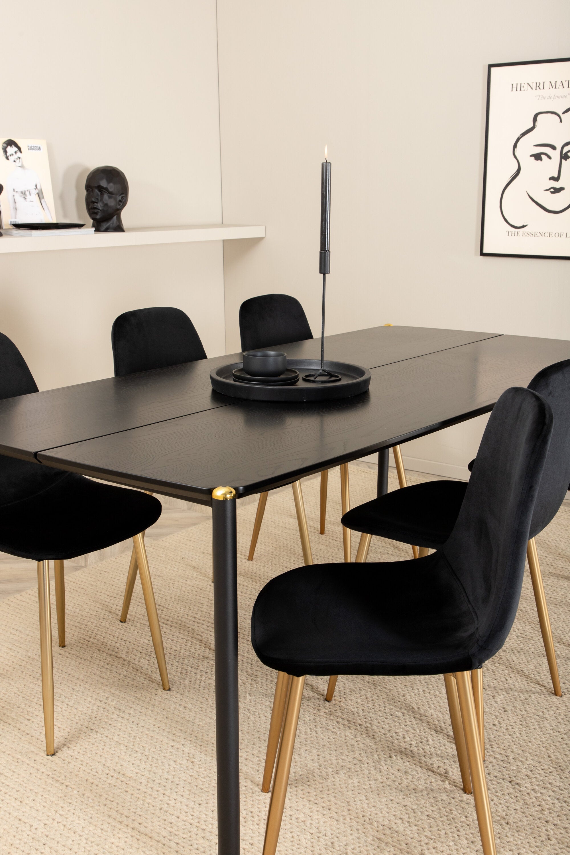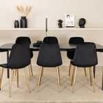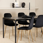 Stylový, luxusní a nadčasový - jídelní stůl Pelle působí u vás doma módním dojmem! Design je dobře promyšlený s rovnými severskými tvary, které dodávají stylový pocit, úzkými železnými nohami, které mají navrchu ozdobný mosazný pupen a výběžek uprostřed desky stolu, který se stává lahodným detailem. Deska stolu je z černé MDF s dýhou a rozměry stolu: délka: 190 cm, šířka: 90 cm, výška: 75 cm. Sladěno se 6 jídelními židlemi Polar s kovovými kostmi v barvě mosazi a černými sedáky ze sametu. Rozměry židle: výška: 86 cm, výška sedáku: 48 cm, šířka: 44 cm, hloubka: 52 cm.