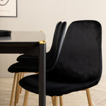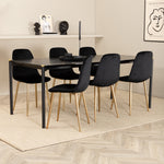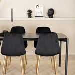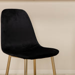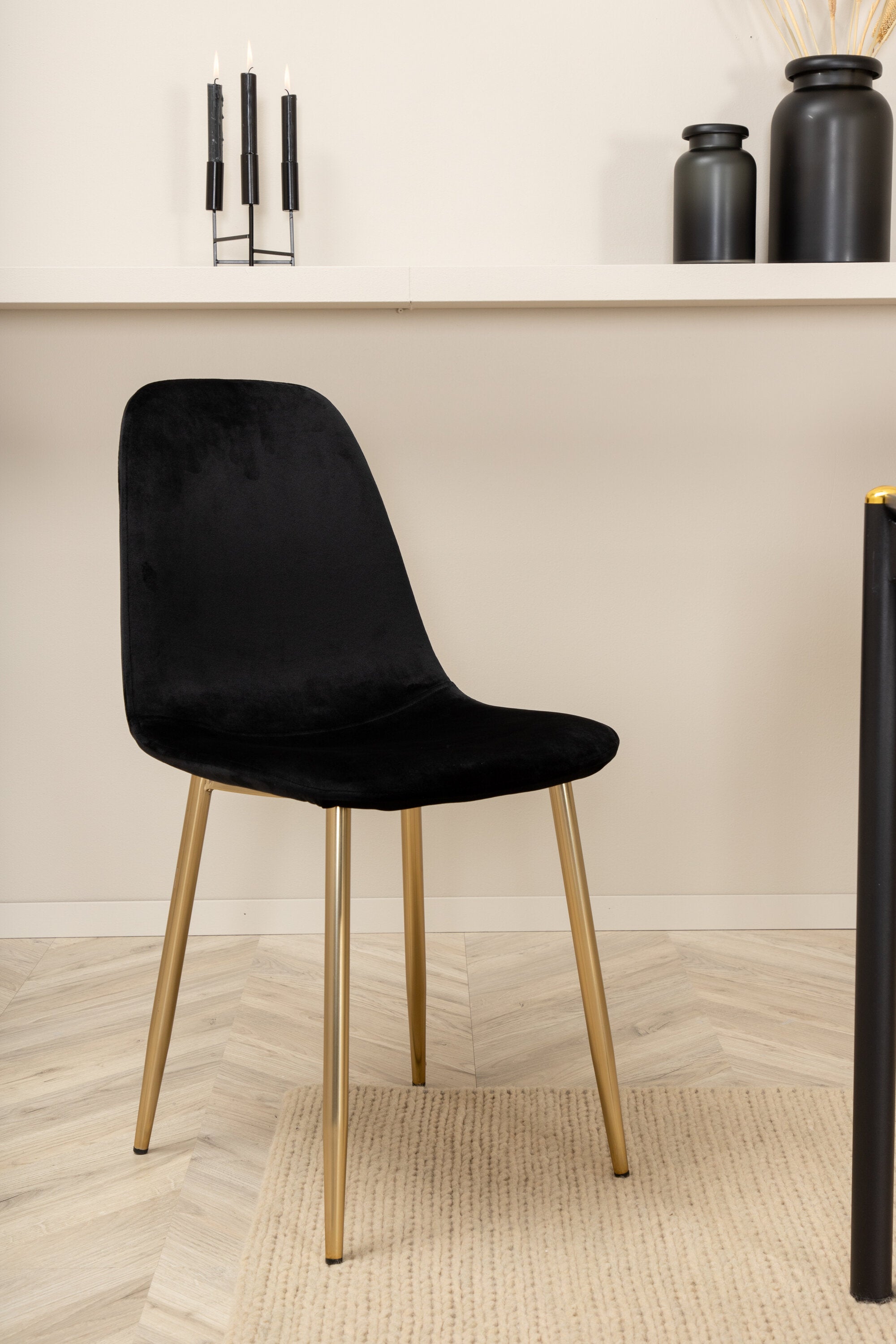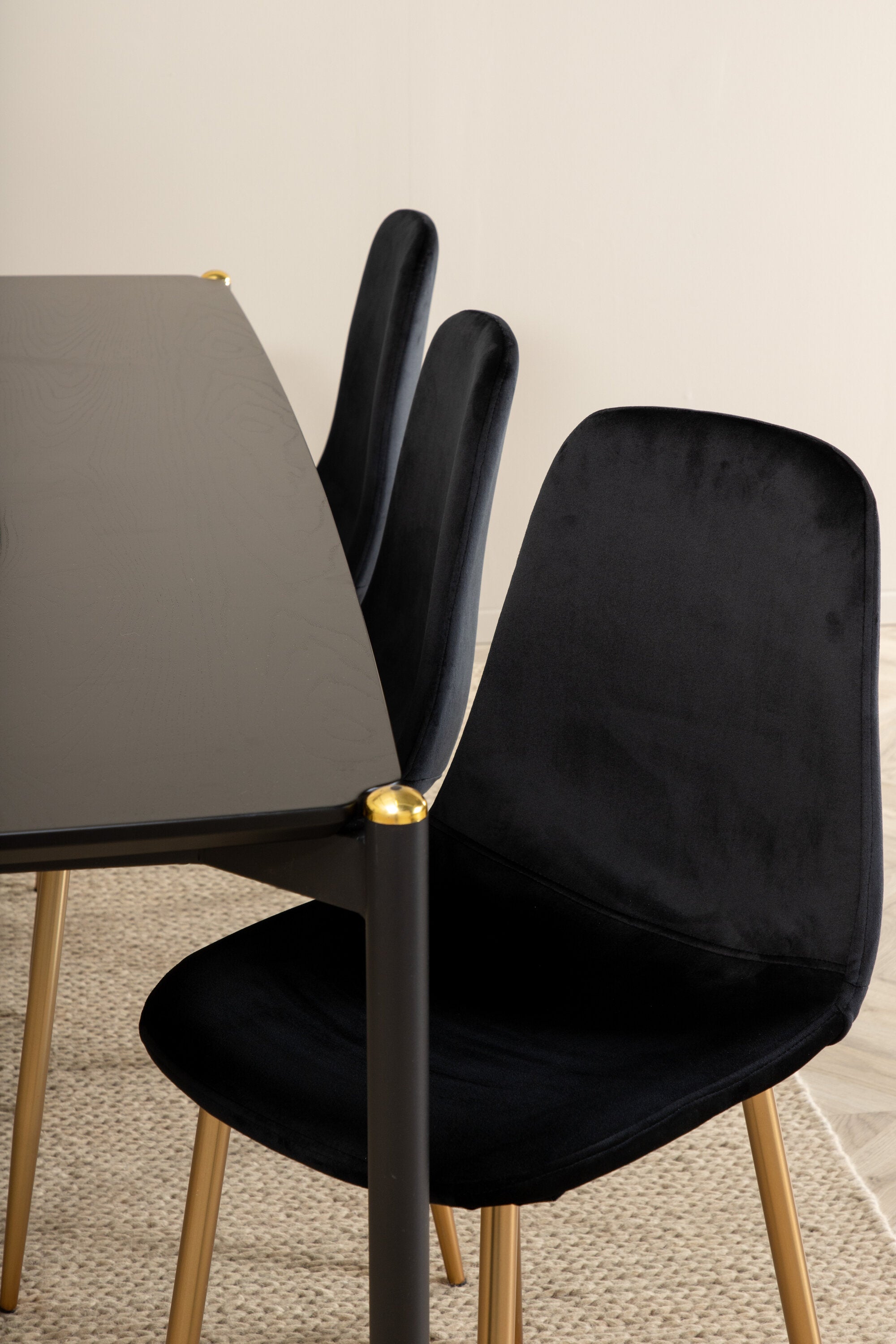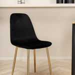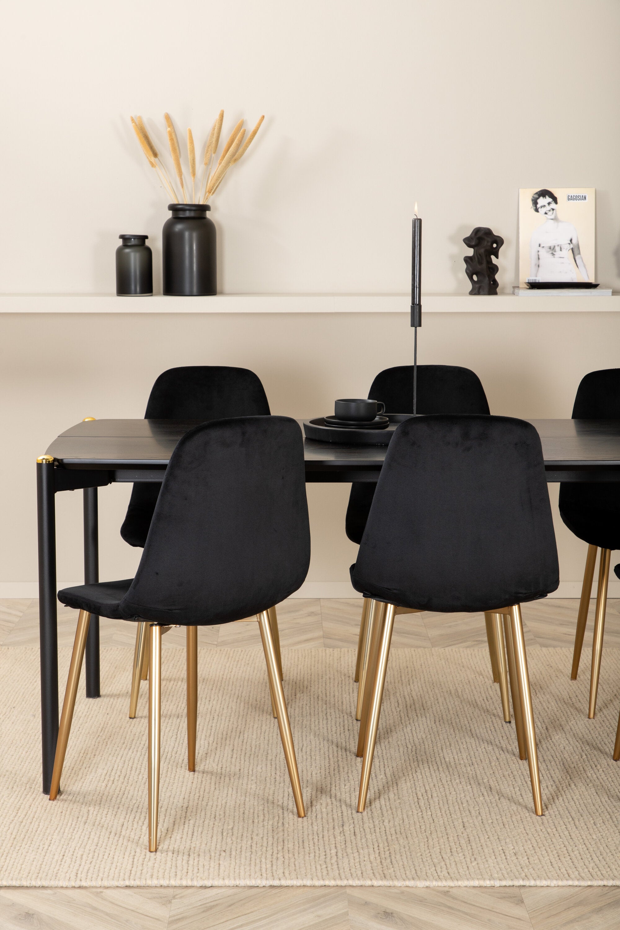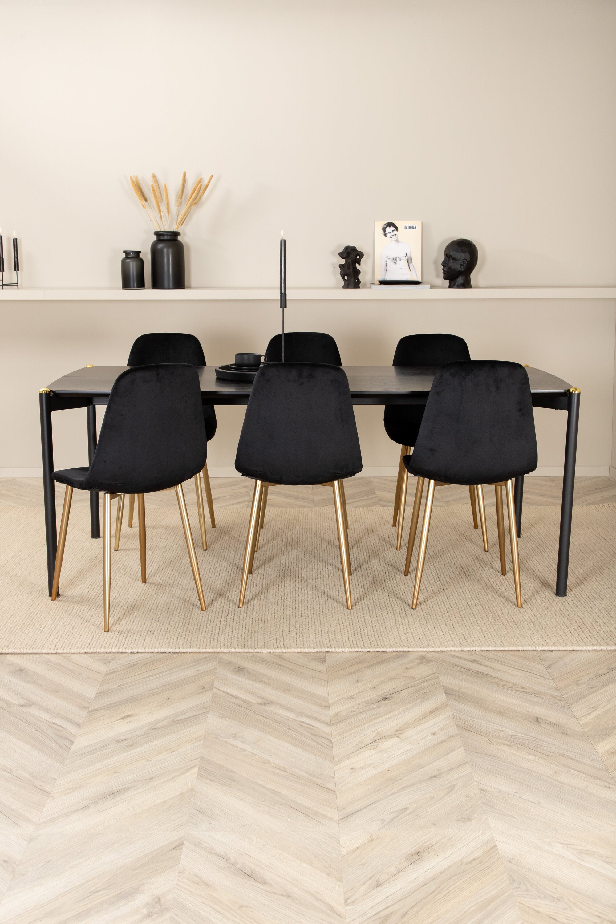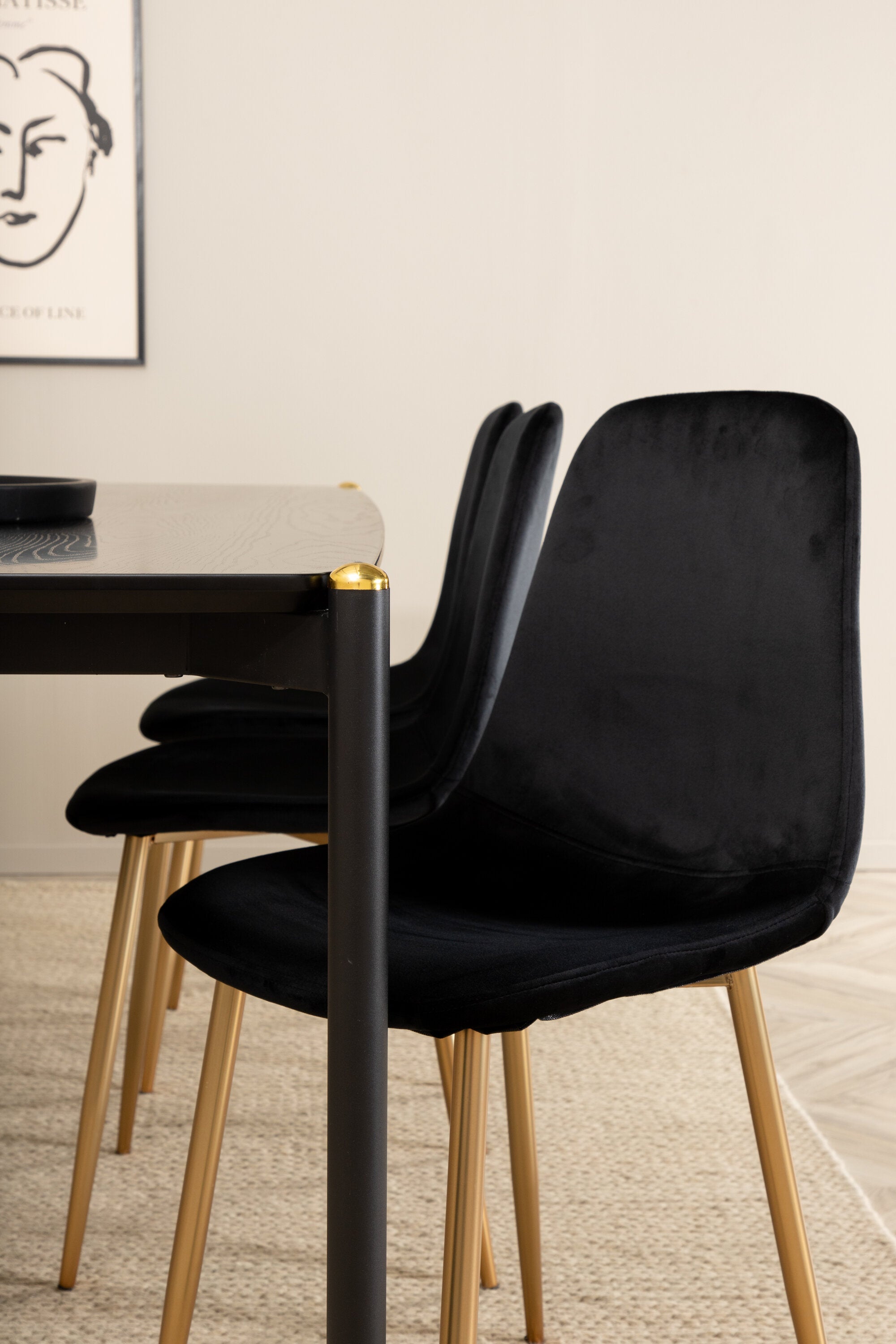 Stylový, luxusní a nadčasový - jídelní stůl Pelle působí u vás doma módním dojmem! Design je dobře promyšlený s rovnými severskými tvary, které dodávají stylový pocit, úzkými železnými nohami, které mají navrchu ozdobný mosazný pupen a výběžek uprostřed desky stolu, který se stává lahodným detailem. Deska stolu je z černé MDF s dýhou a rozměry stolu: délka: 190 cm, šířka: 90 cm, výška: 75 cm. Sladěno se 6 jídelními židlemi Polar s kovovými kostmi v barvě mosazi a černými sedáky ze sametu. Rozměry židle: výška: 86 cm, výška sedáku: 48 cm, šířka: 44 cm, hloubka: 52 cm.