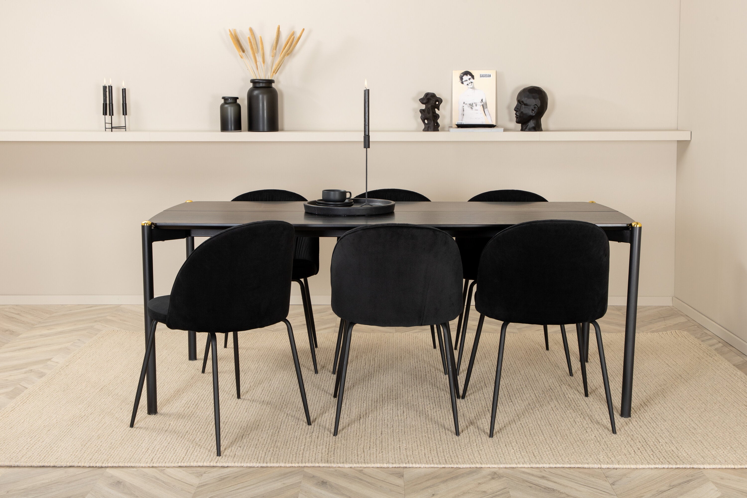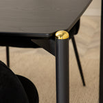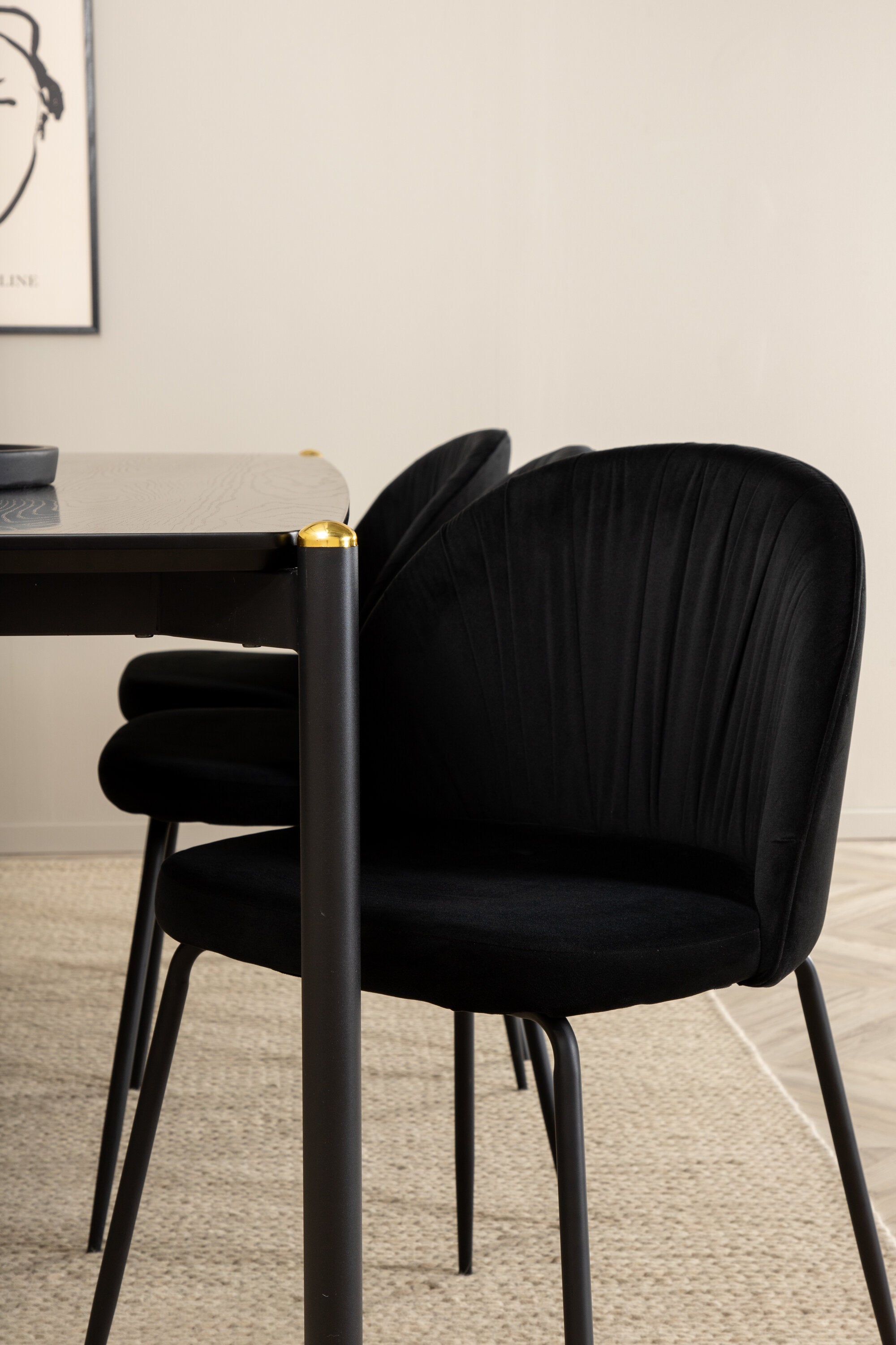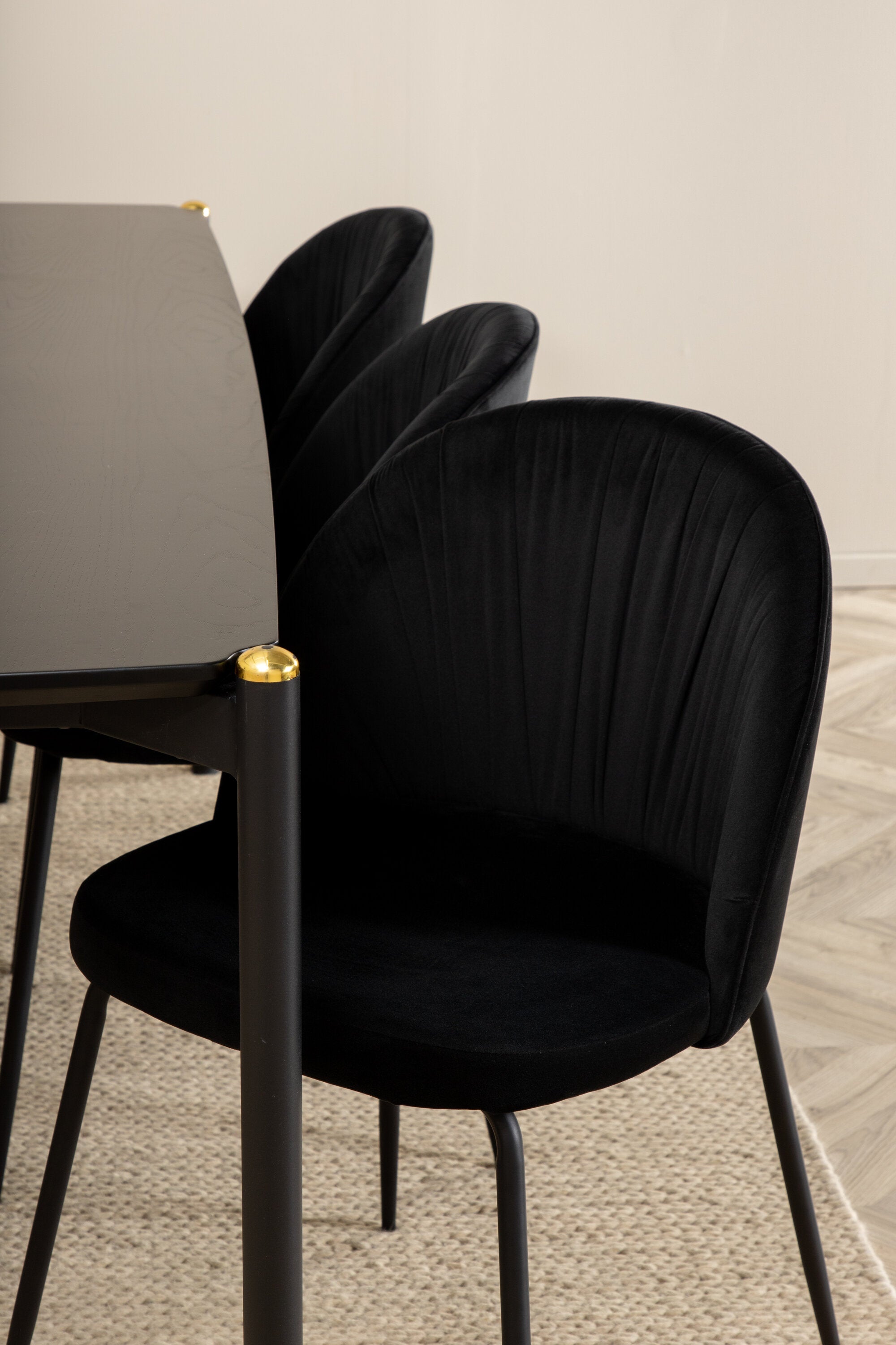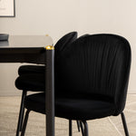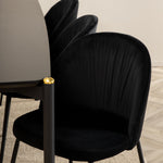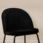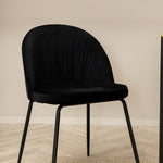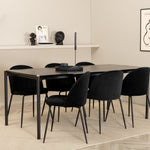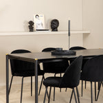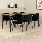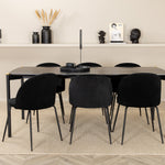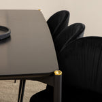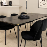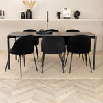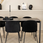 Moderní židle se vším všudy - jídelní židle Wrinkles z černé sametové látky a kovová židle má exkluzivní plně oblečený design, který vytváří lákavou pozornost! Rozměry židle: Výška: 79,5 cm, výška sedáku: 49,5 cm, šířka: 49 cm, hloubka: 50 cm. Zde je 6 židlí sladěno s jídelním stolem Pelle. Deska stolu je z černé MDF s dýhou a rozměry stolu: délka: 190 cm, šířka: 90 cm, výška: 75 cm. Design je dobře promyšlený s rovnými severskými tvary, které dodávají stylový pocit, úzkými železnými nohami, které mají navrchu ozdobný mosazný pupen a výběžek uprostřed desky stolu, který se stává lahodným detailem.