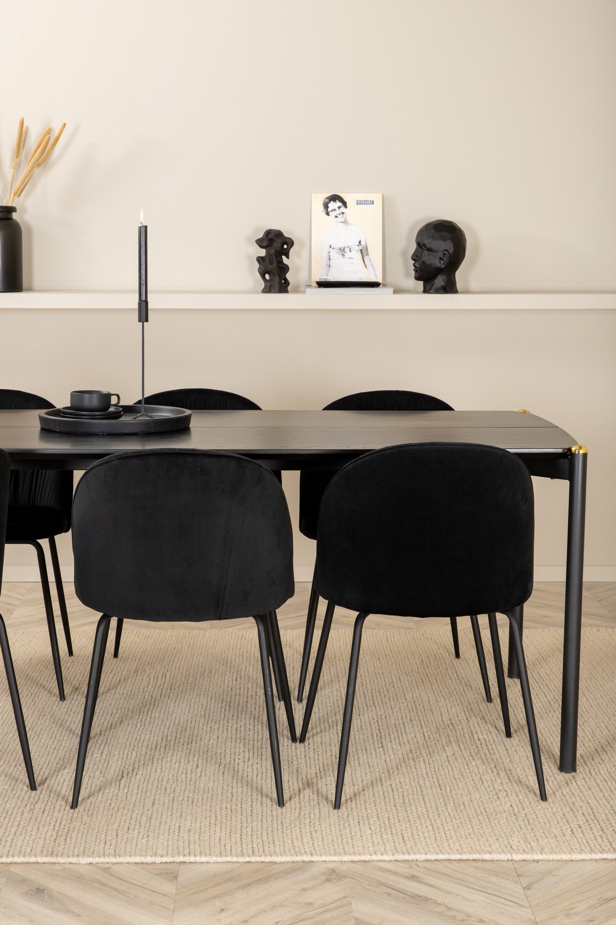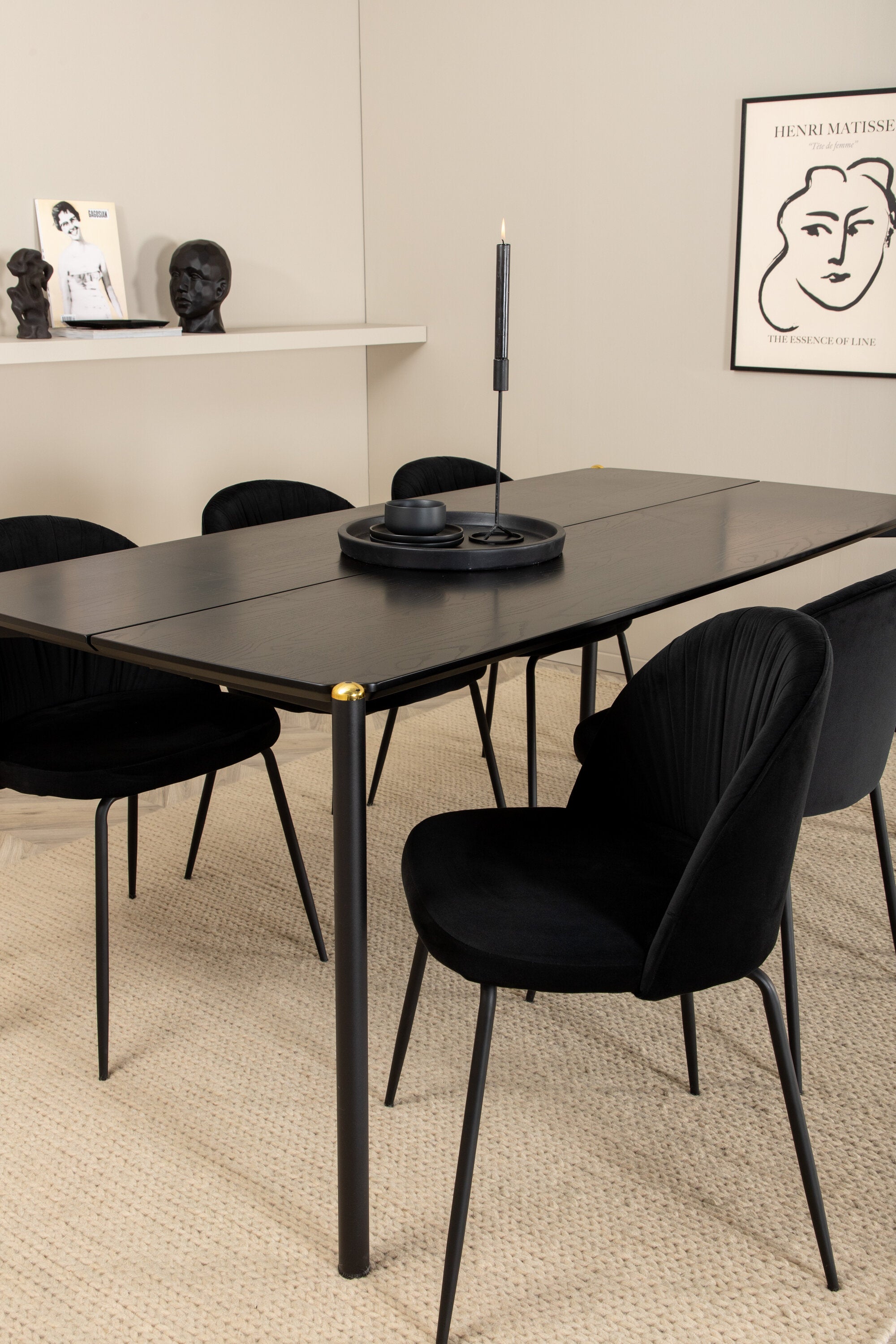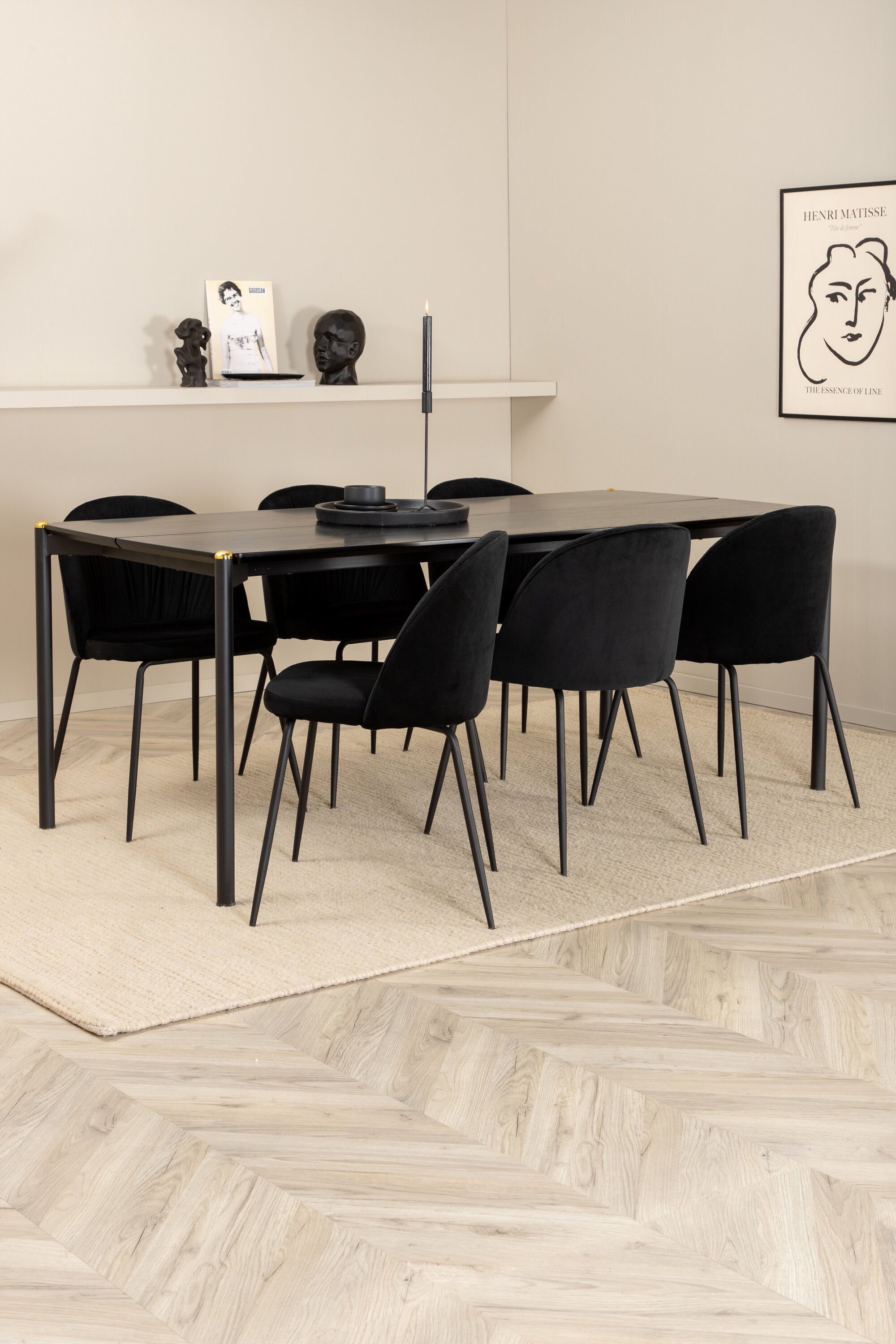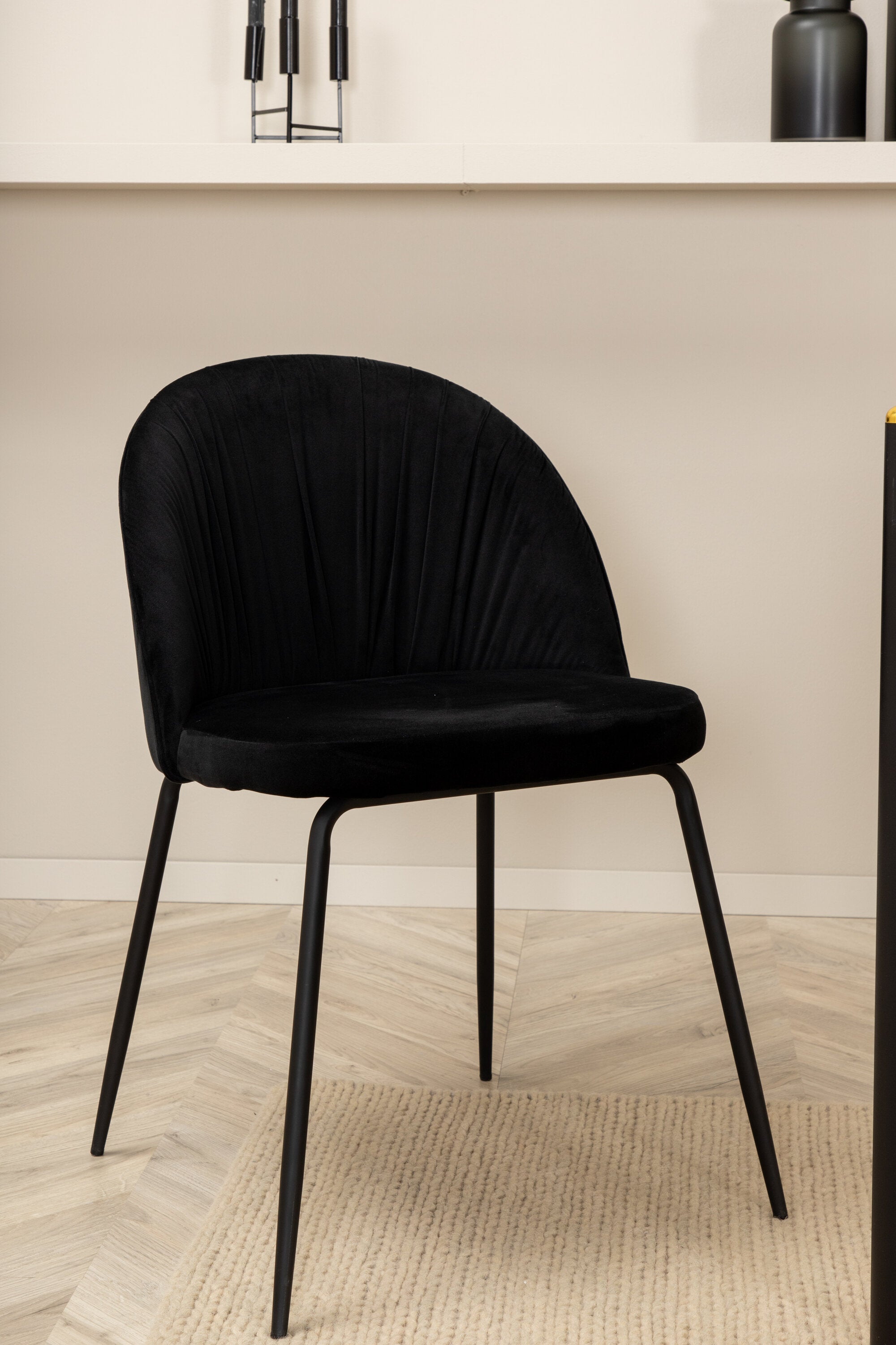 Moderní židle se vším všudy - jídelní židle Wrinkles z černé sametové látky a kovová židle má exkluzivní plně oblečený design, který vytváří lákavou pozornost! Rozměry židle: Výška: 79,5 cm, výška sedáku: 49,5 cm, šířka: 49 cm, hloubka: 50 cm. Zde je 6 židlí sladěno s jídelním stolem Pelle. Deska stolu je z černé MDF s dýhou a rozměry stolu: délka: 190 cm, šířka: 90 cm, výška: 75 cm. Design je dobře promyšlený s rovnými severskými tvary, které dodávají stylový pocit, úzkými železnými nohami, které mají navrchu ozdobný mosazný pupen a výběžek uprostřed desky stolu, který se stává lahodným detailem.