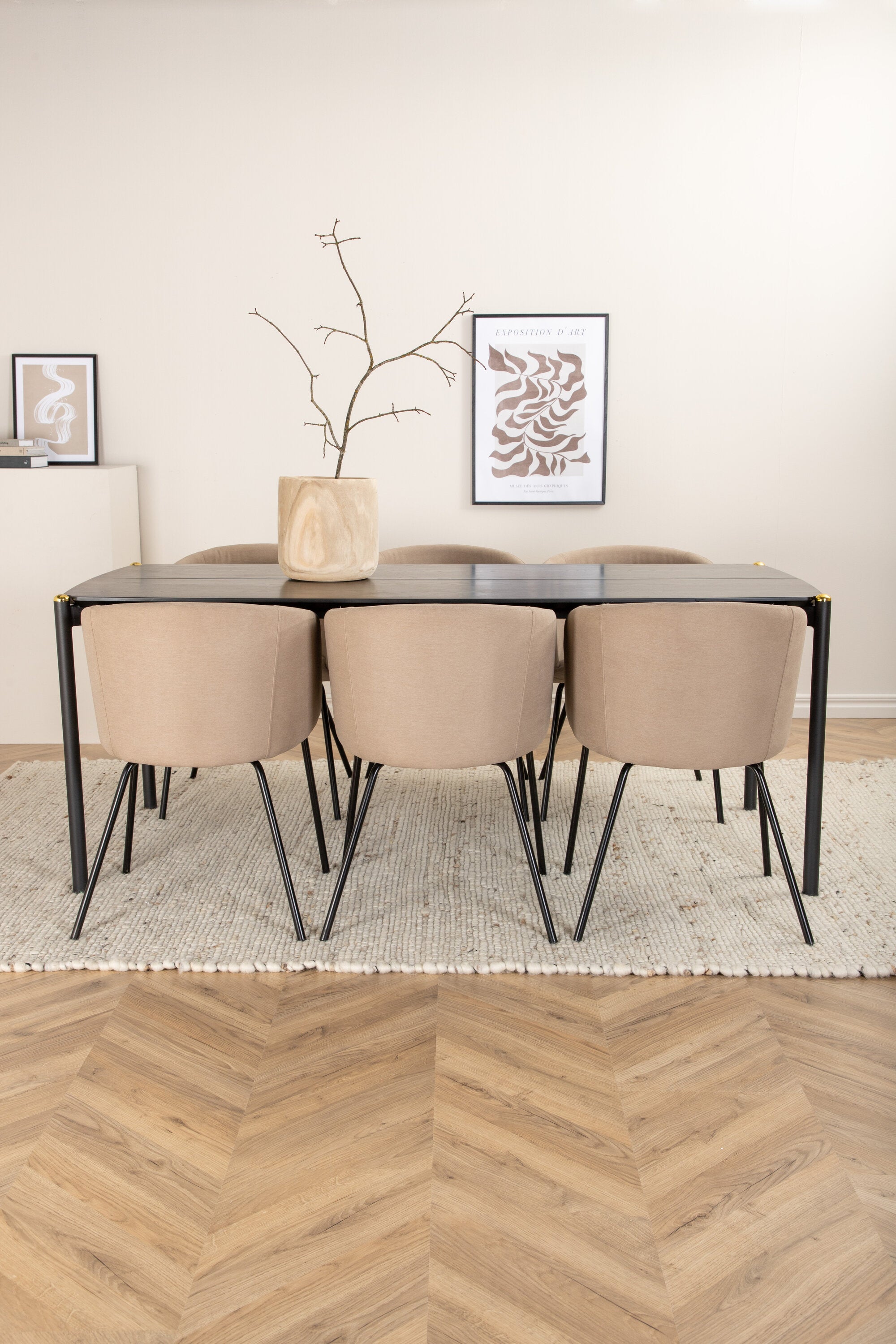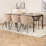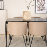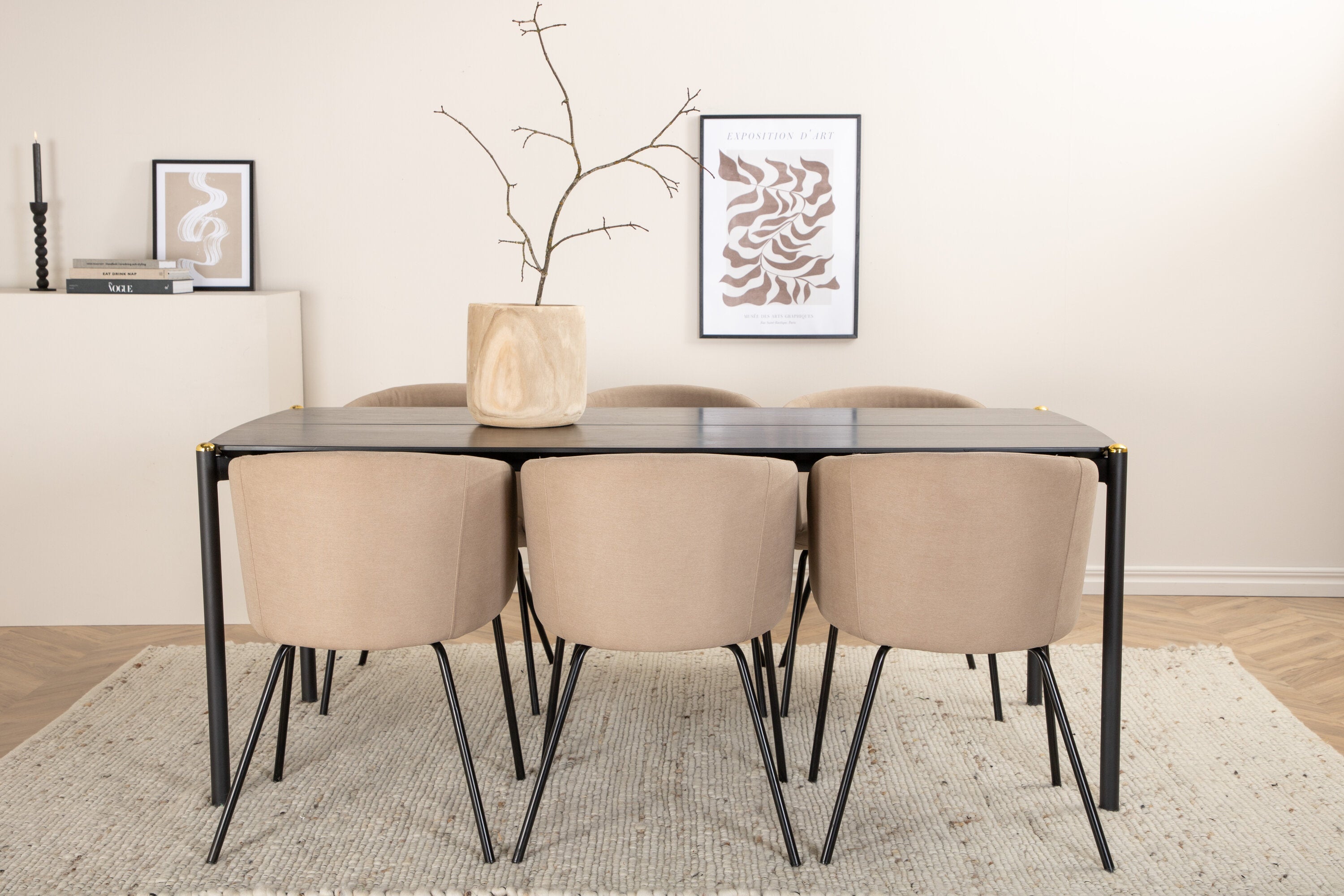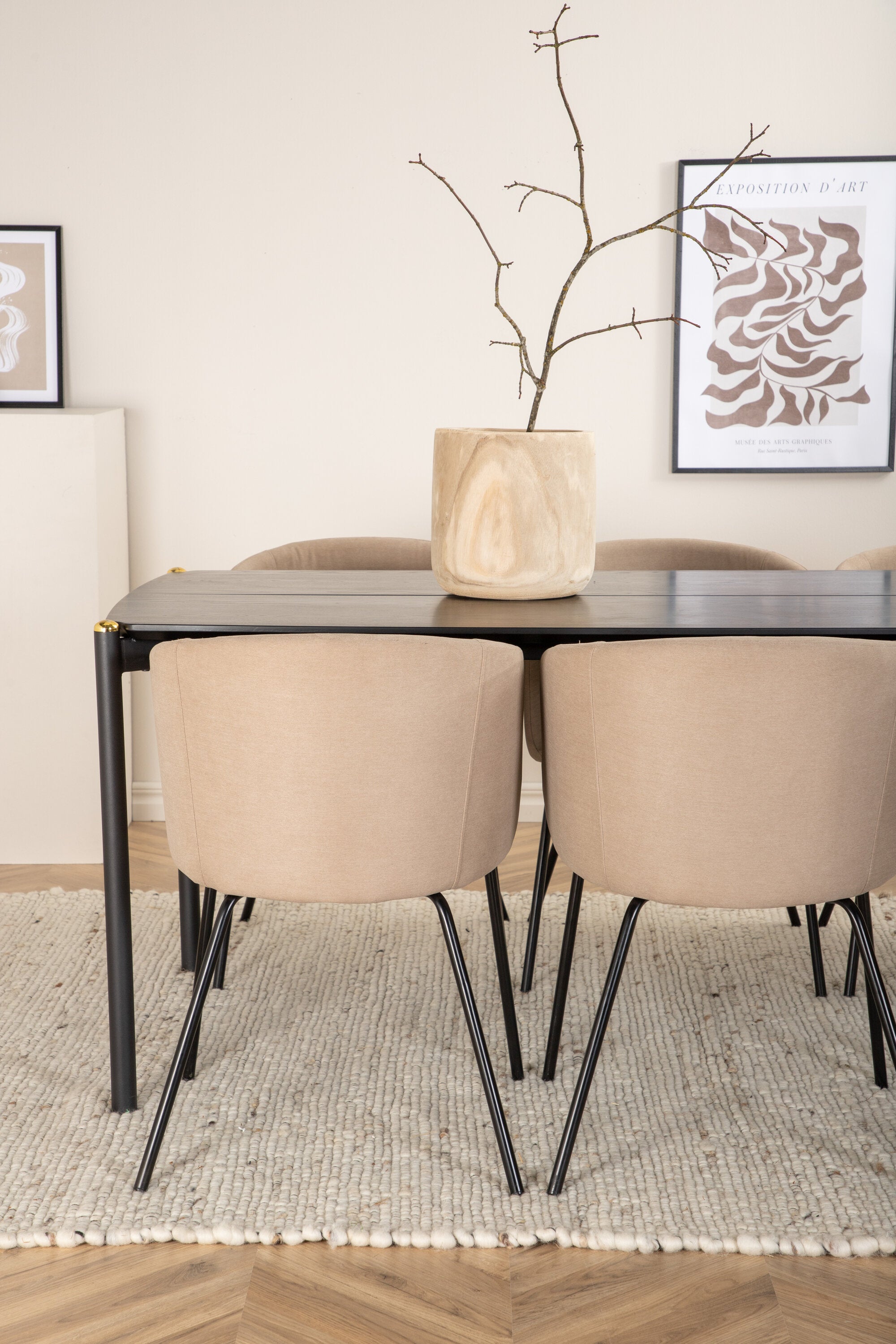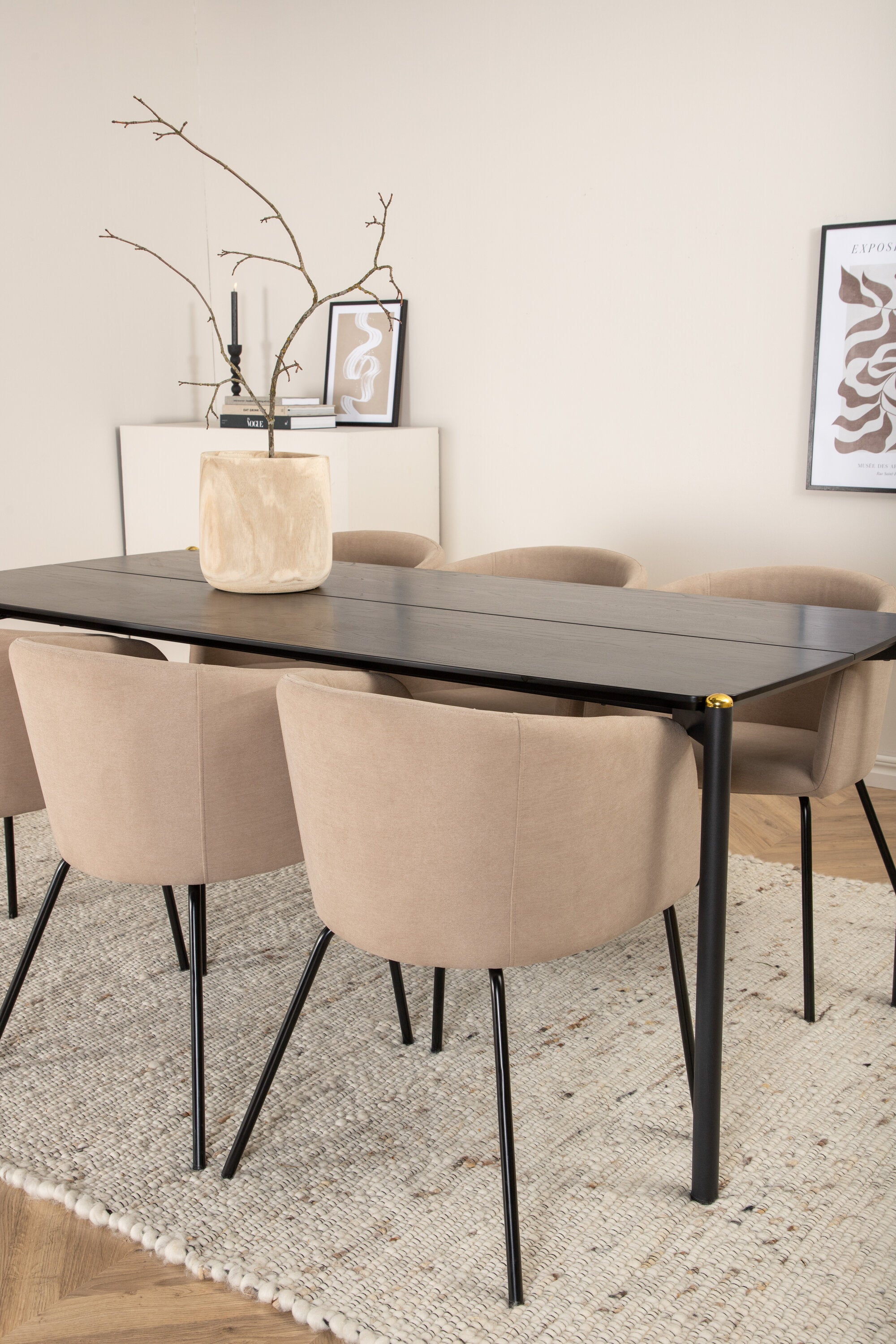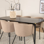Nechte toto krásně sladěné jídlo s moderním nádechem stát se přirozeným místem setkávání u vás doma. Jídelní stůl Pelle má promyšlený design s rovnými severskými tvary, které působí stylově, úzké železné nohy s ozdobnou mosaznou špičkou na horní straně a výběžkem uprostřed desky stolu, který se stává lahodným detailem. Deska stolu je z černé MDF s dýhou a rozměry stolu: délka: 190 cm, šířka: 90 cm, výška: 75 cm. Zde se hodí k 6 našim oblíbeným jídelním židlím Berit. Židle mají luxusní design s pohodlným sedákem z béžového polyesterového povlečení a stylově úzkou nohou taburetu z černého železa. Rozměry židle: výška: 78 cm, výška sedáku: 49 cm, šířka: 55 cm, hloubka: 55 cm.