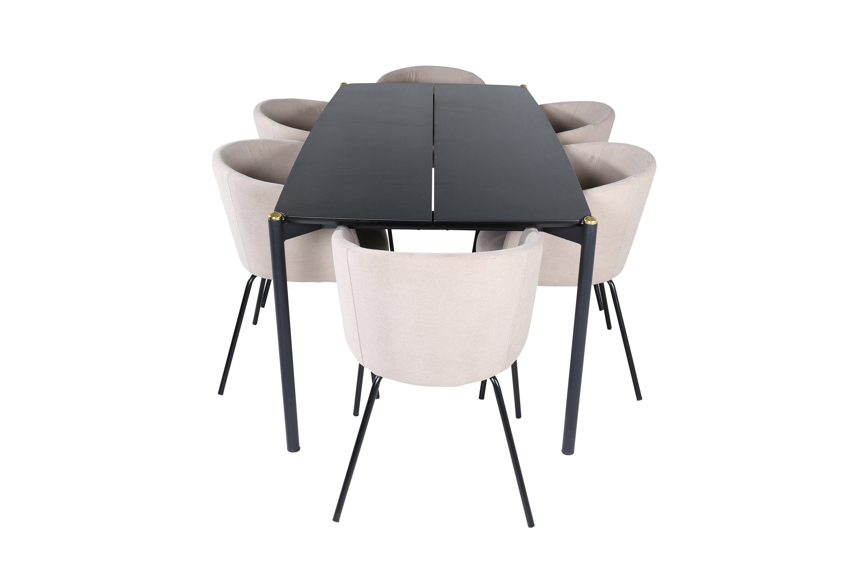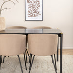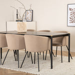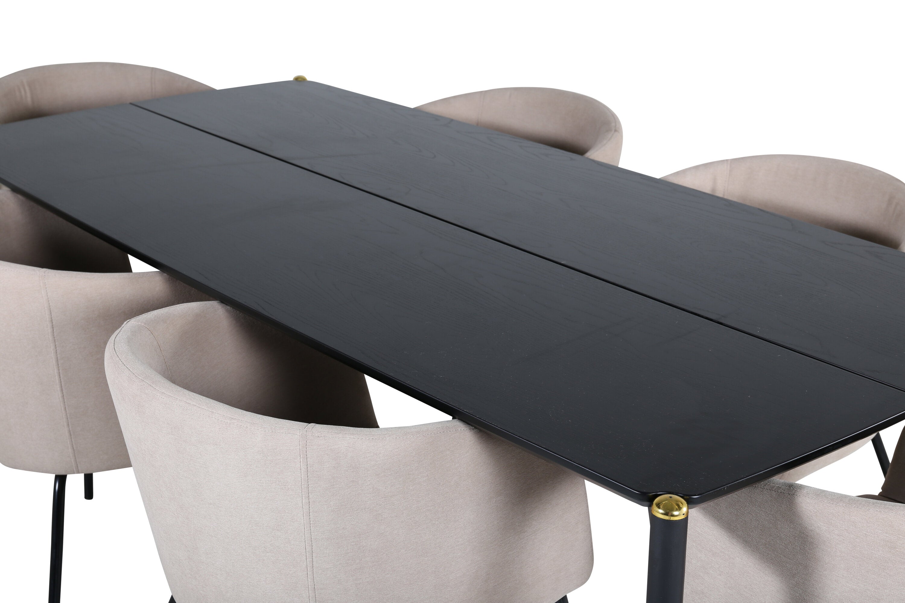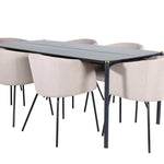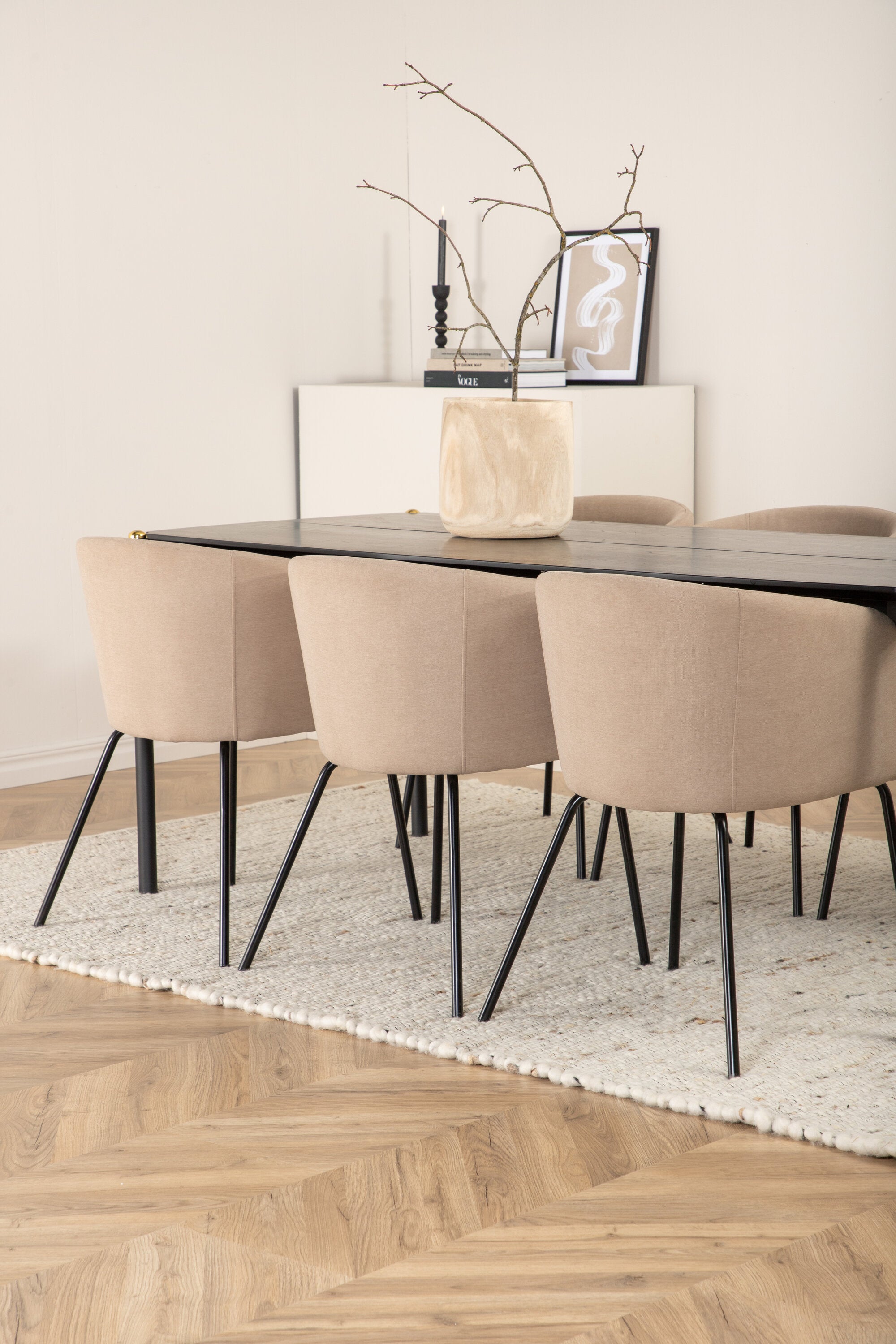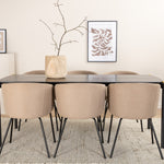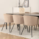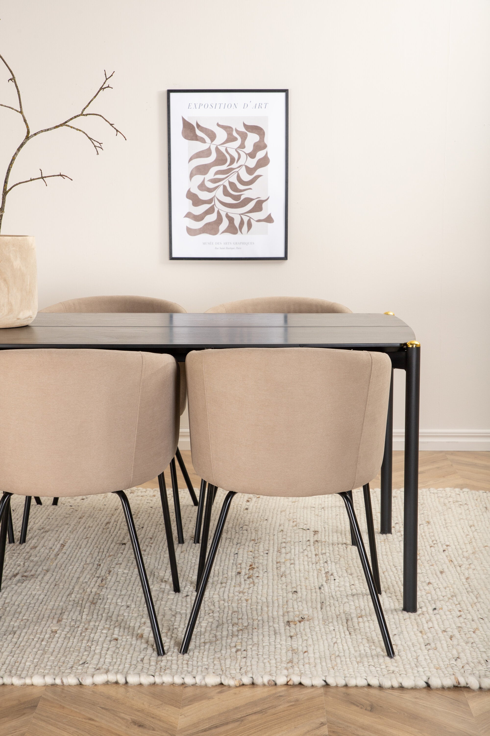 Nechte toto krásně sladěné jídlo s moderním nádechem stát se přirozeným místem setkávání u vás doma. Jídelní stůl Pelle má promyšlený design s rovnými severskými tvary, které působí stylově, úzké železné nohy s ozdobnou mosaznou špičkou na horní straně a výběžkem uprostřed desky stolu, který se stává lahodným detailem. Deska stolu je z černé MDF s dýhou a rozměry stolu: délka: 190 cm, šířka: 90 cm, výška: 75 cm. Zde se hodí k 6 našim oblíbeným jídelním židlím Berit. Židle mají luxusní design s pohodlným sedákem z béžového polyesterového povlečení a stylově úzkou nohou taburetu z černého železa. Rozměry židle: výška: 78 cm, výška sedáku: 49 cm, šířka: 55 cm, hloubka: 55 cm.