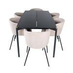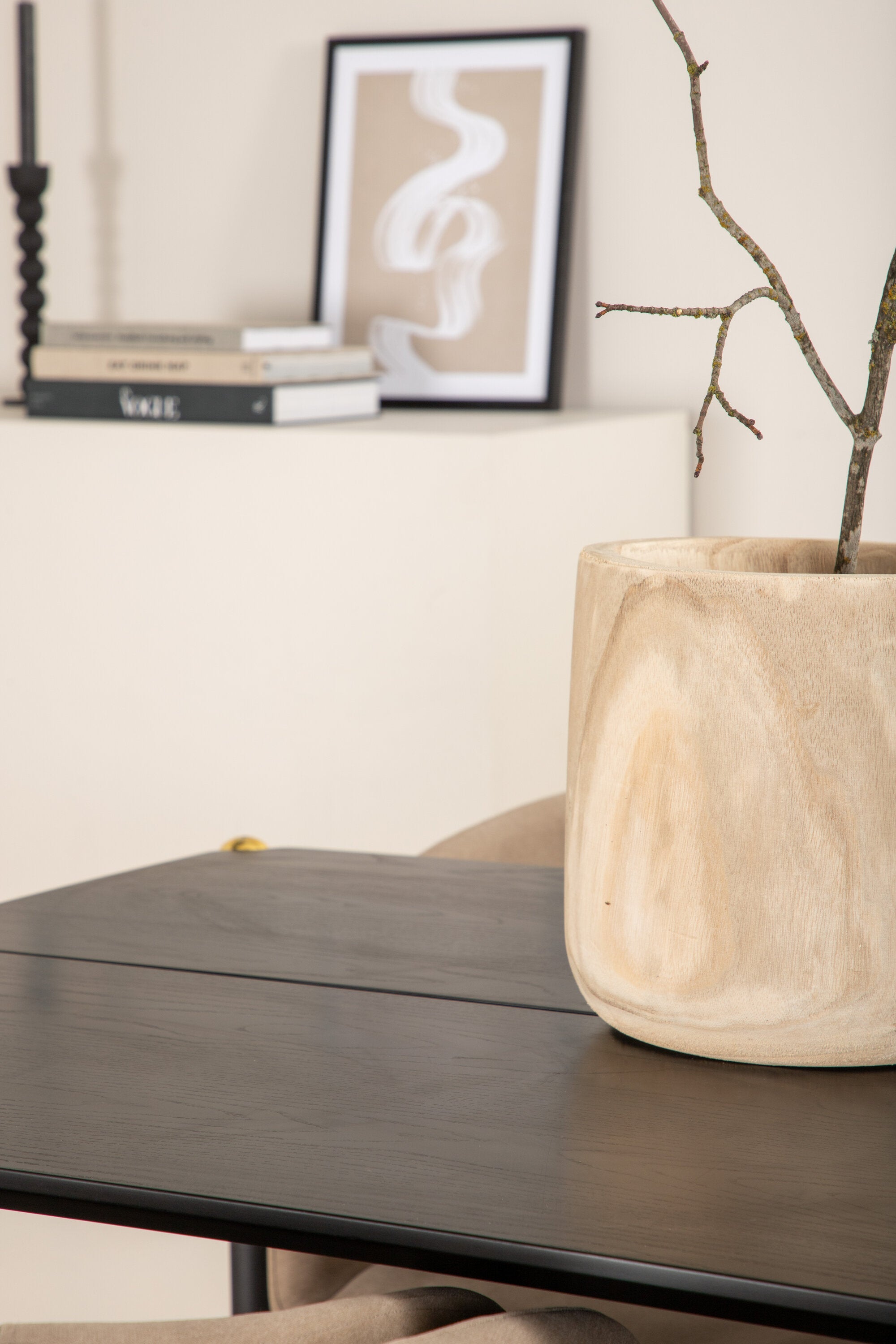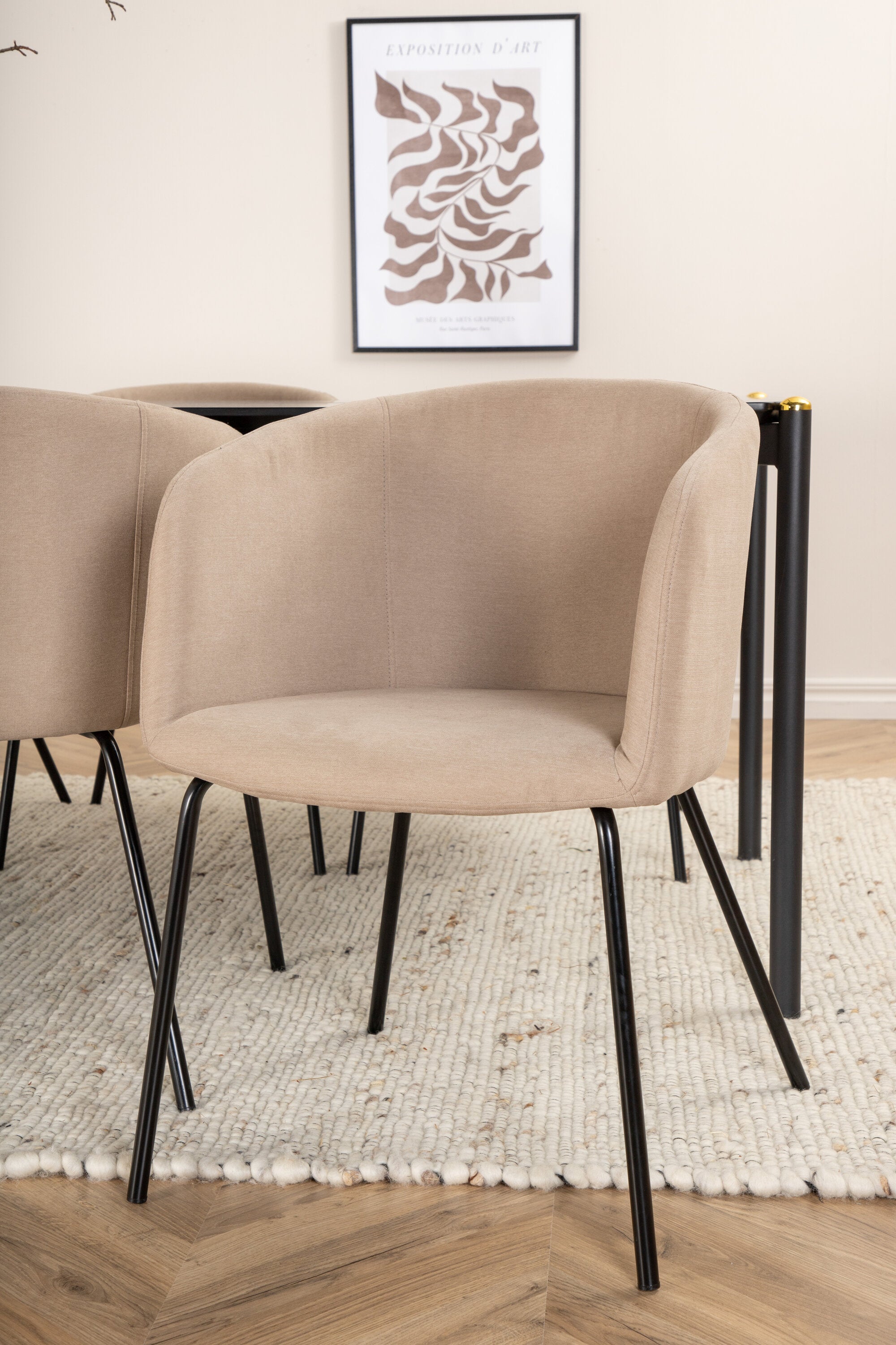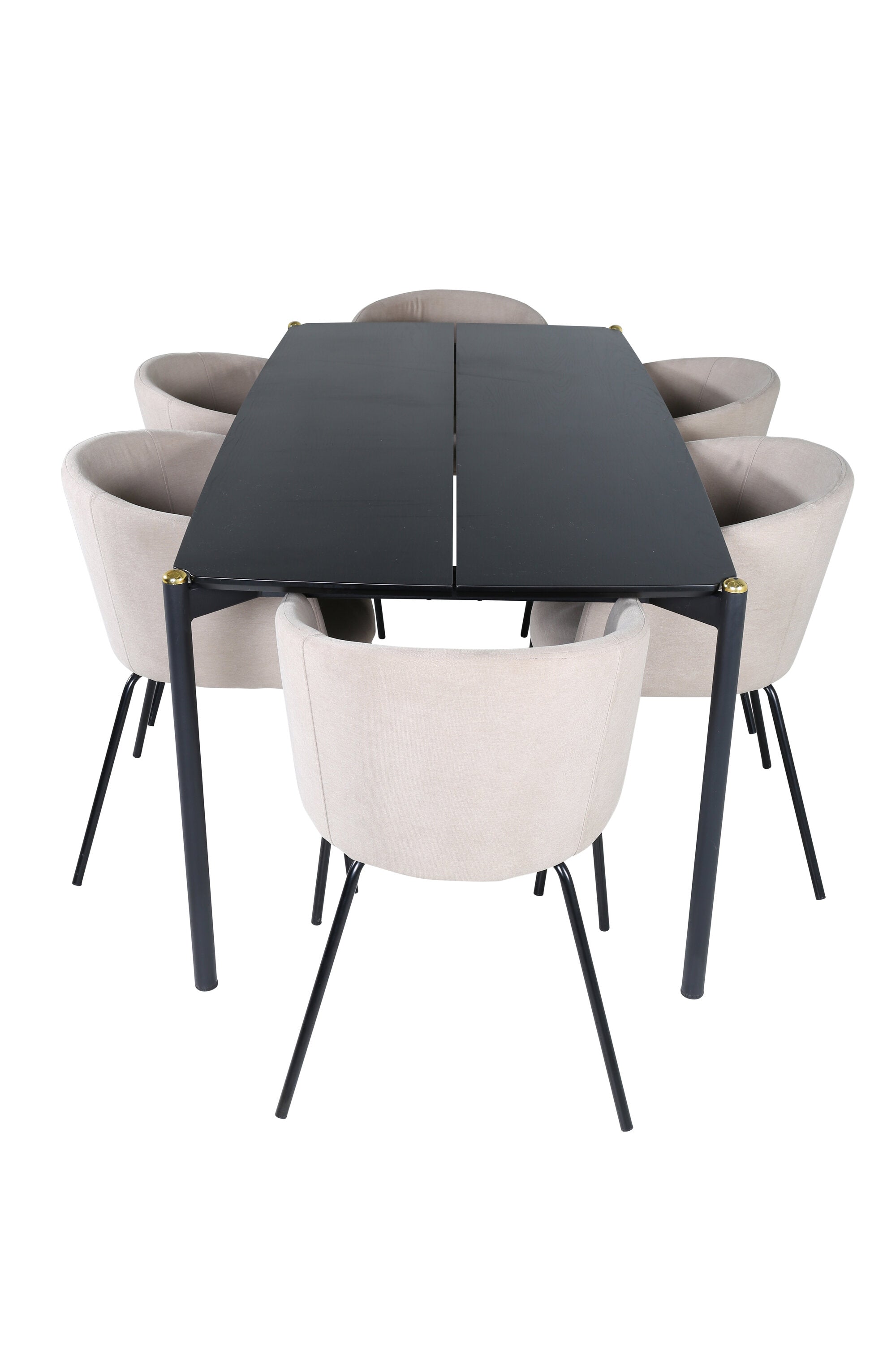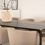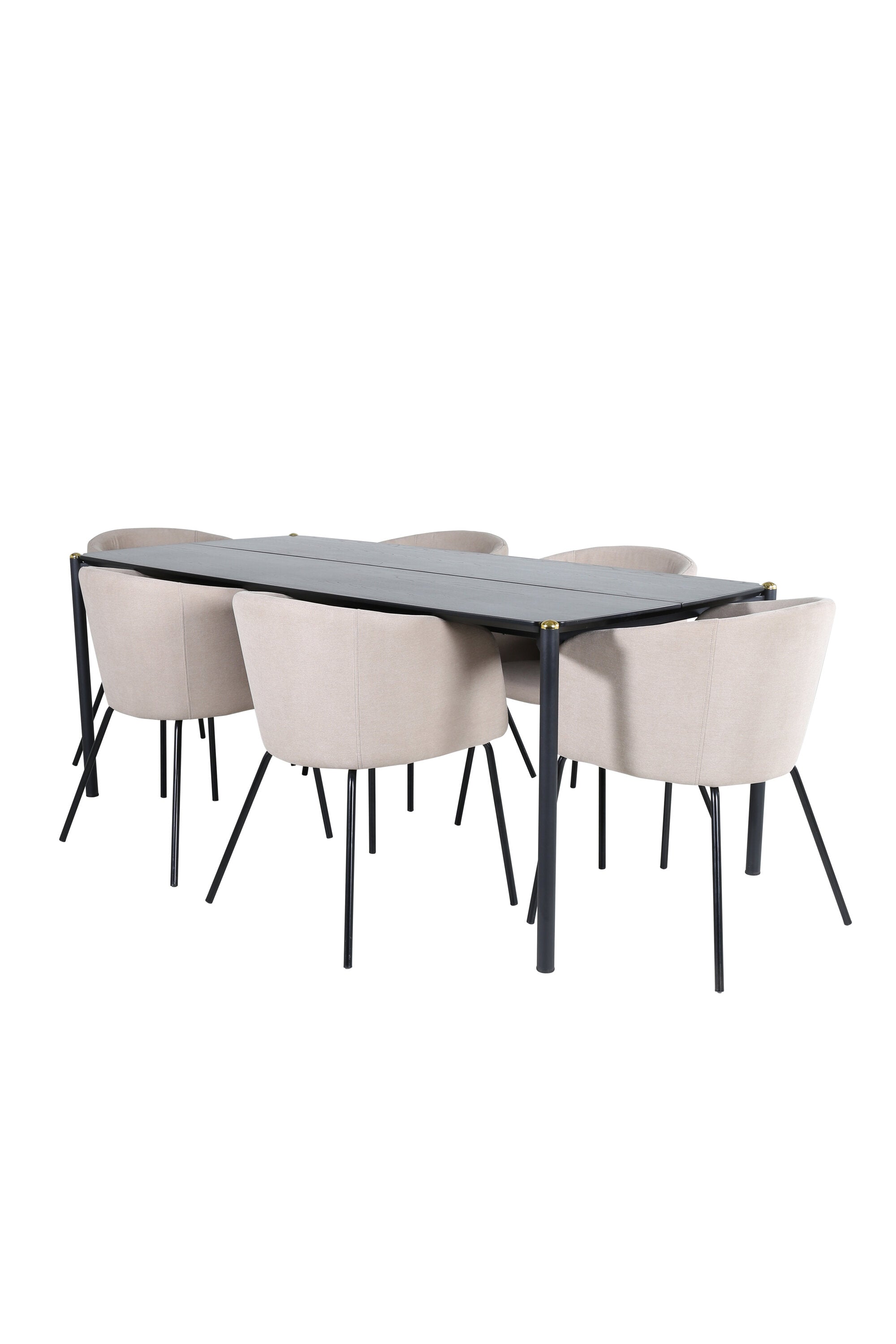 Nechte toto krásně sladěné jídlo s moderním nádechem stát se přirozeným místem setkávání u vás doma. Jídelní stůl Pelle má promyšlený design s rovnými severskými tvary, které působí stylově, úzké železné nohy s ozdobnou mosaznou špičkou na horní straně a výběžkem uprostřed desky stolu, který se stává lahodným detailem. Deska stolu je z černé MDF s dýhou a rozměry stolu: délka: 190 cm, šířka: 90 cm, výška: 75 cm. Zde se hodí k 6 našim oblíbeným jídelním židlím Berit. Židle mají luxusní design s pohodlným sedákem z béžového polyesterového povlečení a stylově úzkou nohou taburetu z černého železa. Rozměry židle: výška: 78 cm, výška sedáku: 49 cm, šířka: 55 cm, hloubka: 55 cm.