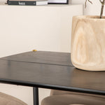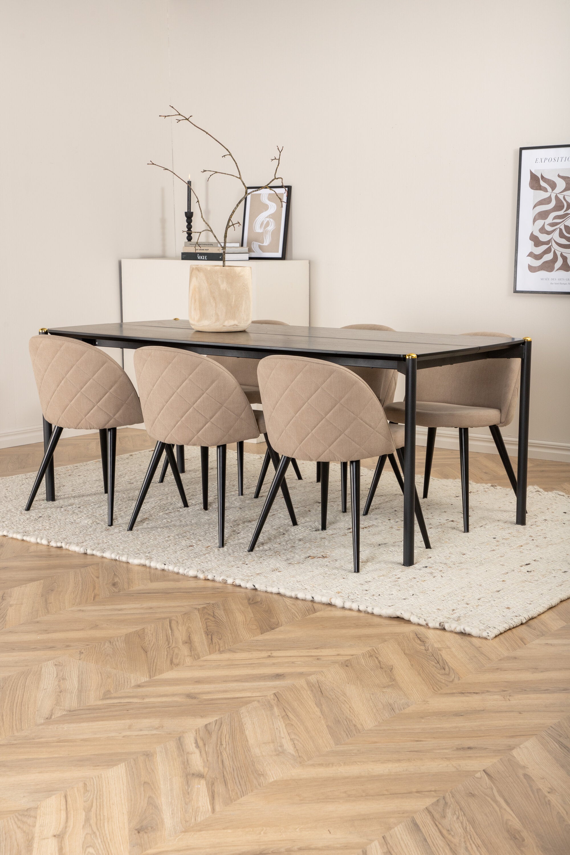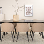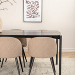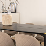 Stylový, luxusní a nadčasový - jídelní stůl Pelle působí u vás doma módním dojmem! Design je dobře promyšlený s rovnými severskými tvary, které dodávají stylový pocit, úzkými železnými nohami, které mají navrchu ozdobný mosazný pupen a výběžek uprostřed desky stolu, který se stává lahodným detailem. Deska stolu je z černé MDF s dýhou a rozměry stolu: délka: 190 cm, šířka: 90 cm, výška: 75 cm. Zde v lahodné kombinaci se 6 jídelními židlemi Velvet Stitches. Nohy židle jsou snadno rozšířeny v černém železe a sedák je béžový z měkkého polyesterového plátna s dekorativním stehem na zadní straně židle. Rozměry židle: Výška: 76,5 cm, výška sedáku: 46,5 cm, šířka: 50 cm, hloubka: 57 cm.