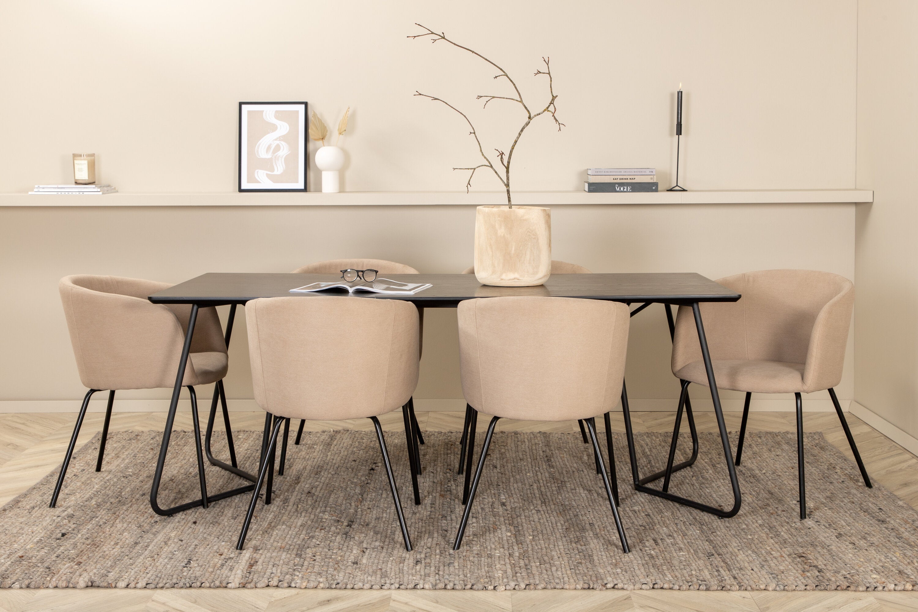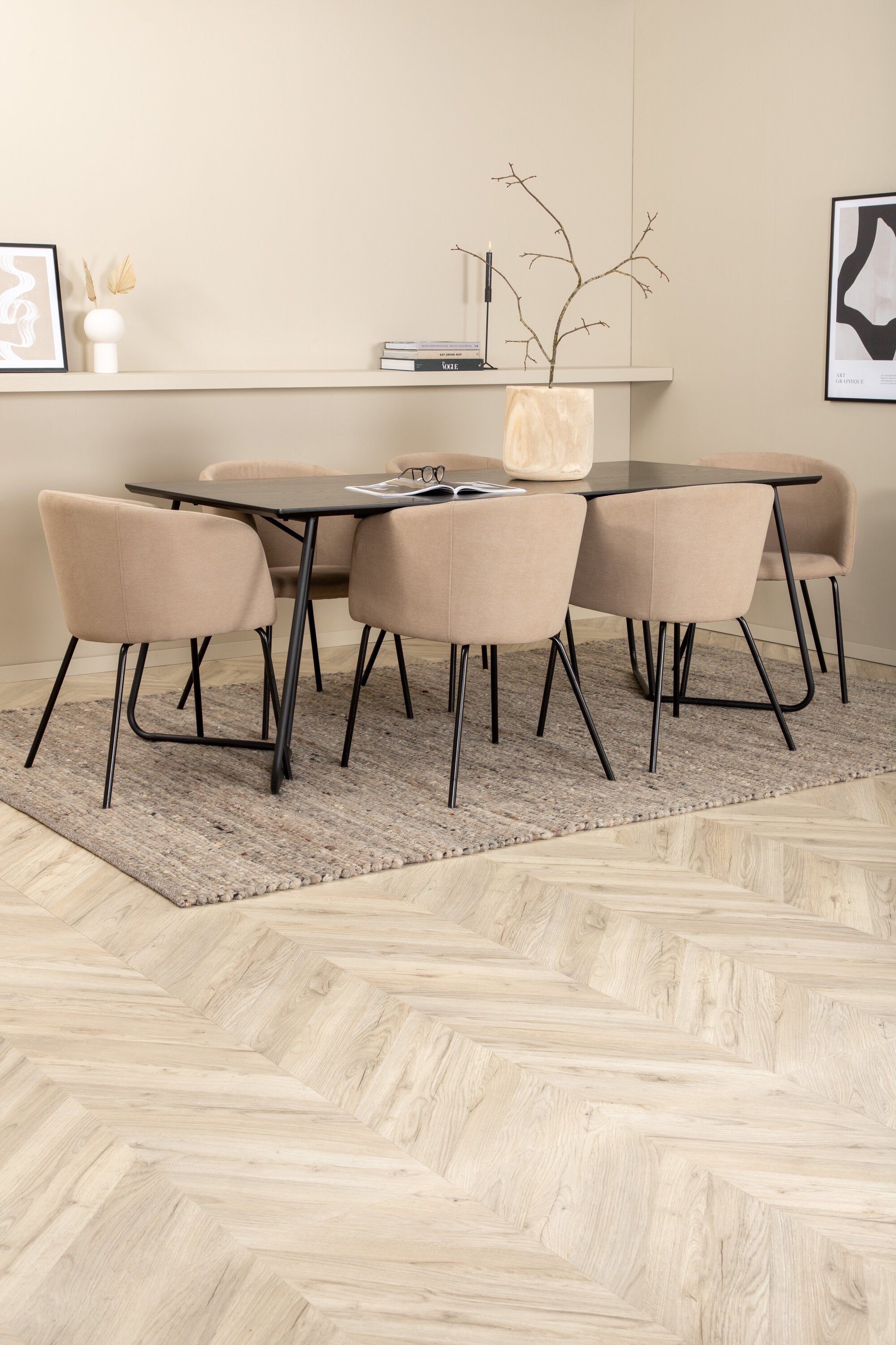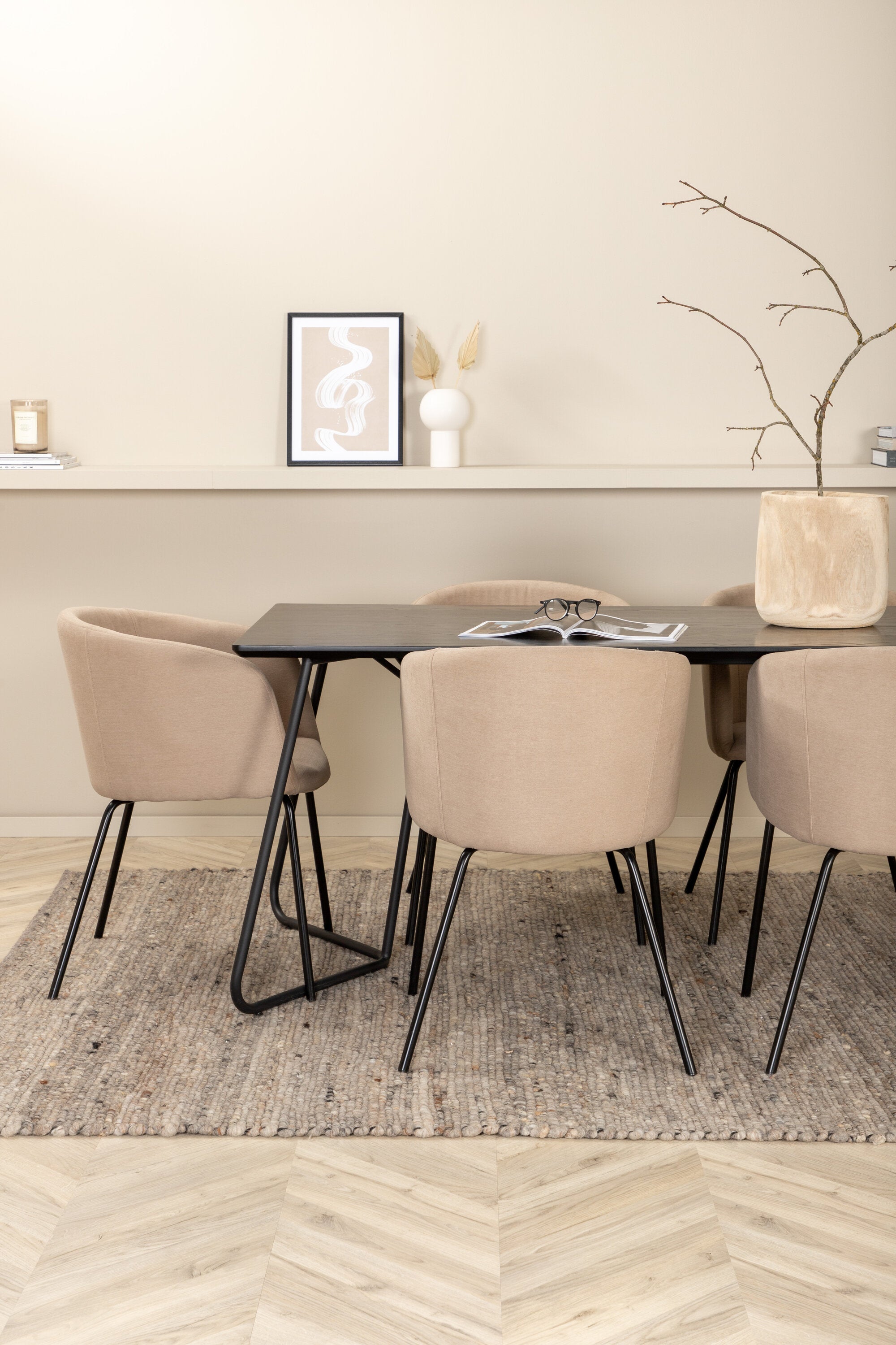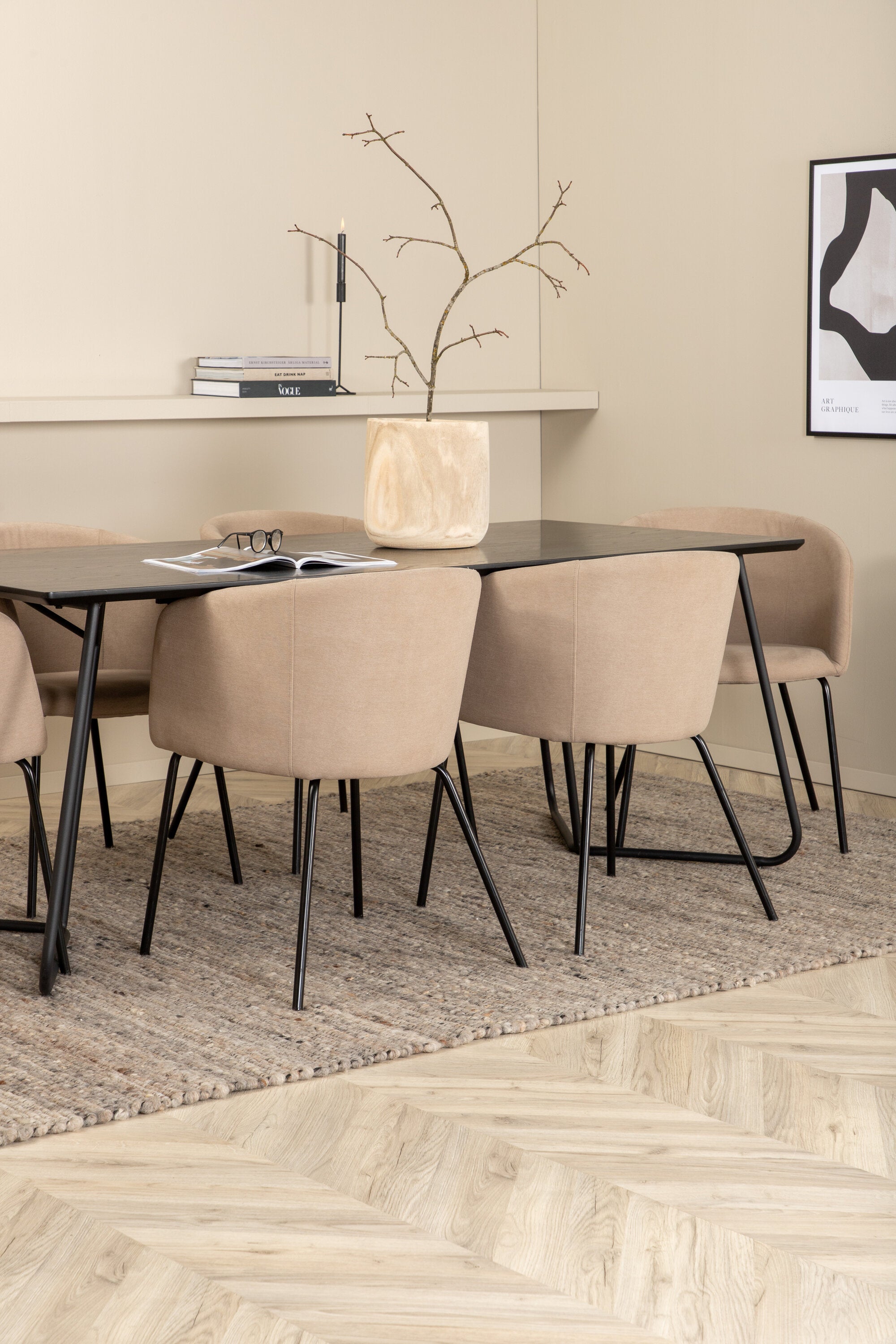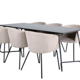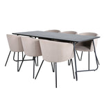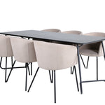 Ponořte se do této příjemné a stylové skupiny jídel na dlouhou večeři s rodinou a přáteli! Jídelní stůl Petra má promyšlený design se skandinávskými tvary, který působí stylově, úzké, lehce rozšířené nohy z černého železa a stolní deska z černé MDF s dýhou. Rozměry stolu: Délka: 190 cm, Šířka: 90 cm, Výška: 75 cm. Zde v dokonalé kombinaci se 6 pohodlnými jídelními židlemi ze série Berit. Nohy židle jsou z černého železa a plně oblečený sedák z béžového polyesterového plátna. Rozměry židle: výška: 78 cm, výška sedáku: 49 cm, šířka: 55 cm, hloubka: 55 cm. Luxusní a stylová skupina jídel, která vás zve na dlouhé chvíle večeře!