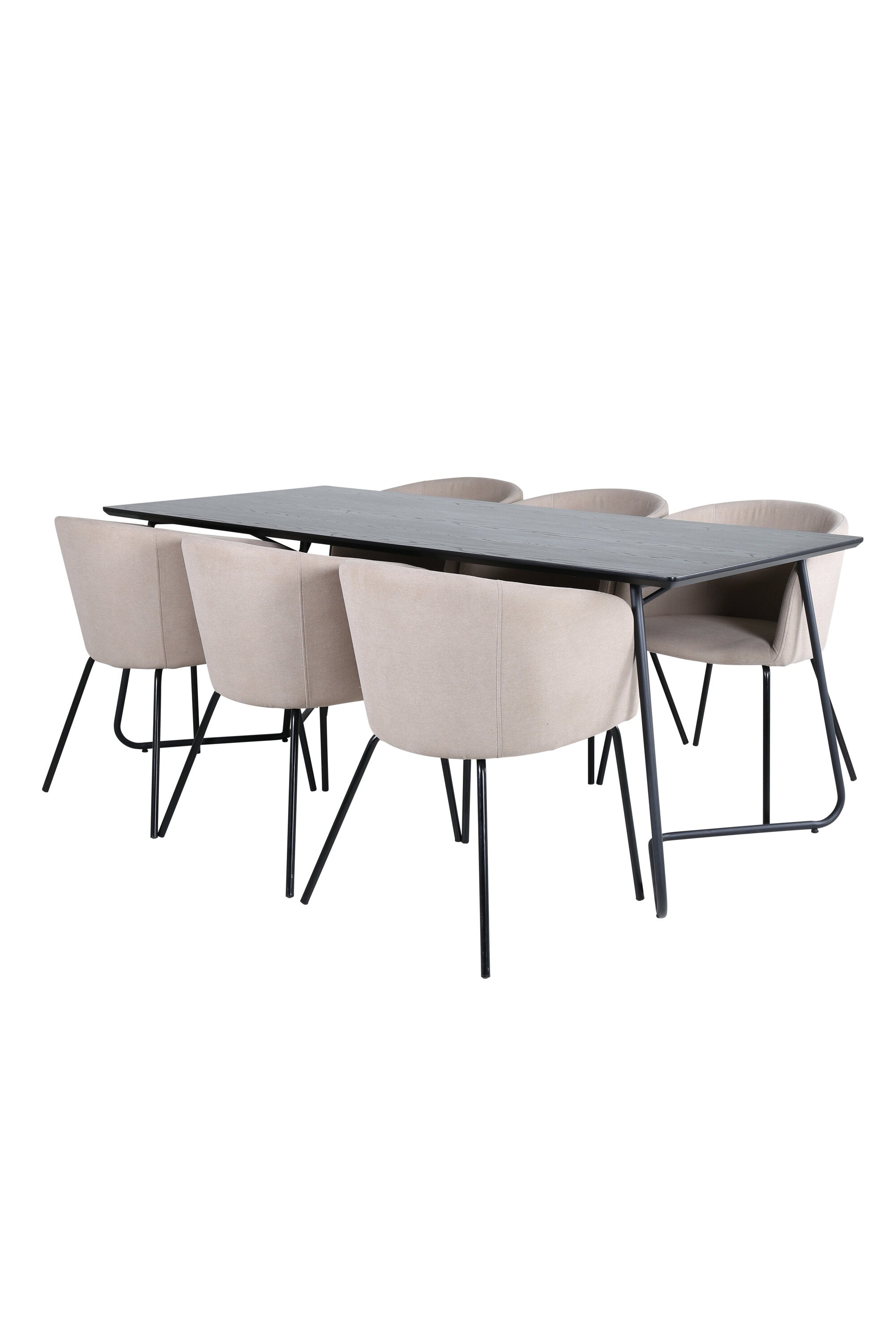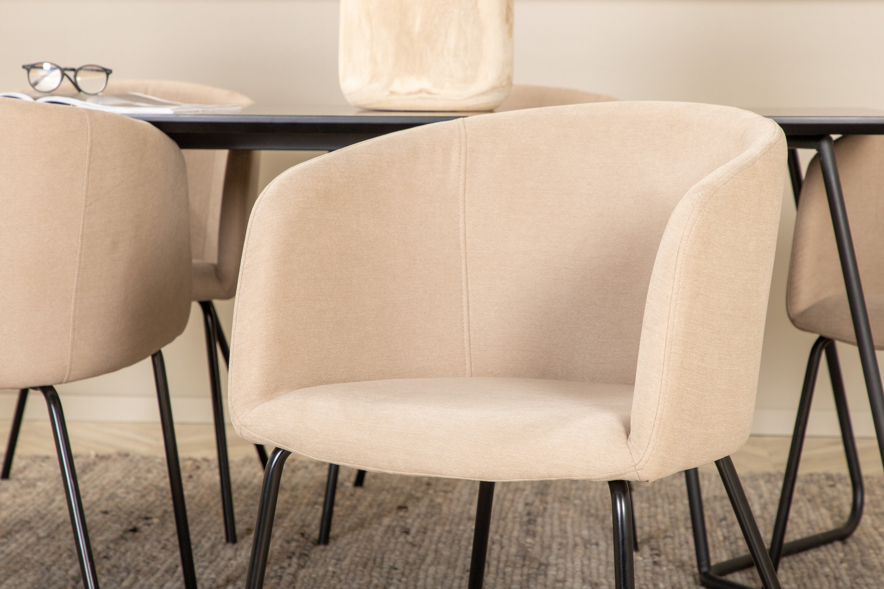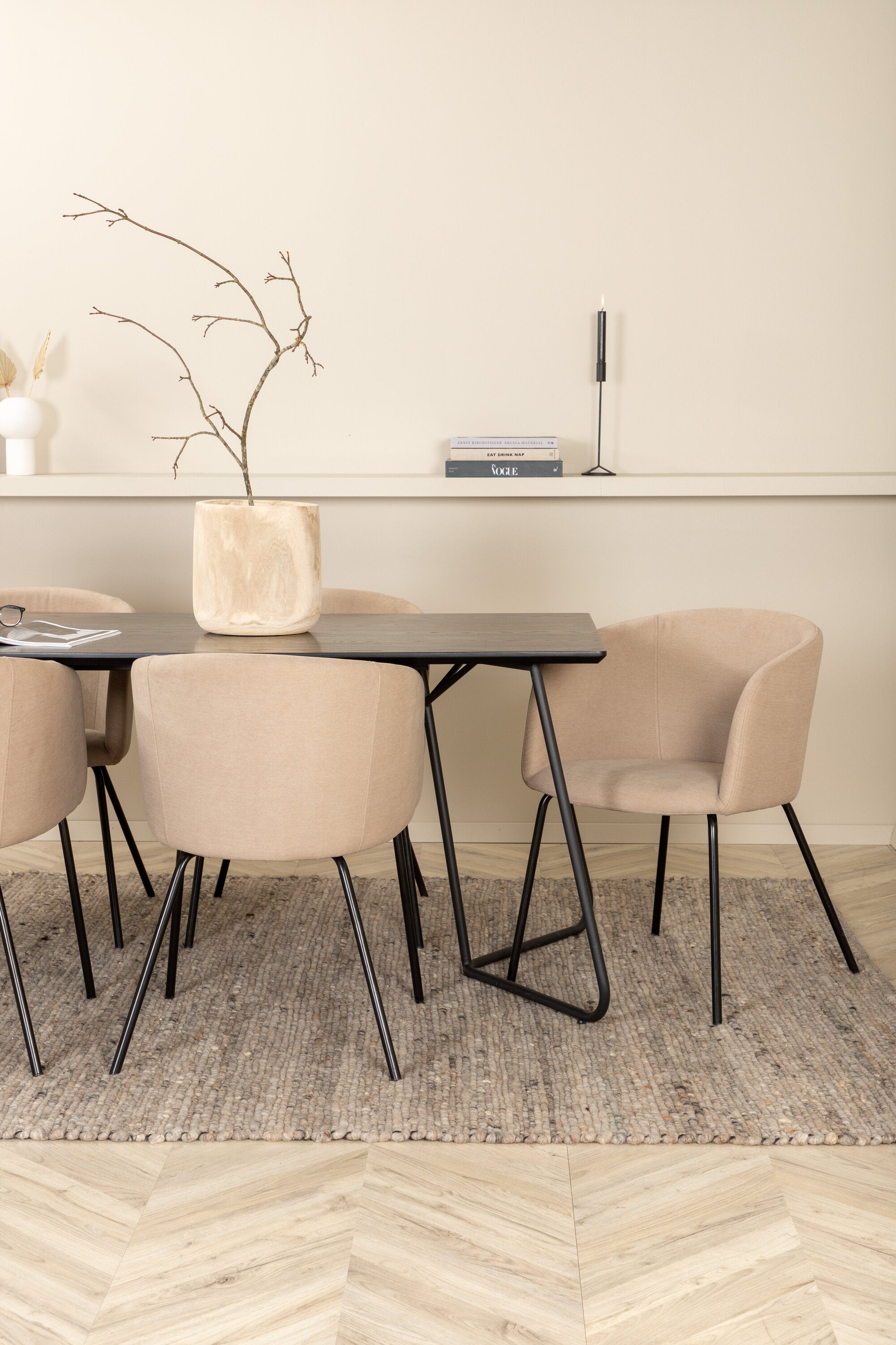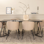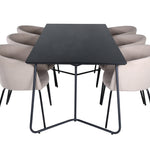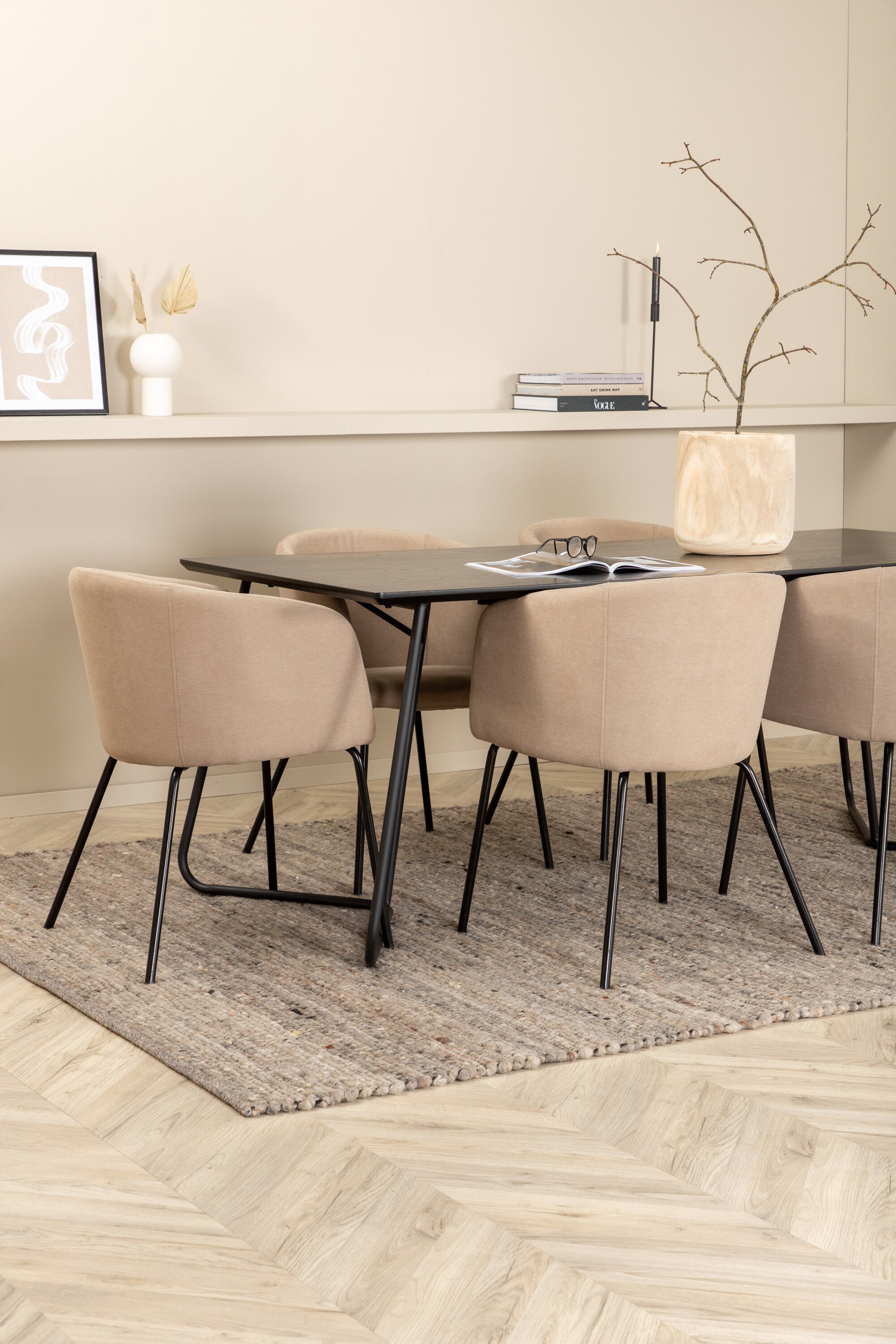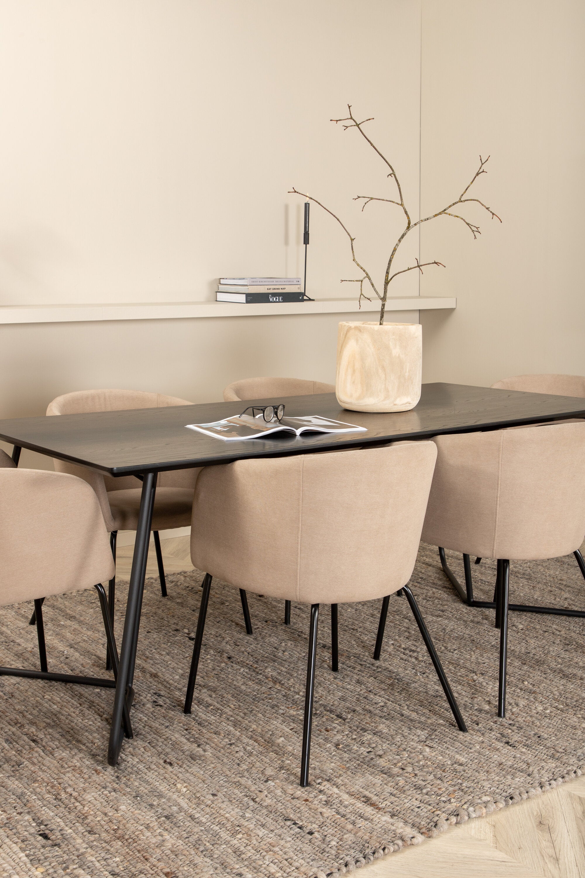 Ponořte se do této příjemné a stylové skupiny jídel na dlouhou večeři s rodinou a přáteli! Jídelní stůl Petra má promyšlený design se skandinávskými tvary, který působí stylově, úzké, lehce rozšířené nohy z černého železa a stolní deska z černé MDF s dýhou. Rozměry stolu: Délka: 190 cm, Šířka: 90 cm, Výška: 75 cm. Zde v dokonalé kombinaci se 6 pohodlnými jídelními židlemi ze série Berit. Nohy židle jsou z černého železa a plně oblečený sedák z béžového polyesterového plátna. Rozměry židle: výška: 78 cm, výška sedáku: 49 cm, šířka: 55 cm, hloubka: 55 cm. Luxusní a stylová skupina jídel, která vás zve na dlouhé chvíle večeře!