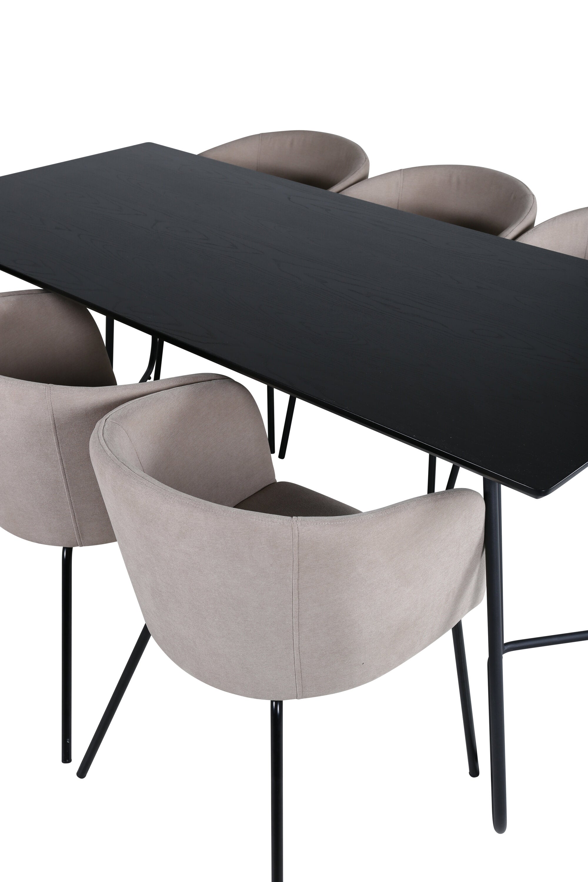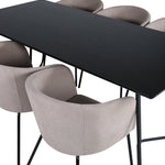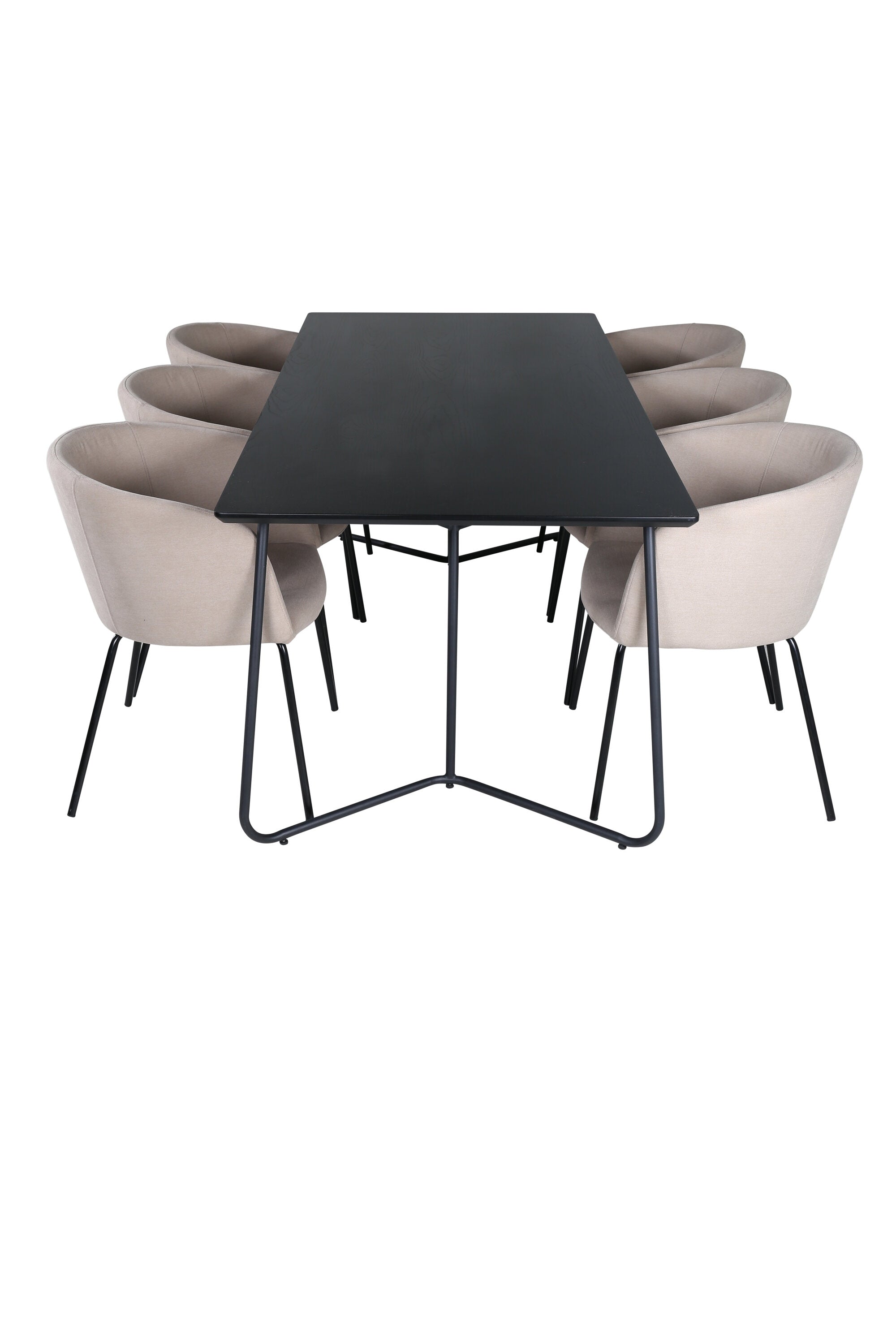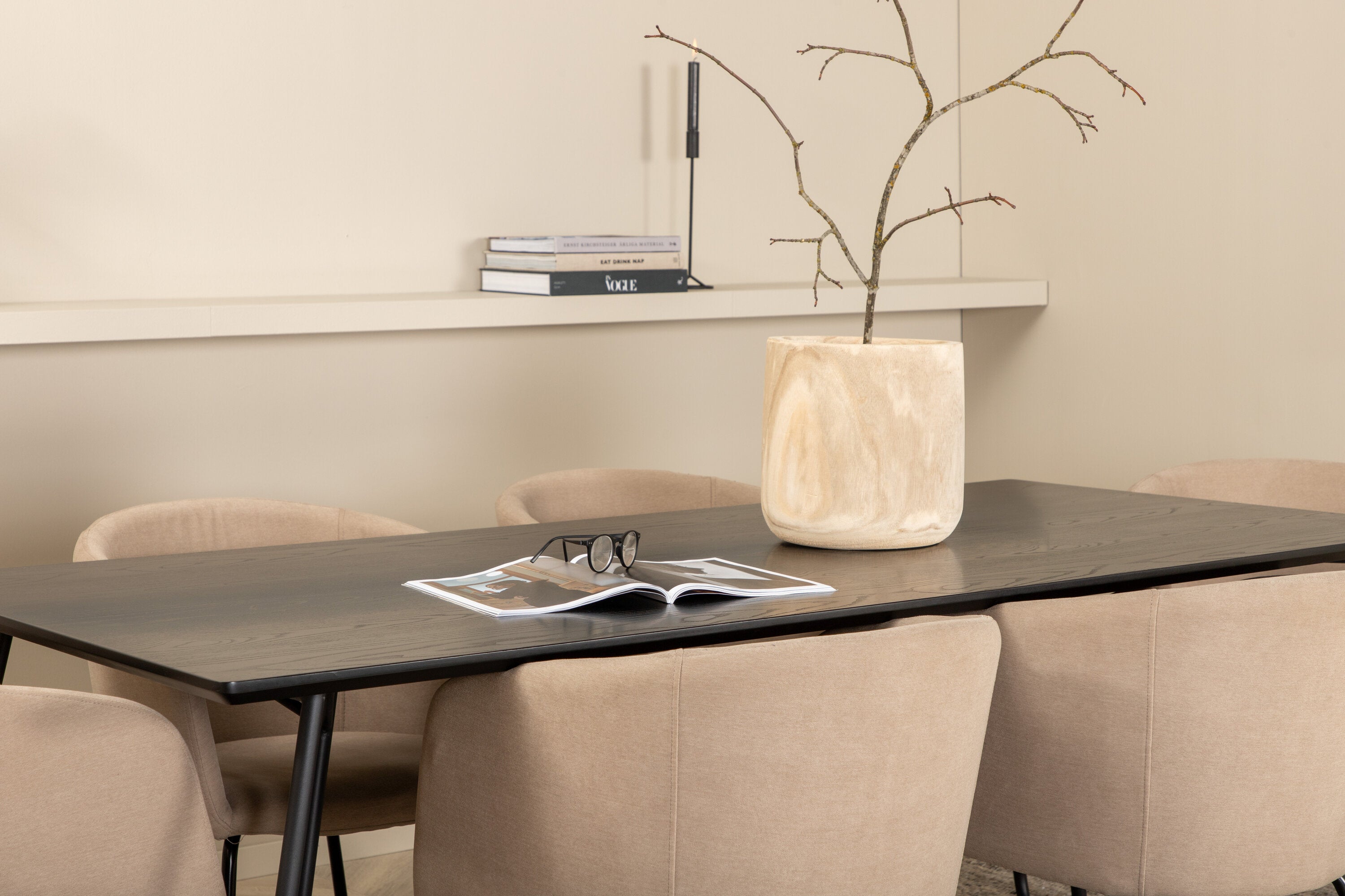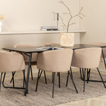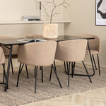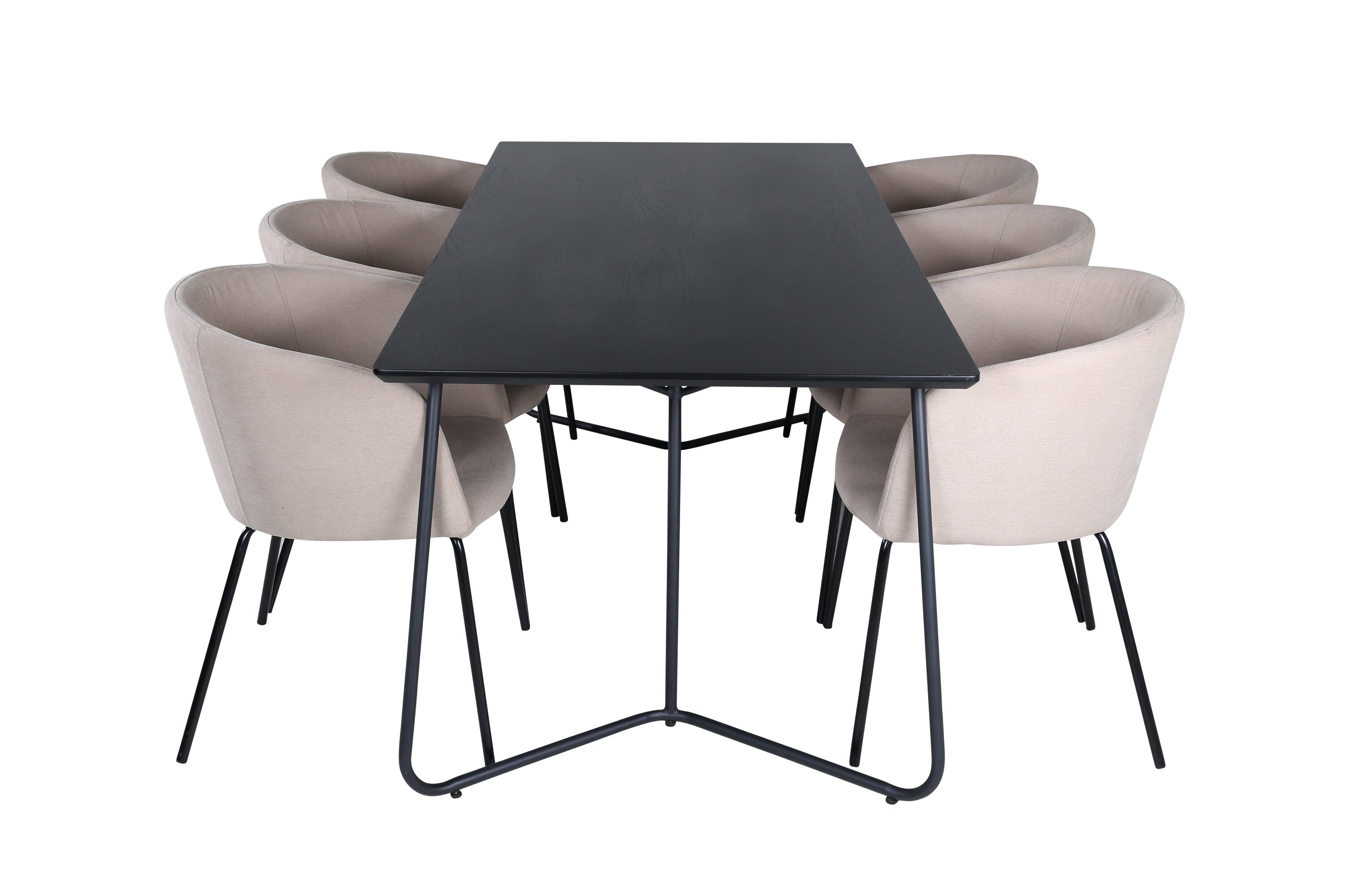 Ponořte se do této příjemné a stylové skupiny jídel na dlouhou večeři s rodinou a přáteli! Jídelní stůl Petra má promyšlený design se skandinávskými tvary, který působí stylově, úzké, lehce rozšířené nohy z černého železa a stolní deska z černé MDF s dýhou. Rozměry stolu: Délka: 190 cm, Šířka: 90 cm, Výška: 75 cm. Zde v dokonalé kombinaci se 6 pohodlnými jídelními židlemi ze série Berit. Nohy židle jsou z černého železa a plně oblečený sedák z béžového polyesterového plátna. Rozměry židle: výška: 78 cm, výška sedáku: 49 cm, šířka: 55 cm, hloubka: 55 cm. Luxusní a stylová skupina jídel, která vás zve na dlouhé chvíle večeře!