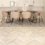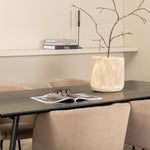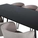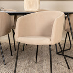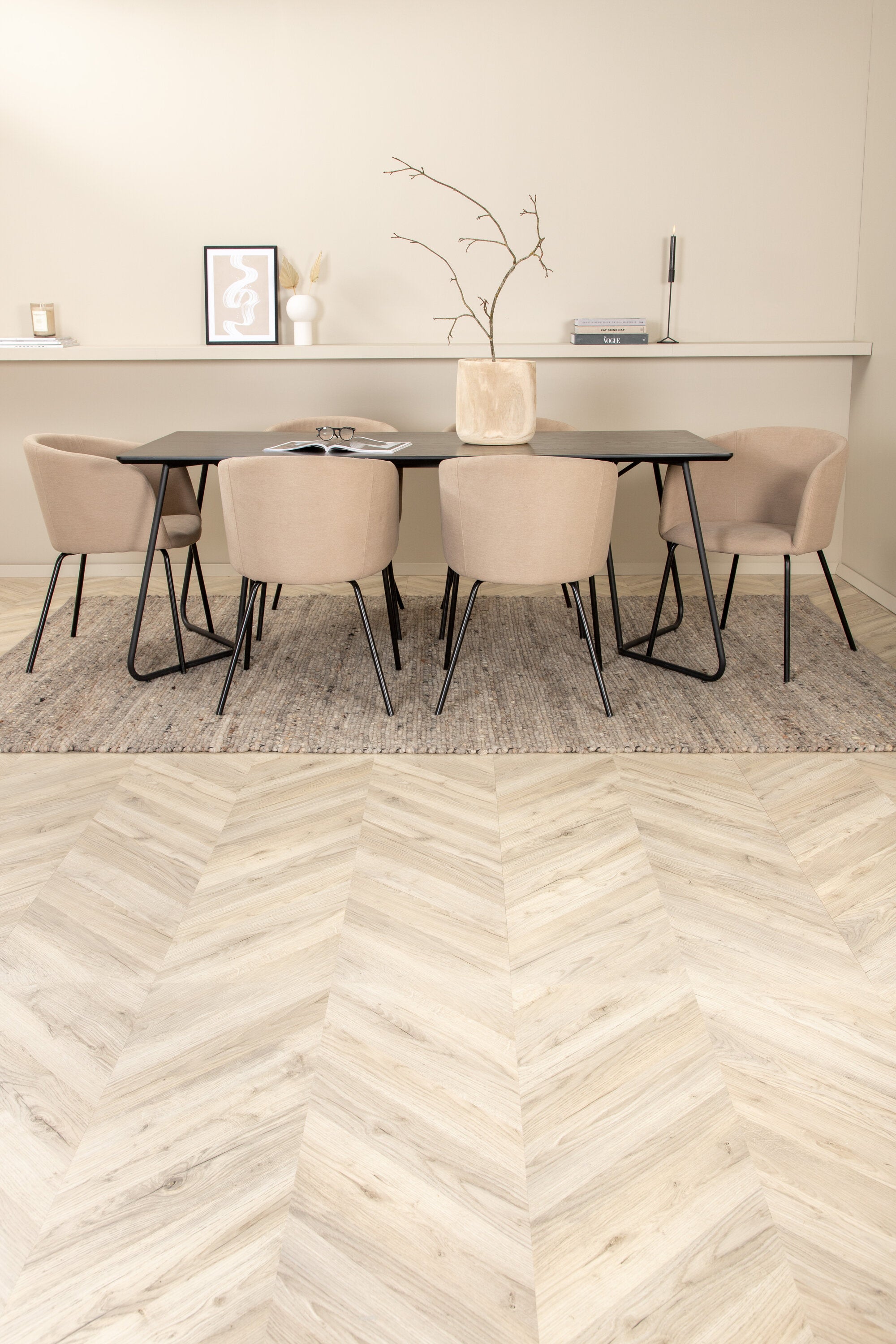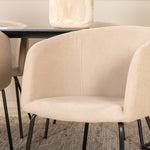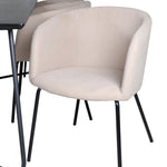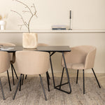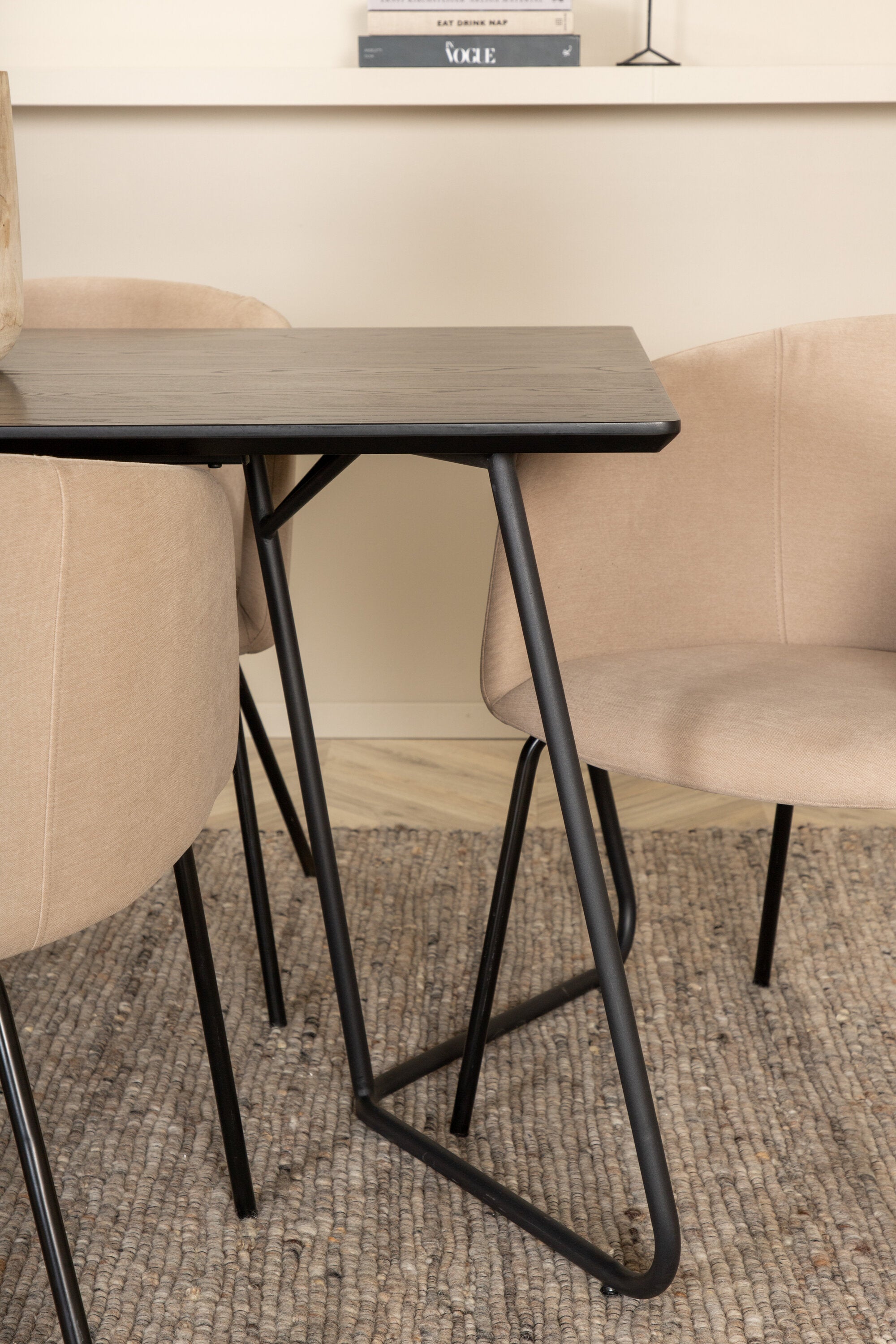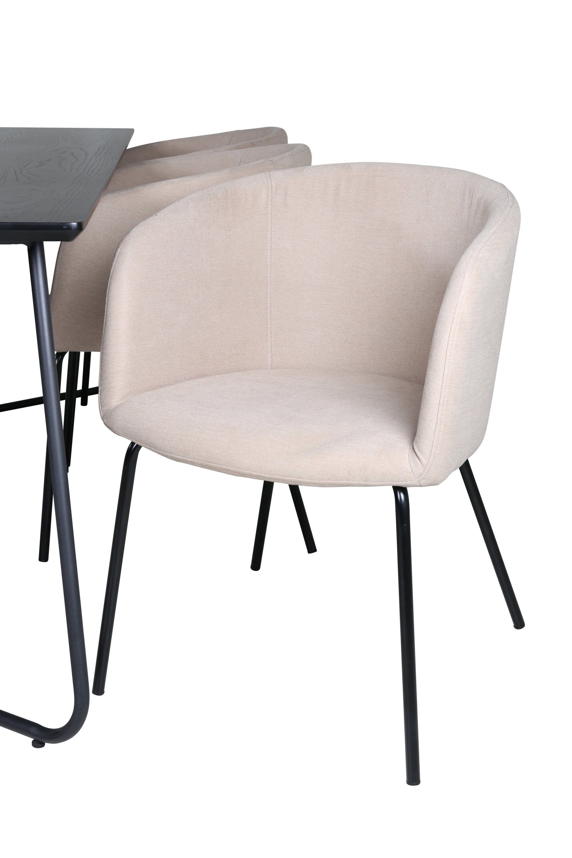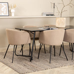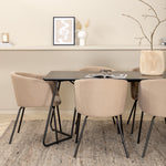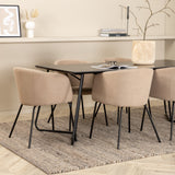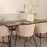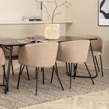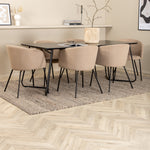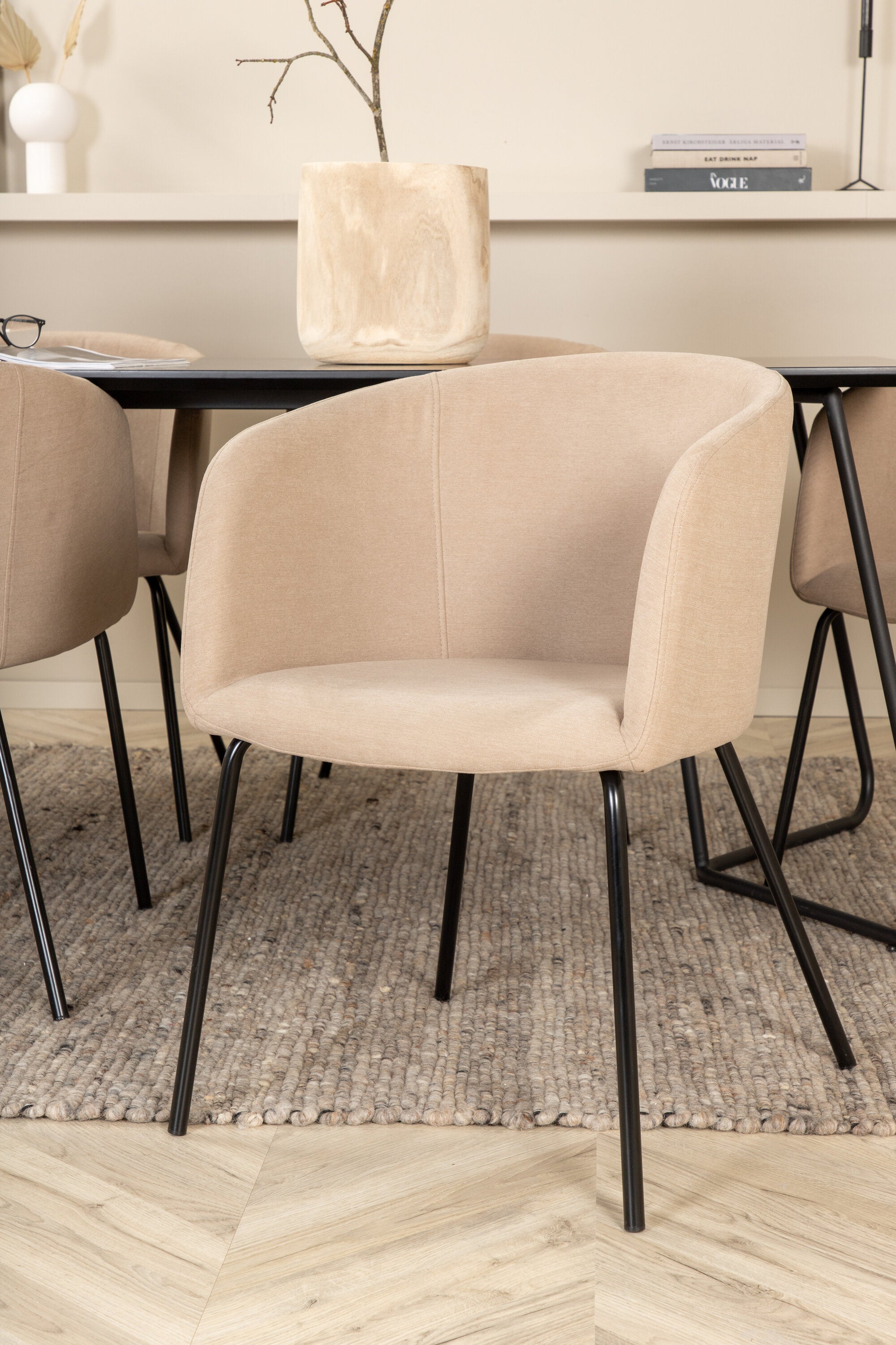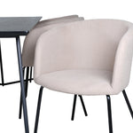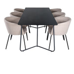 Ponořte se do této příjemné a stylové skupiny jídel na dlouhou večeři s rodinou a přáteli! Jídelní stůl Petra má promyšlený design se skandinávskými tvary, který působí stylově, úzké, lehce rozšířené nohy z černého železa a stolní deska z černé MDF s dýhou. Rozměry stolu: Délka: 190 cm, Šířka: 90 cm, Výška: 75 cm. Zde v dokonalé kombinaci se 6 pohodlnými jídelními židlemi ze série Berit. Nohy židle jsou z černého železa a plně oblečený sedák z béžového polyesterového plátna. Rozměry židle: výška: 78 cm, výška sedáku: 49 cm, šířka: 55 cm, hloubka: 55 cm. Luxusní a stylová skupina jídel, která vás zve na dlouhé chvíle večeře!
