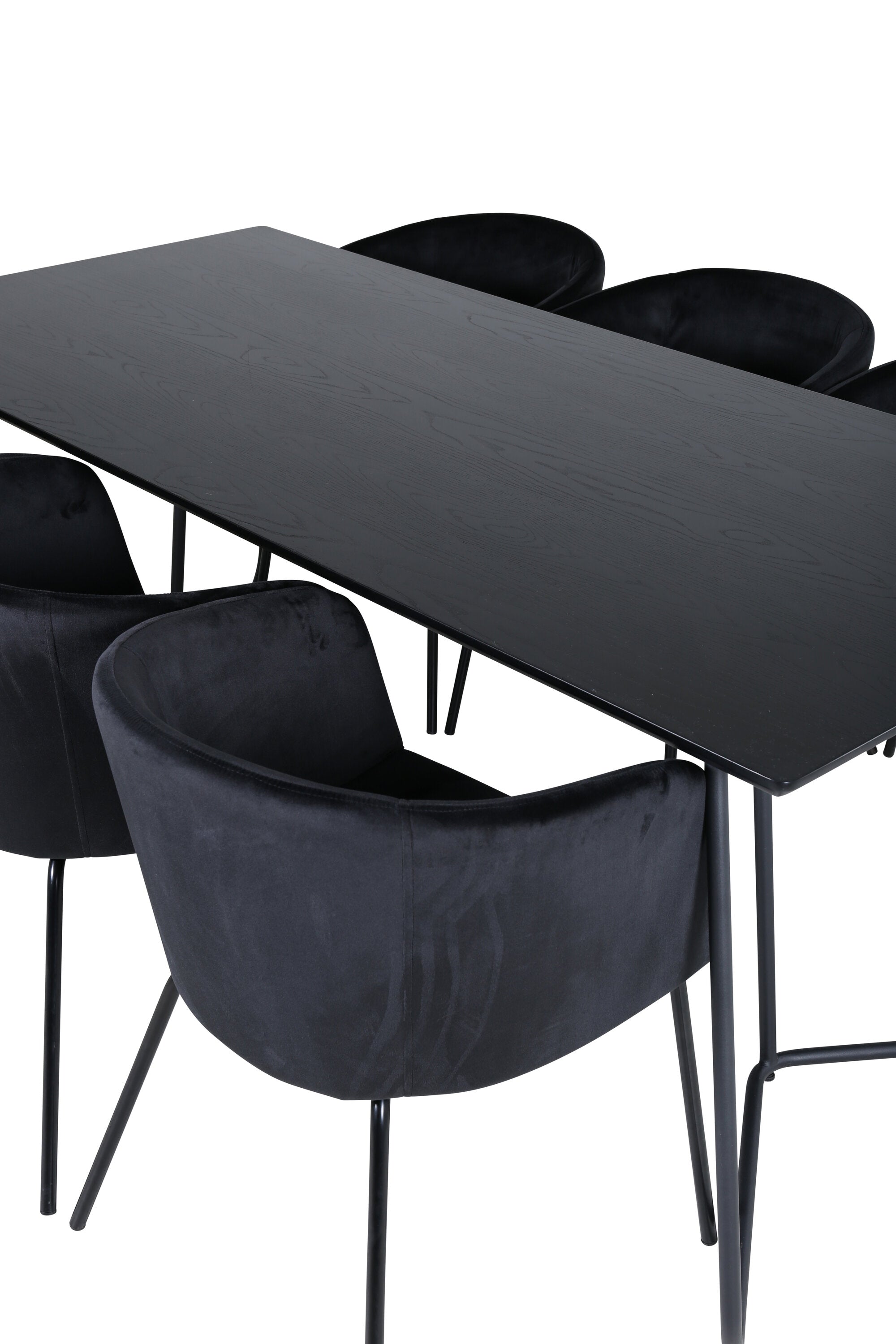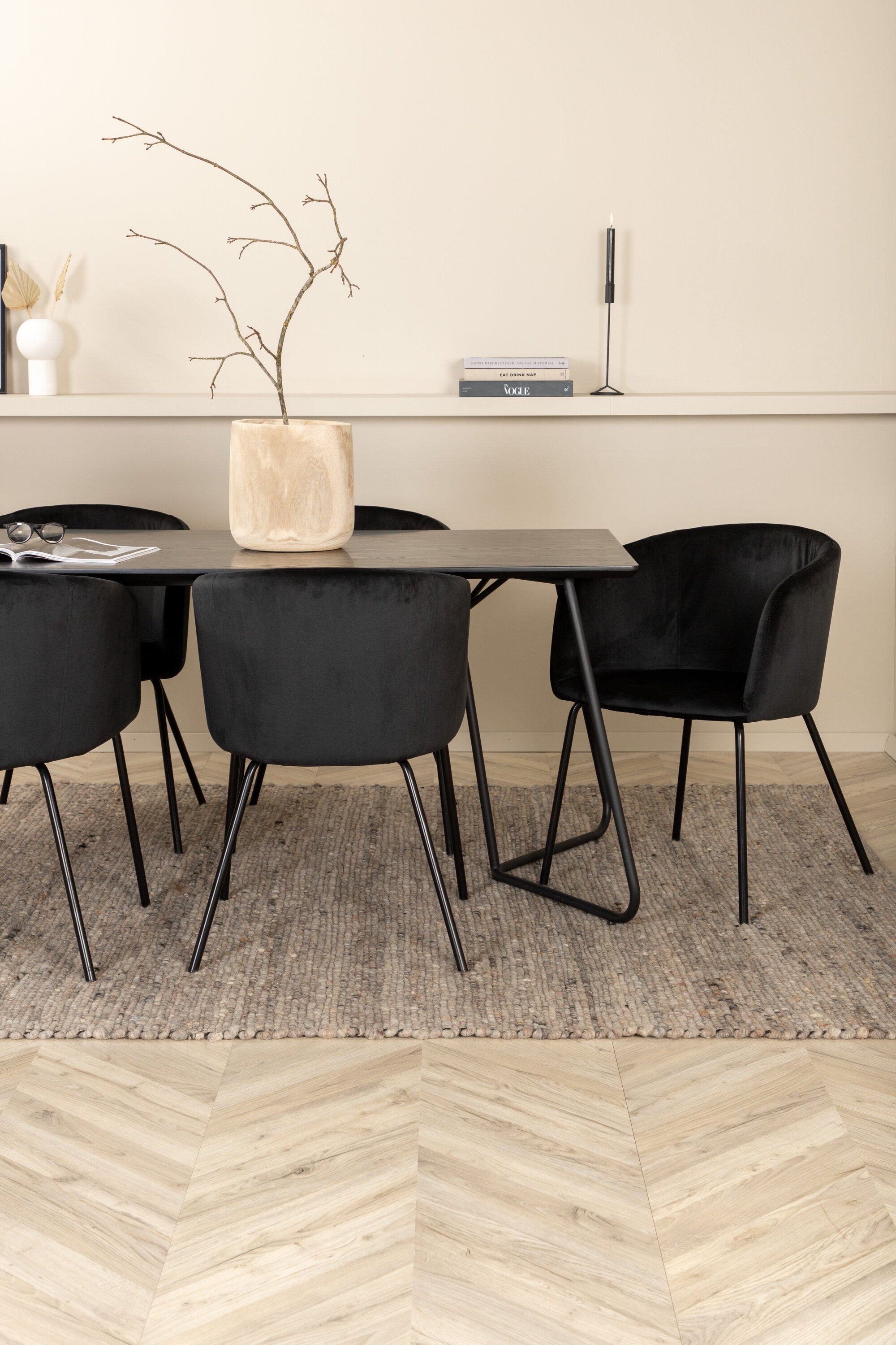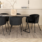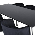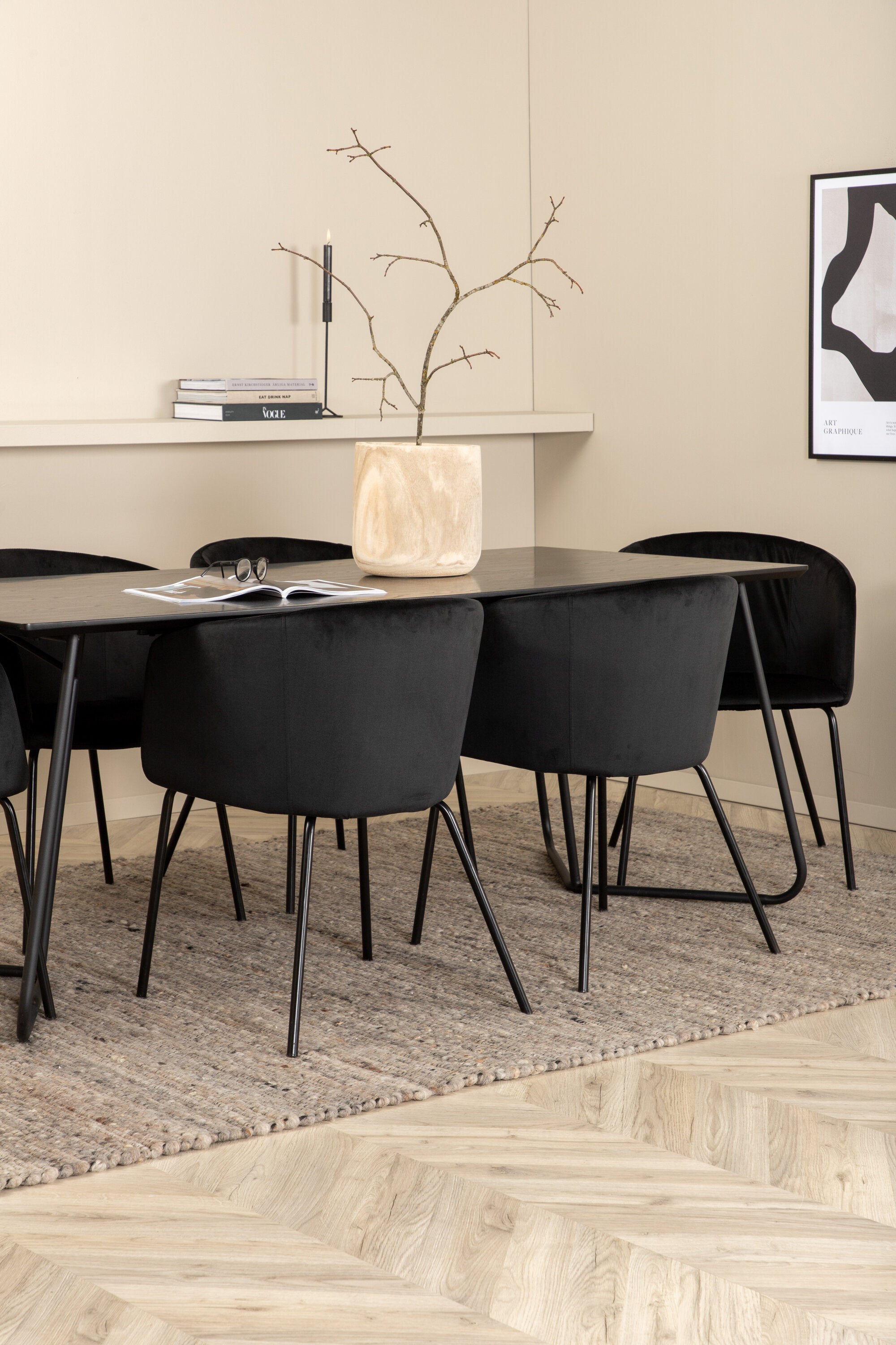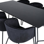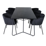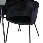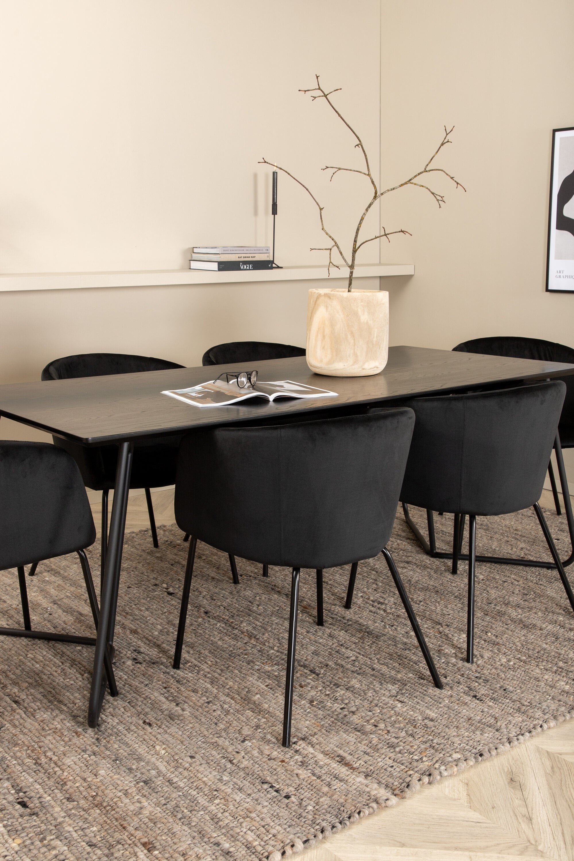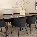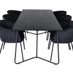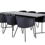 Ponořte se do této příjemné a stylové skupiny jídel na dlouhou večeři s rodinou a přáteli! Jídelní stůl Petra má promyšlený design se skandinávskými tvary, který působí stylově, úzké, lehce rozšířené nohy z černého železa a stolní deska z černé MDF s dýhou. Rozměry stolu: Délka: 190 cm, Šířka: 90 cm, Výška: 75 cm. Zde v dokonalé kombinaci se 6 pohodlnými jídelními židlemi ze série Berit. Nohy židle jsou z černého železa a plně oblečený sedák z černého sametu, který místnosti dodává lahodný lesk. Rozměry židle: výška: 78 cm, výška sedáku: 49 cm, šířka: 55 cm, hloubka: 55 cm. Luxusní a stylová skupina jídel, která vás zve na dlouhé chvíle večeře!