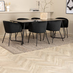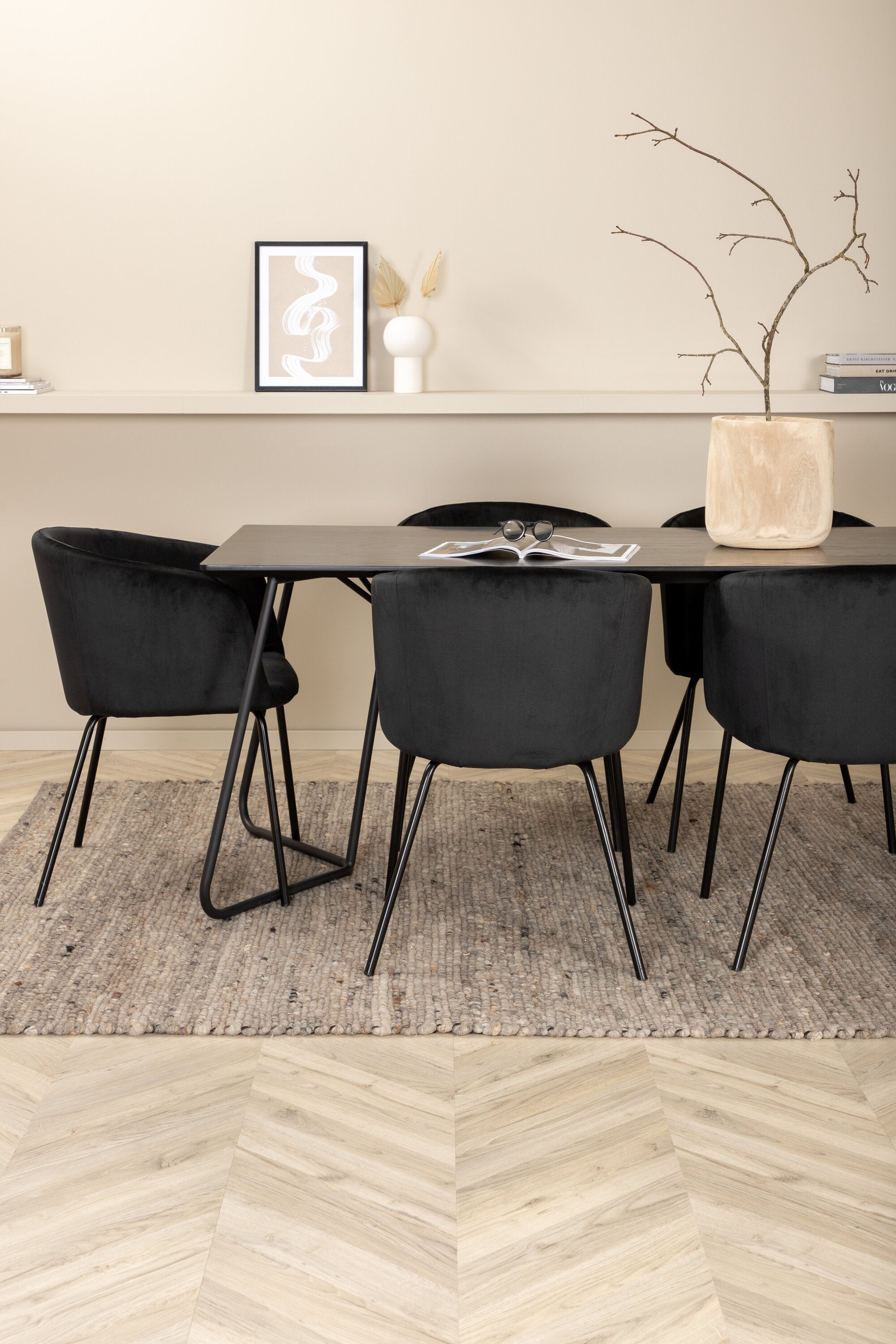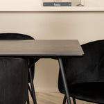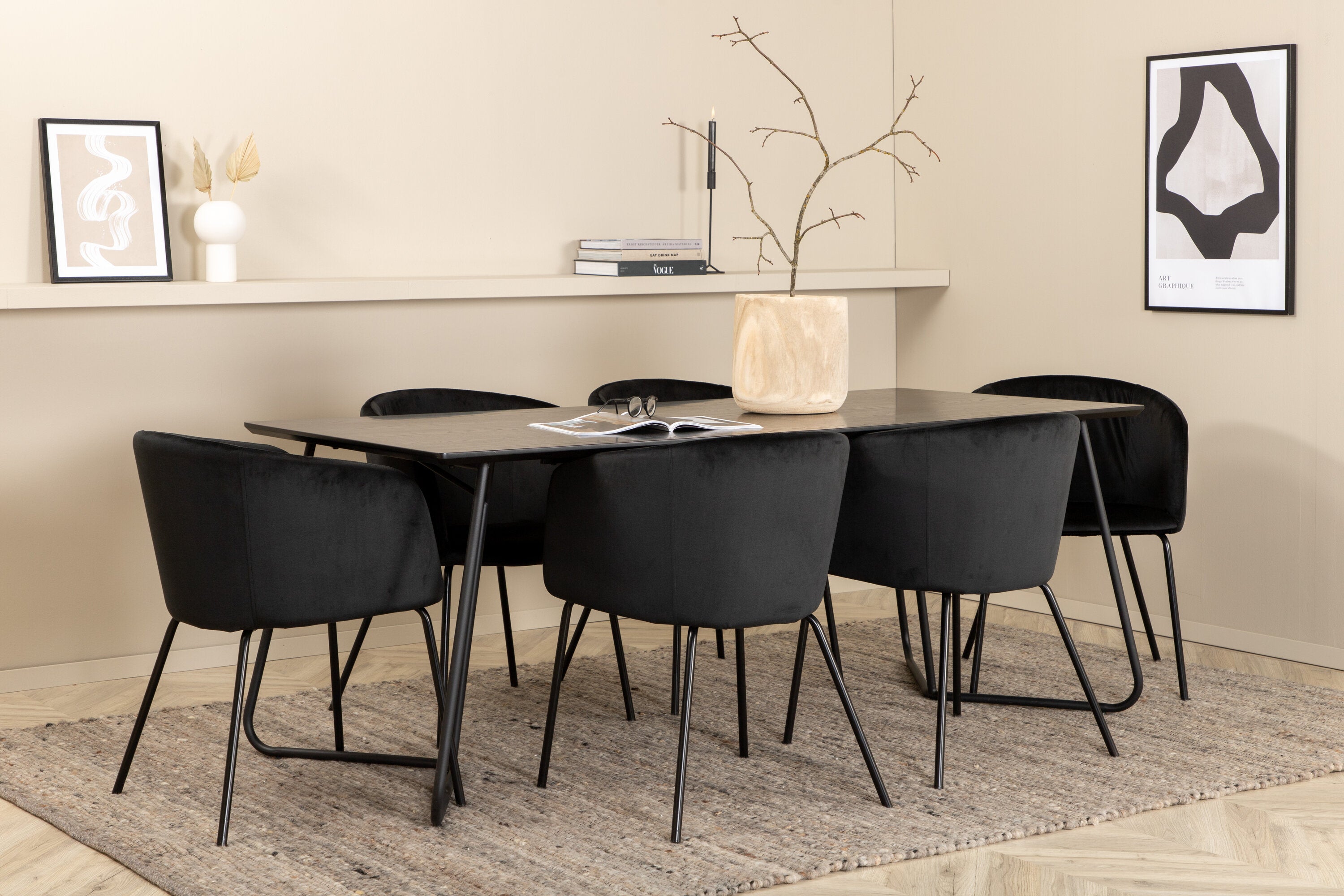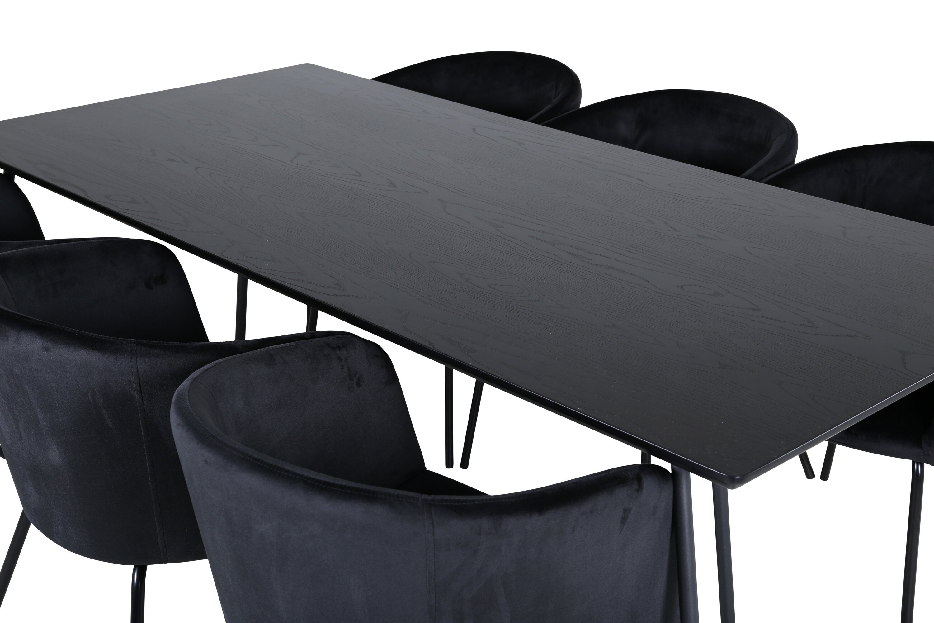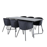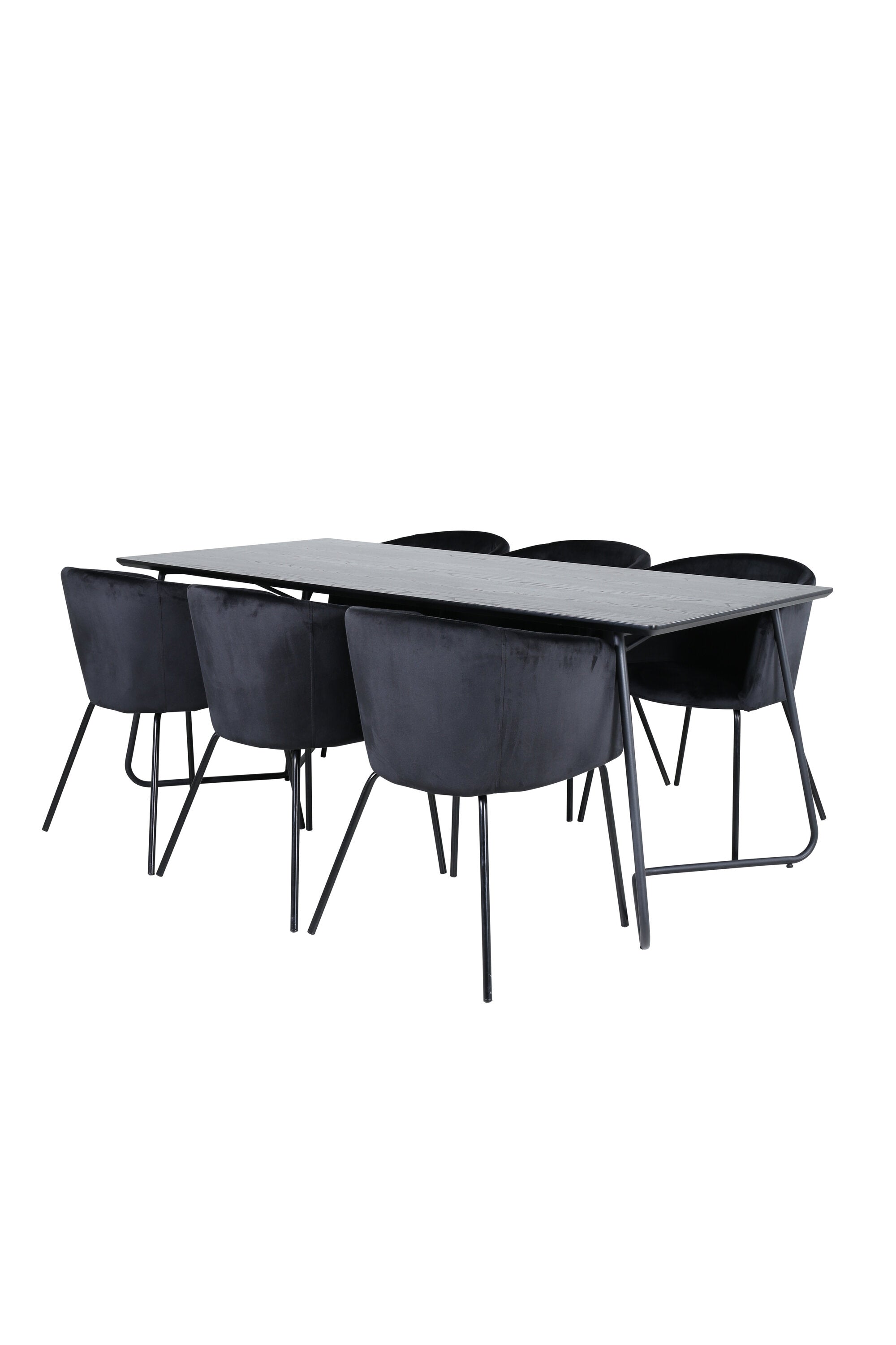 Ponořte se do této příjemné a stylové skupiny jídel na dlouhou večeři s rodinou a přáteli! Jídelní stůl Petra má promyšlený design se skandinávskými tvary, který působí stylově, úzké, lehce rozšířené nohy z černého železa a stolní deska z černé MDF s dýhou. Rozměry stolu: Délka: 190 cm, Šířka: 90 cm, Výška: 75 cm. Zde v dokonalé kombinaci se 6 pohodlnými jídelními židlemi ze série Berit. Nohy židle jsou z černého železa a plně oblečený sedák z černého sametu, který místnosti dodává lahodný lesk. Rozměry židle: výška: 78 cm, výška sedáku: 49 cm, šířka: 55 cm, hloubka: 55 cm. Luxusní a stylová skupina jídel, která vás zve na dlouhé chvíle večeře!