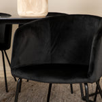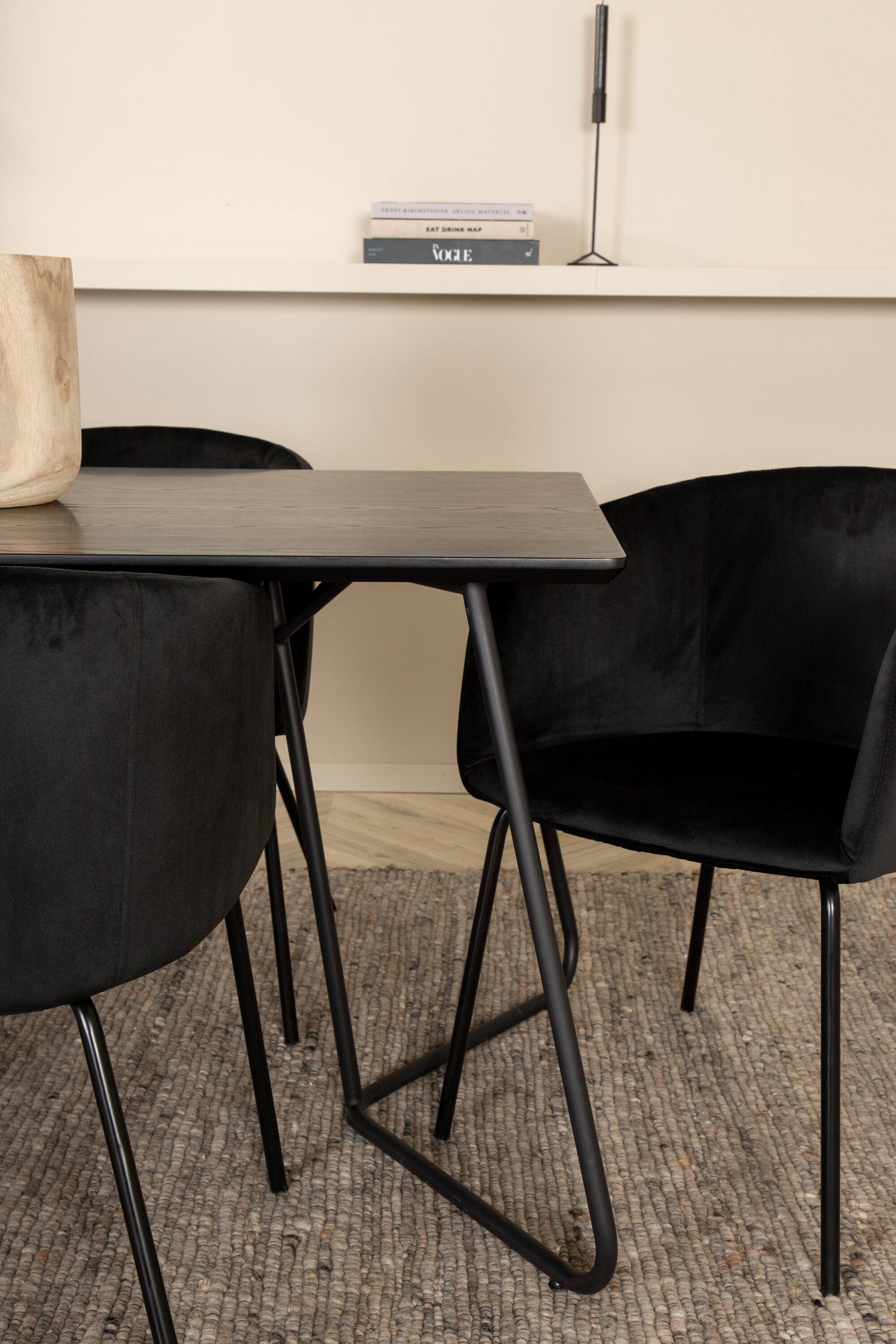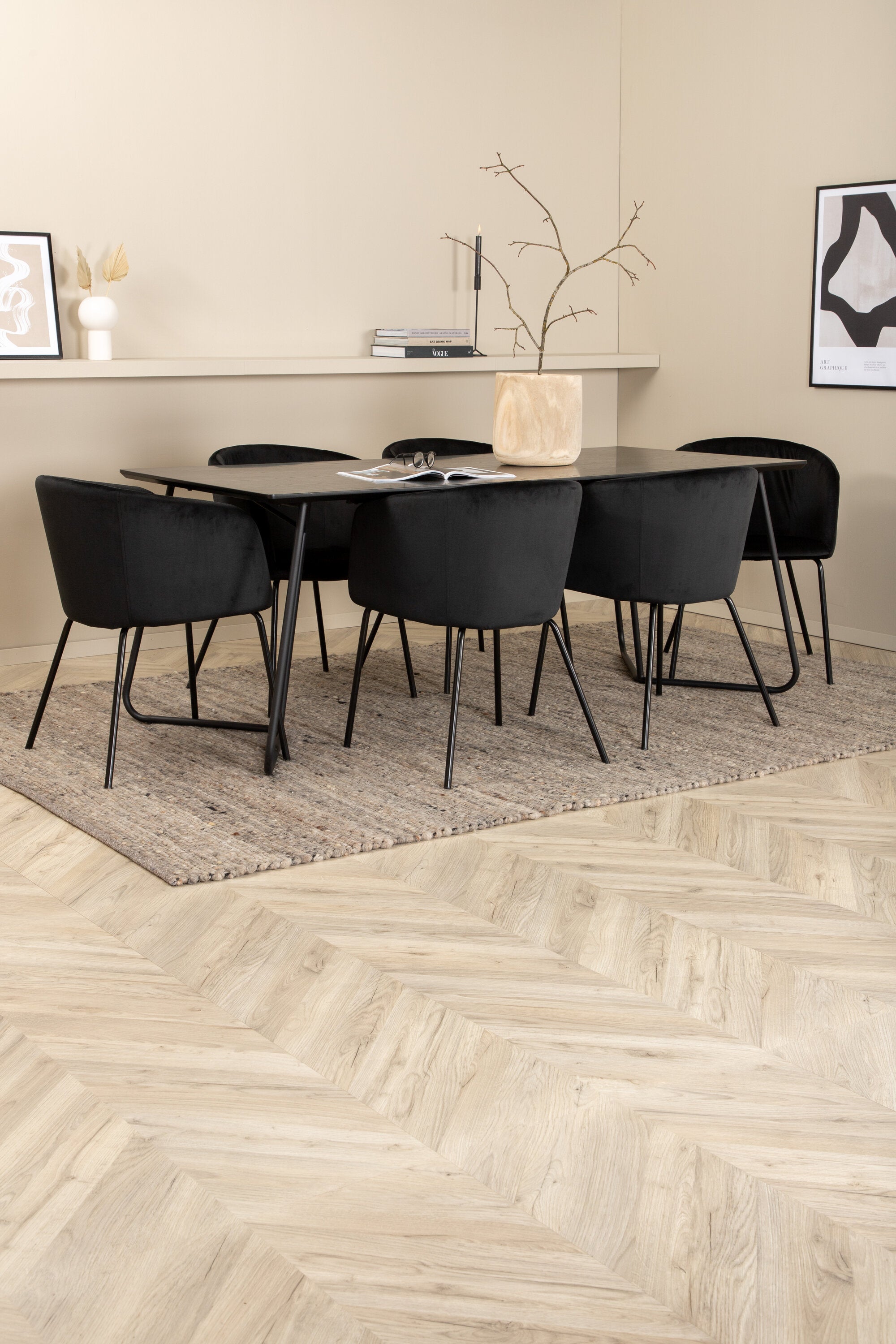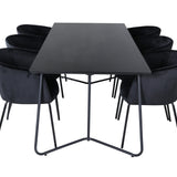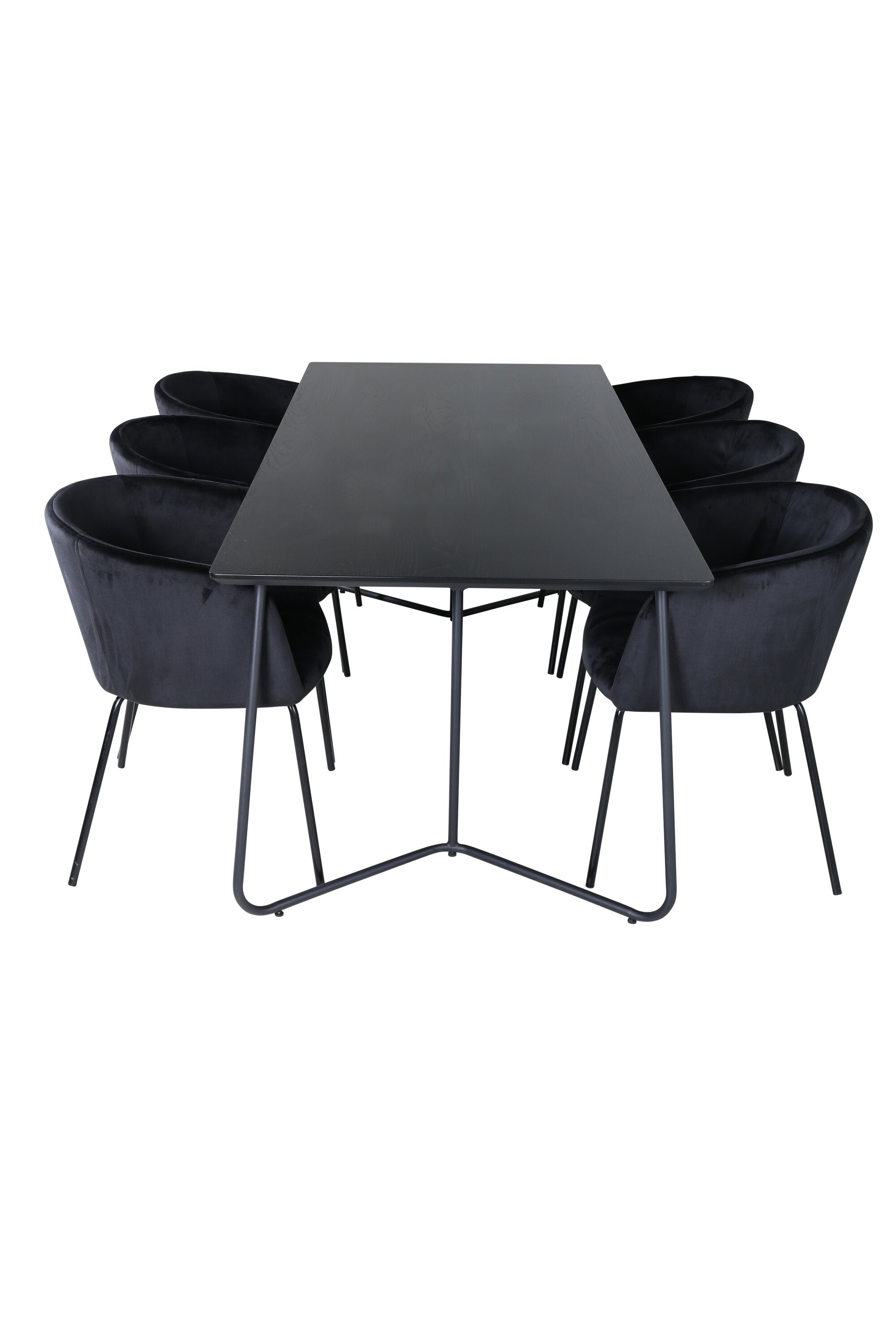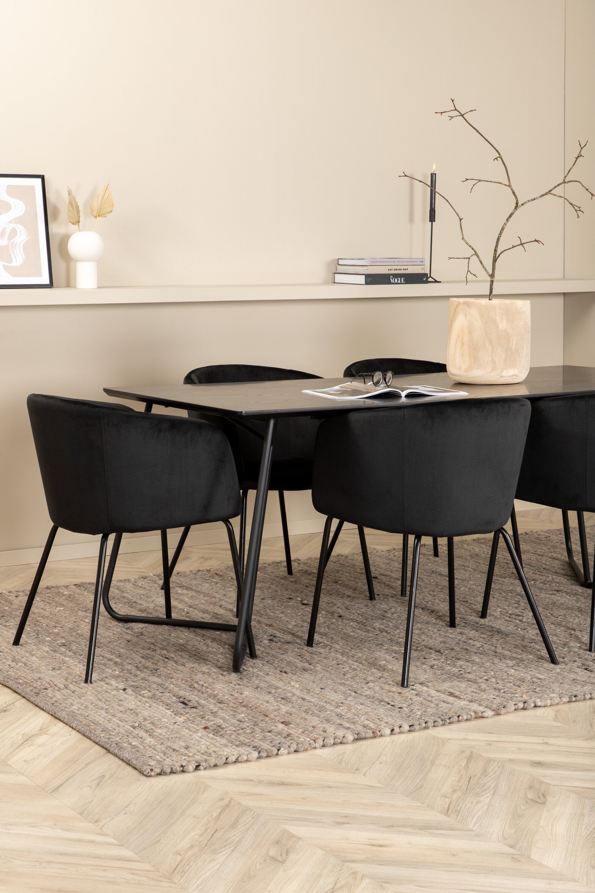 Ponořte se do této příjemné a stylové skupiny jídel na dlouhou večeři s rodinou a přáteli! Jídelní stůl Petra má promyšlený design se skandinávskými tvary, který působí stylově, úzké, lehce rozšířené nohy z černého železa a stolní deska z černé MDF s dýhou. Rozměry stolu: Délka: 190 cm, Šířka: 90 cm, Výška: 75 cm. Zde v dokonalé kombinaci se 6 pohodlnými jídelními židlemi ze série Berit. Nohy židle jsou z černého železa a plně oblečený sedák z černého sametu, který místnosti dodává lahodný lesk. Rozměry židle: výška: 78 cm, výška sedáku: 49 cm, šířka: 55 cm, hloubka: 55 cm. Luxusní a stylová skupina jídel, která vás zve na dlouhé chvíle večeře!