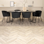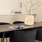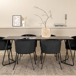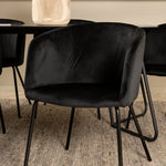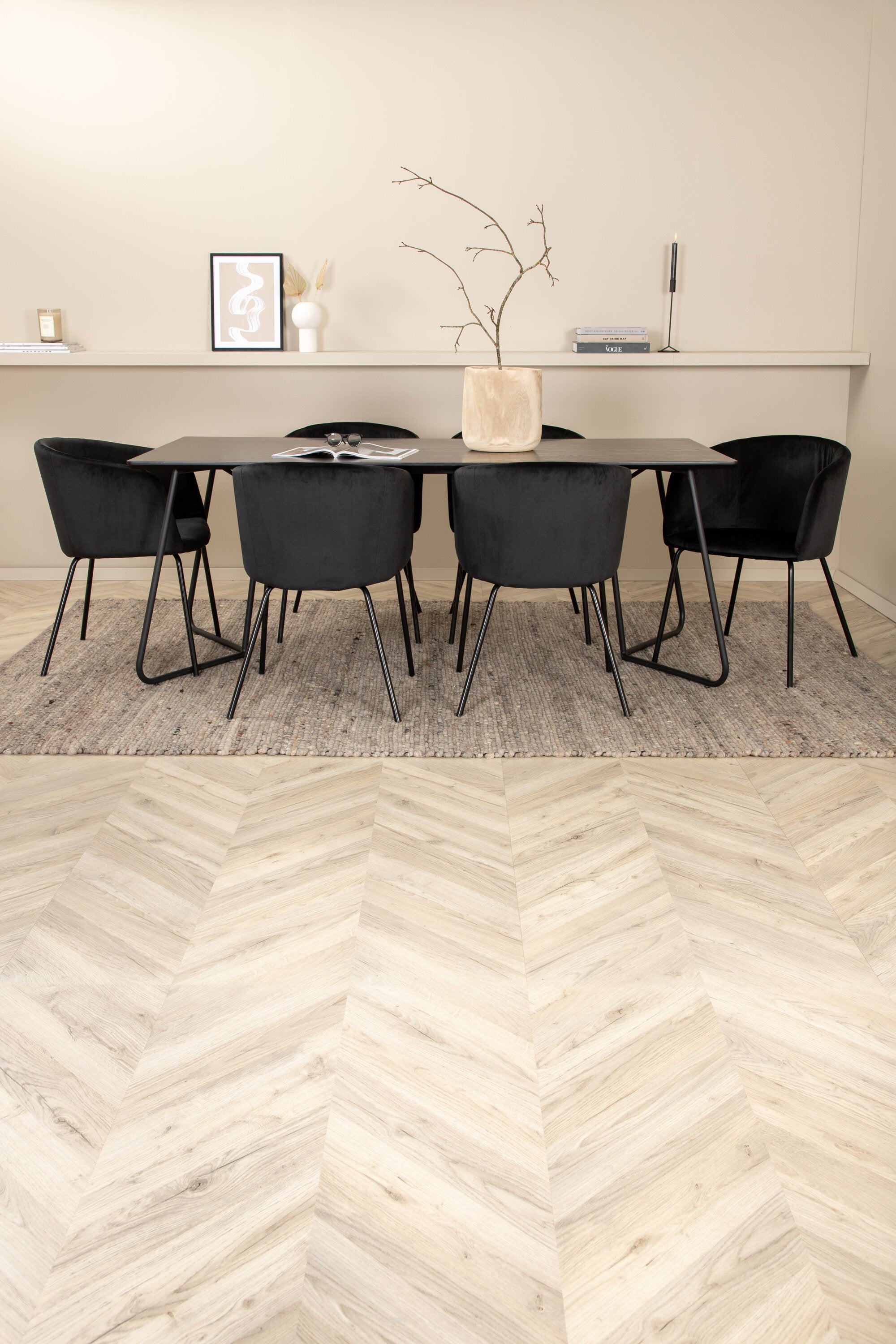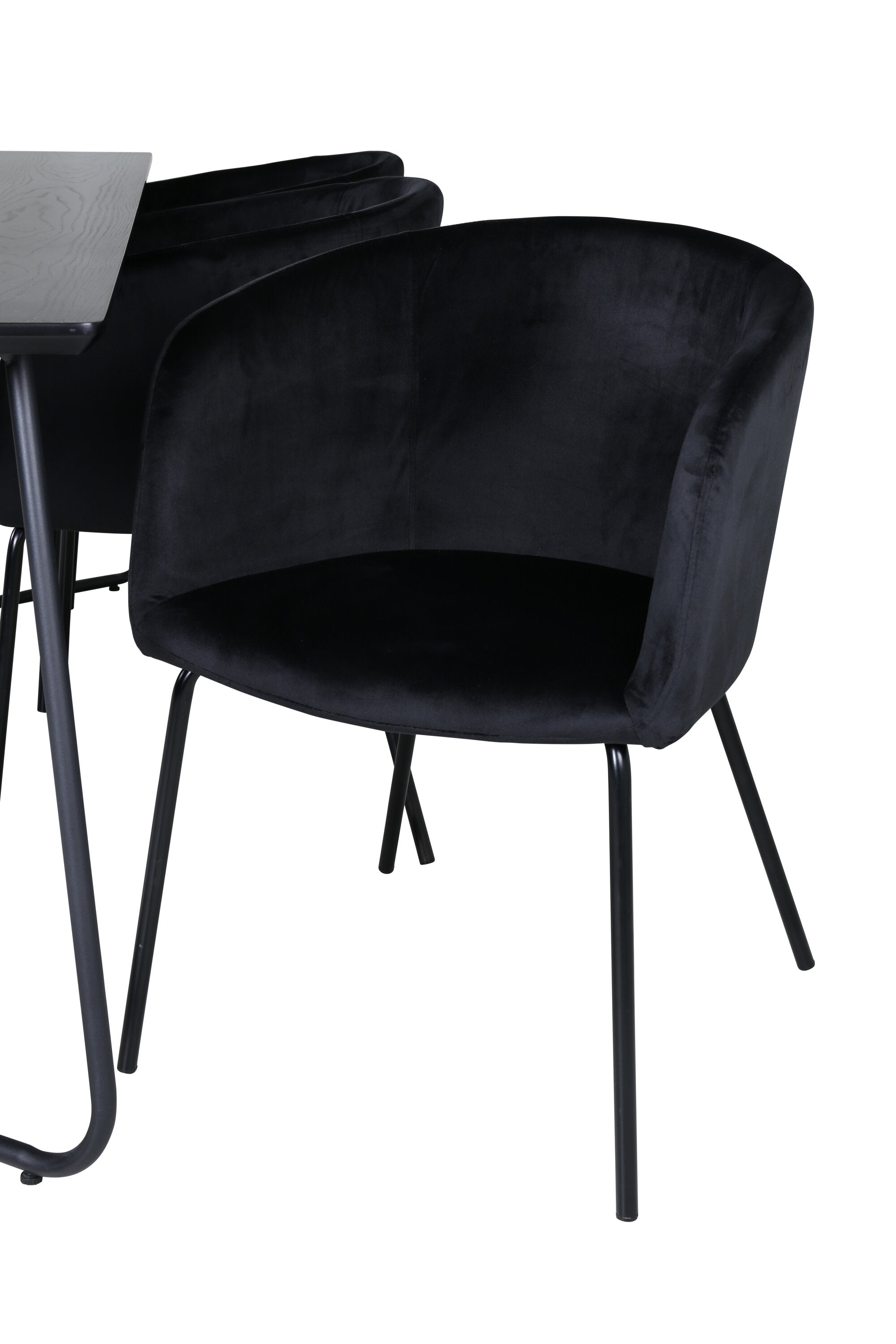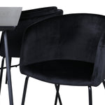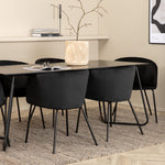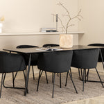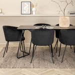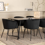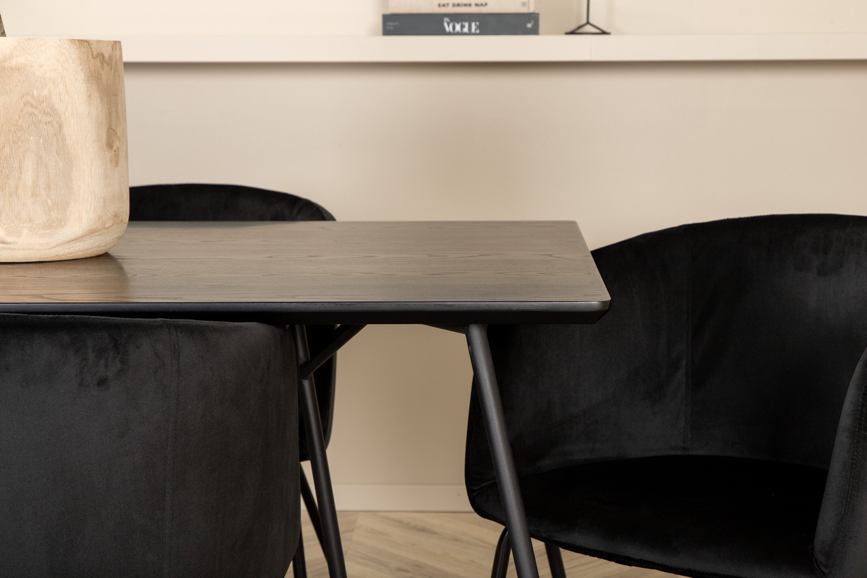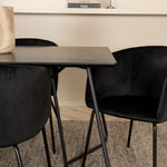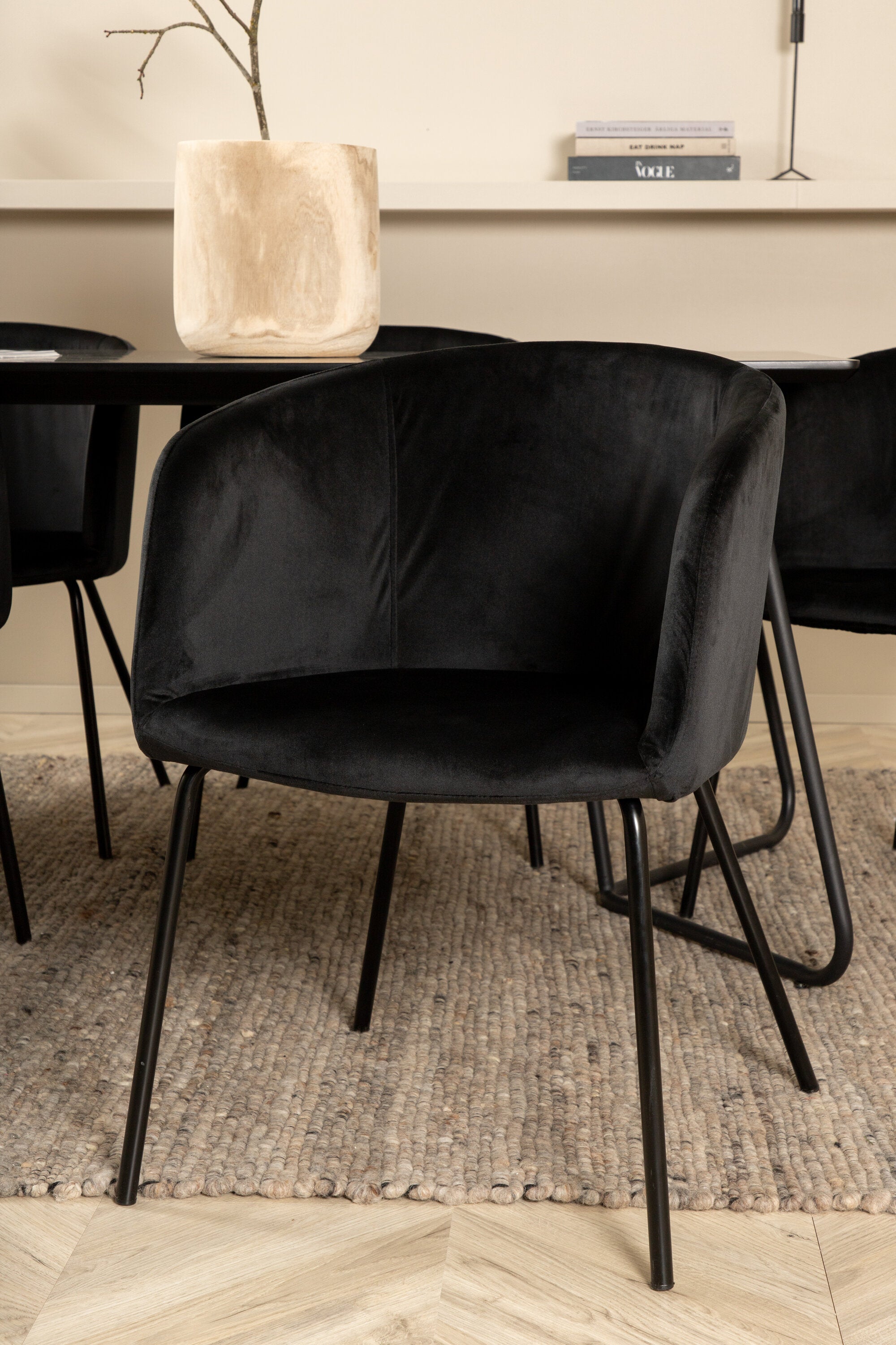 Ponořte se do této příjemné a stylové skupiny jídel na dlouhou večeři s rodinou a přáteli! Jídelní stůl Petra má promyšlený design se skandinávskými tvary, který působí stylově, úzké, lehce rozšířené nohy z černého železa a stolní deska z černé MDF s dýhou. Rozměry stolu: Délka: 190 cm, Šířka: 90 cm, Výška: 75 cm. Zde v dokonalé kombinaci se 6 pohodlnými jídelními židlemi ze série Berit. Nohy židle jsou z černého železa a plně oblečený sedák z černého sametu, který místnosti dodává lahodný lesk. Rozměry židle: výška: 78 cm, výška sedáku: 49 cm, šířka: 55 cm, hloubka: 55 cm. Luxusní a stylová skupina jídel, která vás zve na dlouhé chvíle večeře!