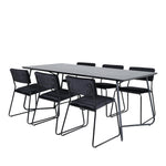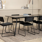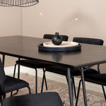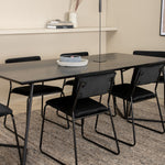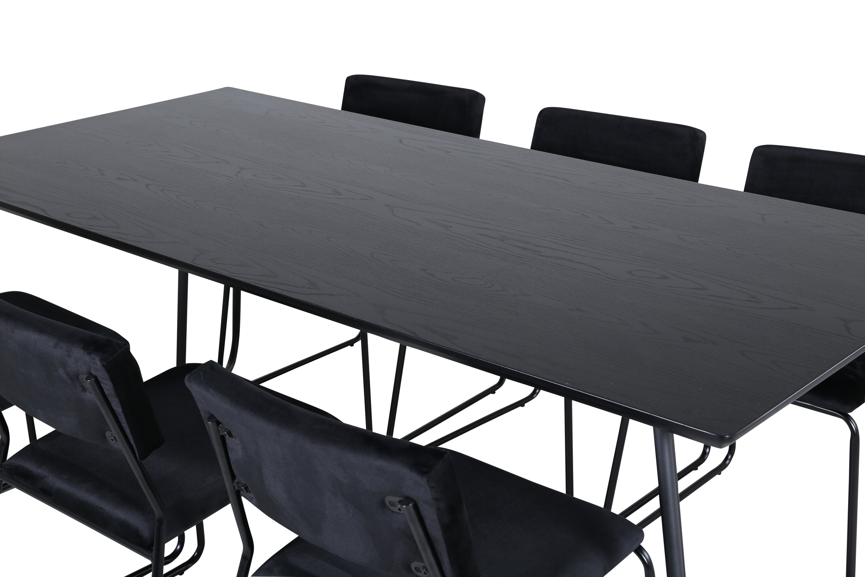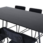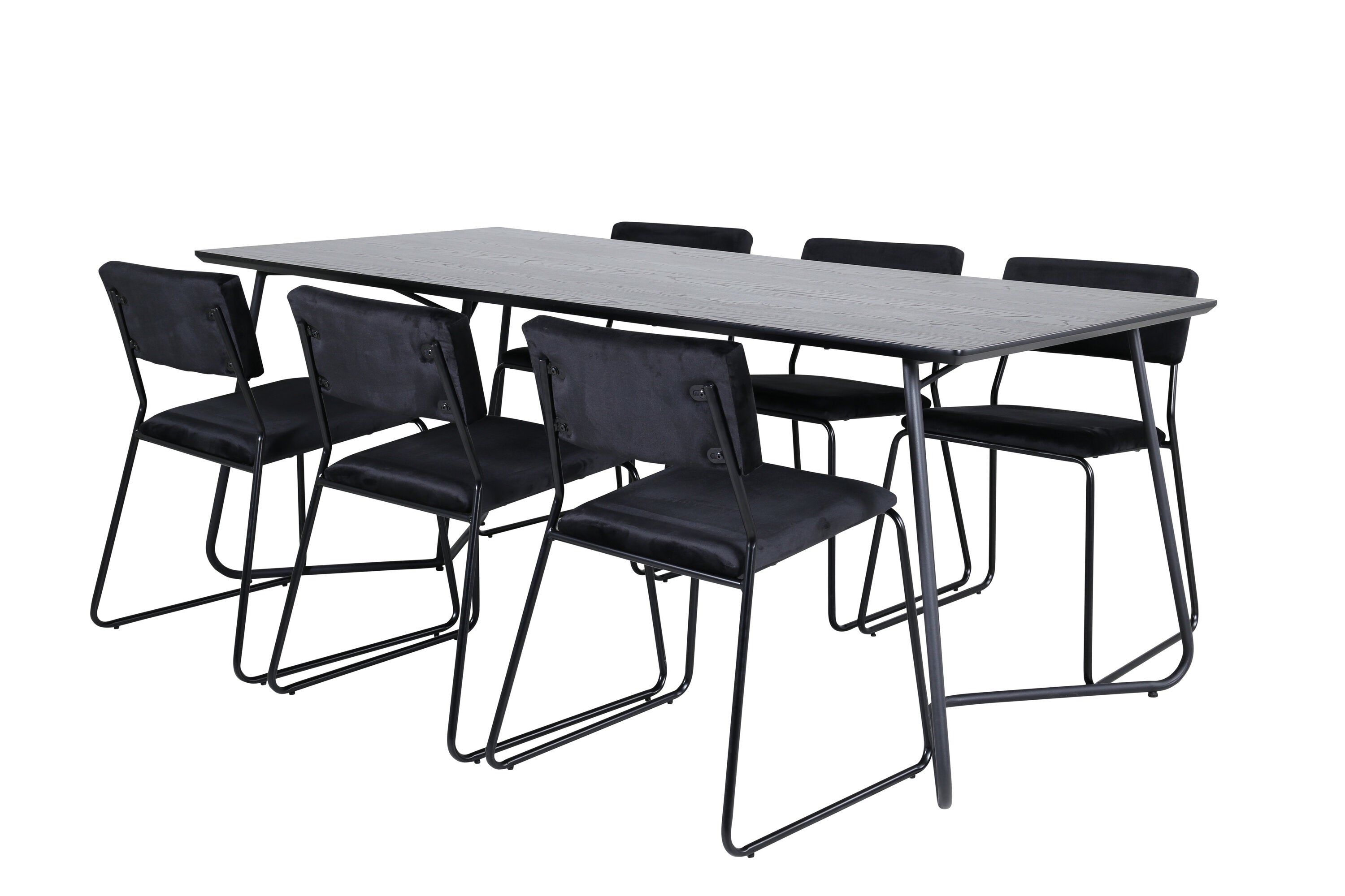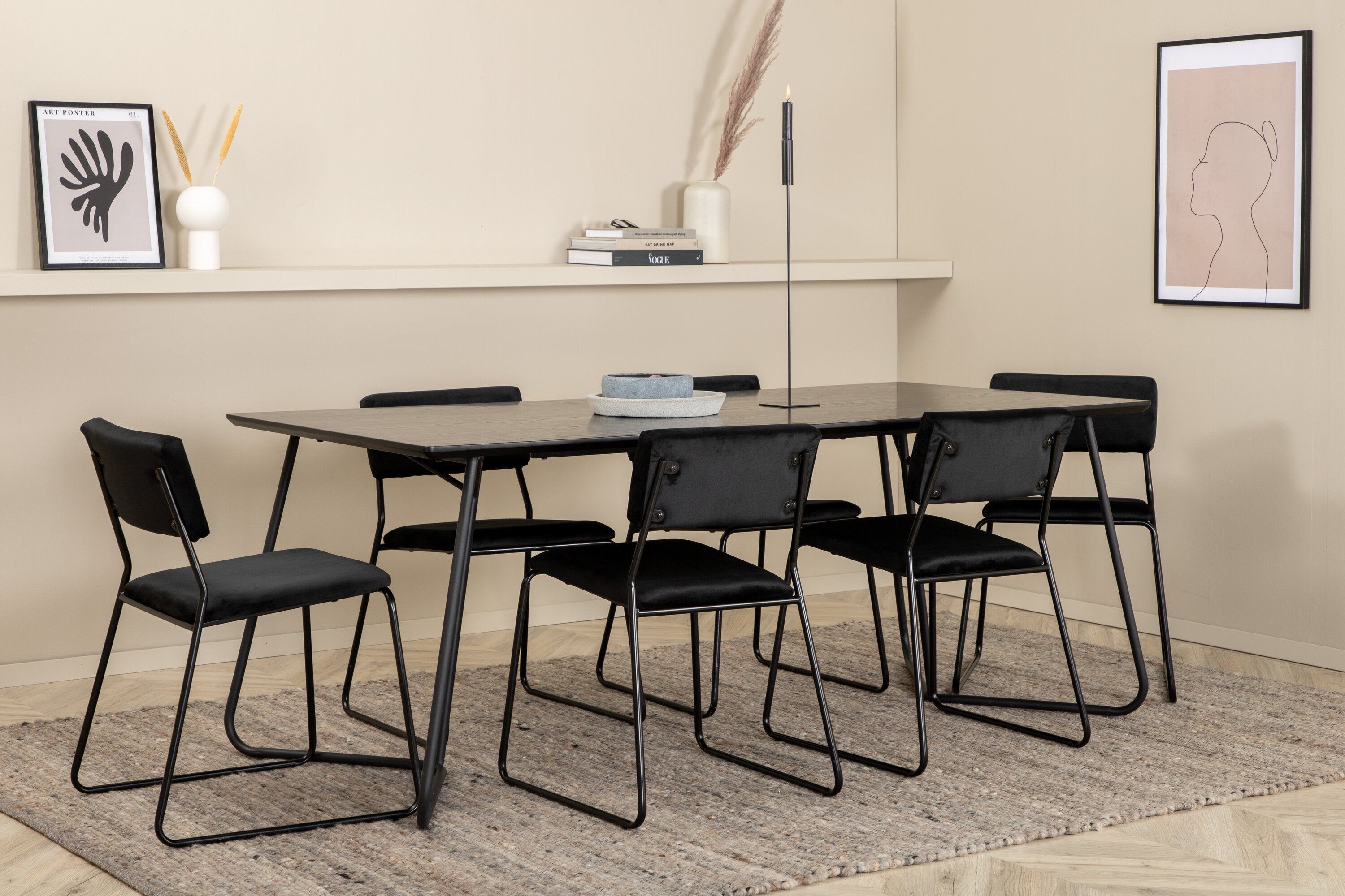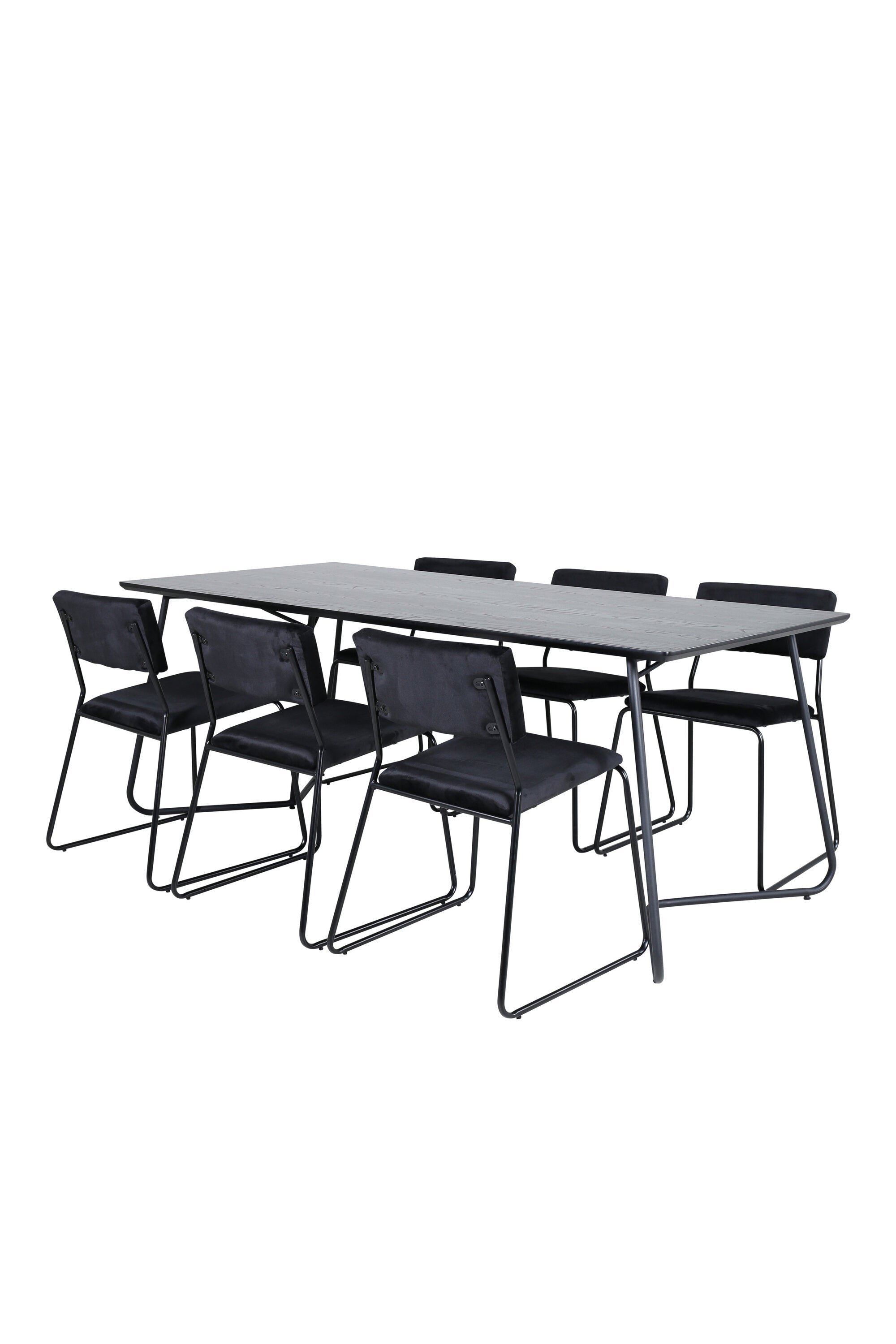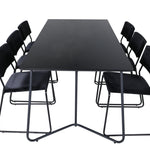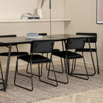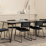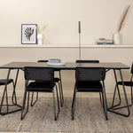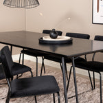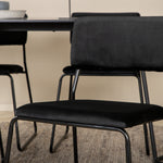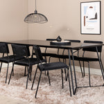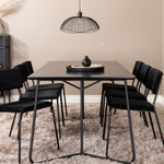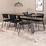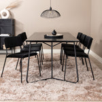 Příjemný, stylový a nadčasový - jídelní stůl Petra působí u vás doma módním dojmem! Design je dobře promyšlený se skandinávskými tvary, které dodávají stylový pocit, úzkými, mírně rozšířenými nohami ze železa a stolní deskou z černé MDF s dýhou. Rozměry stolu: Délka: 190 cm, Šířka: 90 cm, Výška: 75 cm. Sladěno se 6 jídelními židlemi Kenth v černé barvě s železnými nohami židlí a sedáky z měkké sametové látky. Rozměry židle: Výška: 76 cm, výška sedáku: 48,5 cm, šířka: 40 cm, hloubka: 52 cm. Nechte zdobit srdce domova touto poutavou skupinou jídel!