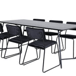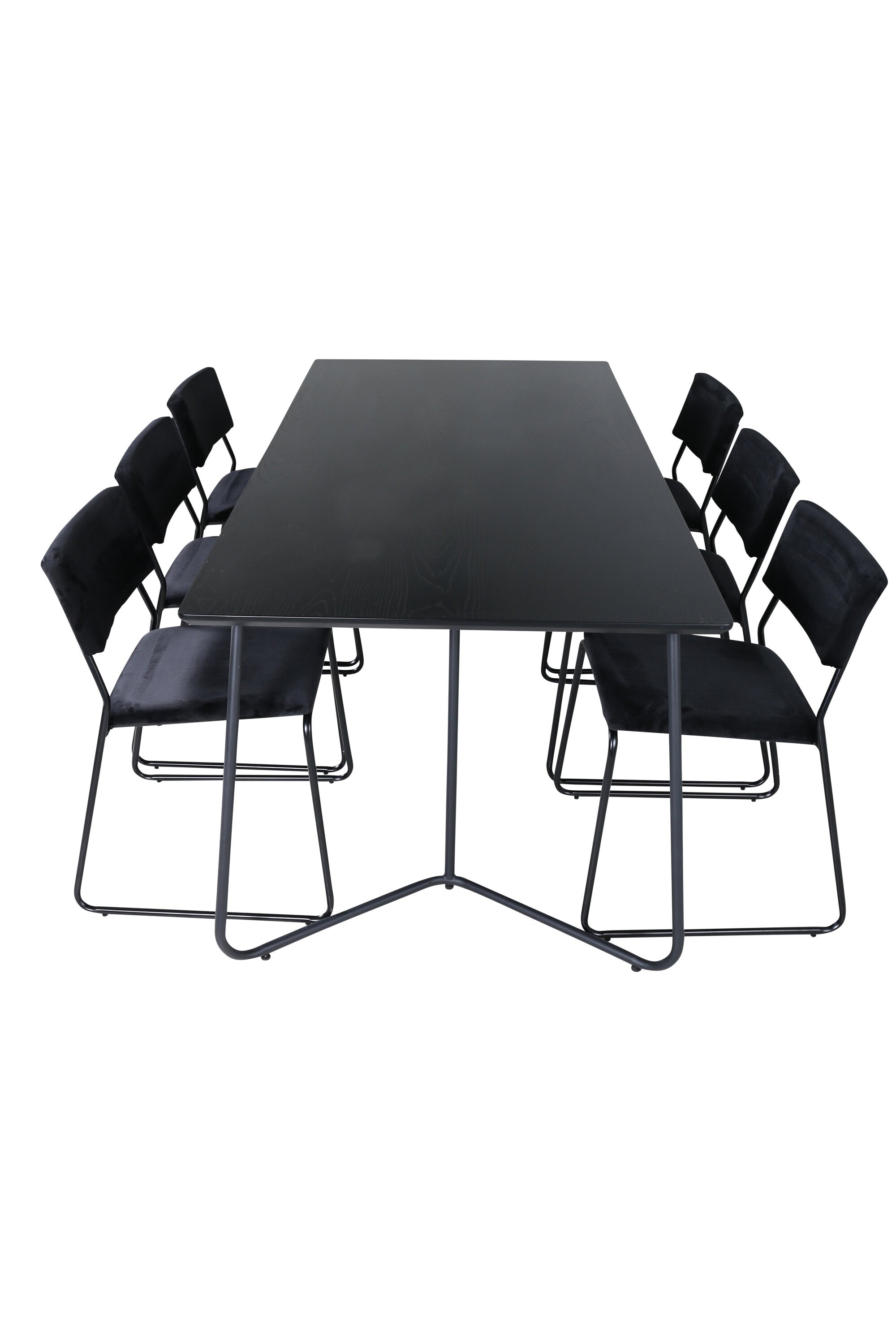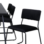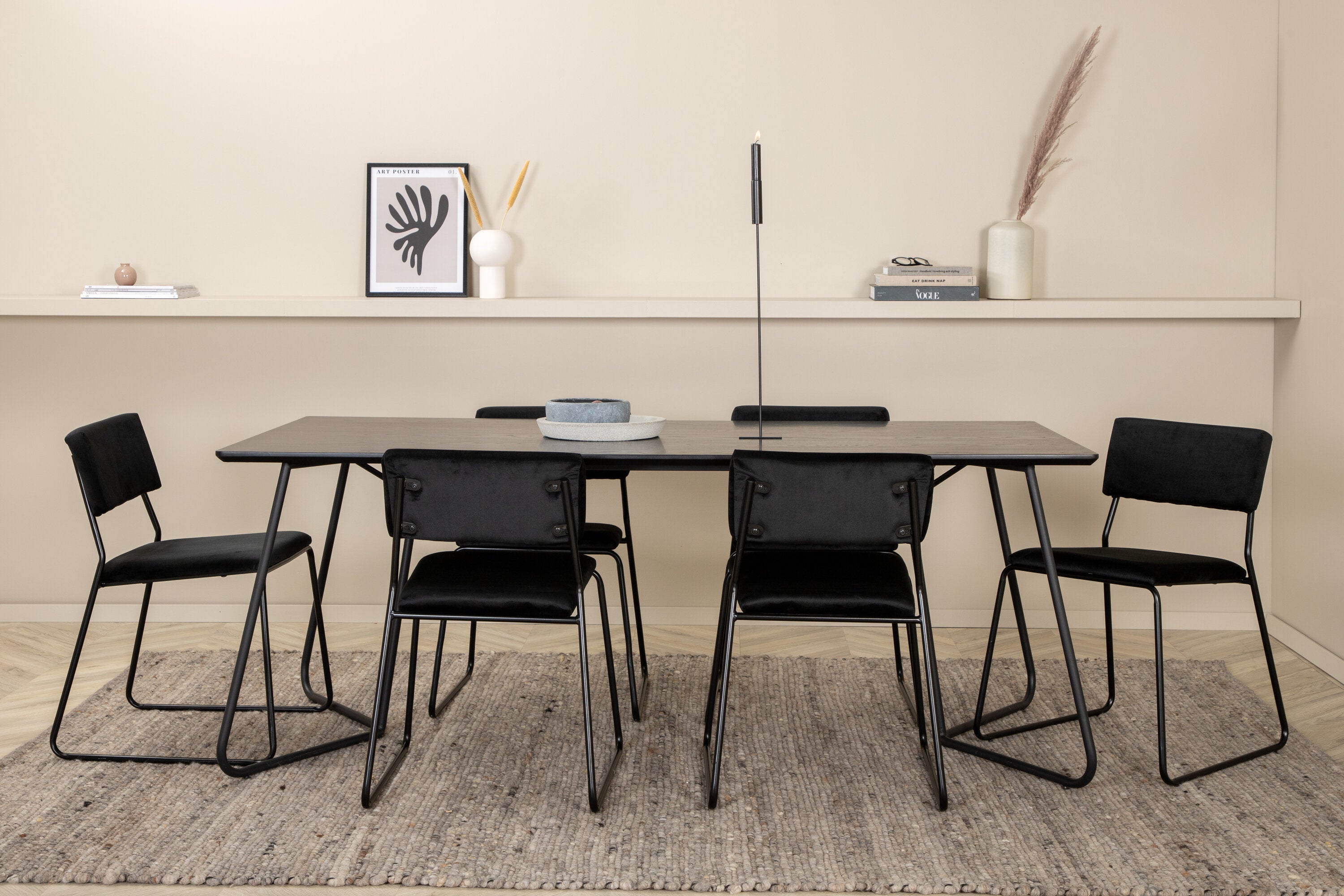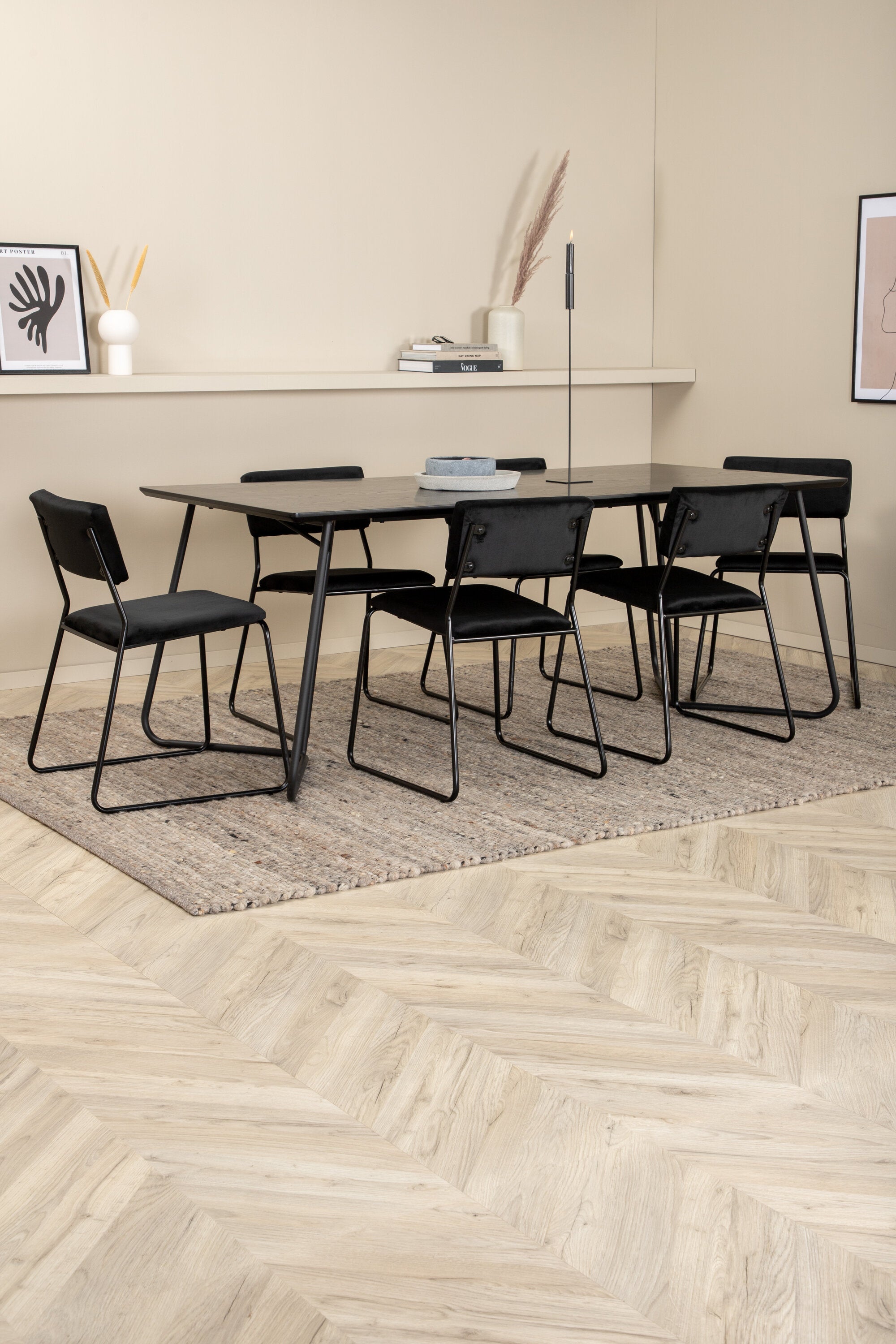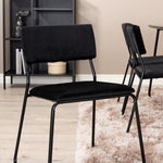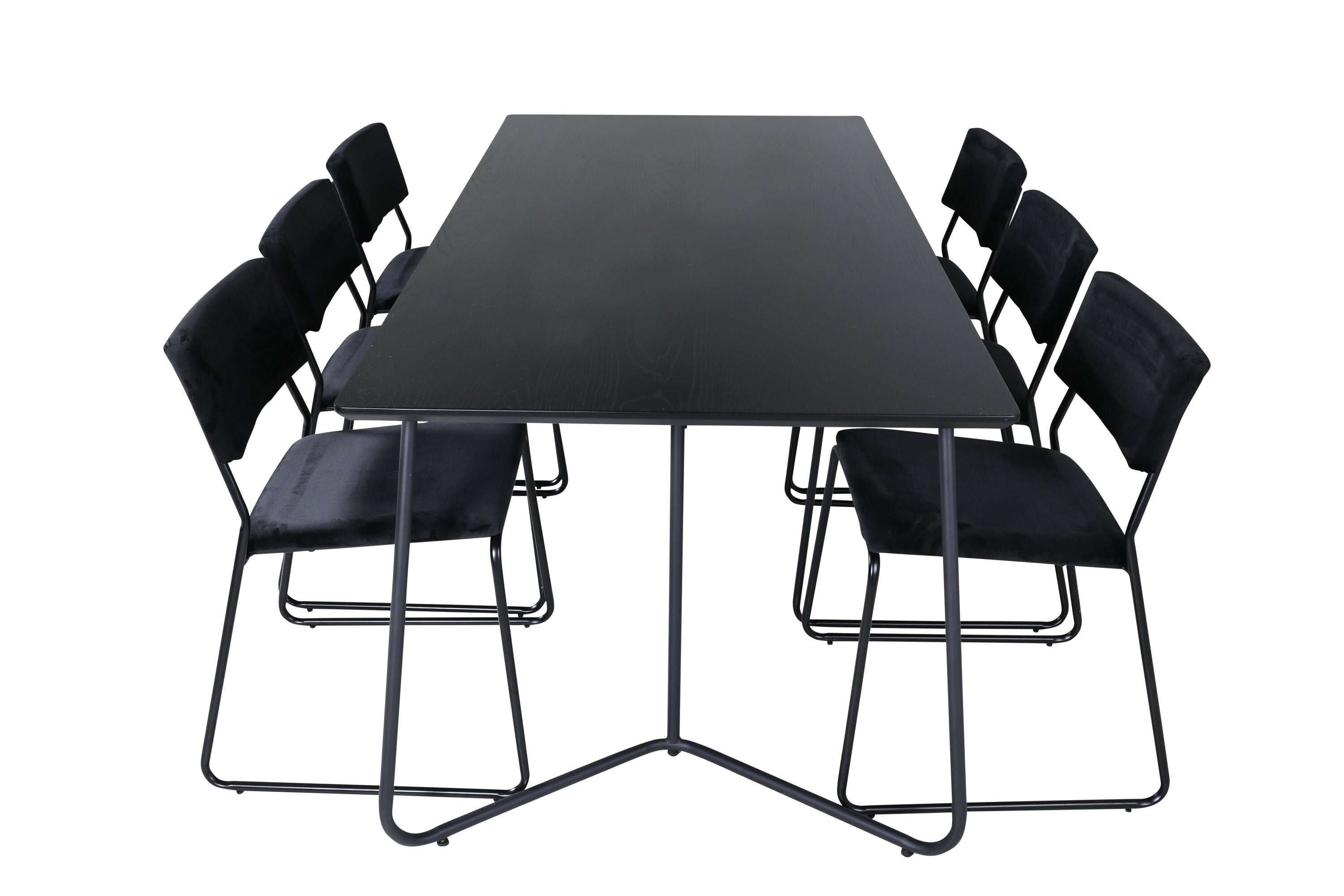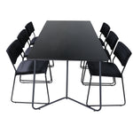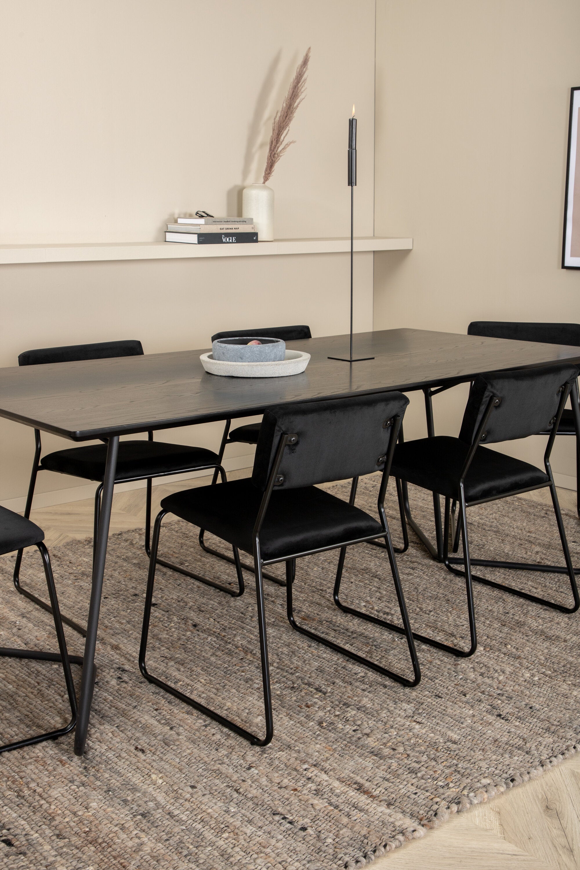 Příjemný, stylový a nadčasový - jídelní stůl Petra působí u vás doma módním dojmem! Design je dobře promyšlený se skandinávskými tvary, které dodávají stylový pocit, úzkými, mírně rozšířenými nohami ze železa a stolní deskou z černé MDF s dýhou. Rozměry stolu: Délka: 190 cm, Šířka: 90 cm, Výška: 75 cm. Sladěno se 6 jídelními židlemi Kenth v černé barvě s železnými nohami židlí a sedáky z měkké sametové látky. Rozměry židle: Výška: 76 cm, výška sedáku: 48,5 cm, šířka: 40 cm, hloubka: 52 cm. Nechte zdobit srdce domova touto poutavou skupinou jídel!