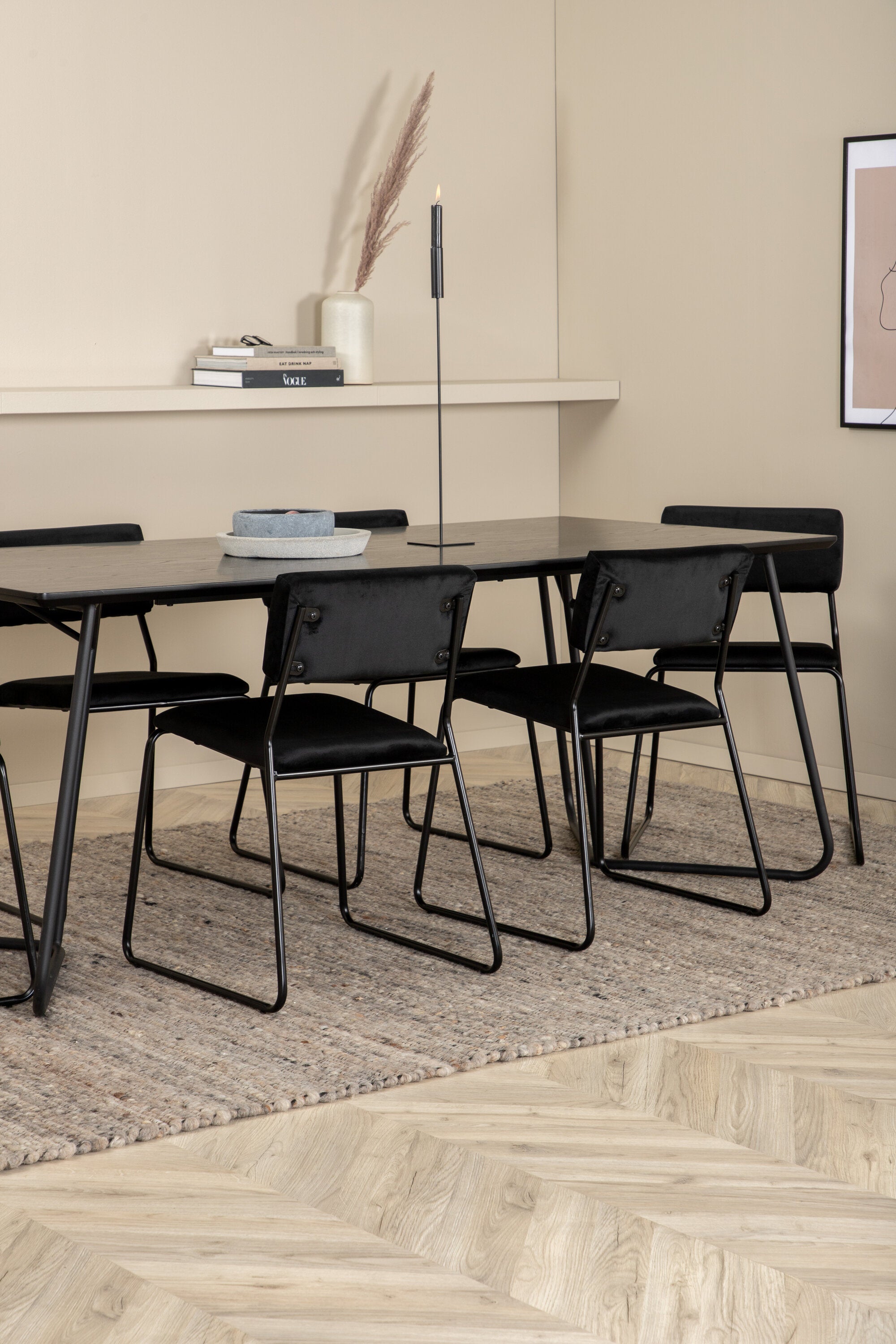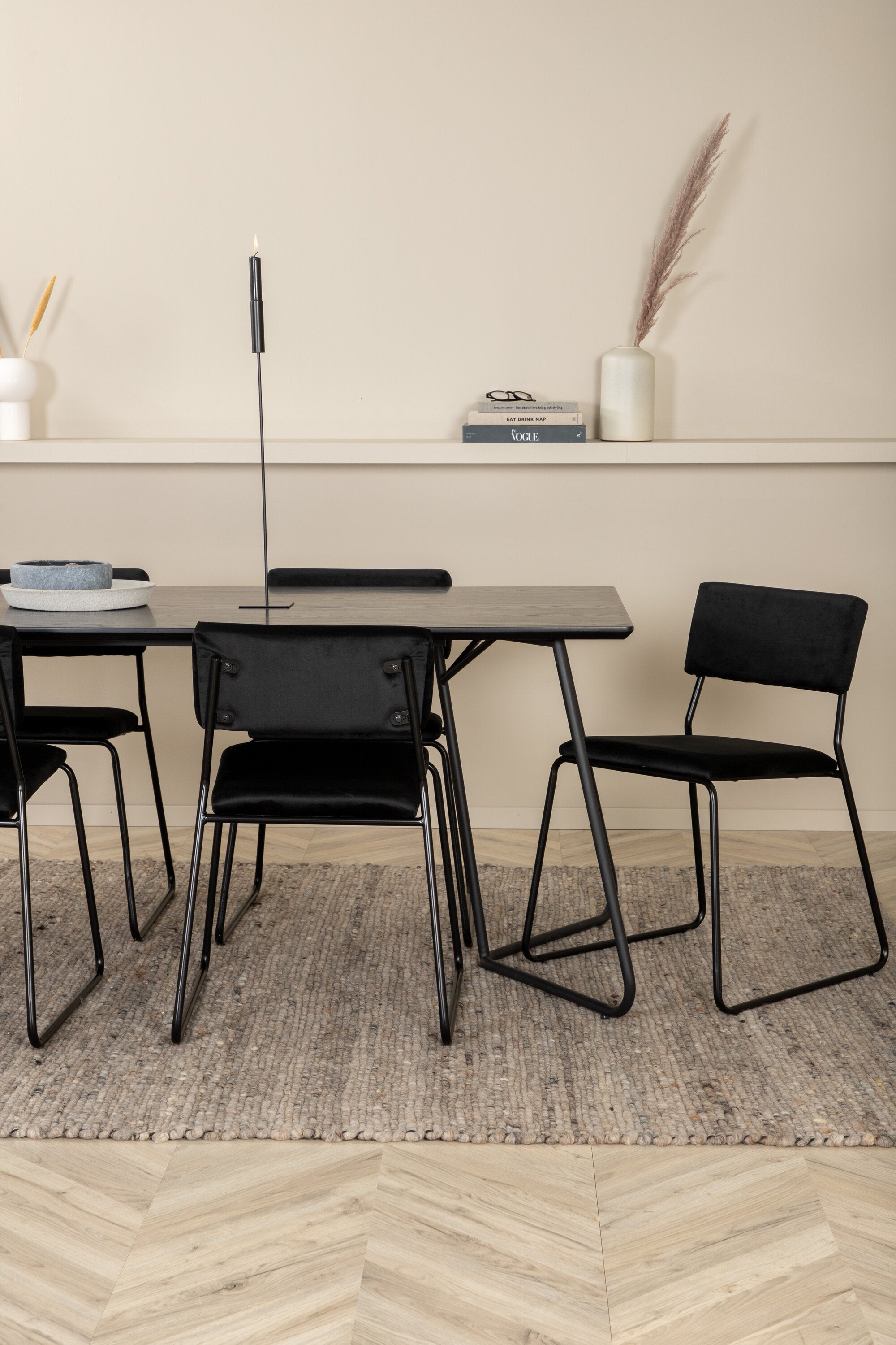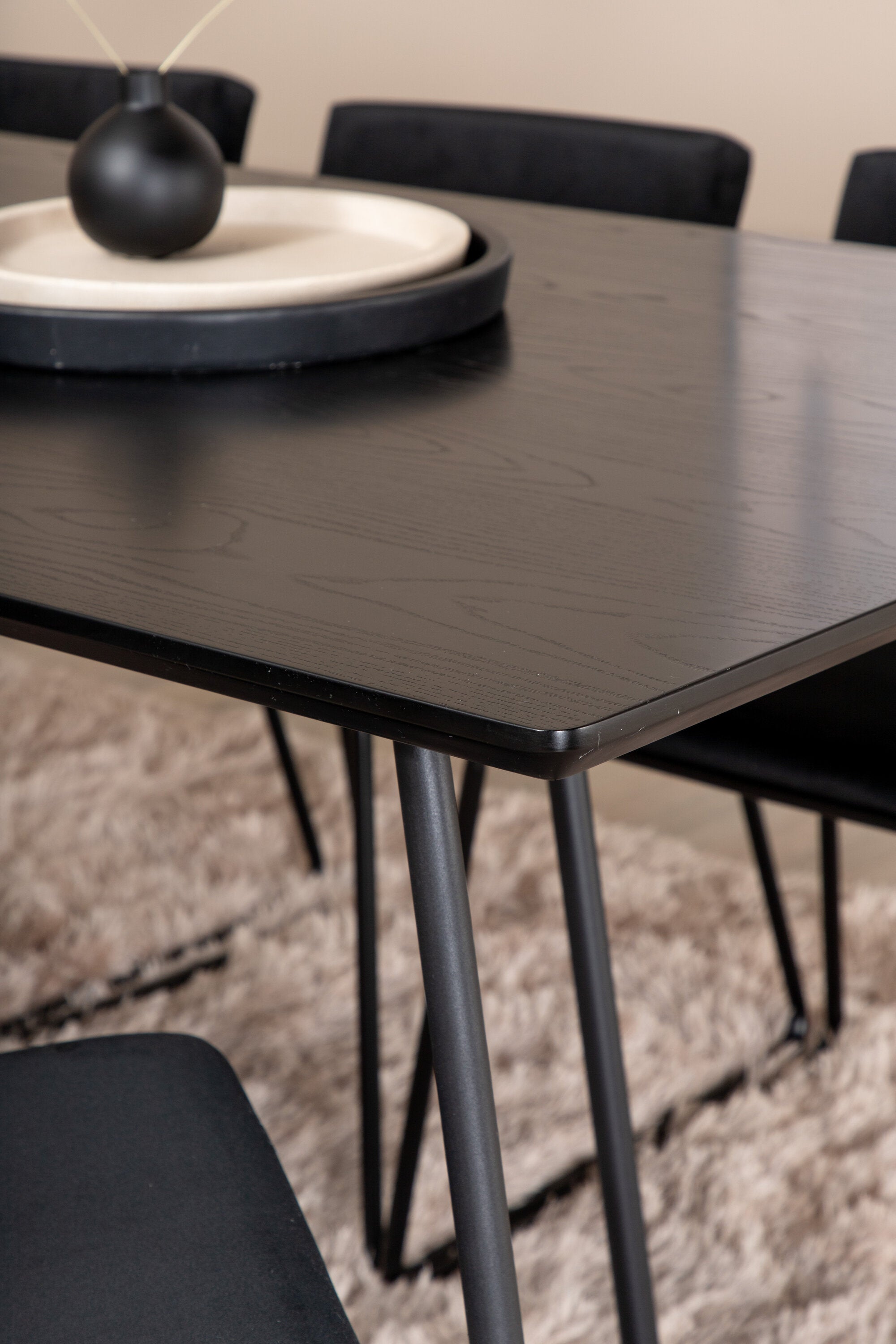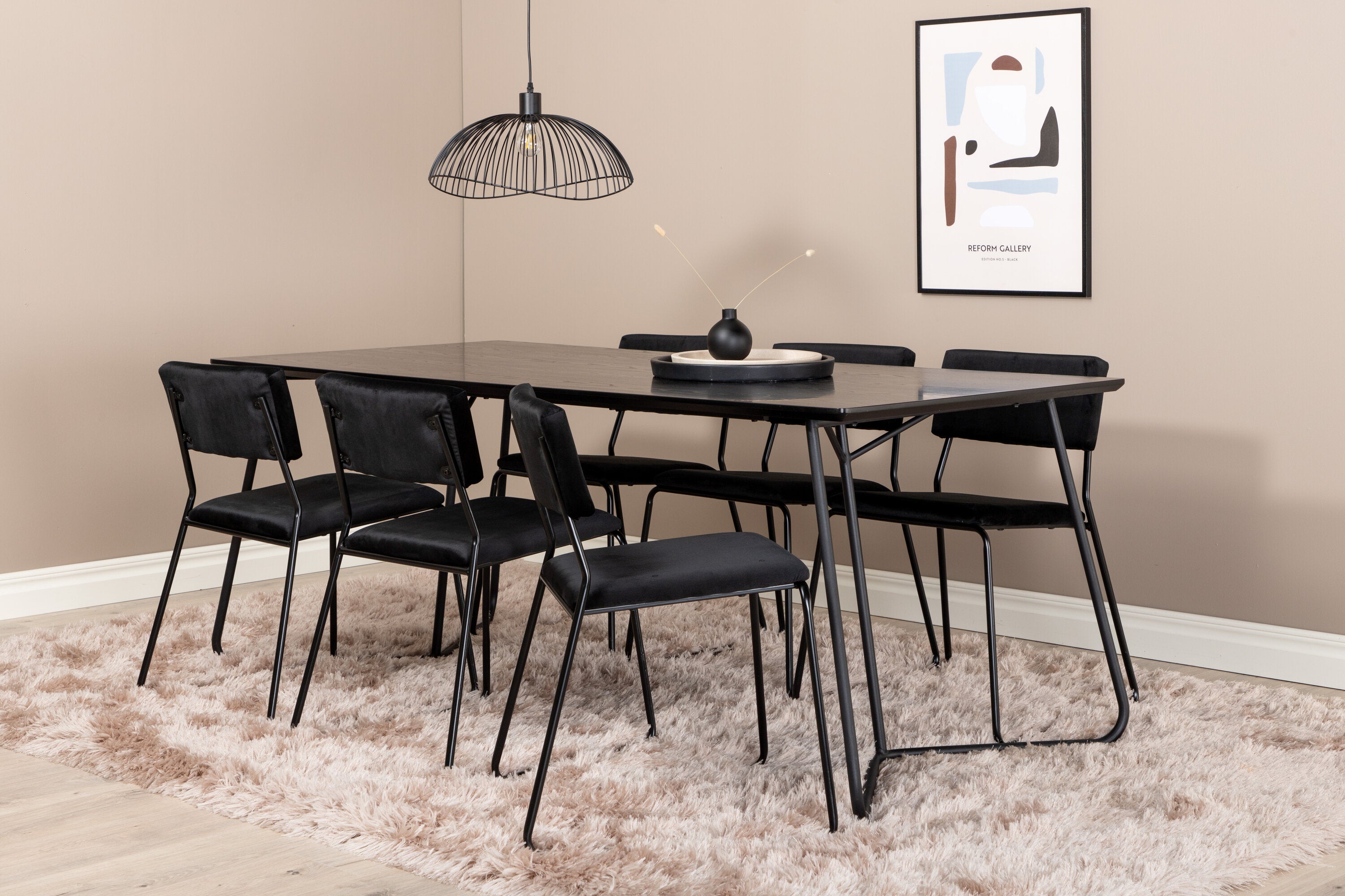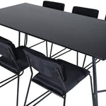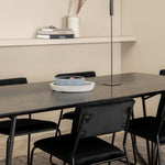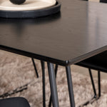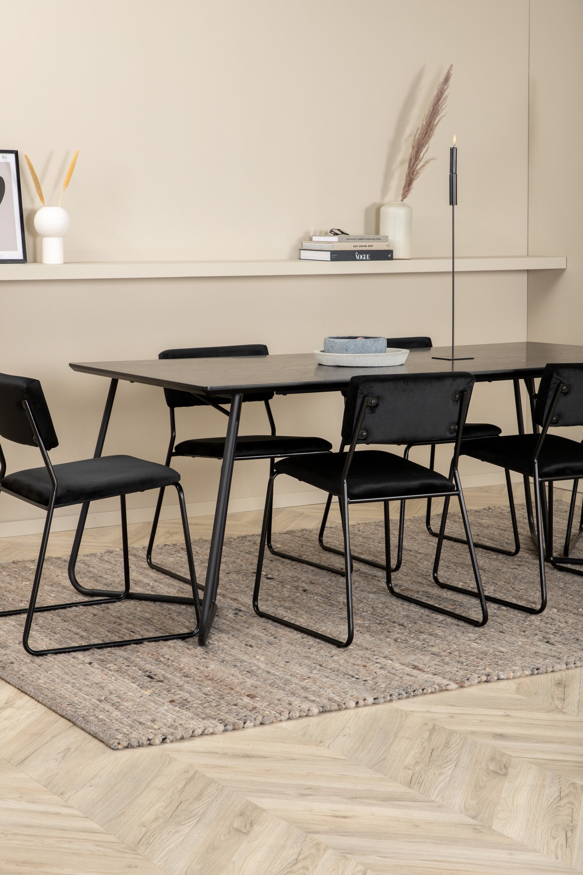 Příjemný, stylový a nadčasový - jídelní stůl Petra působí u vás doma módním dojmem! Design je dobře promyšlený se skandinávskými tvary, které dodávají stylový pocit, úzkými, mírně rozšířenými nohami ze železa a stolní deskou z černé MDF s dýhou. Rozměry stolu: Délka: 190 cm, Šířka: 90 cm, Výška: 75 cm. Sladěno se 6 jídelními židlemi Kenth v černé barvě s železnými nohami židlí a sedáky z měkké sametové látky. Rozměry židle: Výška: 76 cm, výška sedáku: 48,5 cm, šířka: 40 cm, hloubka: 52 cm. Nechte zdobit srdce domova touto poutavou skupinou jídel!