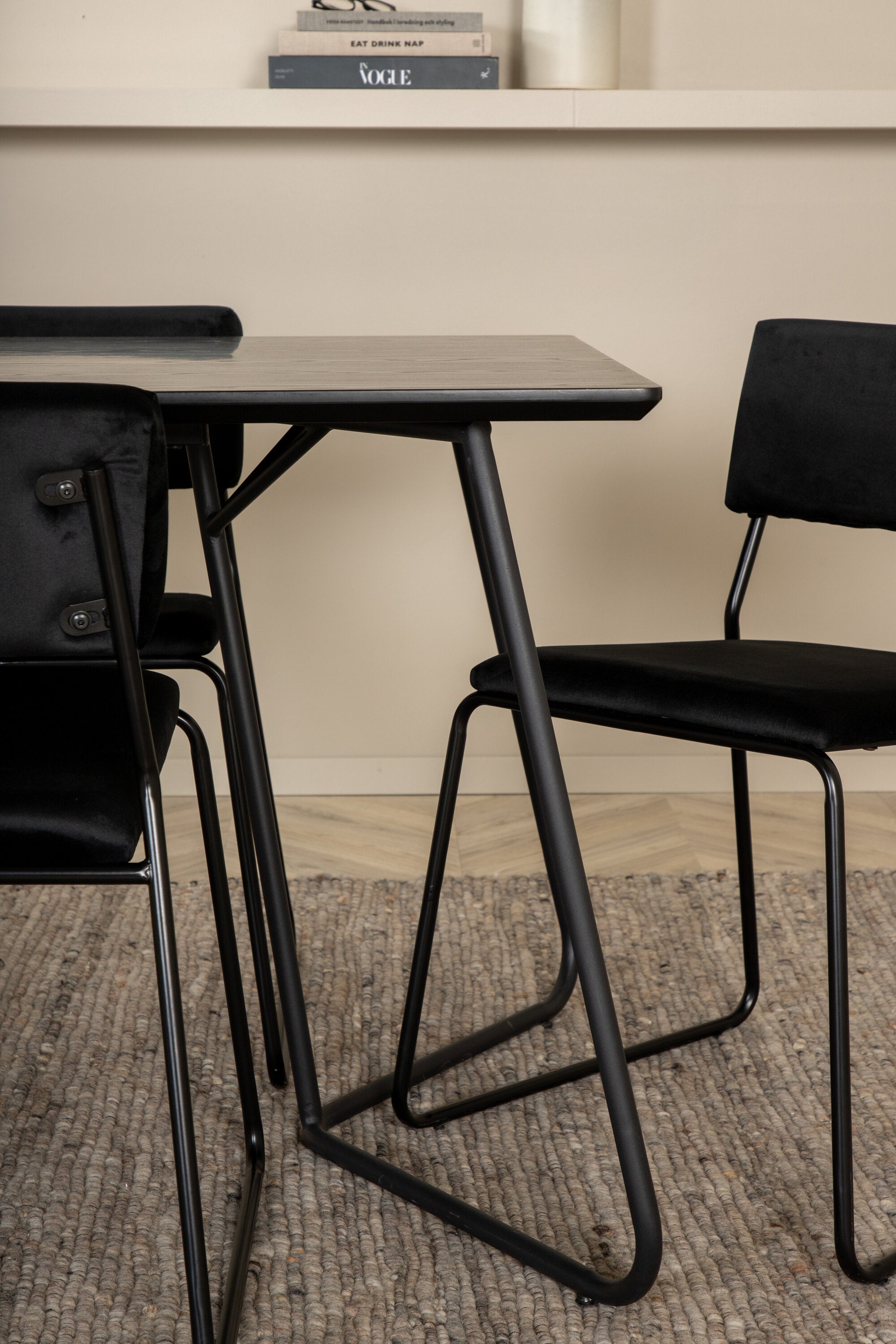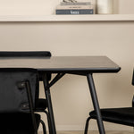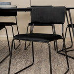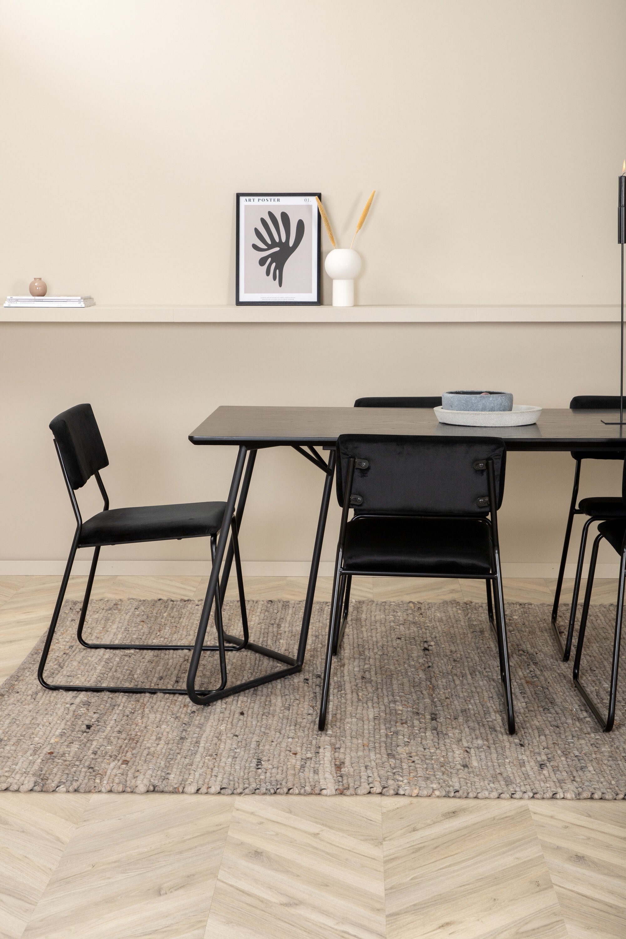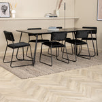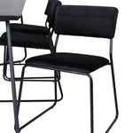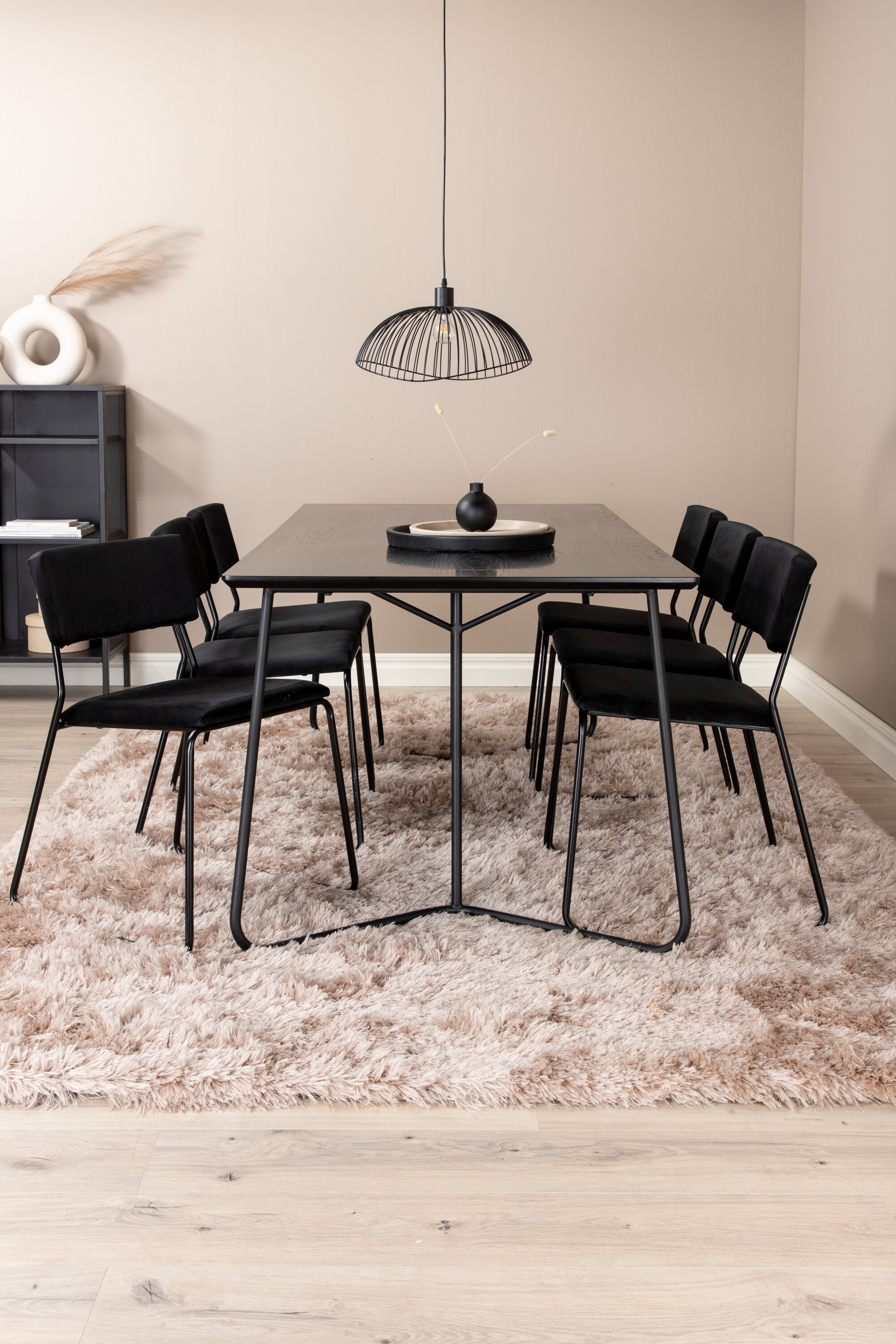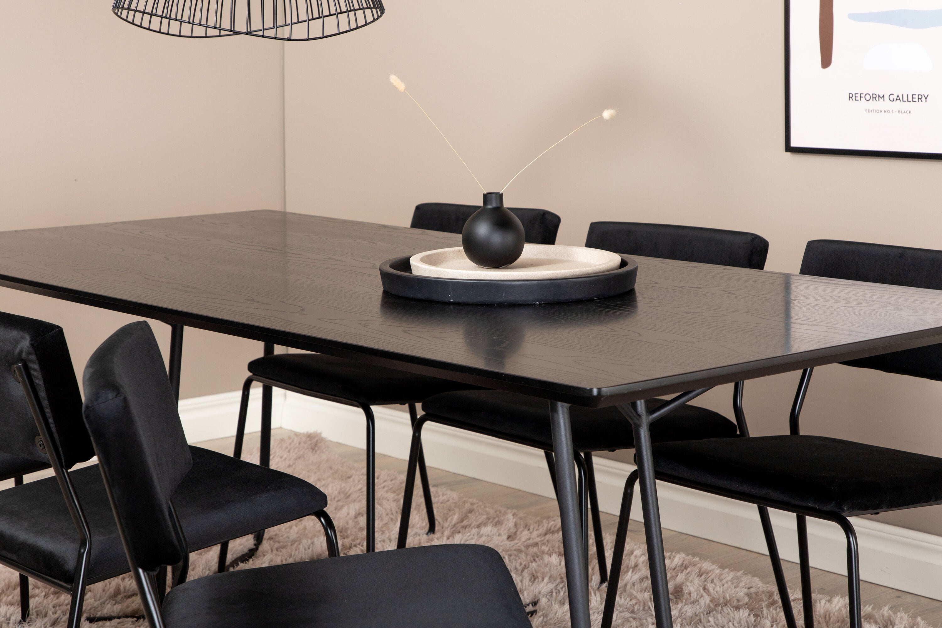 Příjemný, stylový a nadčasový - jídelní stůl Petra působí u vás doma módním dojmem! Design je dobře promyšlený se skandinávskými tvary, které dodávají stylový pocit, úzkými, mírně rozšířenými nohami ze železa a stolní deskou z černé MDF s dýhou. Rozměry stolu: Délka: 190 cm, Šířka: 90 cm, Výška: 75 cm. Sladěno se 6 jídelními židlemi Kenth v černé barvě s železnými nohami židlí a sedáky z měkké sametové látky. Rozměry židle: Výška: 76 cm, výška sedáku: 48,5 cm, šířka: 40 cm, hloubka: 52 cm. Nechte zdobit srdce domova touto poutavou skupinou jídel!