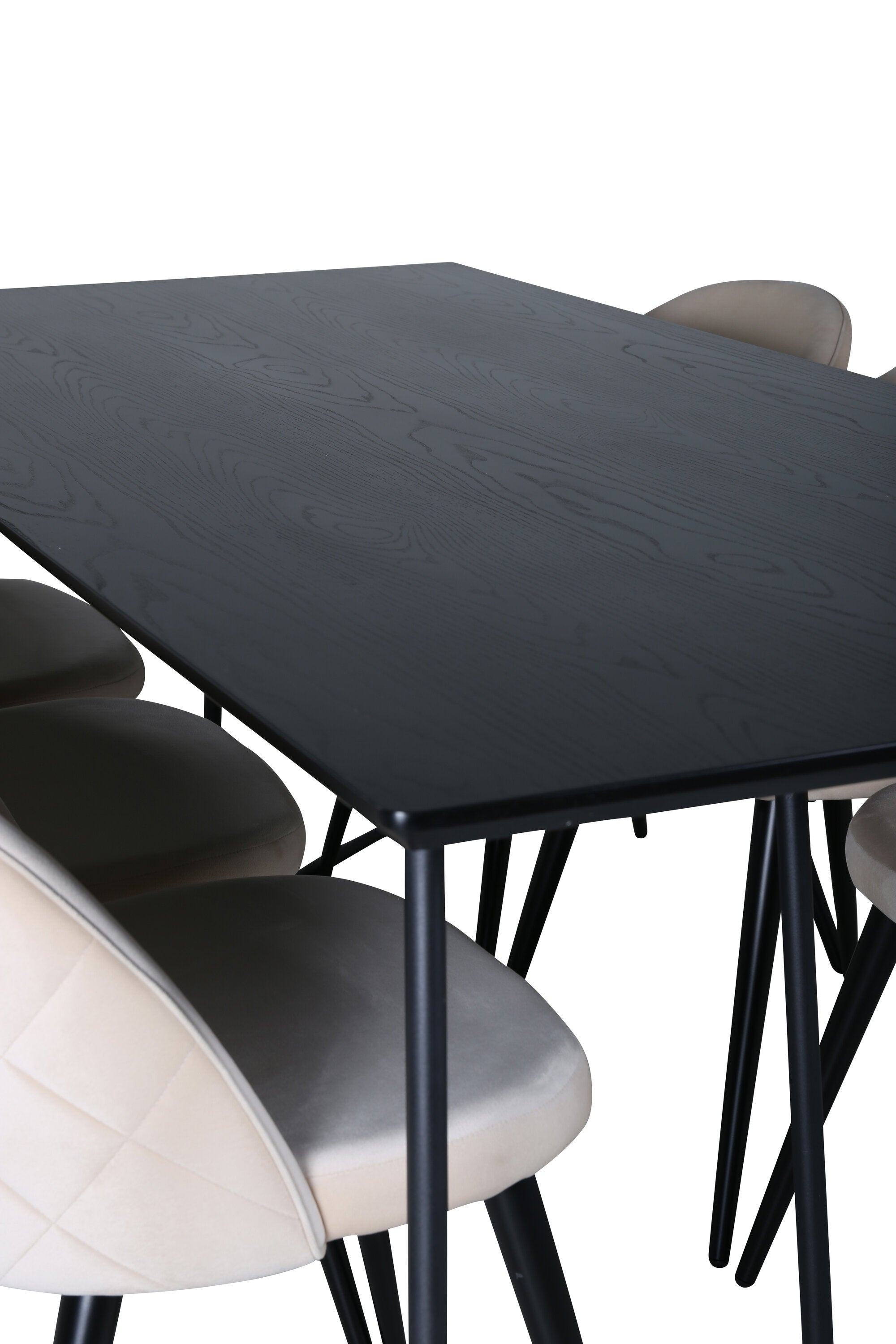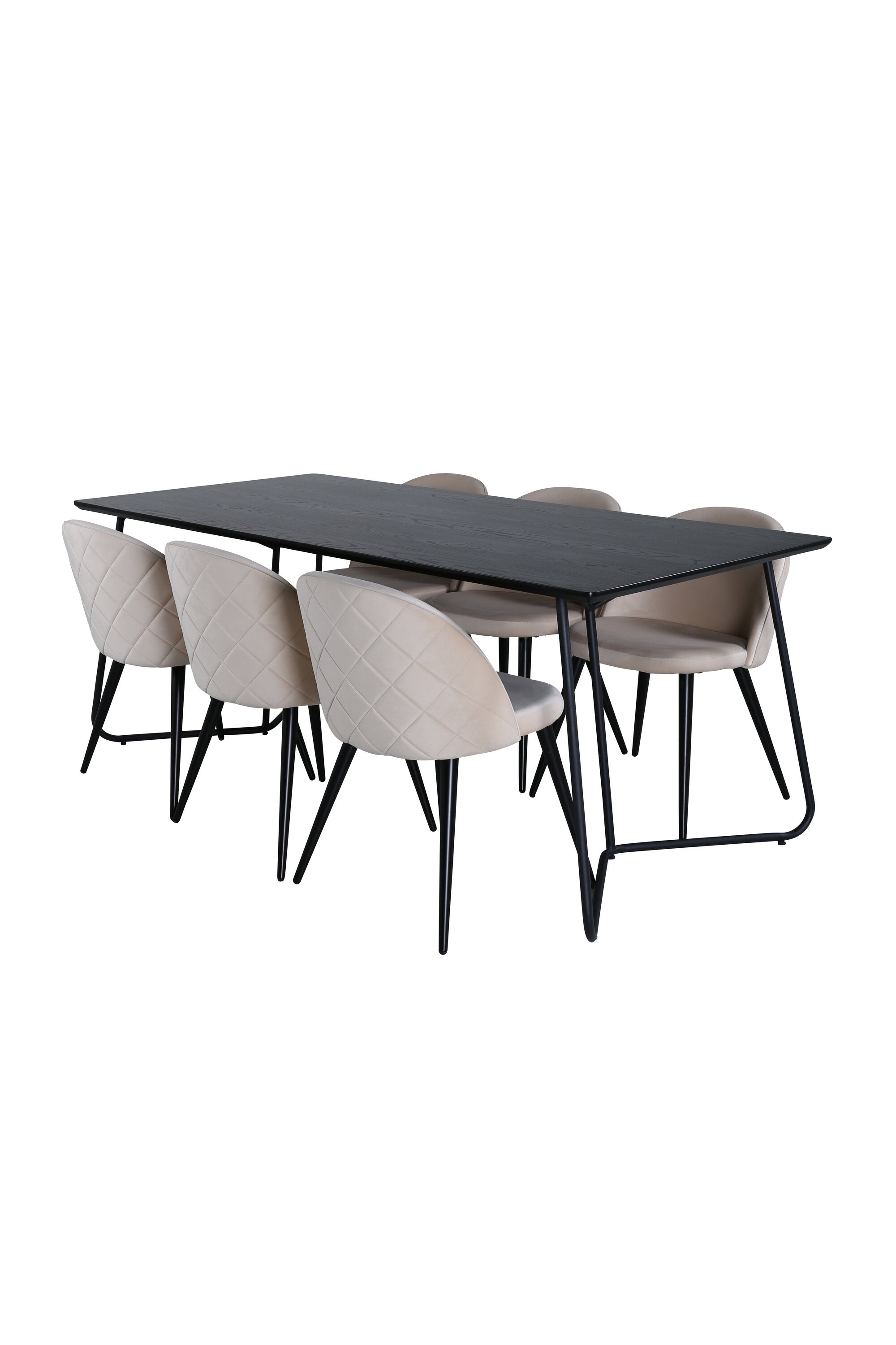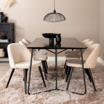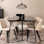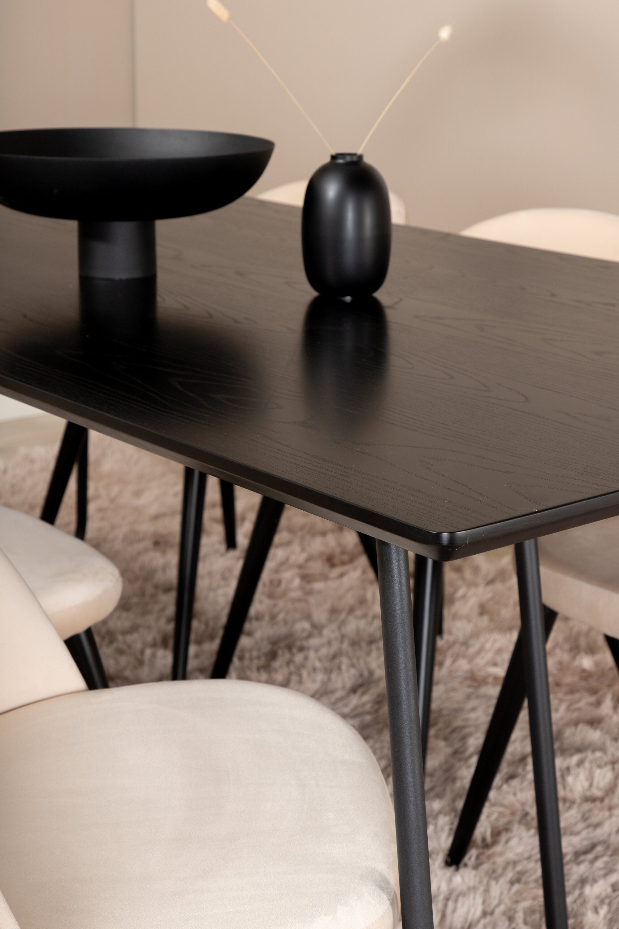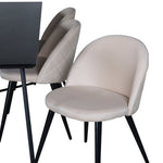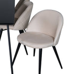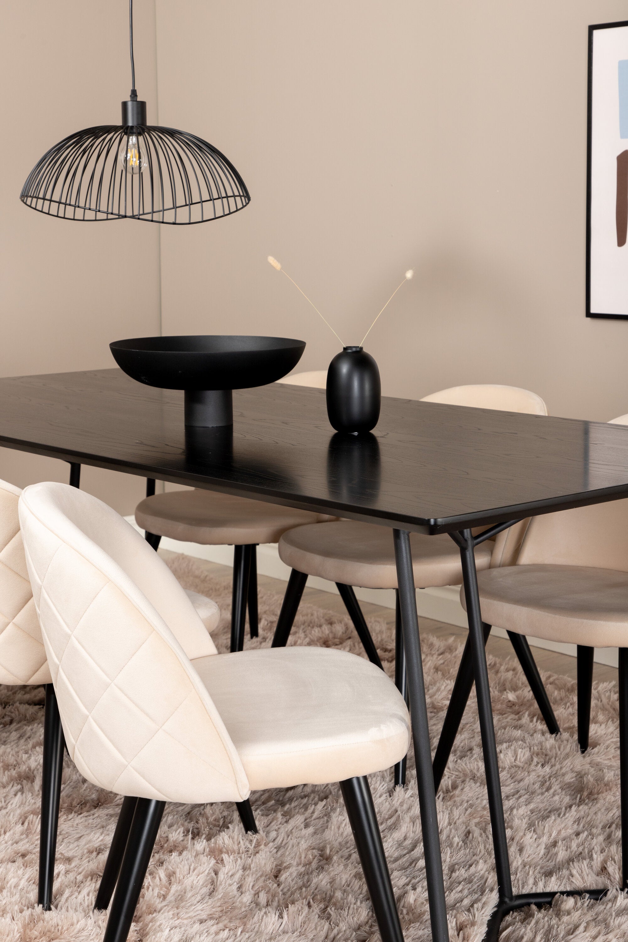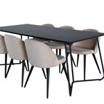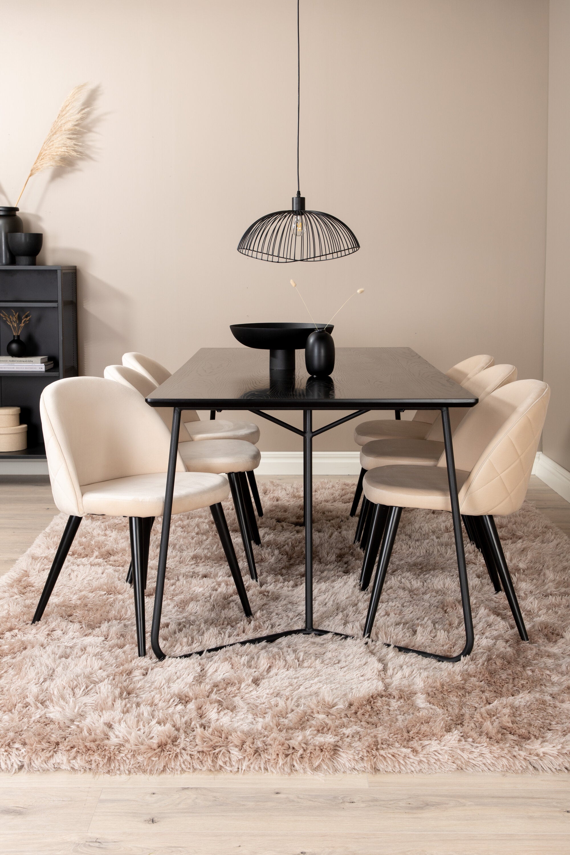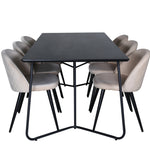 Co víc si přát než skupinu jídel, která je pohodlná, stylová a zároveň dodává místnosti luxusní pocit? Přesně to nabízí tato moderní kombinace! Jídelní stůl Petra má promyšlený design se skandinávskými tvary, který působí stylově, úzké, lehce rozšířené nohy ze železa a stolní deska z černé MDF s dýhou. Rozměry stolu: Délka: 190 cm, Šířka: 90 cm, Výška: 75 cm. Zde spolu se 6 sametovými jídelními židlemi v měkkém provedení s černými kovovými nohami židlí a béžovými sedáky z polyesteru. Rozměry židle: Výška: 76,5 cm, výška sedáku: 46,5 cm, šířka: 50 cm, hloubka: 57 cm.