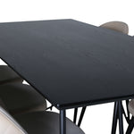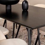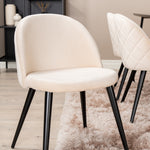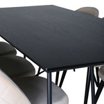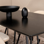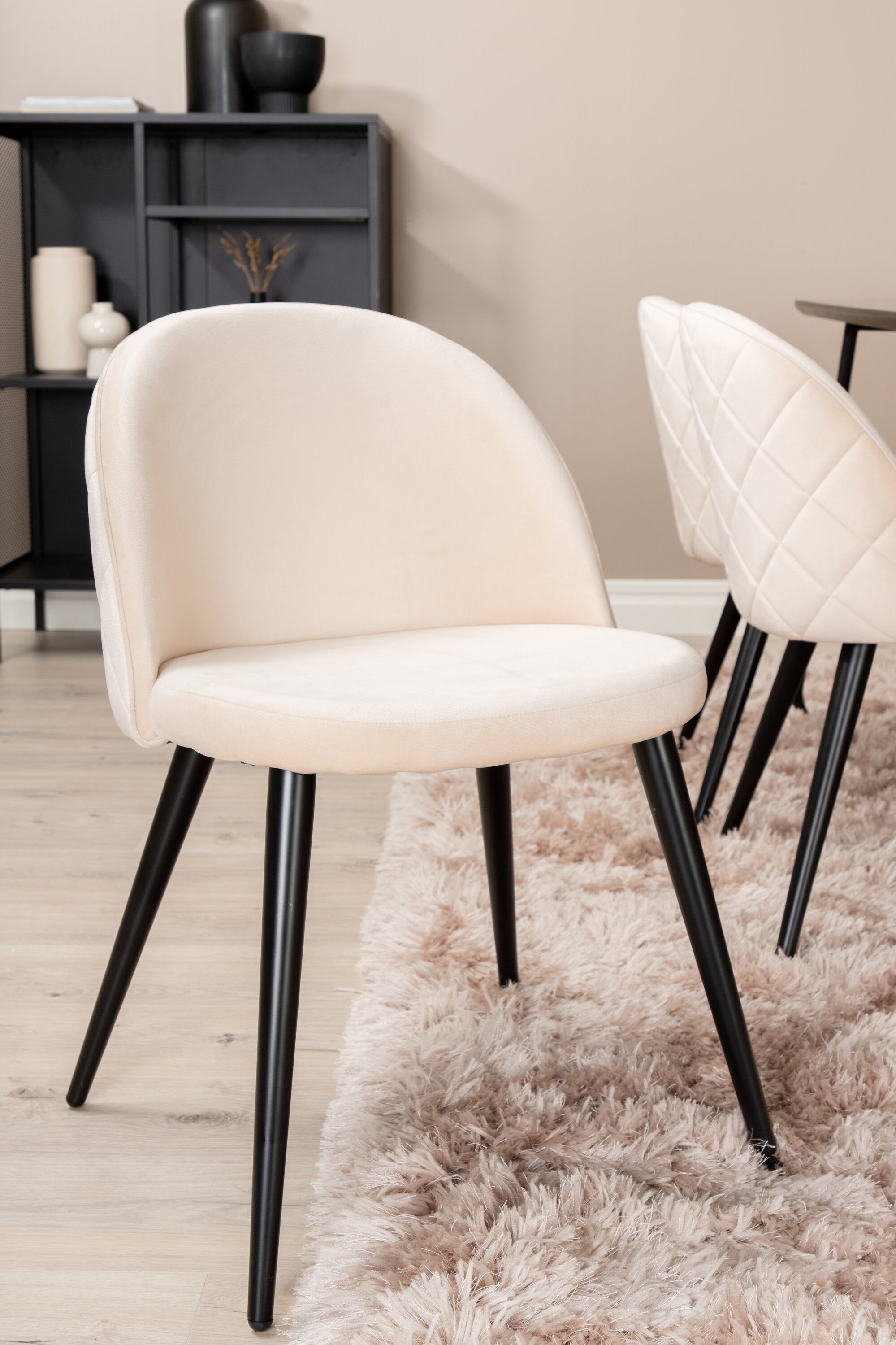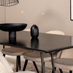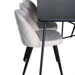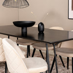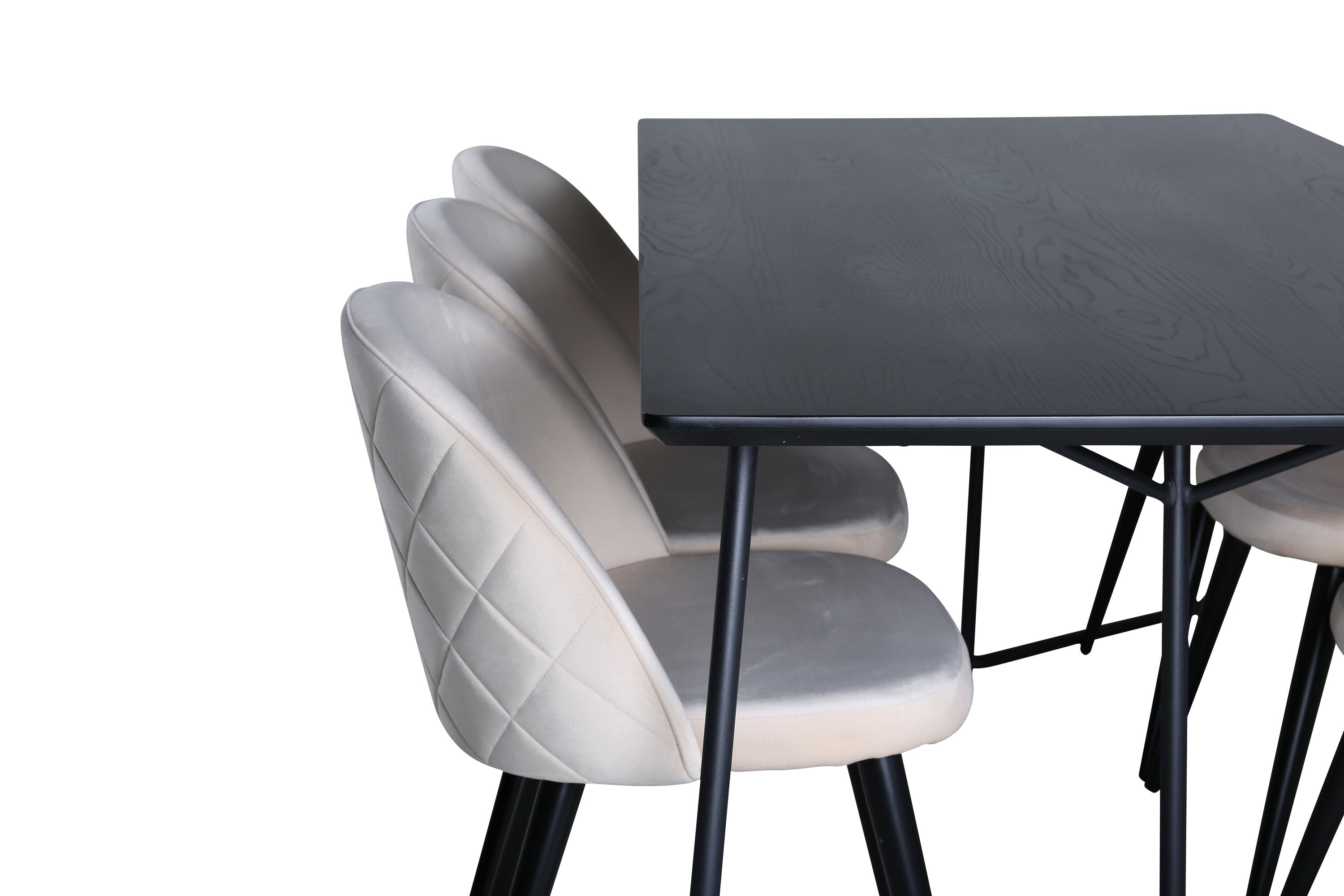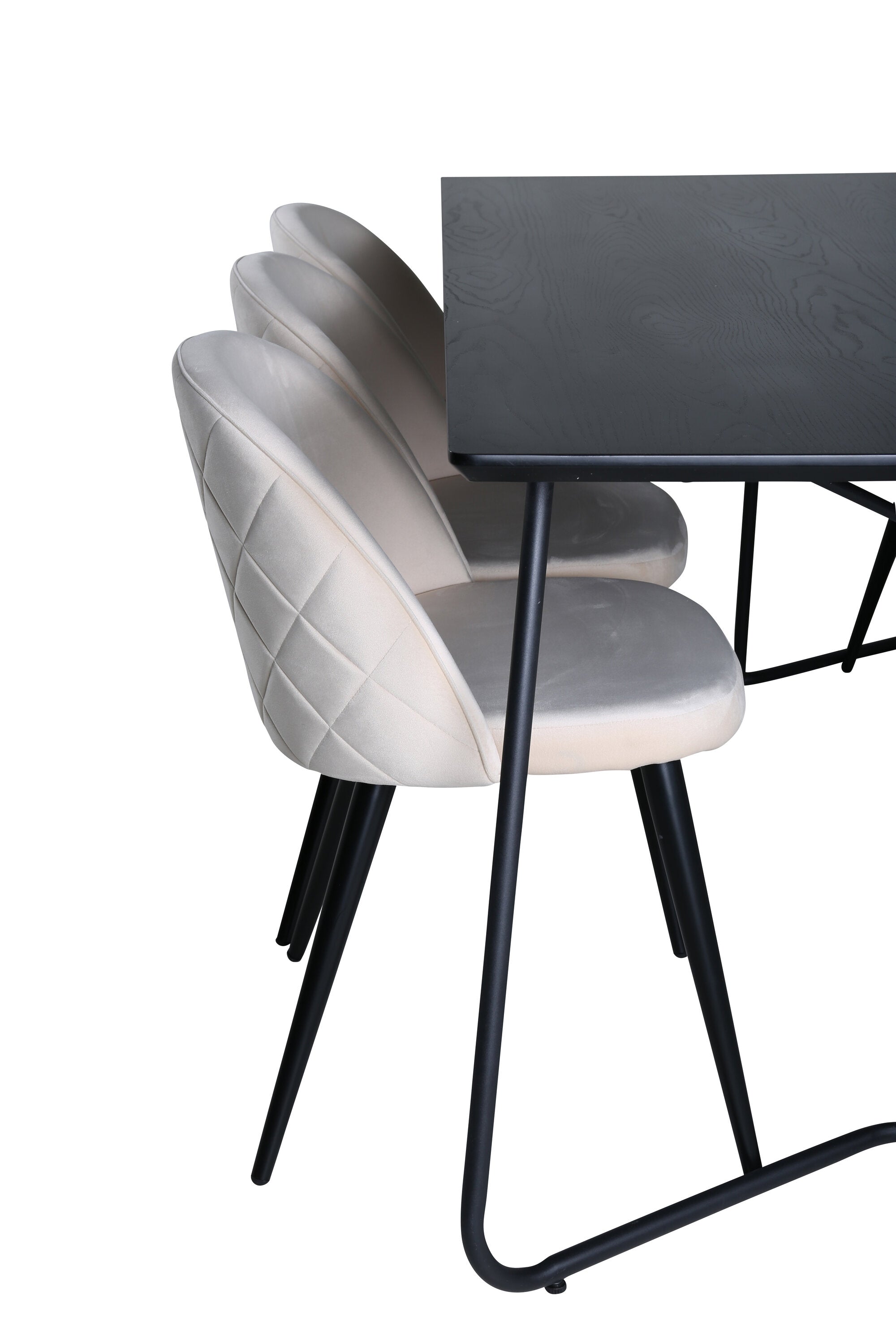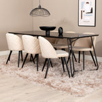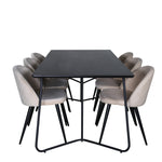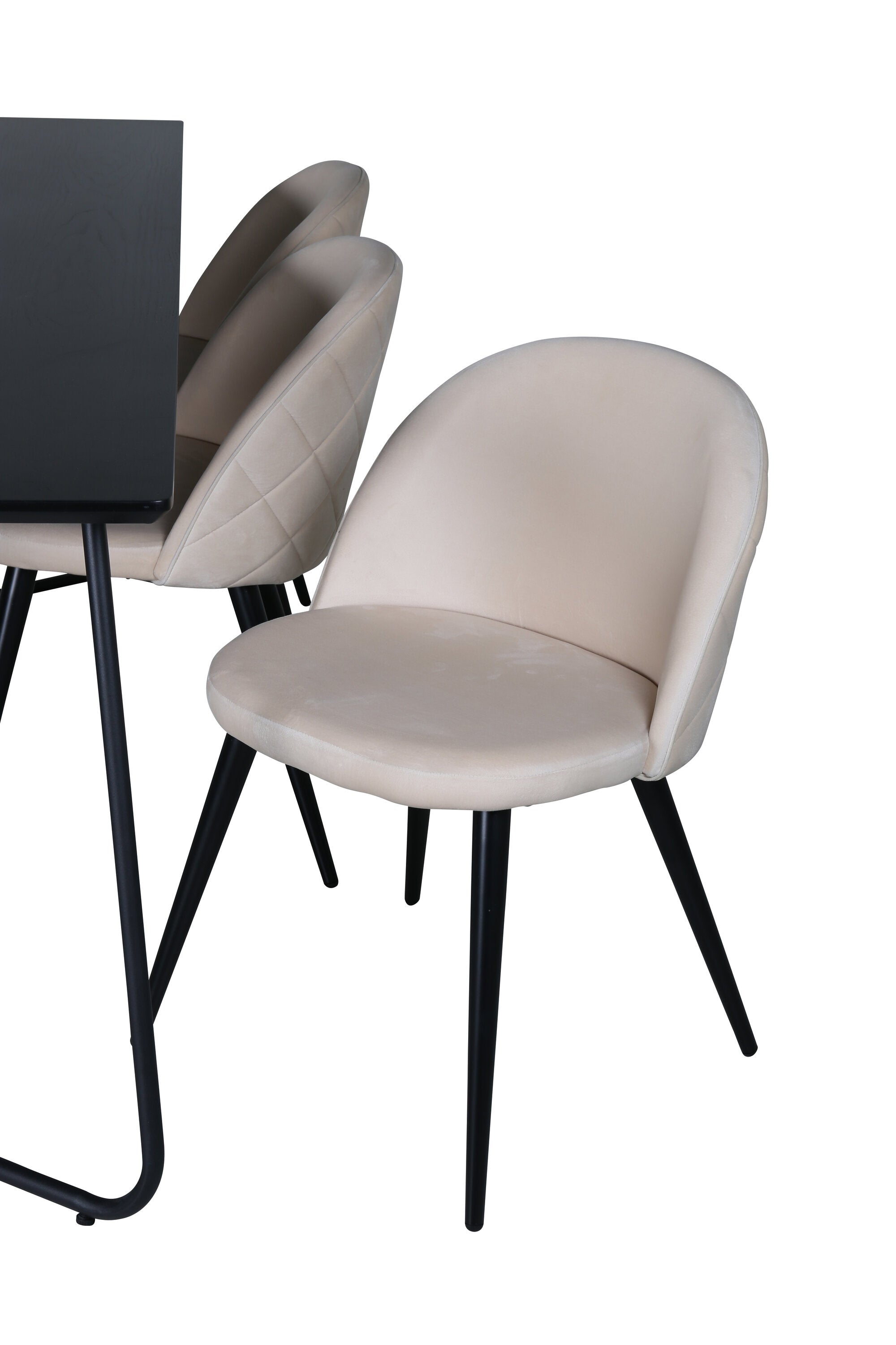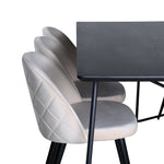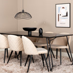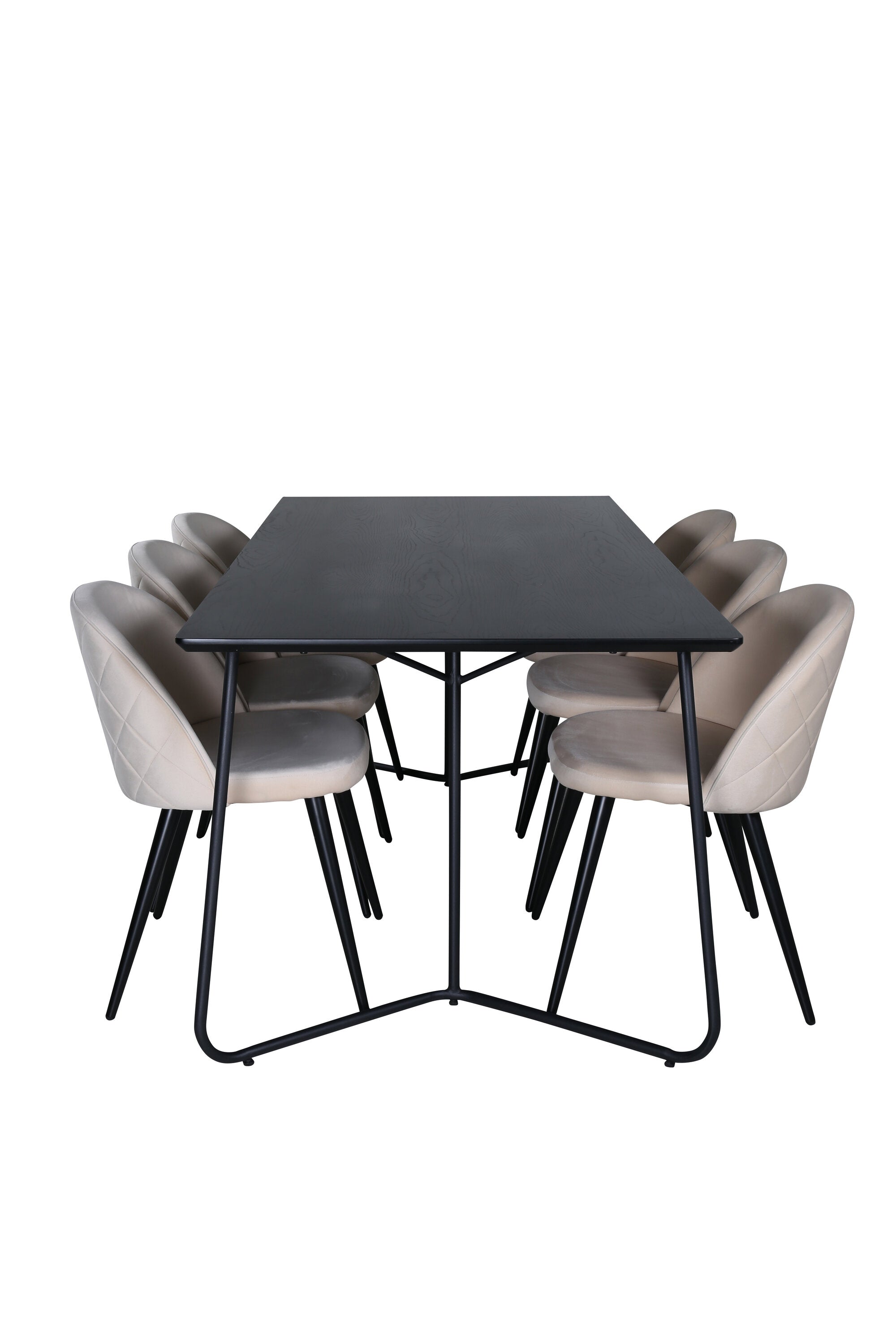 Co víc si přát než skupinu jídel, která je pohodlná, stylová a zároveň dodává místnosti luxusní pocit? Přesně to nabízí tato moderní kombinace! Jídelní stůl Petra má promyšlený design se skandinávskými tvary, který působí stylově, úzké, lehce rozšířené nohy ze železa a stolní deska z černé MDF s dýhou. Rozměry stolu: Délka: 190 cm, Šířka: 90 cm, Výška: 75 cm. Zde spolu se 6 sametovými jídelními židlemi v měkkém provedení s černými kovovými nohami židlí a béžovými sedáky z polyesteru. Rozměry židle: Výška: 76,5 cm, výška sedáku: 46,5 cm, šířka: 50 cm, hloubka: 57 cm.