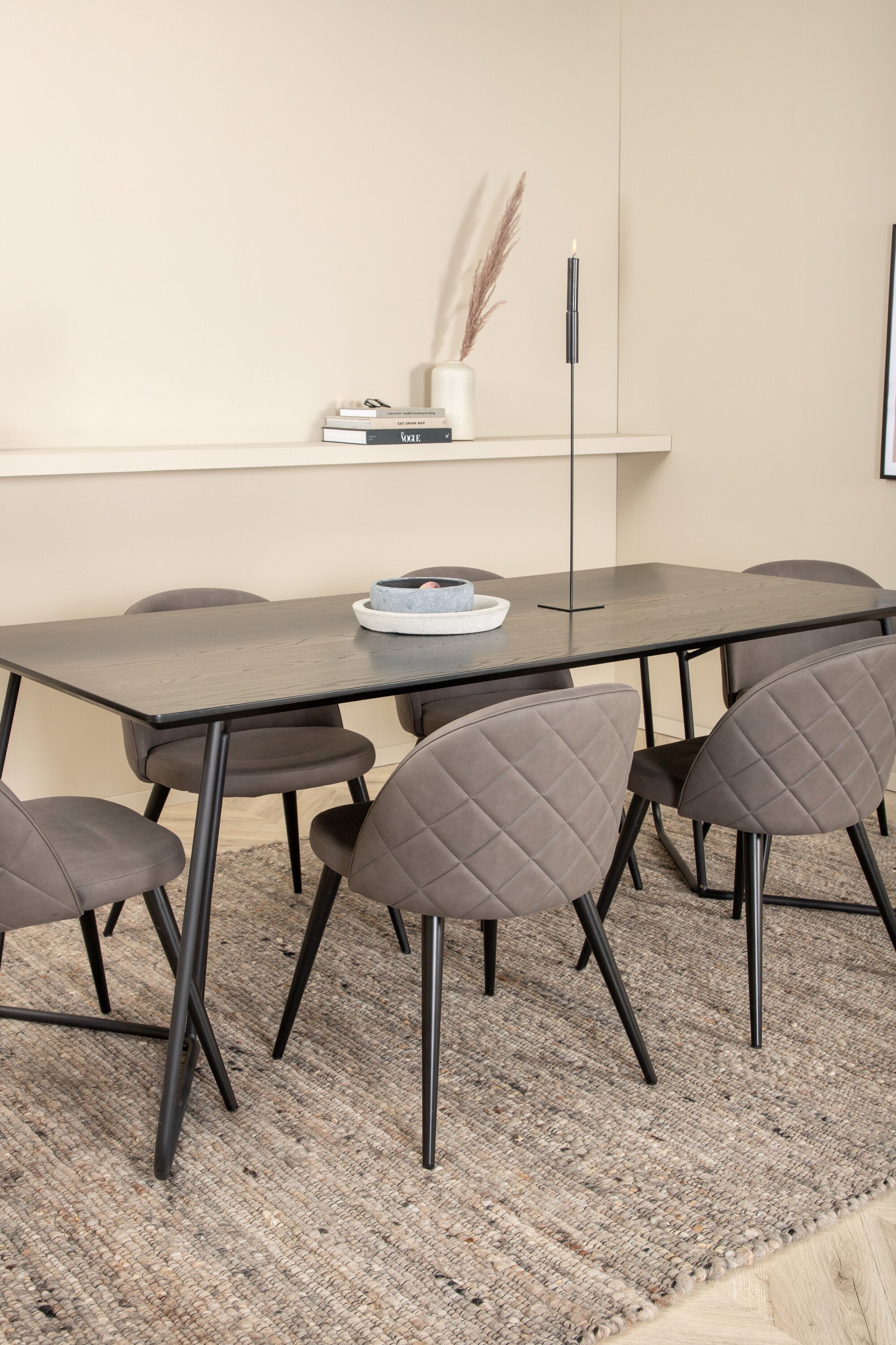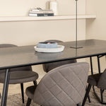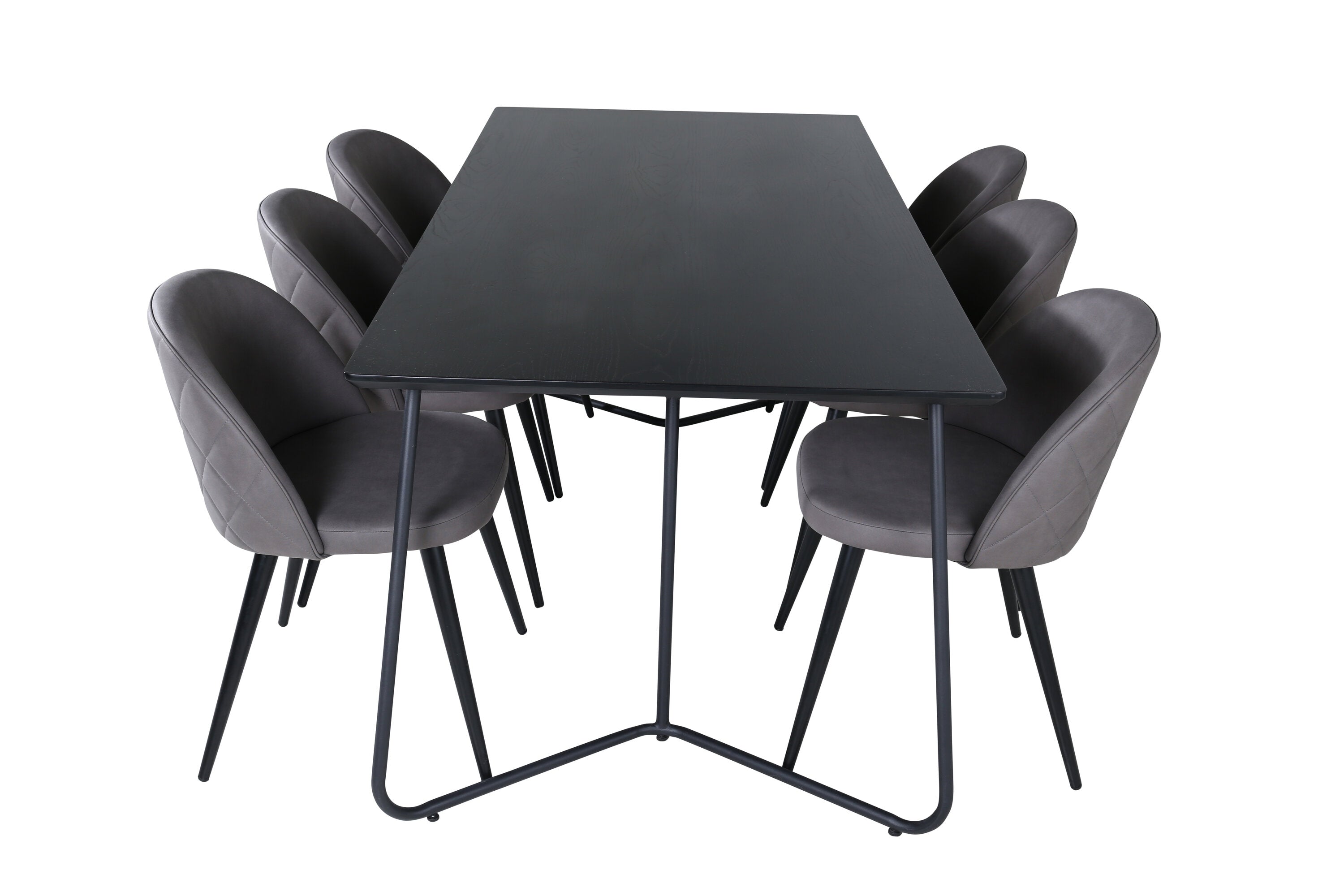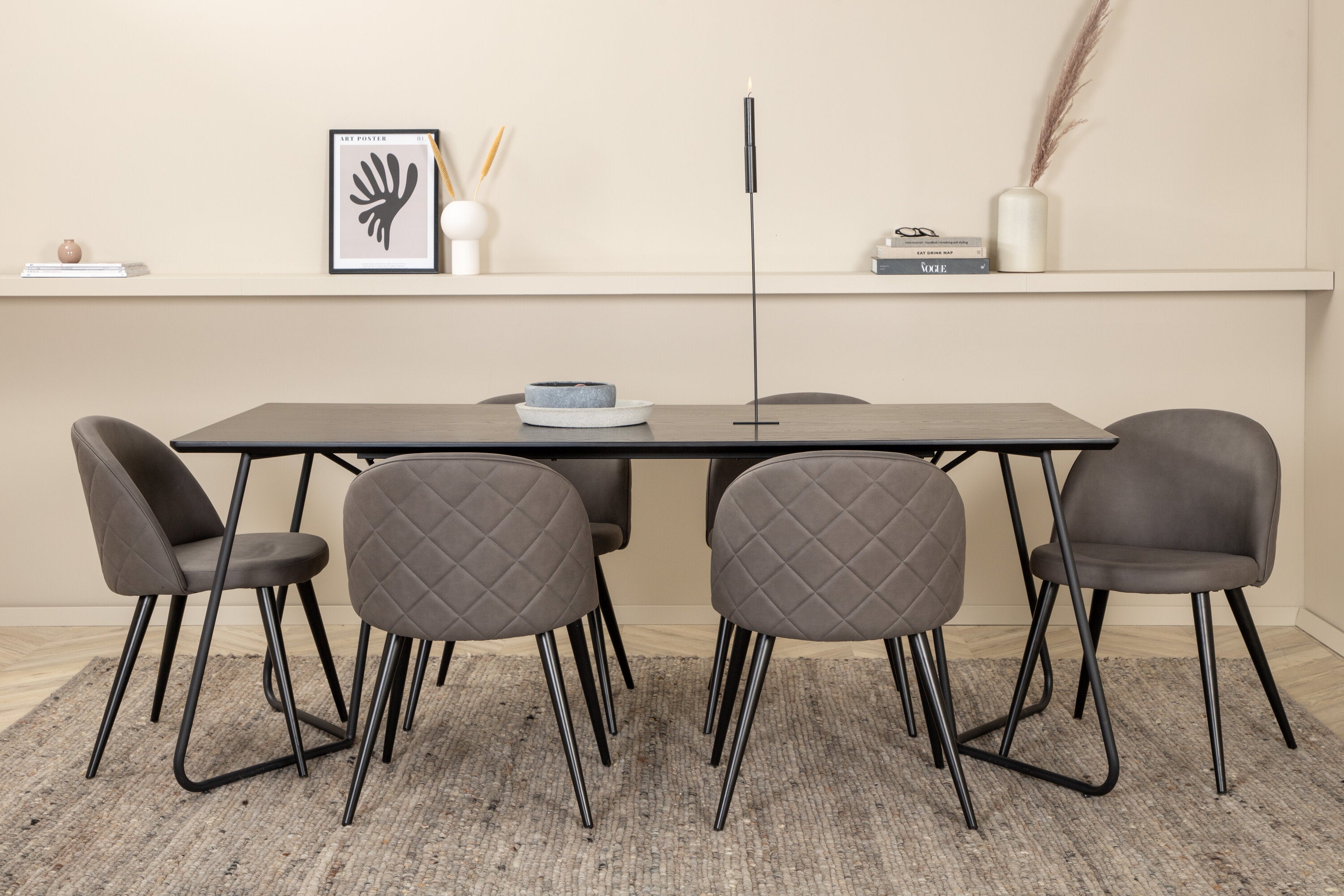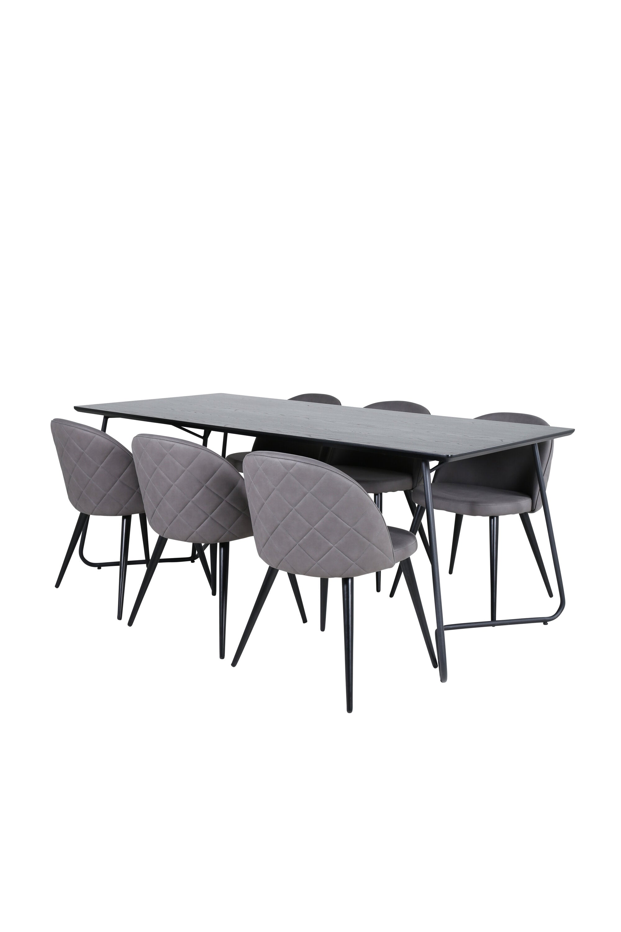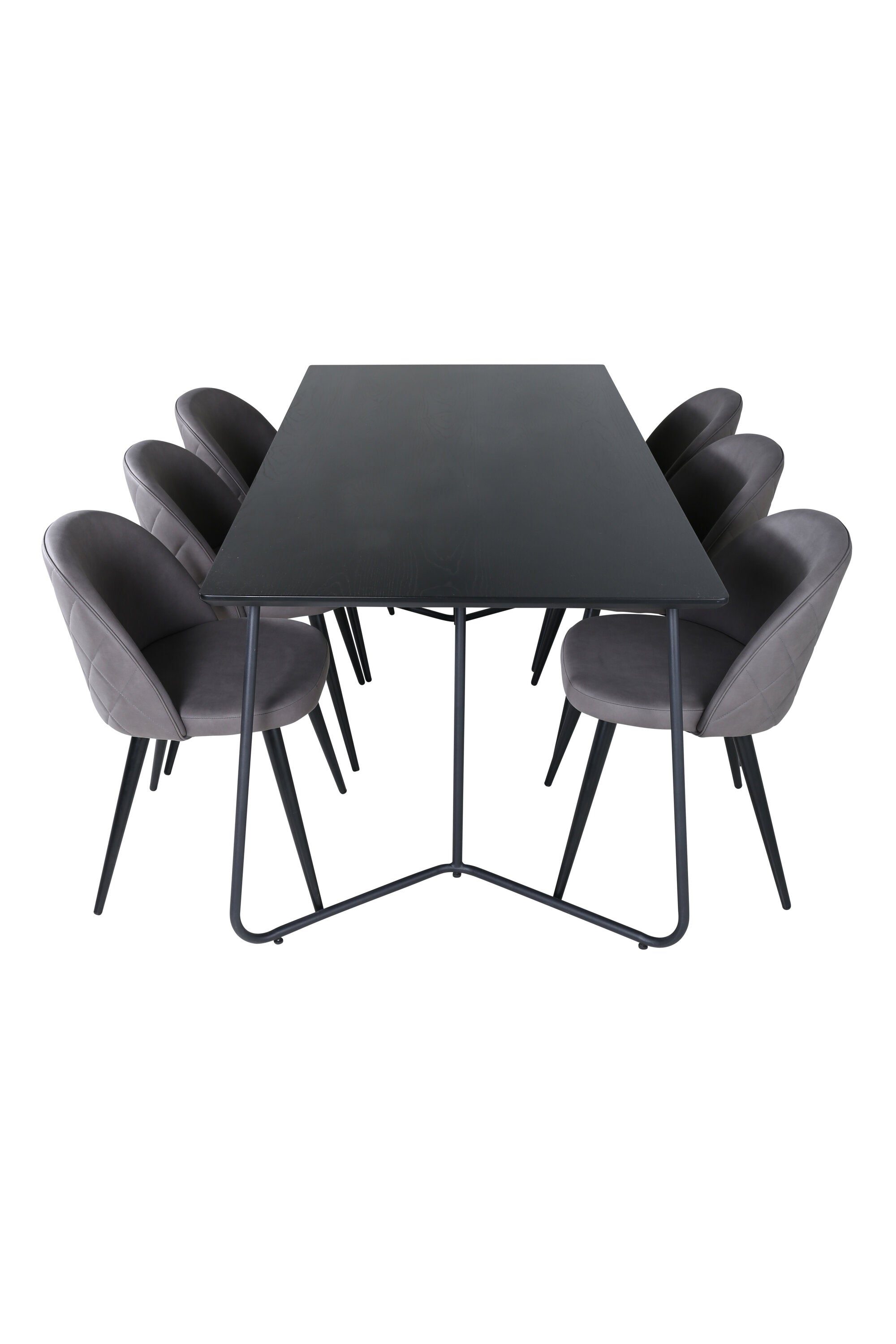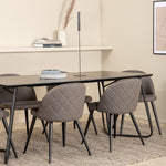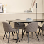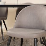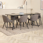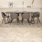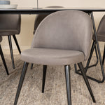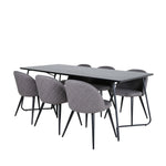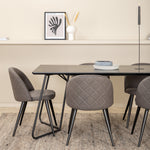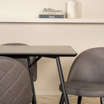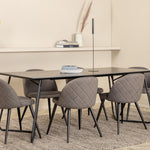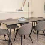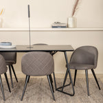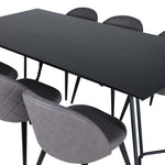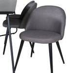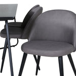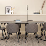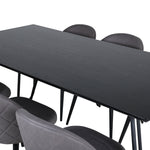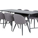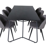 Co víc si přát než skupinu jídel, která je pohodlná, stylová a zároveň dodává místnosti luxusní pocit? Přesně to nabízí tato moderní kombinace! Jídelní stůl Petra má promyšlený design se skandinávskými tvary, který působí stylově, úzké, lehce rozšířené nohy ze železa a stolní deska z černé MDF s dýhou. Rozměry stolu: Délka: 190 cm, Šířka: 90 cm, Výška: 75 cm. Zde spolu se 6 jídelními židlemi Velvet Stitches v měkkém provedení s černou kovovou nohou židle a šedými sedáky z mikrovlákna. Rozměry židle: Výška: 76,5 cm, výška sedáku: 46,5 cm, šířka: 50 cm, hloubka: 57 cm.