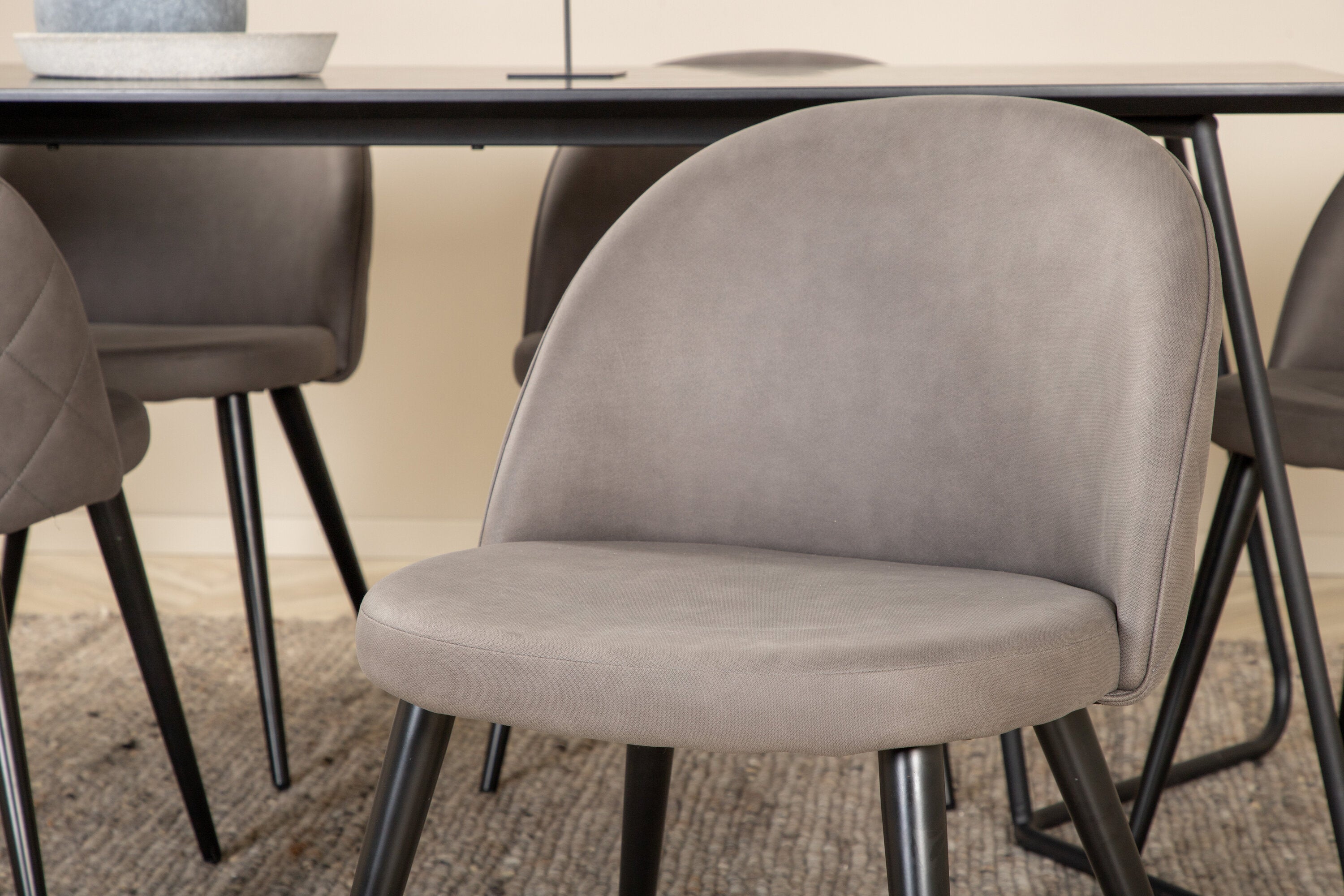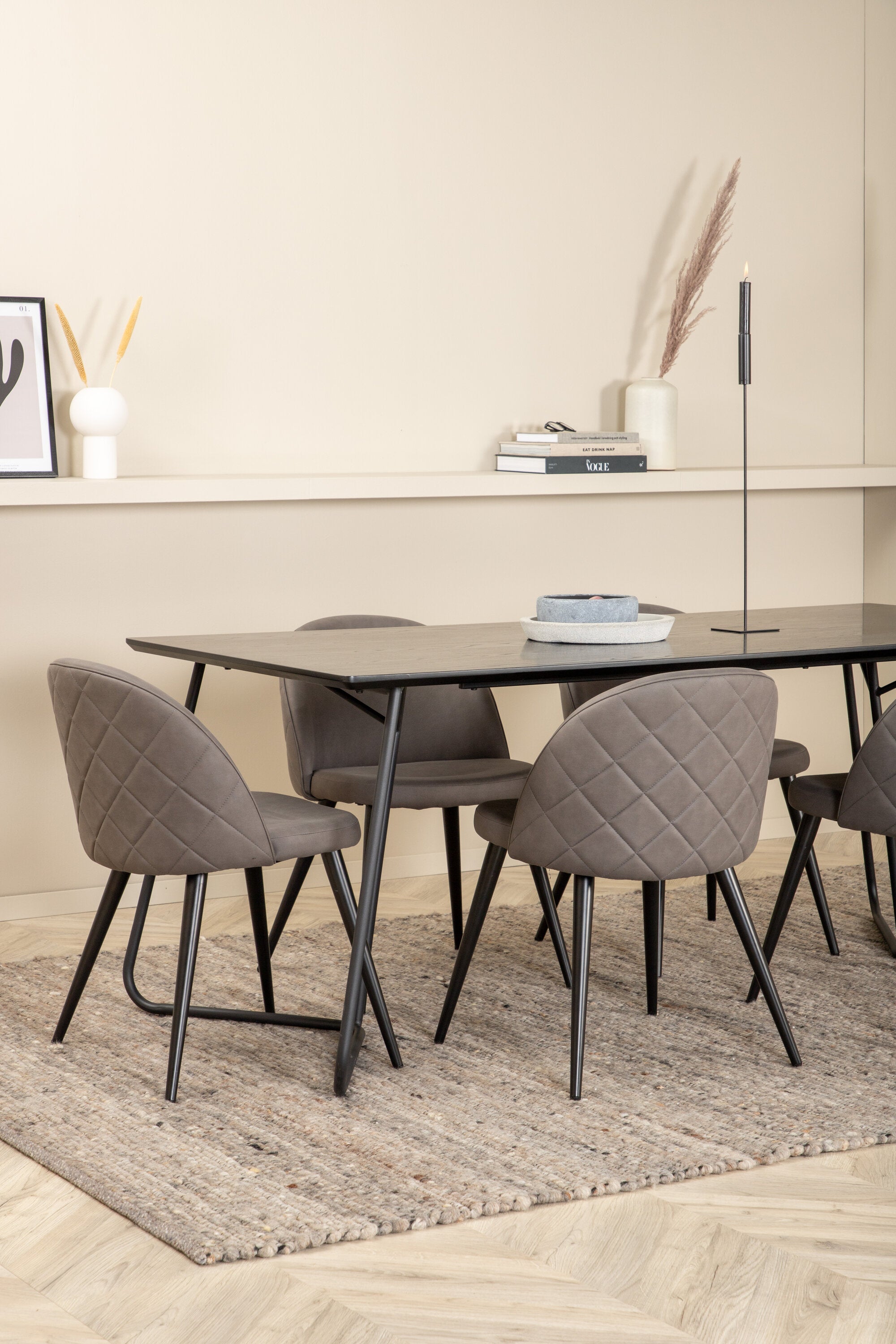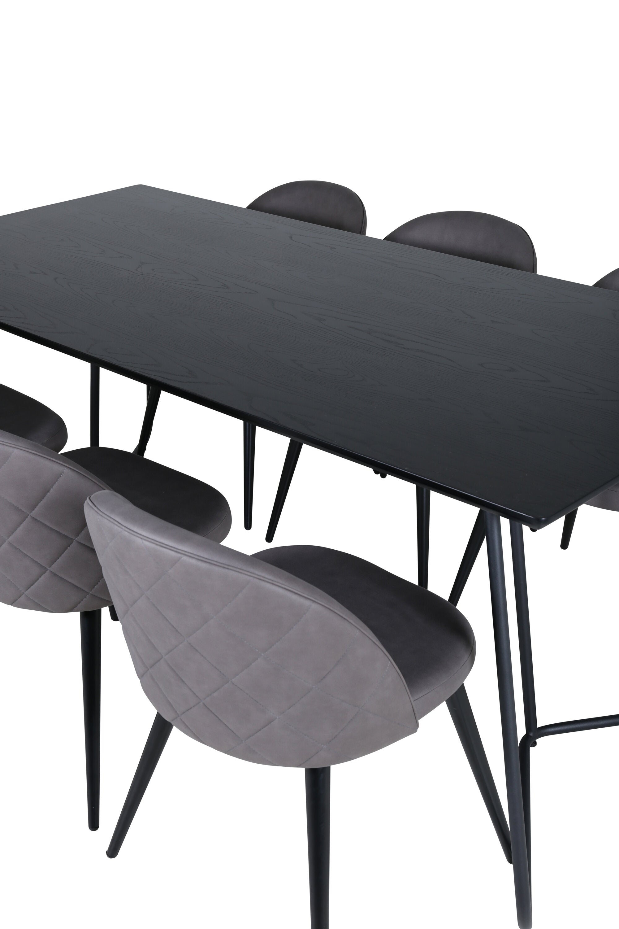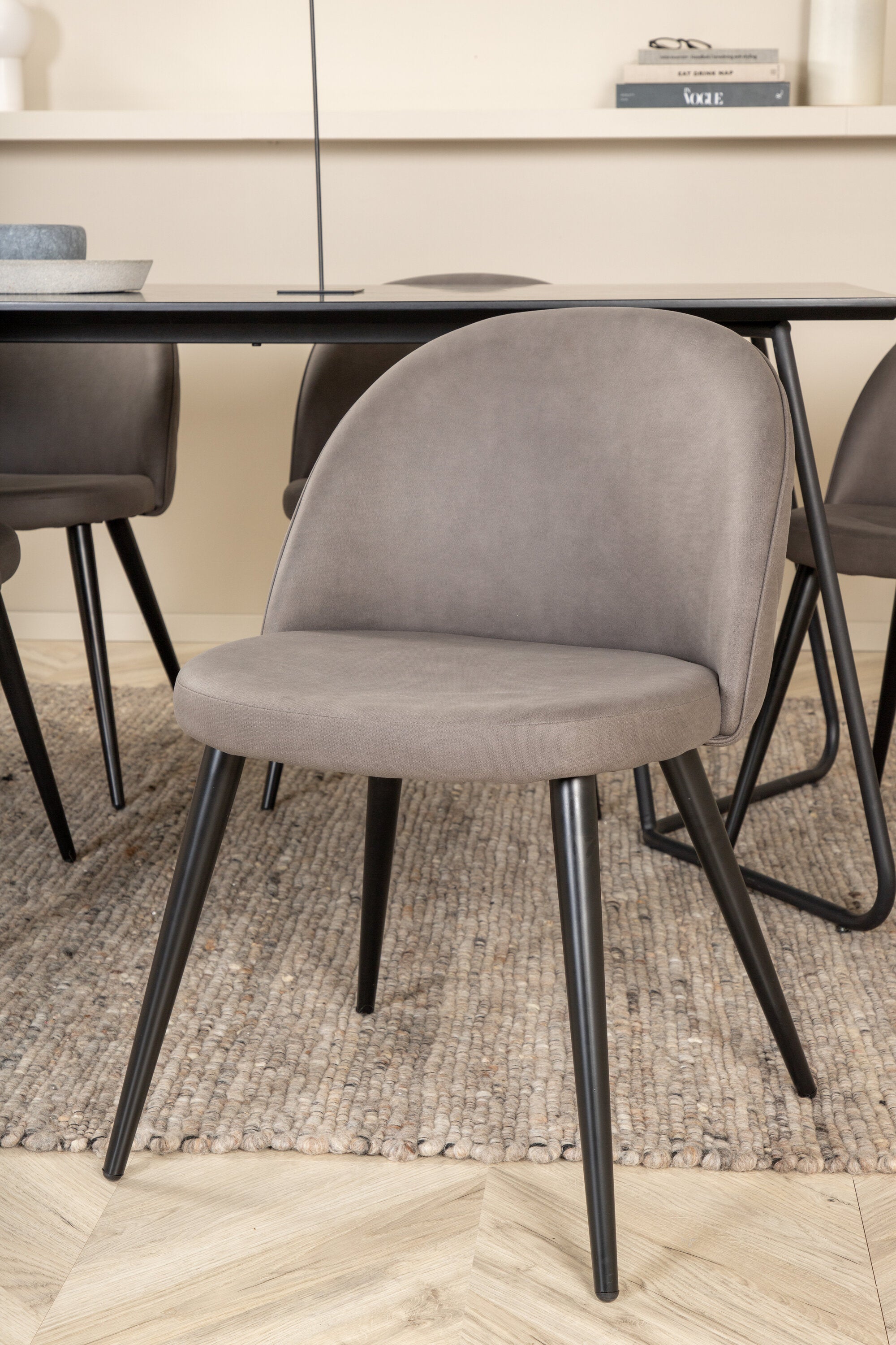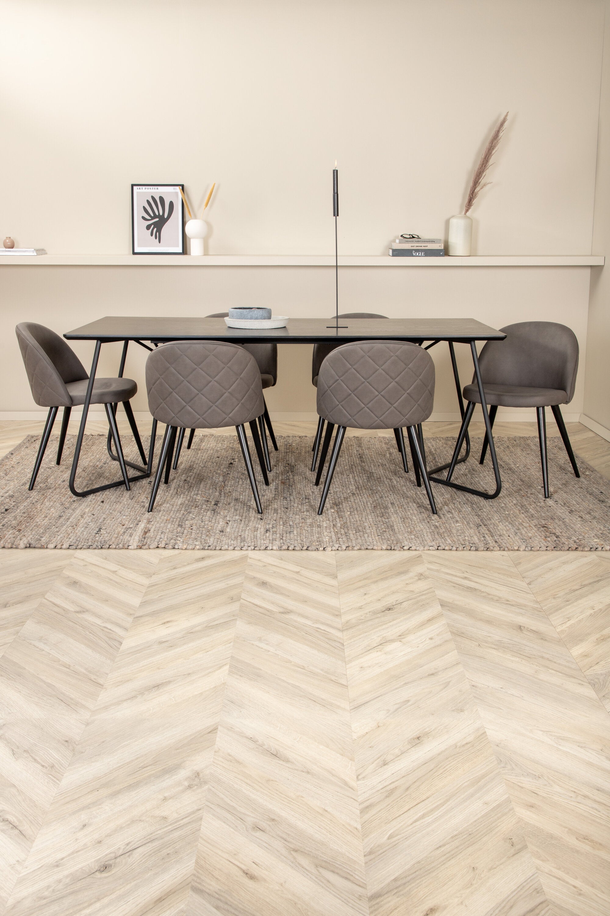 Co víc si přát než skupinu jídel, která je pohodlná, stylová a zároveň dodává místnosti luxusní pocit? Přesně to nabízí tato moderní kombinace! Jídelní stůl Petra má promyšlený design se skandinávskými tvary, který působí stylově, úzké, lehce rozšířené nohy ze železa a stolní deska z černé MDF s dýhou. Rozměry stolu: Délka: 190 cm, Šířka: 90 cm, Výška: 75 cm. Zde spolu se 6 jídelními židlemi Velvet Stitches v měkkém provedení s černou kovovou nohou židle a šedými sedáky z mikrovlákna. Rozměry židle: Výška: 76,5 cm, výška sedáku: 46,5 cm, šířka: 50 cm, hloubka: 57 cm.