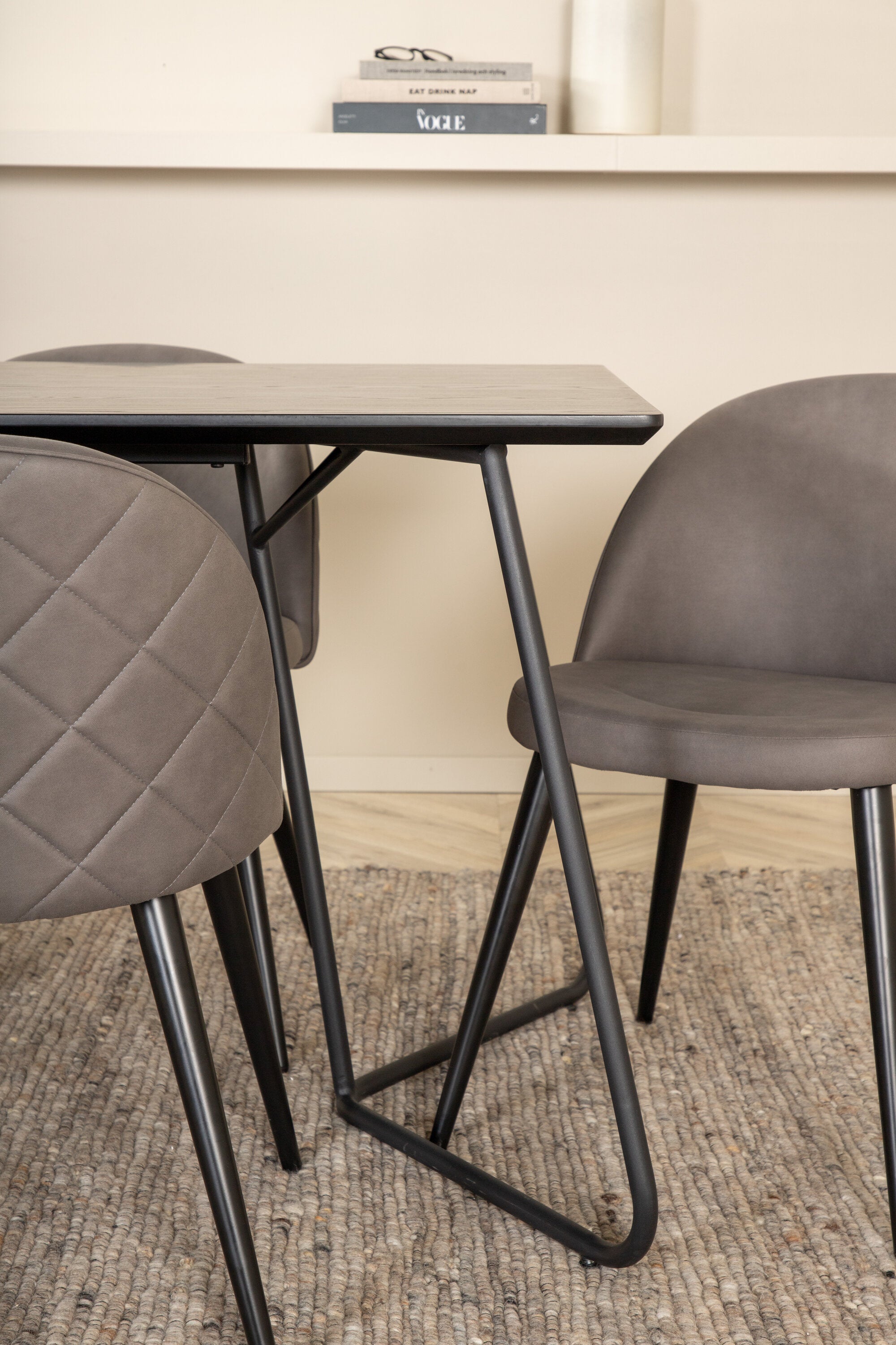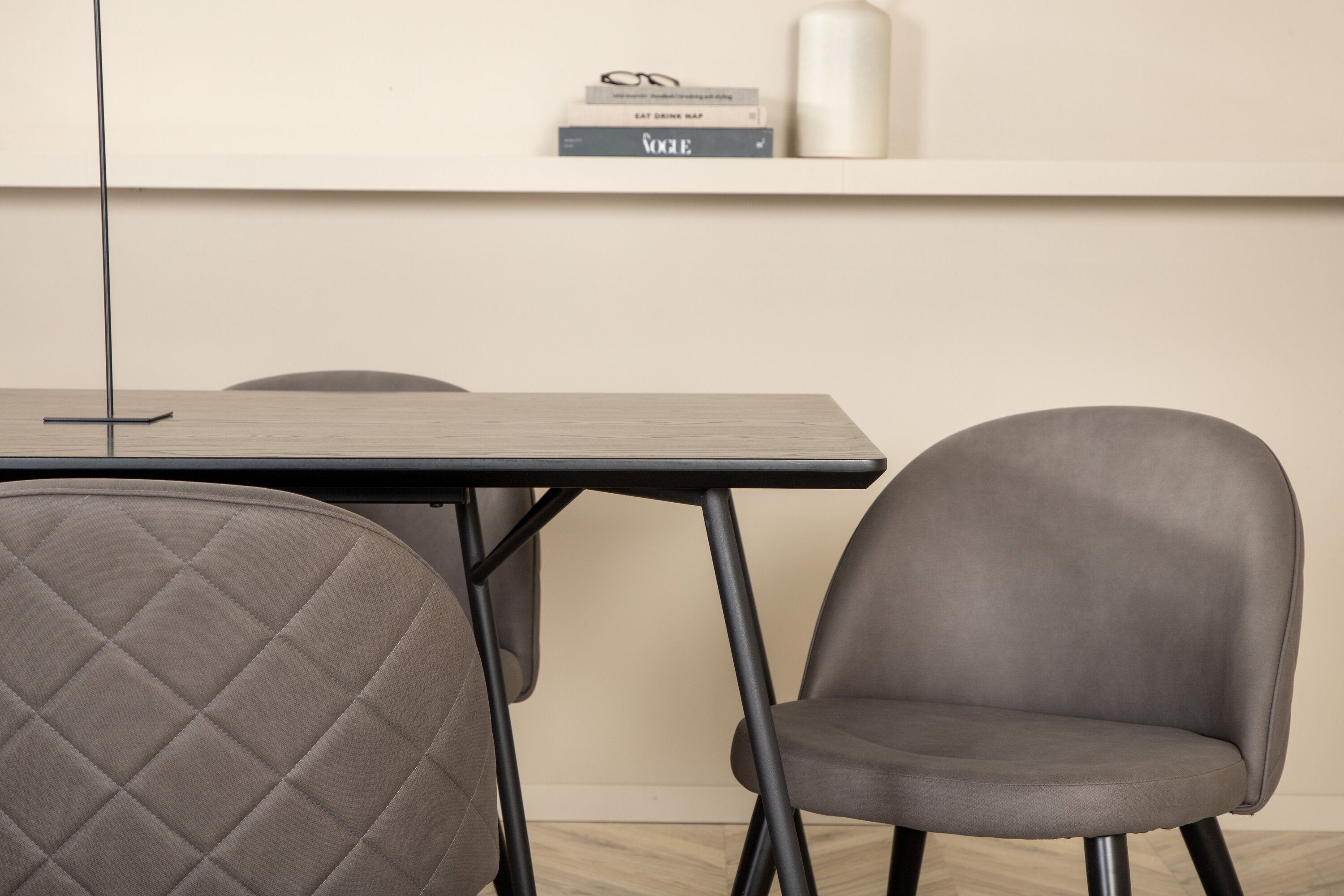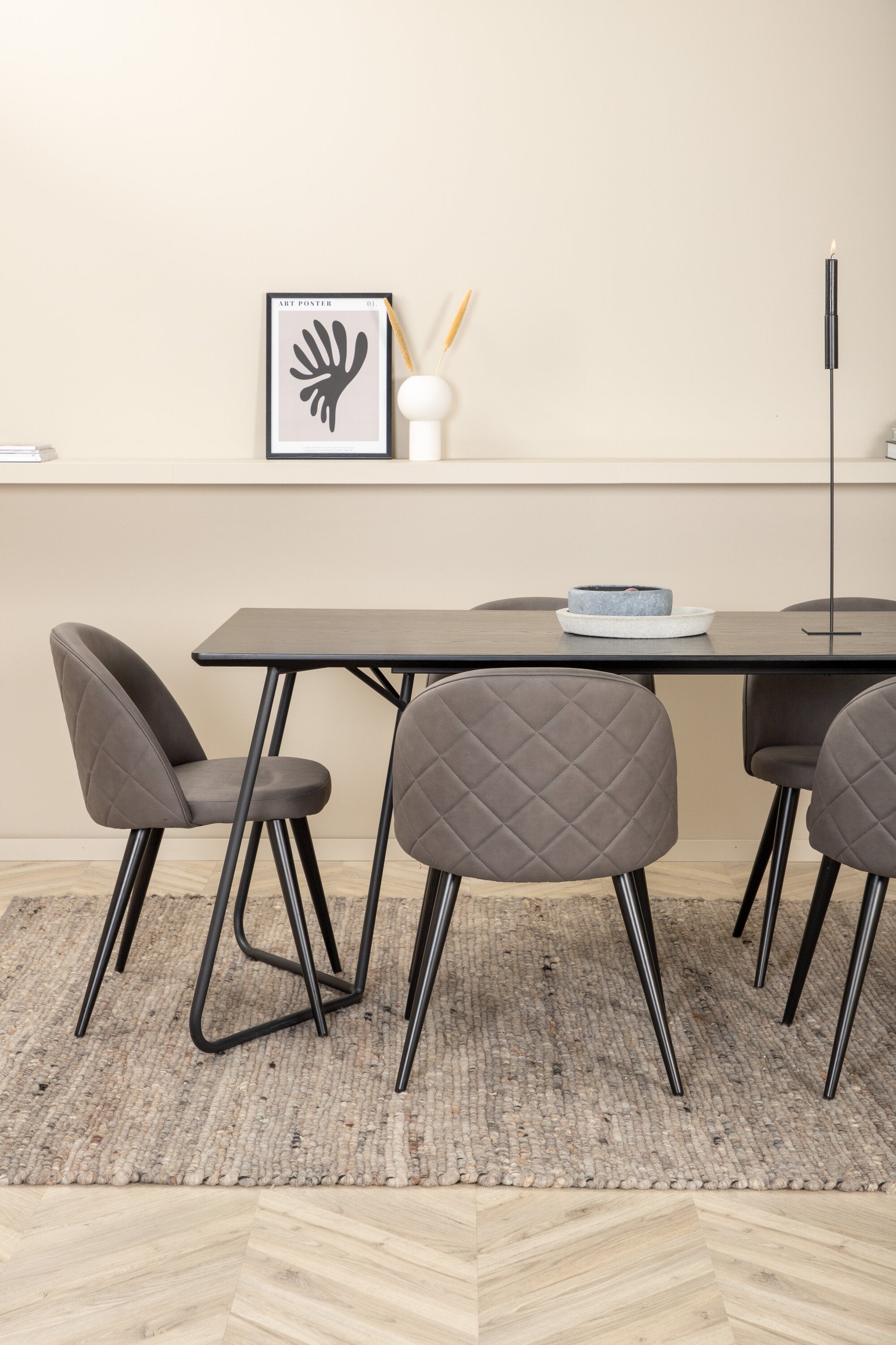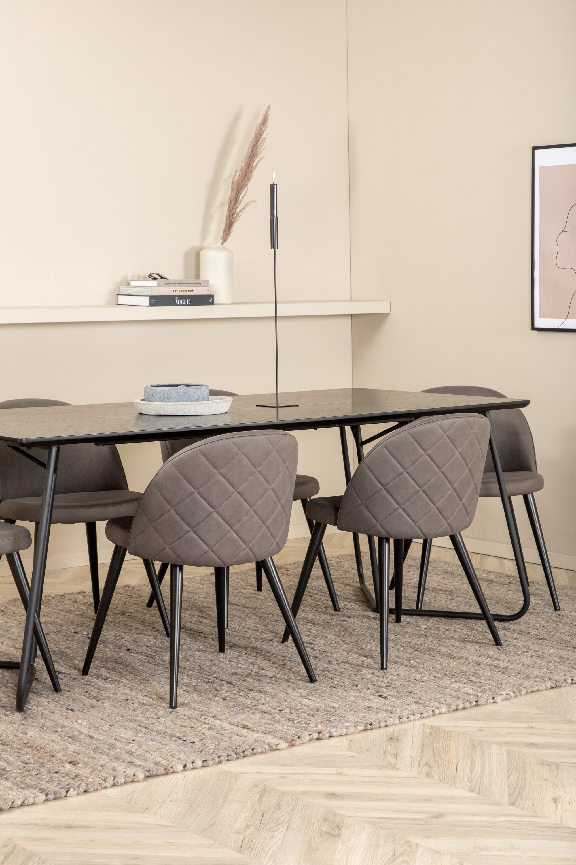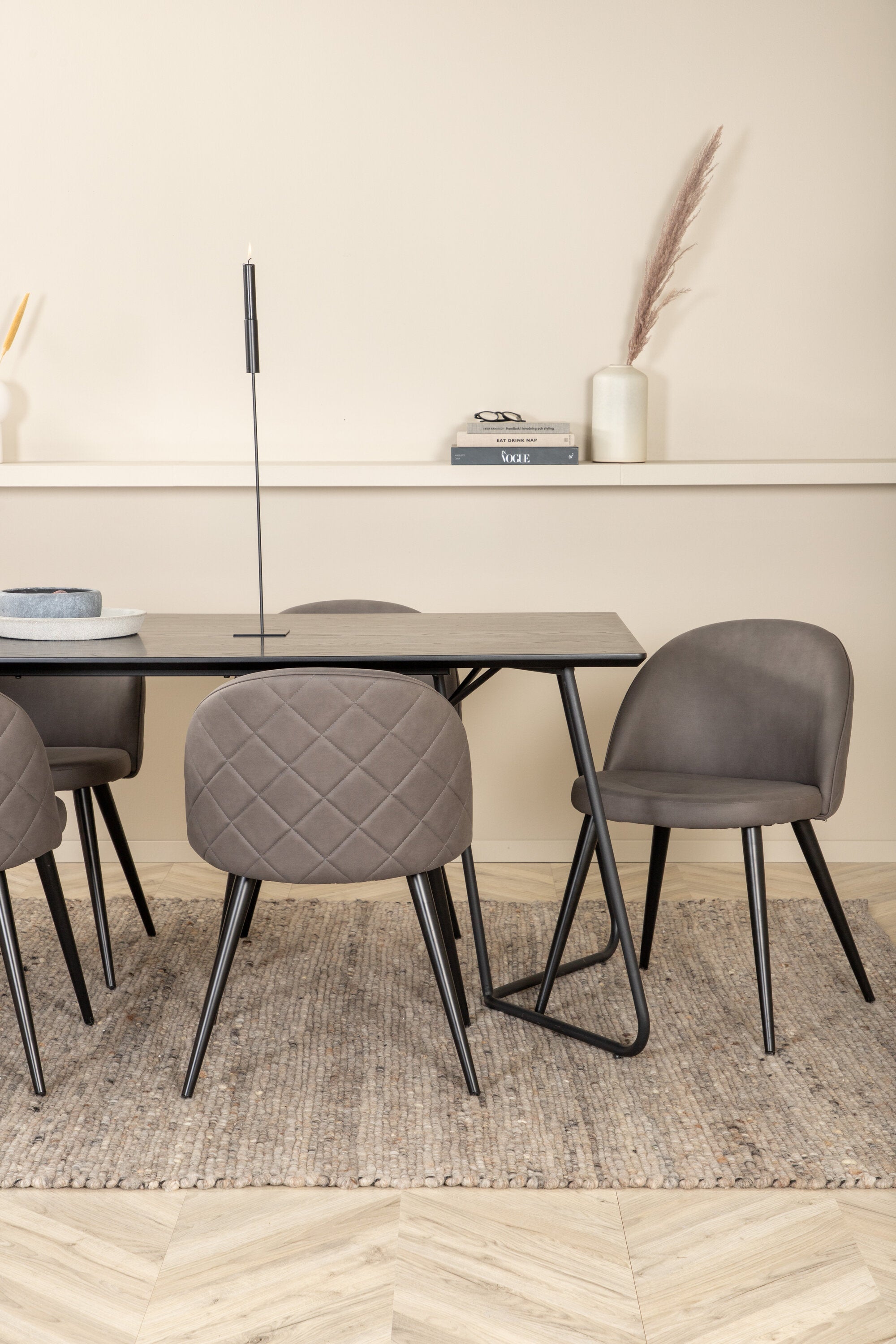 Co víc si přát než skupinu jídel, která je pohodlná, stylová a zároveň dodává místnosti luxusní pocit? Přesně to nabízí tato moderní kombinace! Jídelní stůl Petra má promyšlený design se skandinávskými tvary, který působí stylově, úzké, lehce rozšířené nohy ze železa a stolní deska z černé MDF s dýhou. Rozměry stolu: Délka: 190 cm, Šířka: 90 cm, Výška: 75 cm. Zde spolu se 6 jídelními židlemi Velvet Stitches v měkkém provedení s černou kovovou nohou židle a šedými sedáky z mikrovlákna. Rozměry židle: Výška: 76,5 cm, výška sedáku: 46,5 cm, šířka: 50 cm, hloubka: 57 cm.