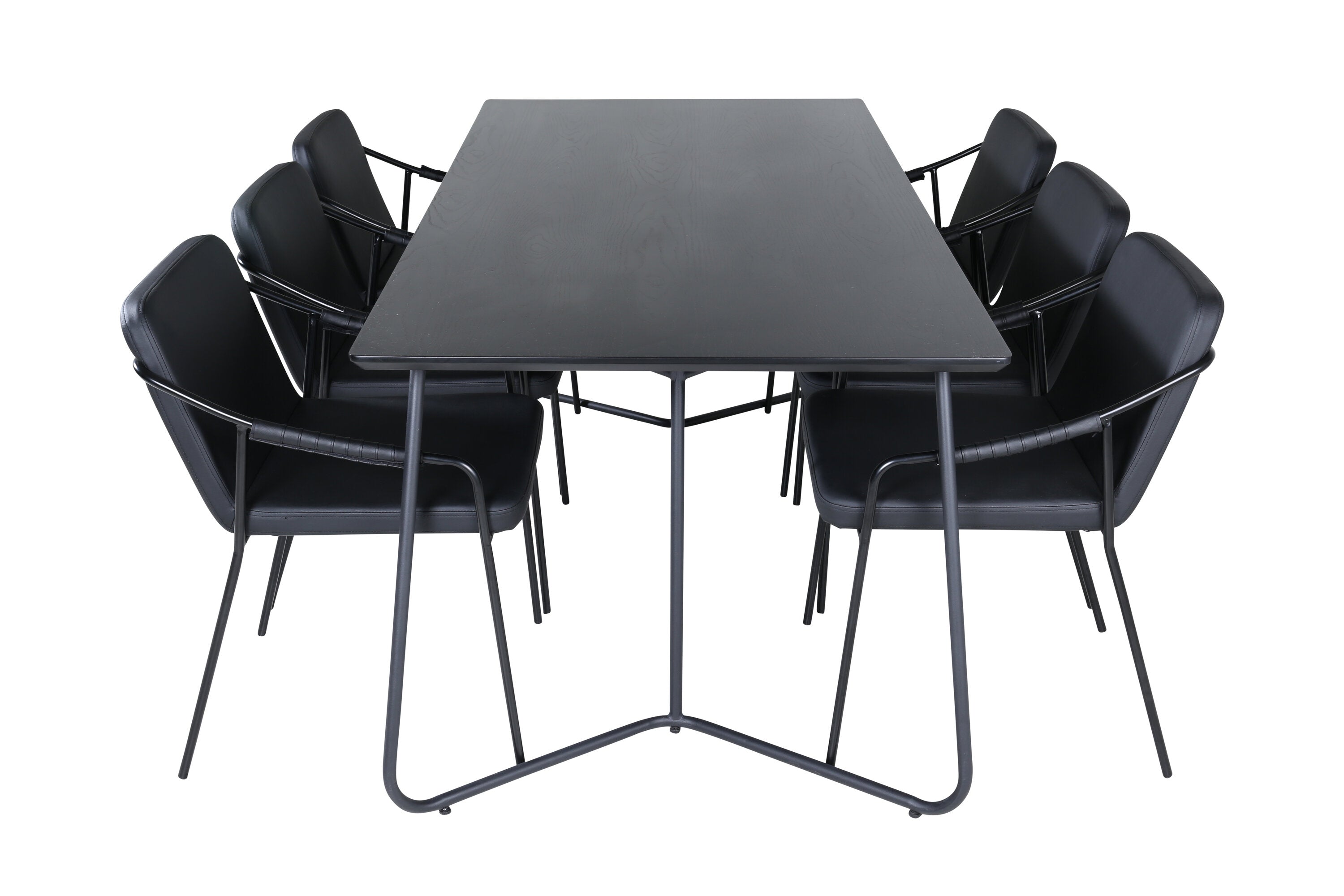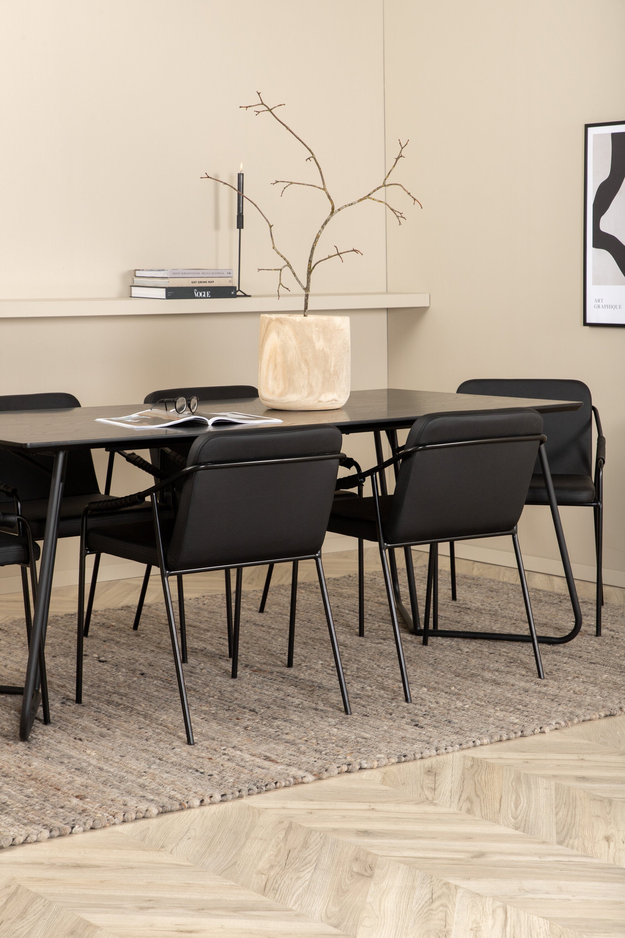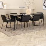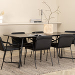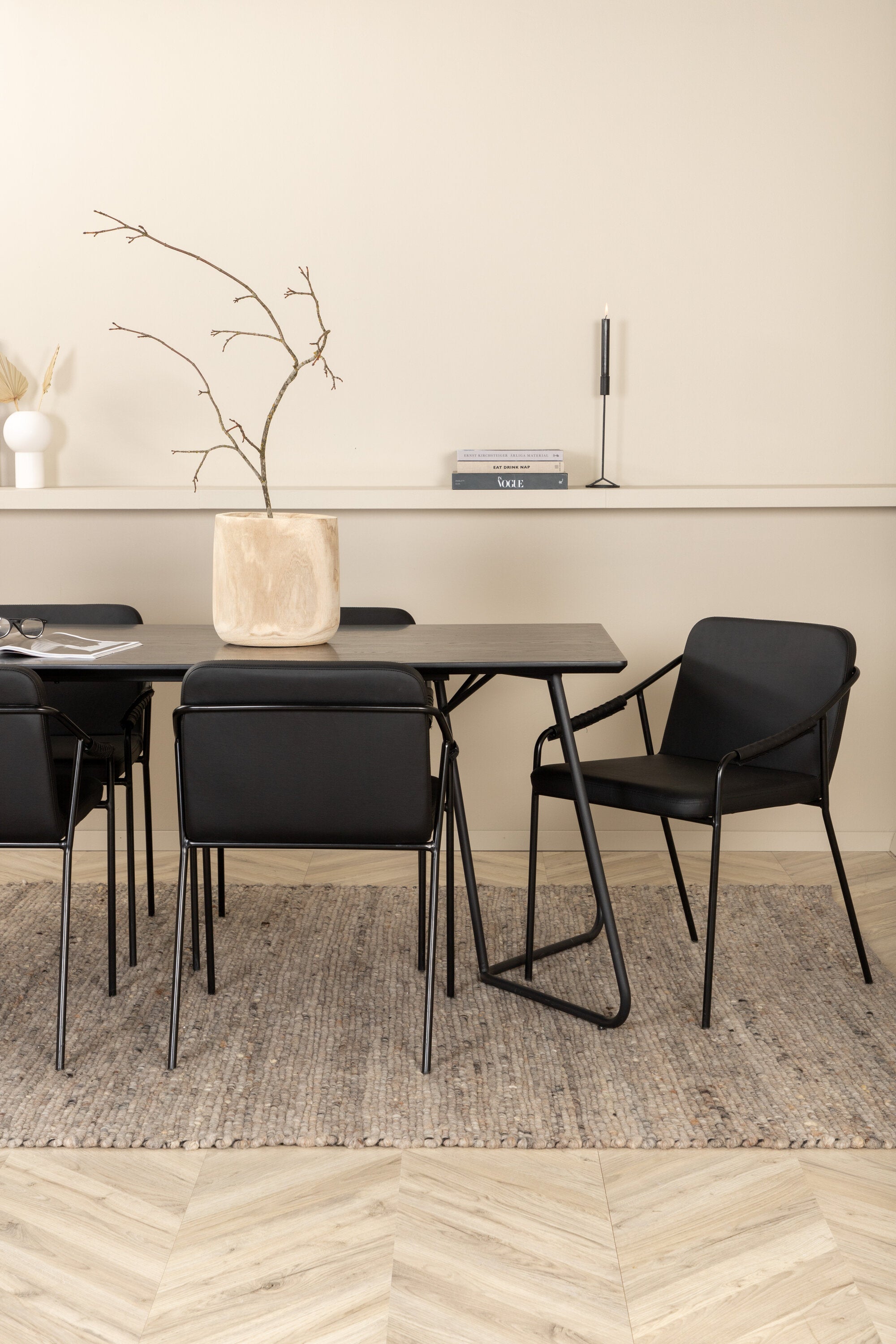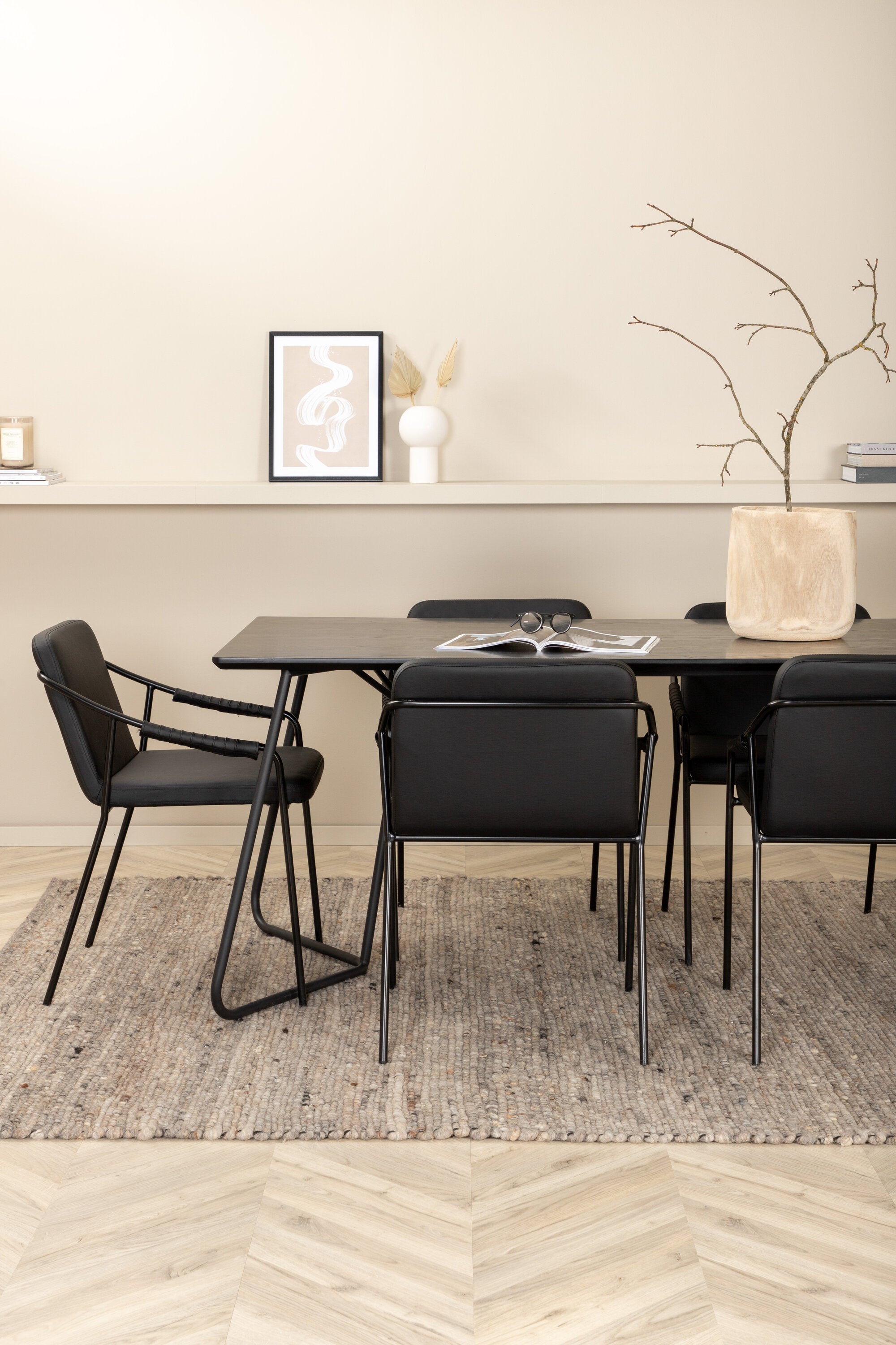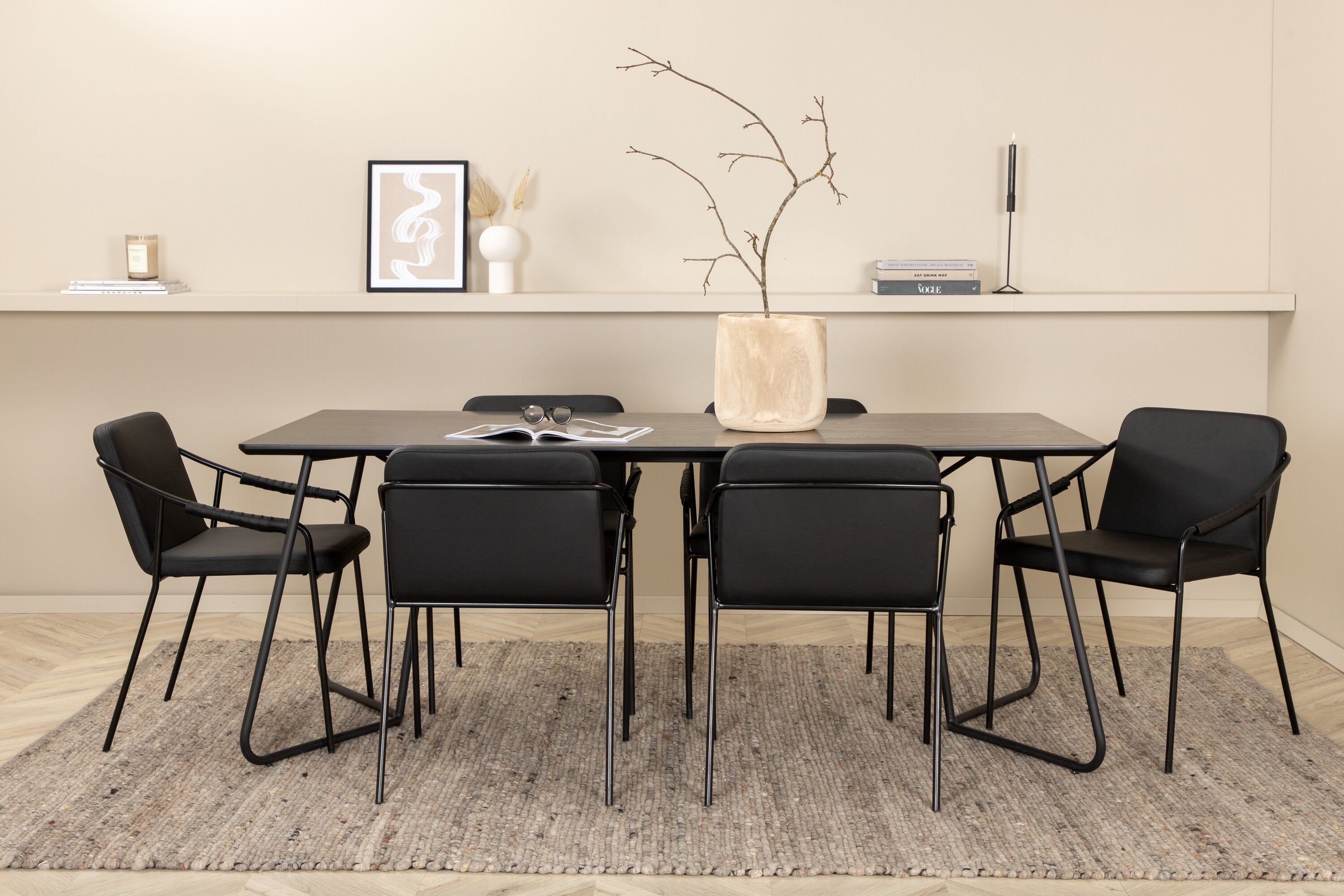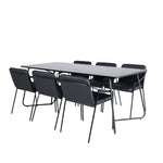 Jídelní stůl Petra má promyšlený design se skandinávskými tvary, který působí stylově, úzké, lehce rozšířené nohy ze železa a stolní deska z černé MDF s dýhou. Rozměry stolu: Délka: 190 cm, Šířka: 90 cm, Výška: 75 cm. Zde v dokonalé kombinaci se 6 stylovými jídelními židlemi ze série Dispute. Sedadla jsou v černé umělé kůži a mají integrované područky a nohy židle z černého železa. Rozměry židle: výška: 77 cm, výška sedáku: 48 cm, šířka: 53 cm, hloubka: 59 cm. Luxusní a stylová skupina jídel, která vás zve na dlouhé chvíle večeře!