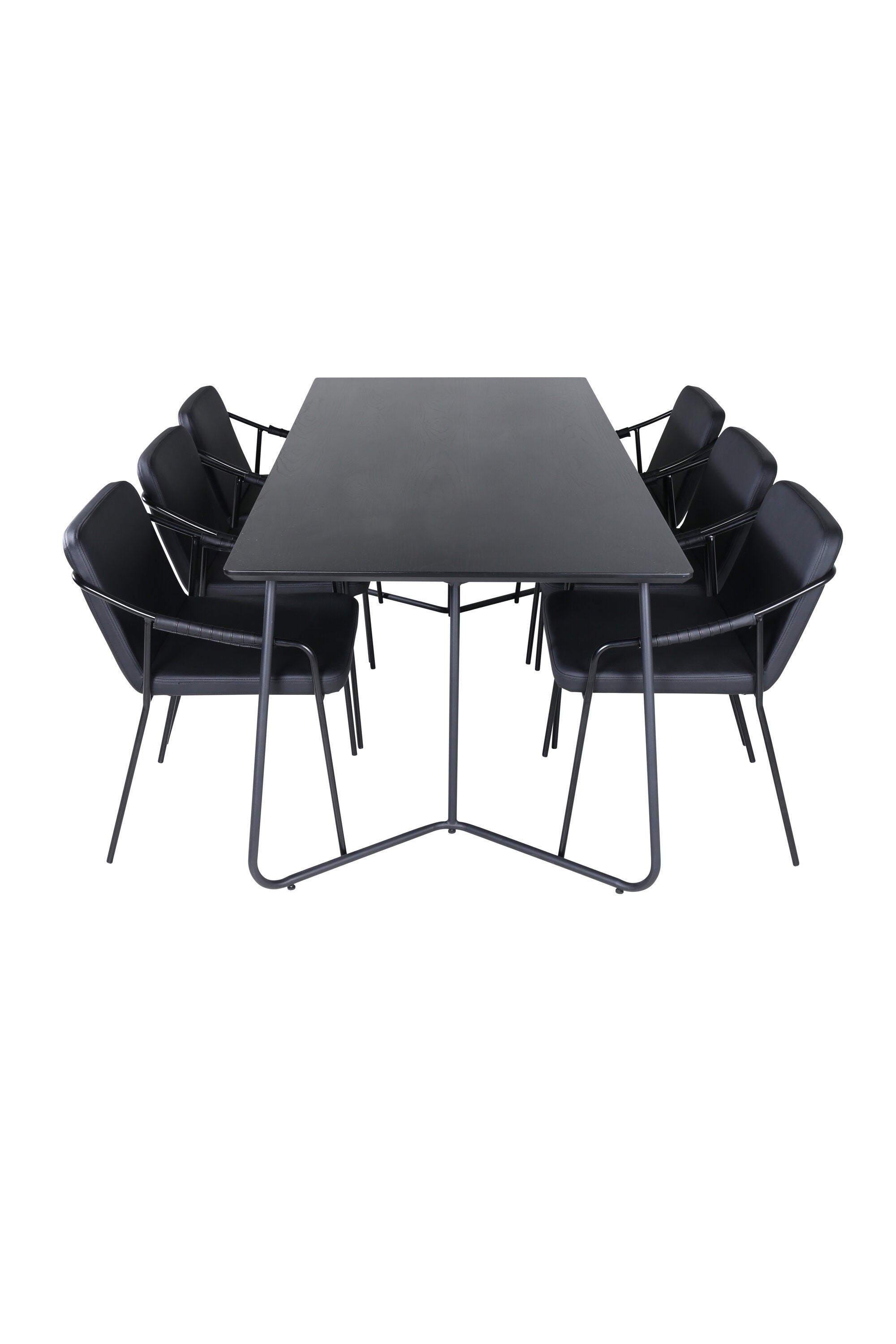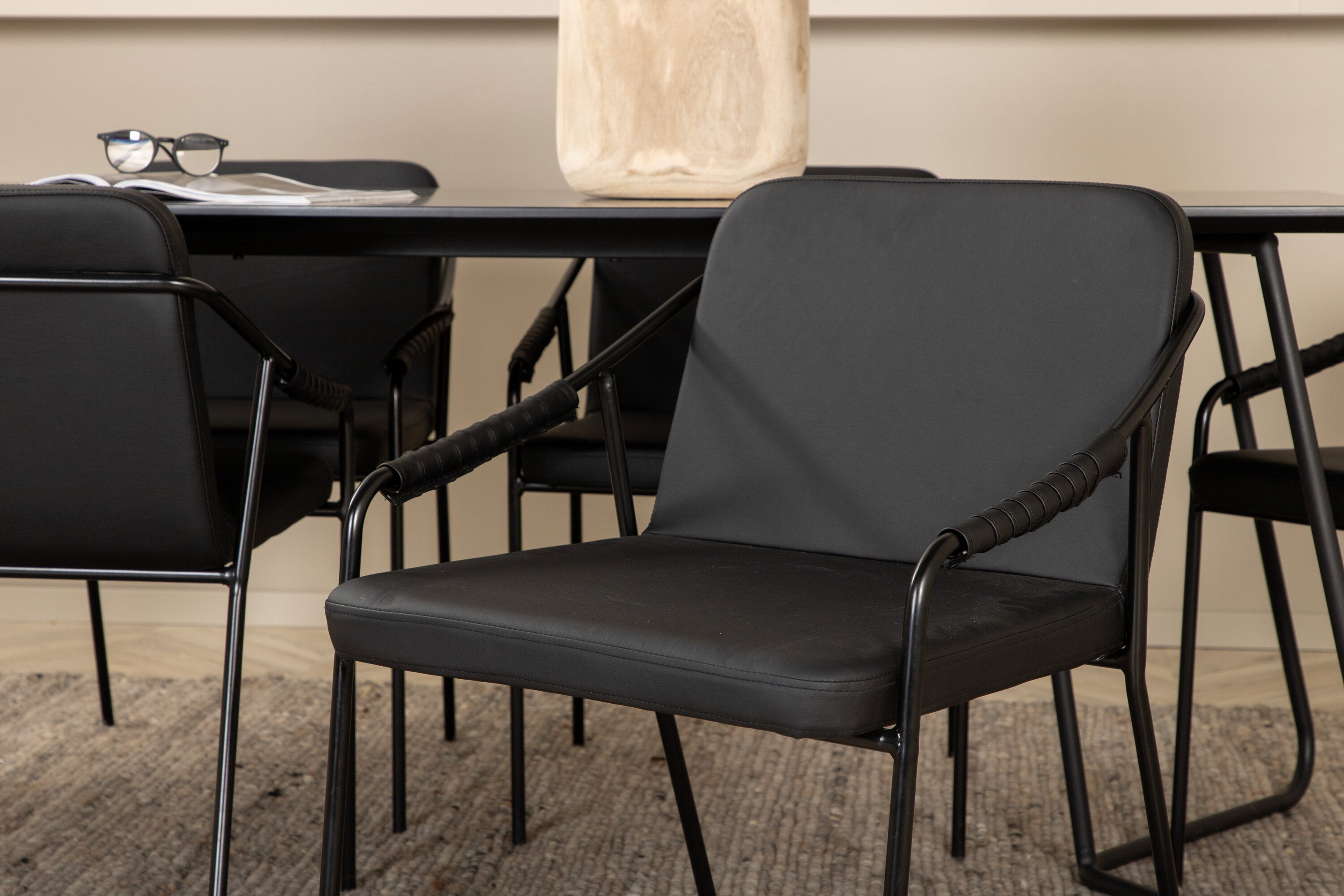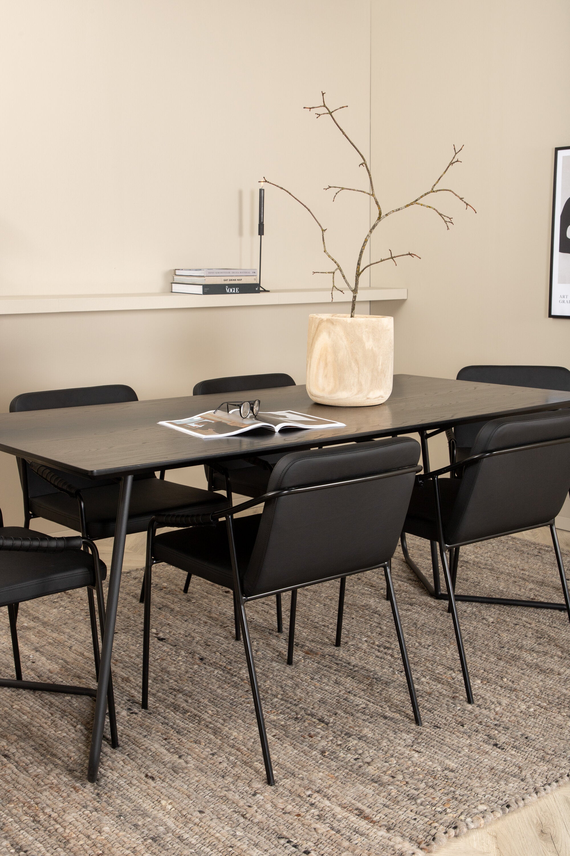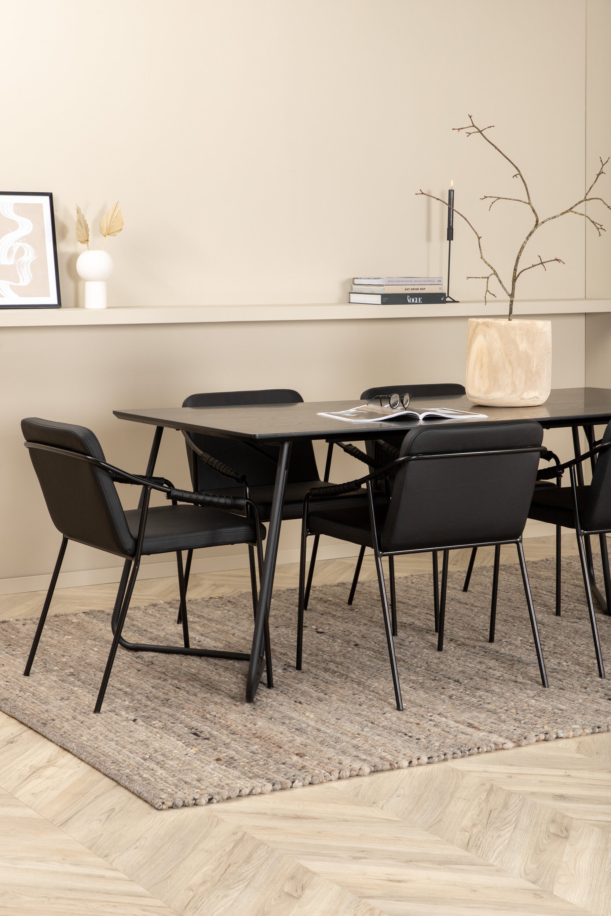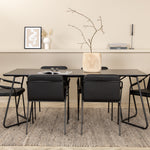 Jídelní stůl Petra má promyšlený design se skandinávskými tvary, který působí stylově, úzké, lehce rozšířené nohy ze železa a stolní deska z černé MDF s dýhou. Rozměry stolu: Délka: 190 cm, Šířka: 90 cm, Výška: 75 cm. Zde v dokonalé kombinaci se 6 stylovými jídelními židlemi ze série Dispute. Sedadla jsou v černé umělé kůži a mají integrované područky a nohy židle z černého železa. Rozměry židle: výška: 77 cm, výška sedáku: 48 cm, šířka: 53 cm, hloubka: 59 cm. Luxusní a stylová skupina jídel, která vás zve na dlouhé chvíle večeře!