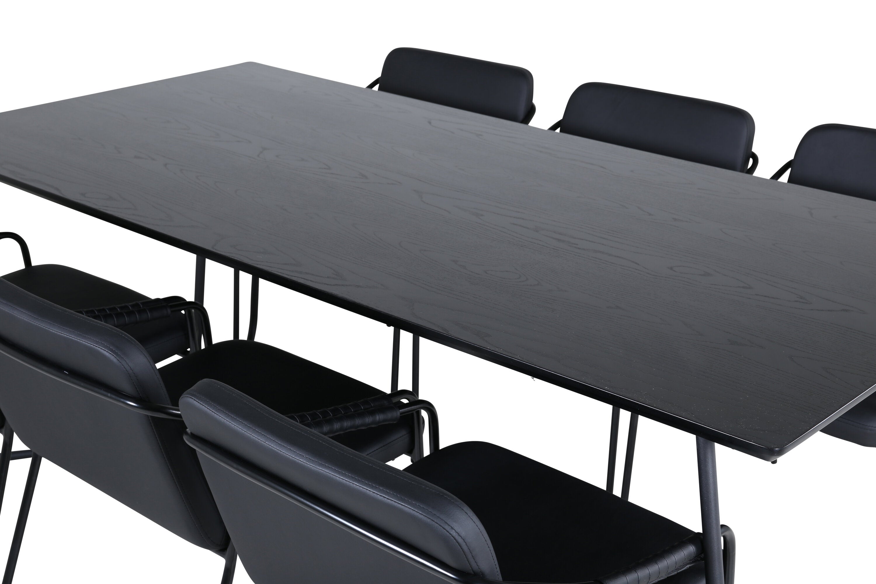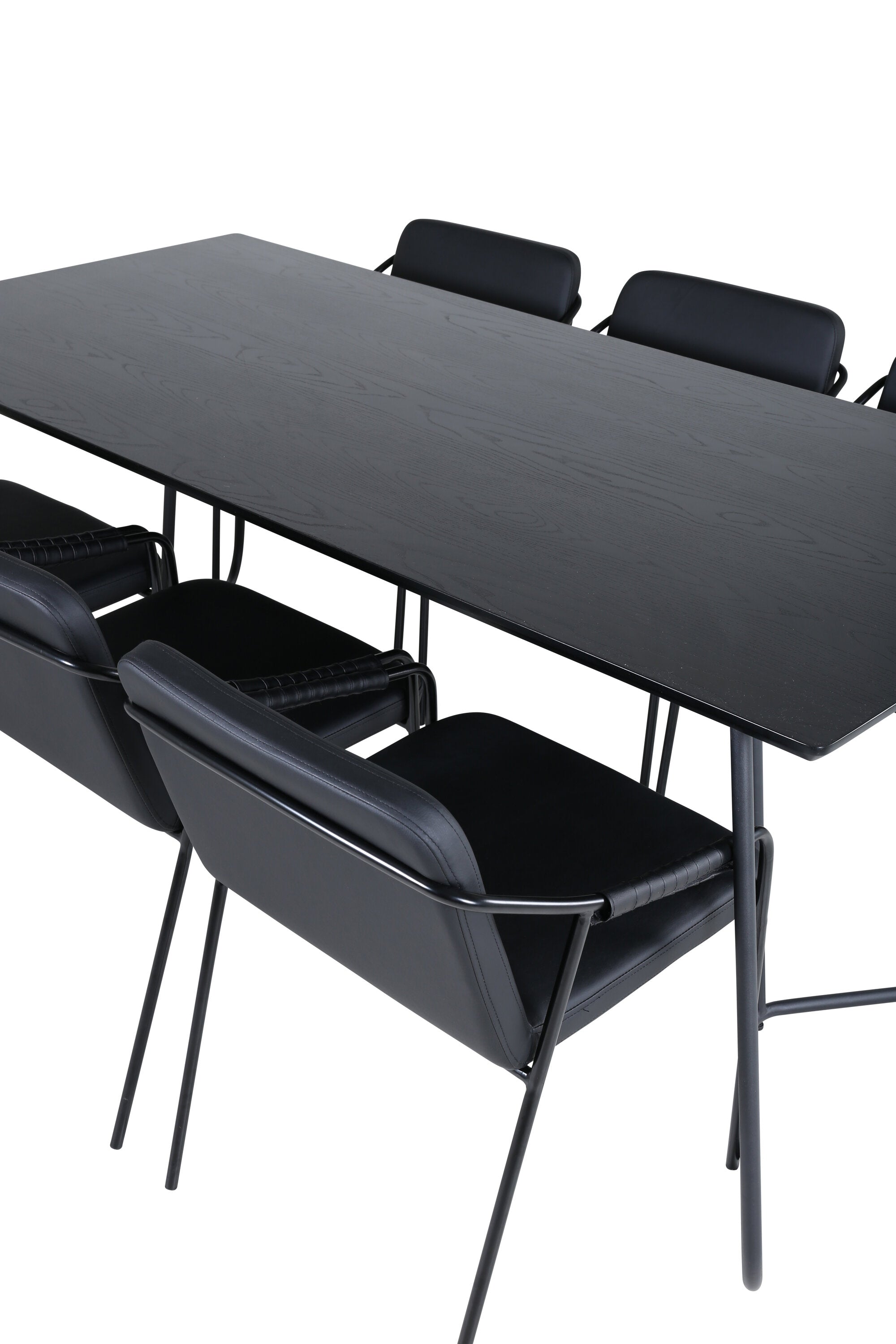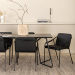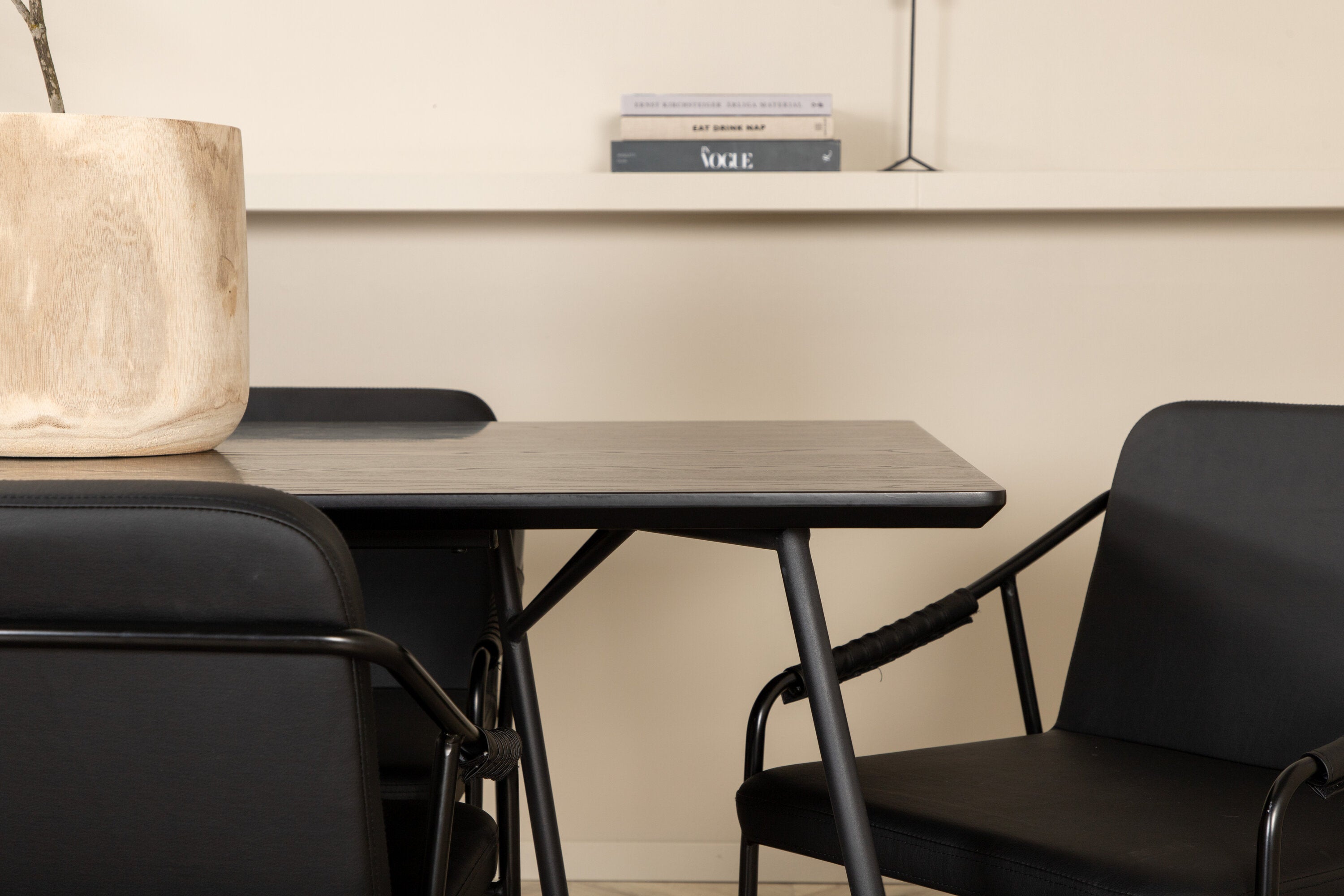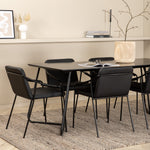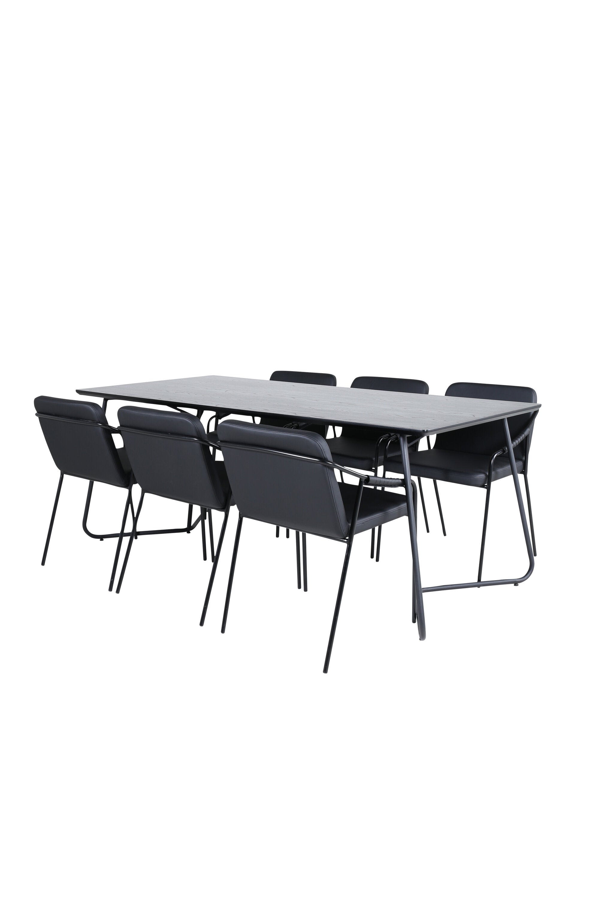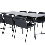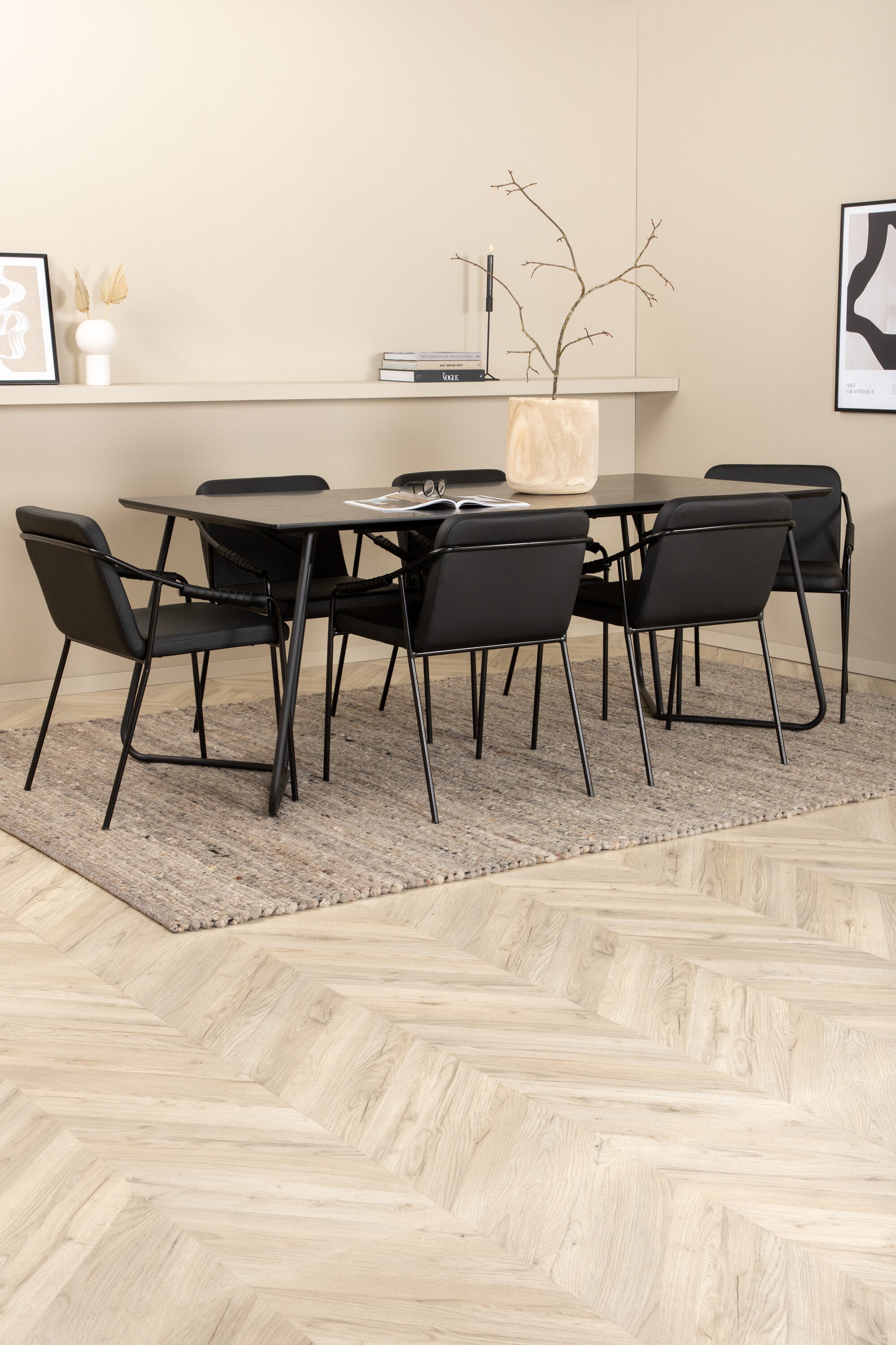 Jídelní stůl Petra má promyšlený design se skandinávskými tvary, který působí stylově, úzké, lehce rozšířené nohy ze železa a stolní deska z černé MDF s dýhou. Rozměry stolu: Délka: 190 cm, Šířka: 90 cm, Výška: 75 cm. Zde v dokonalé kombinaci se 6 stylovými jídelními židlemi ze série Dispute. Sedadla jsou v černé umělé kůži a mají integrované područky a nohy židle z černého železa. Rozměry židle: výška: 77 cm, výška sedáku: 48 cm, šířka: 53 cm, hloubka: 59 cm. Luxusní a stylová skupina jídel, která vás zve na dlouhé chvíle večeře!