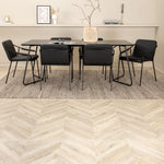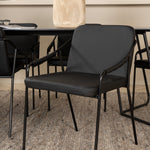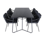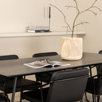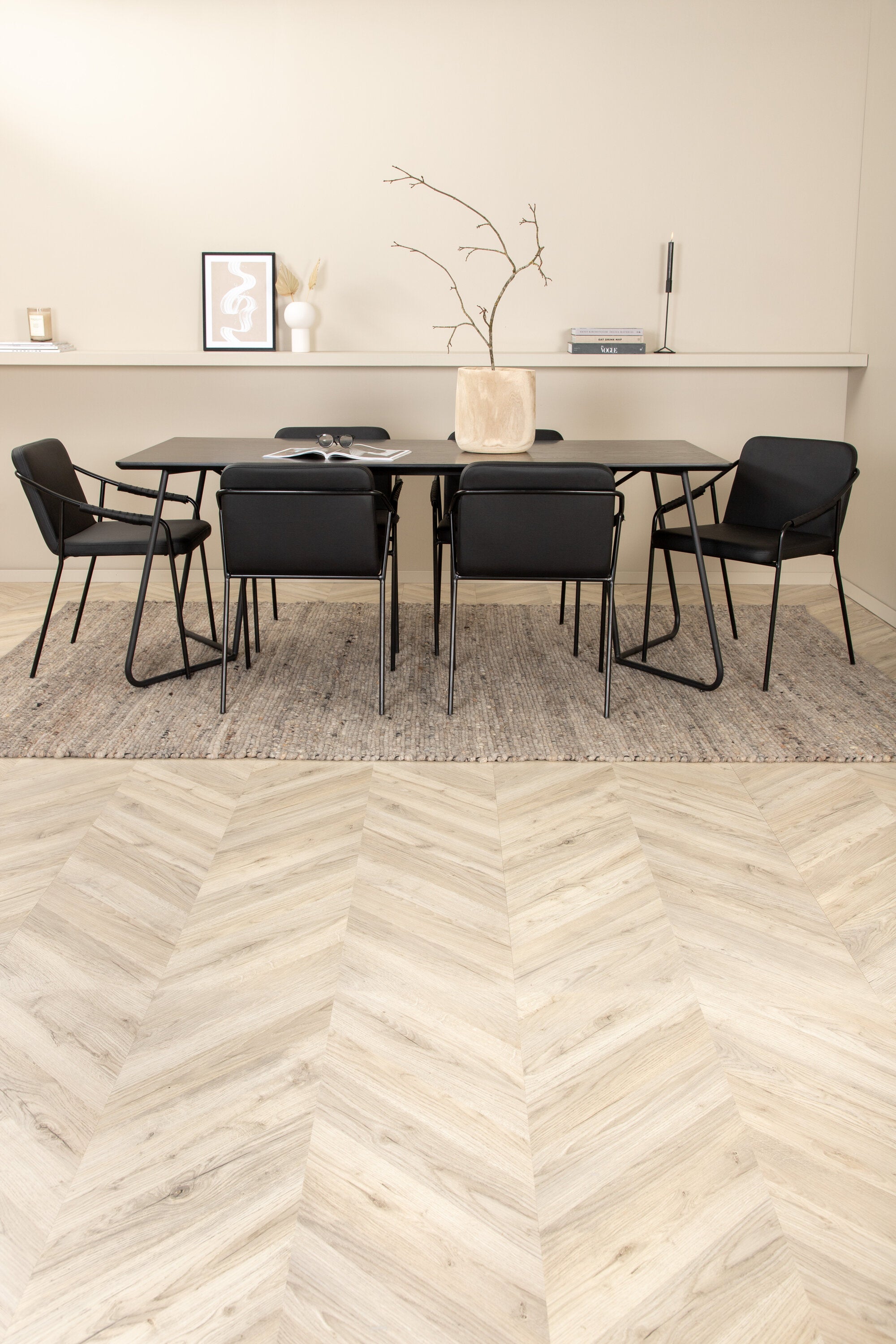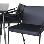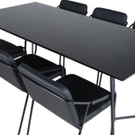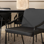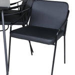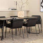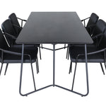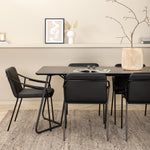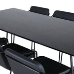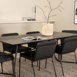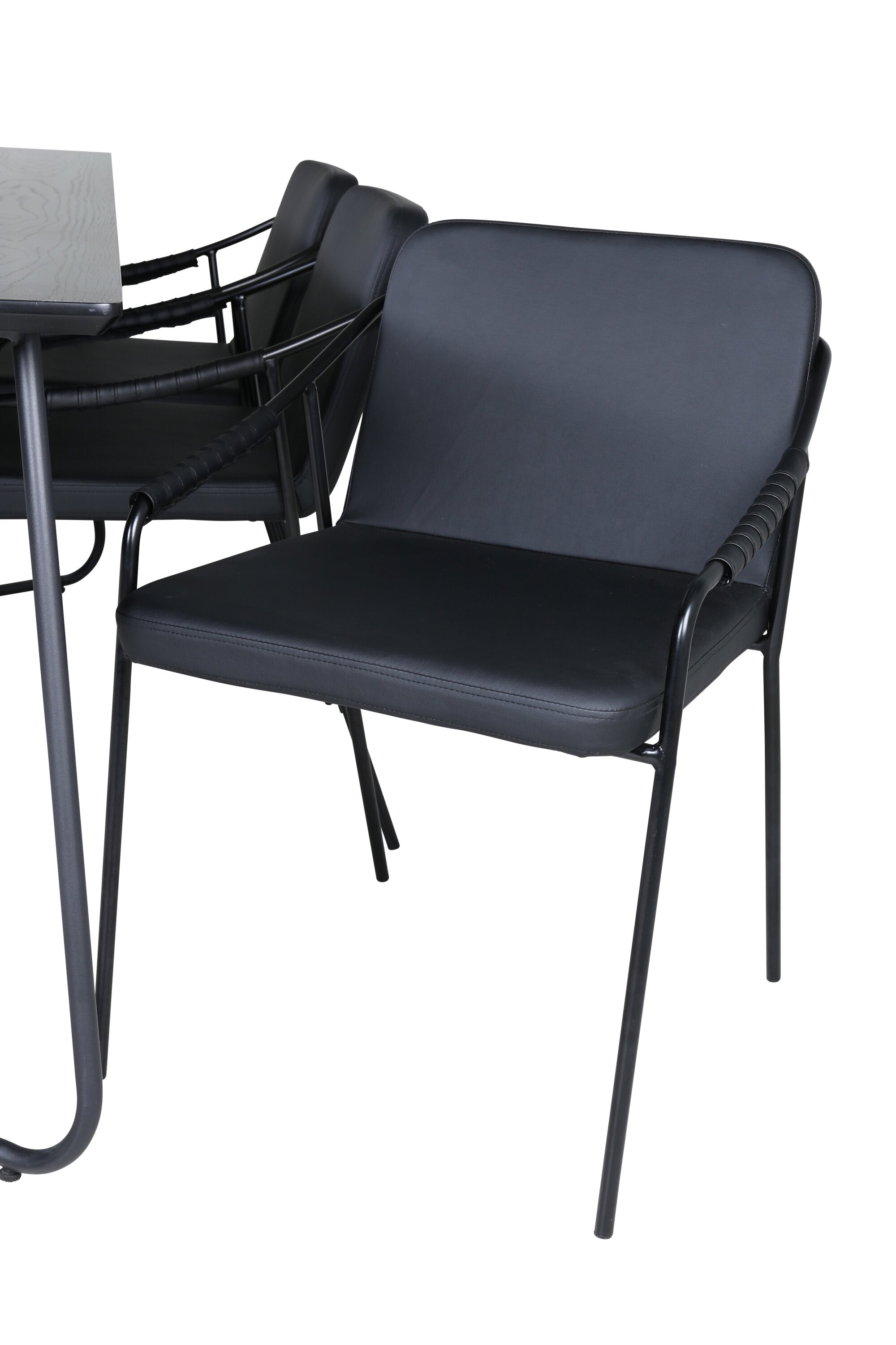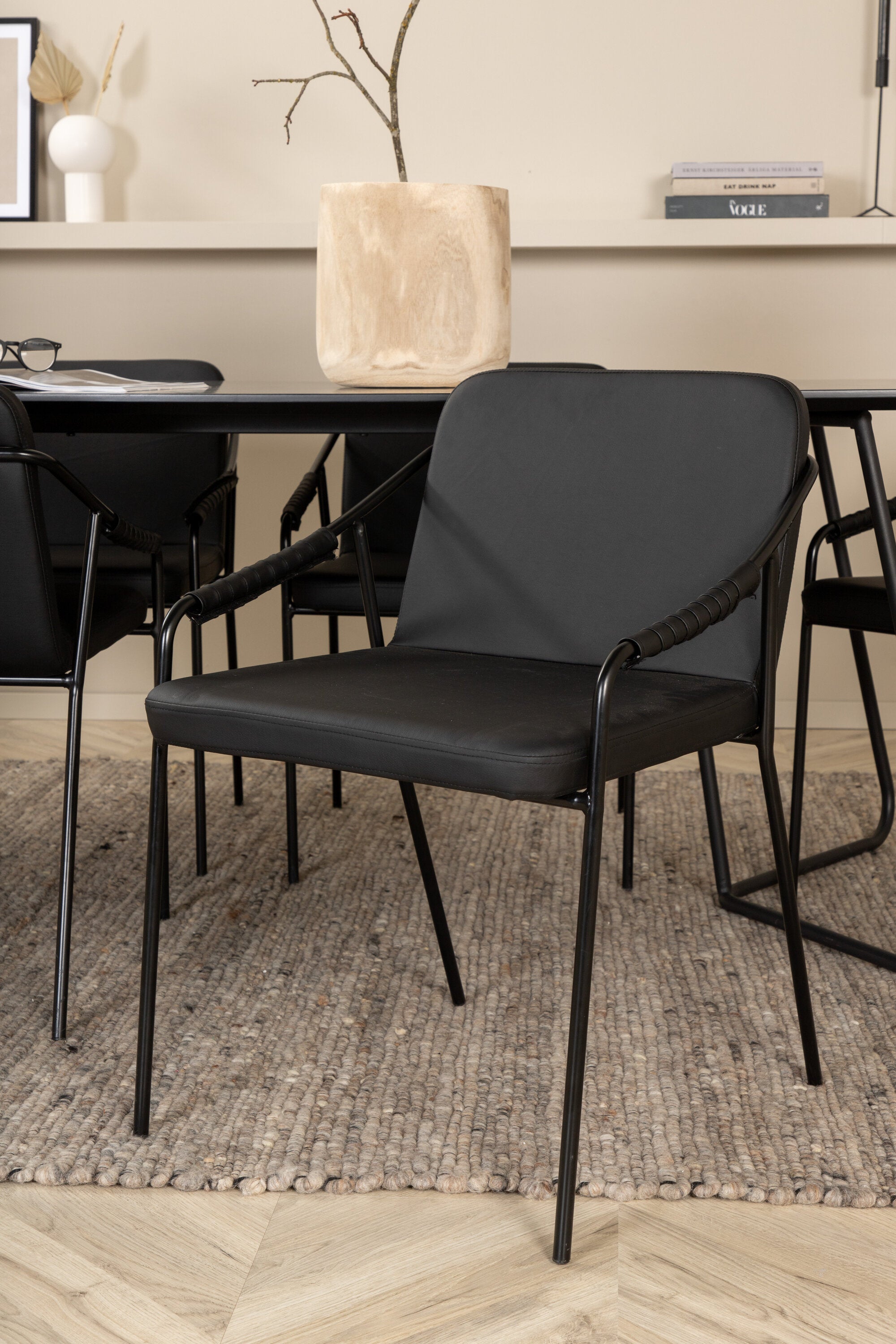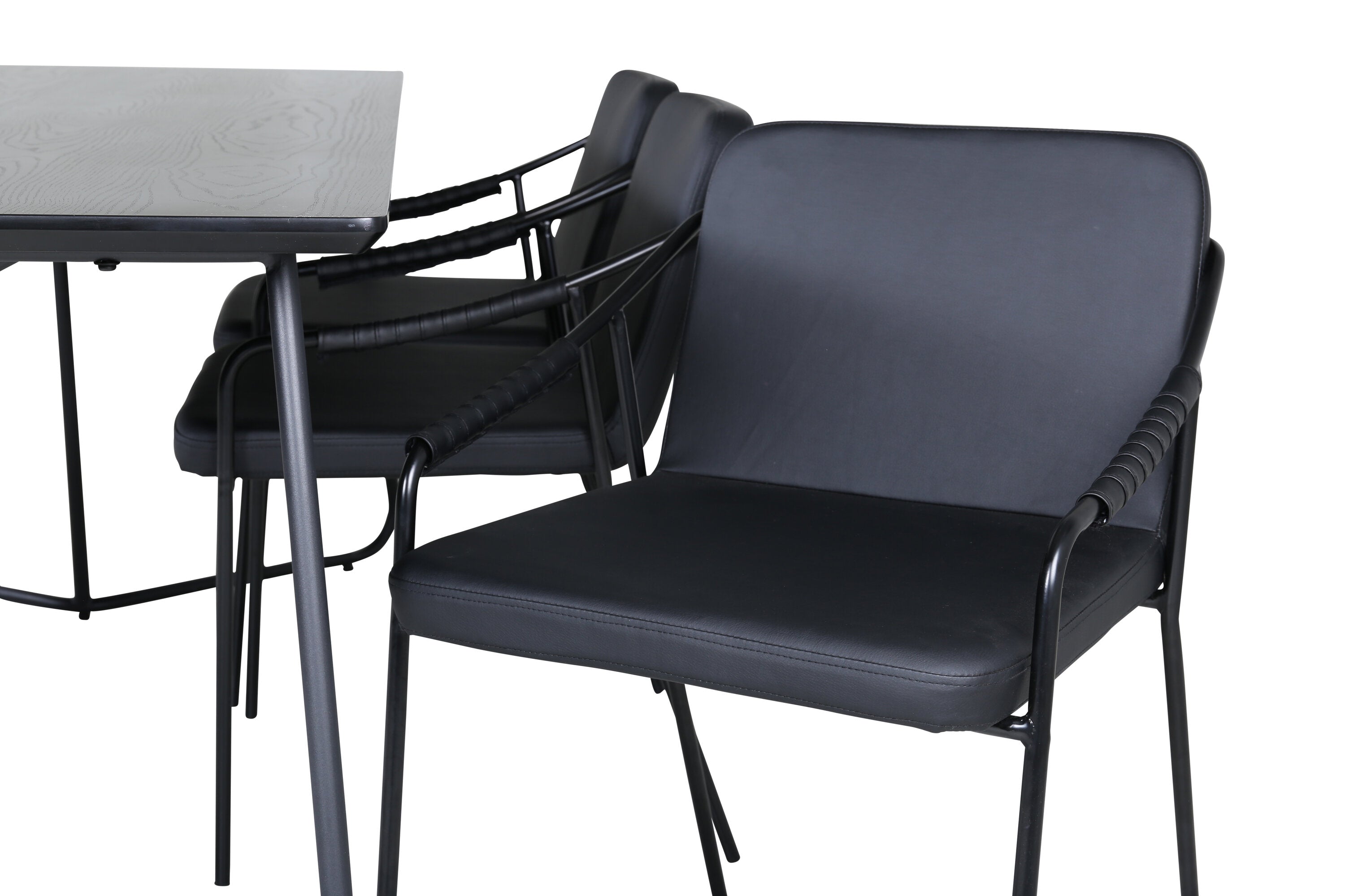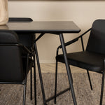Jídelní stůl Petra má promyšlený design se skandinávskými tvary, který působí stylově, úzké, lehce rozšířené nohy ze železa a stolní deska z černé MDF s dýhou. Rozměry stolu: Délka: 190 cm, Šířka: 90 cm, Výška: 75 cm. Zde v dokonalé kombinaci se 6 stylovými jídelními židlemi ze série Dispute. Sedadla jsou v černé umělé kůži a mají integrované područky a nohy židle z černého železa. Rozměry židle: výška: 77 cm, výška sedáku: 48 cm, šířka: 53 cm, hloubka: 59 cm. Luxusní a stylová skupina jídel, která vás zve na dlouhé chvíle večeře!