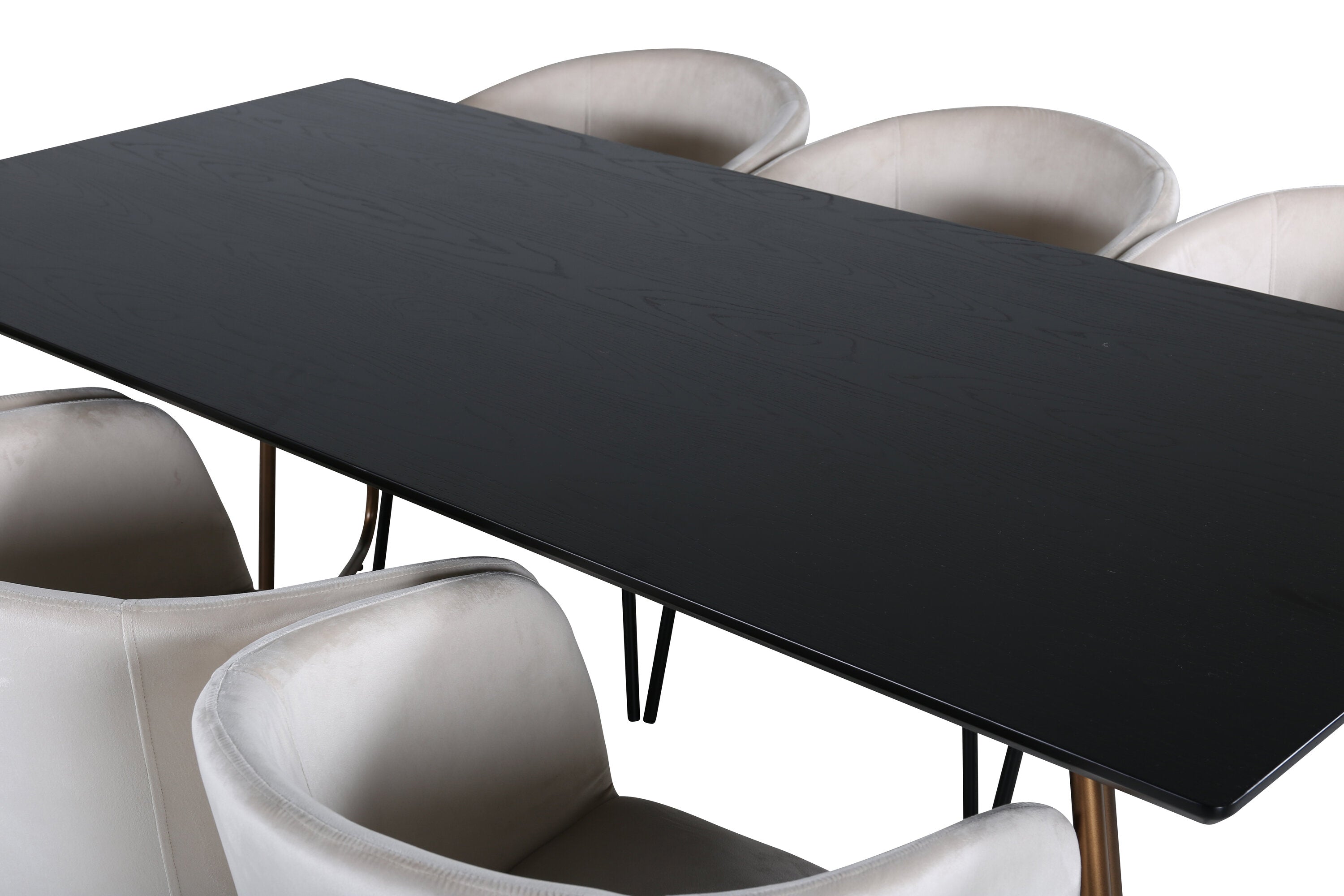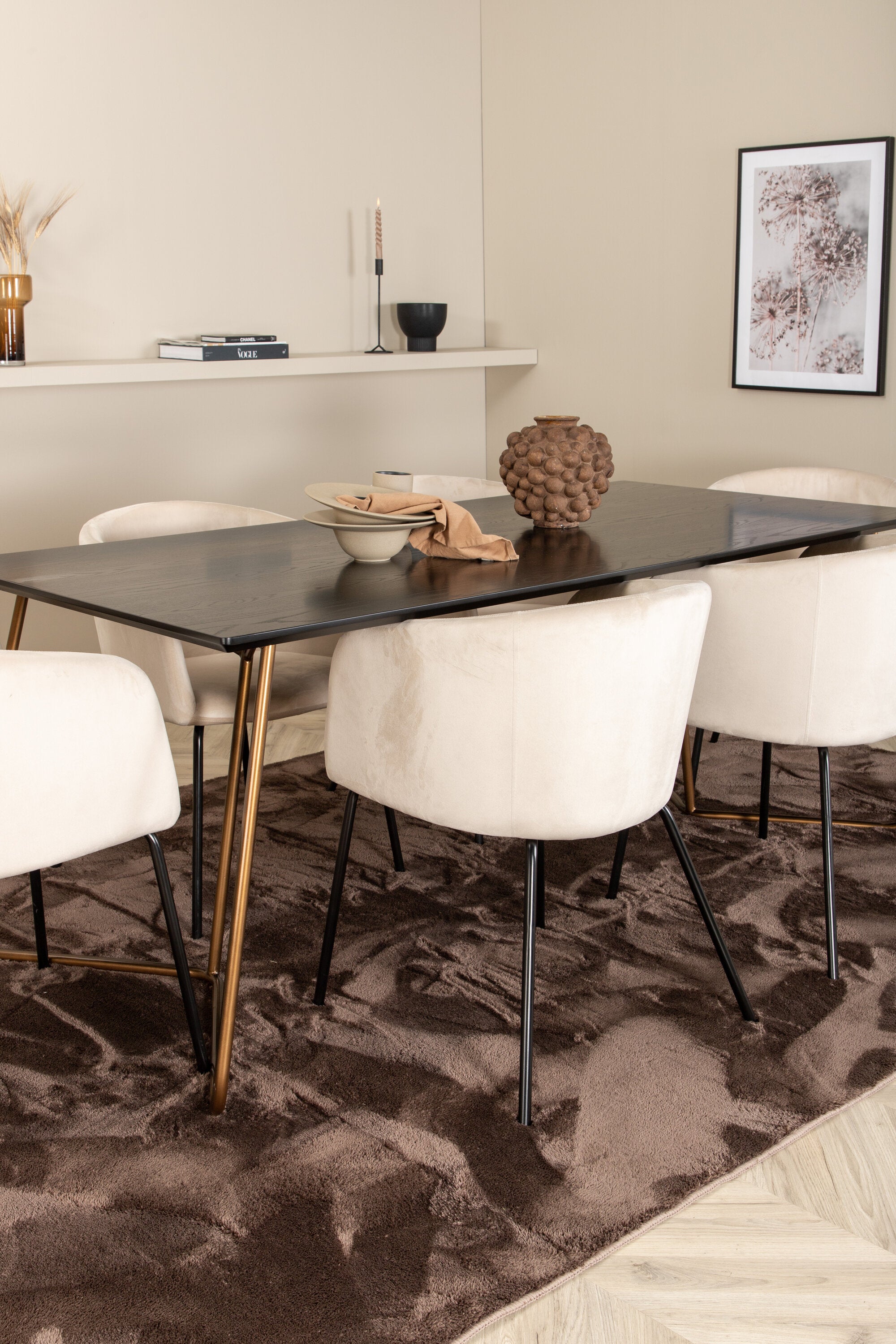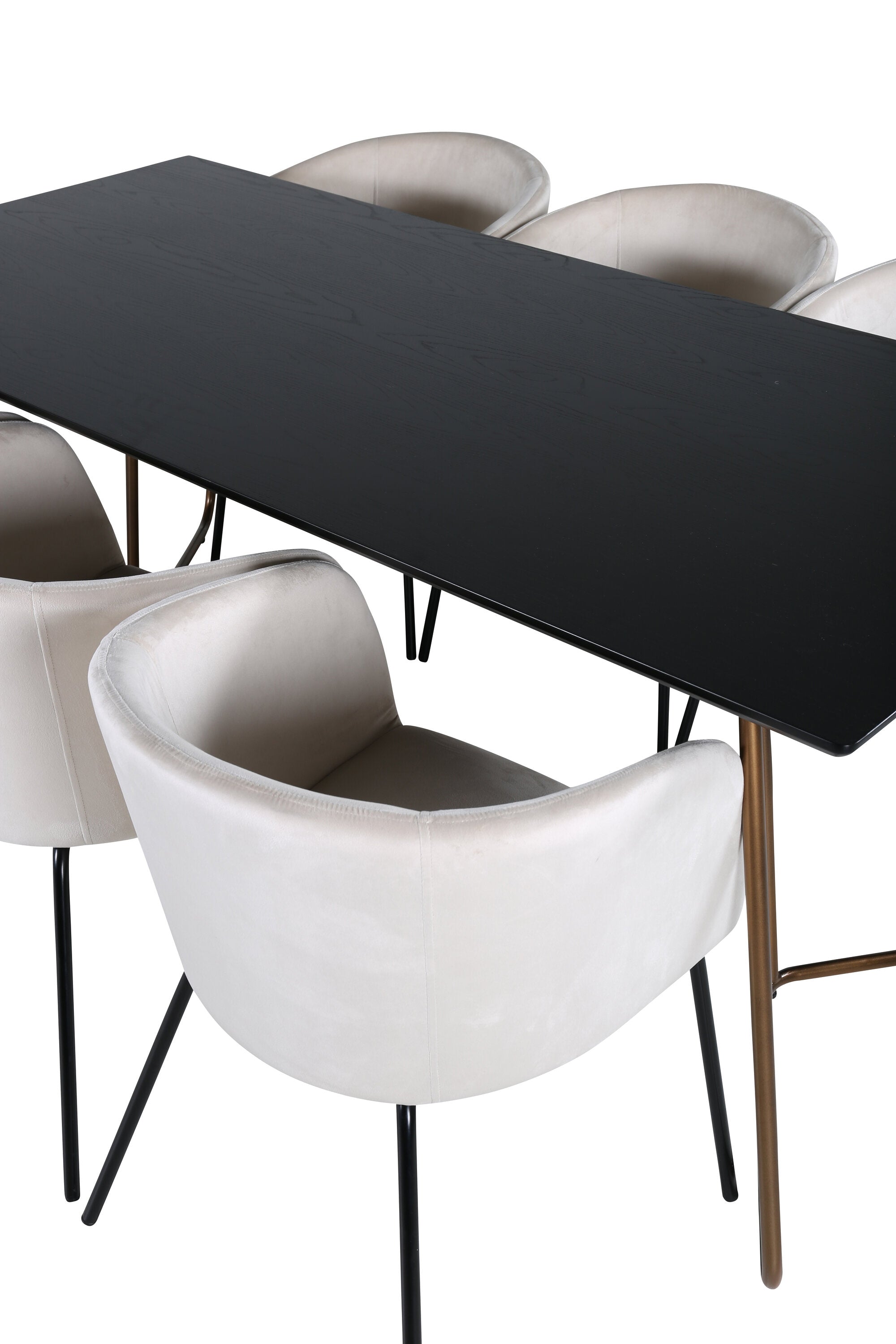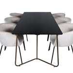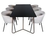 Ponořte se do této příjemné a stylové skupiny jídel na dlouhou večeři s rodinou a přáteli! Jídelní stůl Petra má promyšlený design se skandinávskými tvary, který působí stylově, úzké, lehce rozšířené nohy z měděného železa a stolní deska z černé MDF s dýhou. Rozměry stolu: Délka: 190 cm, Šířka: 90 cm, Výška: 75 cm. Zde v dokonalé kombinaci se 6 pohodlnými jídelními židlemi ze série Berit. Nohy židle jsou z černého železa a plně oblečený sedák z měkké sametové látky. Rozměry židle: výška: 78 cm, výška sedáku: 49 cm, šířka: 55 cm, hloubka: 55 cm. Luxusní a stylová skupina jídel, která vás zve na dlouhé chvíle večeře!