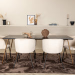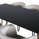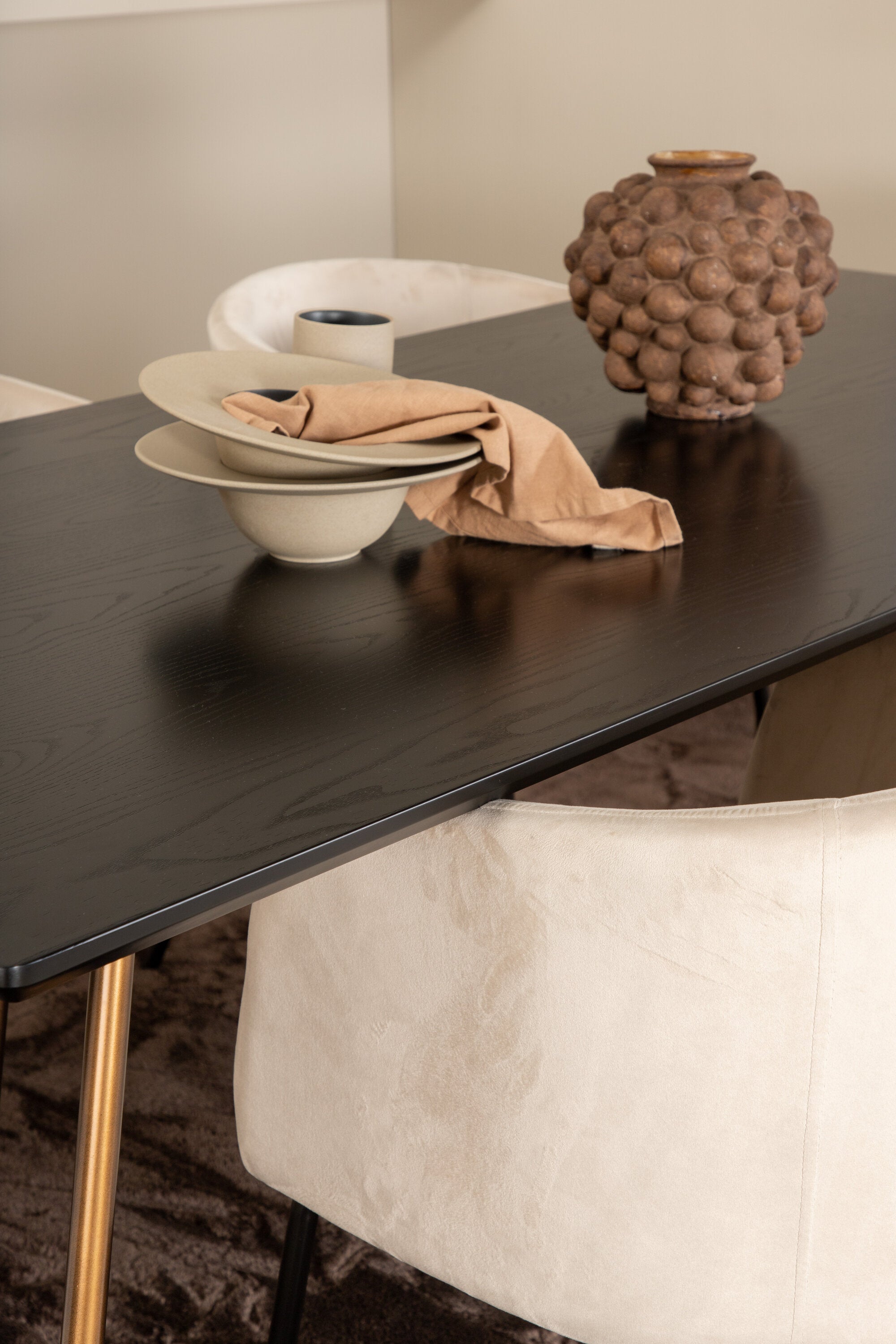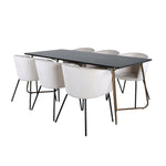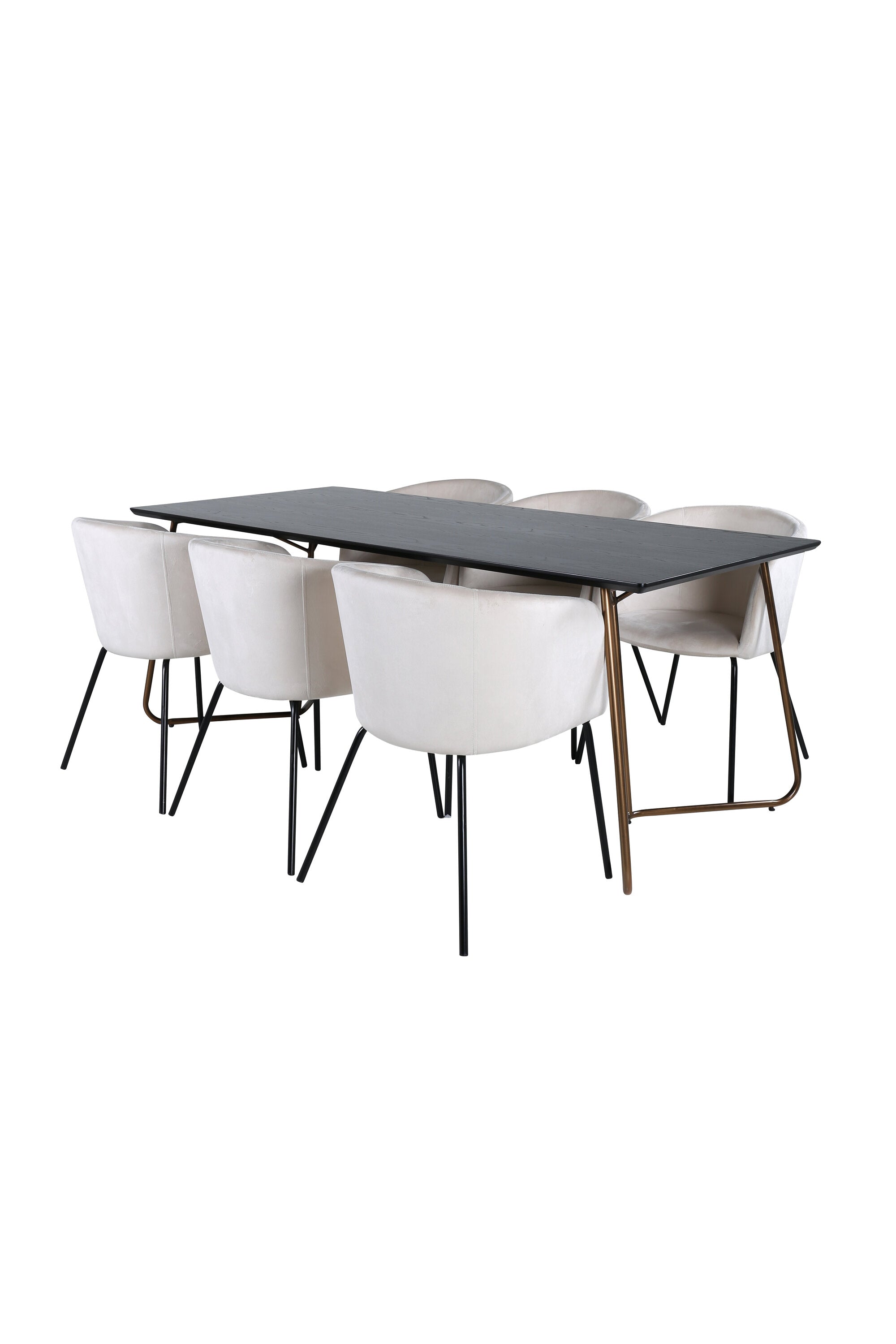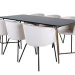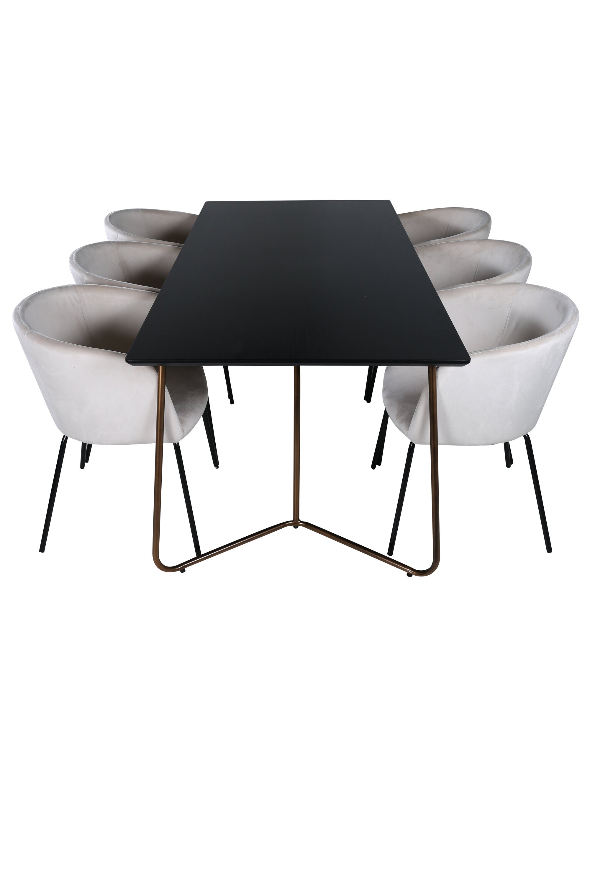Ponořte se do této příjemné a stylové skupiny jídel na dlouhou večeři s rodinou a přáteli! Jídelní stůl Petra má promyšlený design se skandinávskými tvary, který působí stylově, úzké, lehce rozšířené nohy z měděného železa a stolní deska z černé MDF s dýhou. Rozměry stolu: Délka: 190 cm, Šířka: 90 cm, Výška: 75 cm. Zde v dokonalé kombinaci se 6 pohodlnými jídelními židlemi ze série Berit. Nohy židle jsou z černého železa a plně oblečený sedák z měkké sametové látky. Rozměry židle: výška: 78 cm, výška sedáku: 49 cm, šířka: 55 cm, hloubka: 55 cm. Luxusní a stylová skupina jídel, která vás zve na dlouhé chvíle večeře!