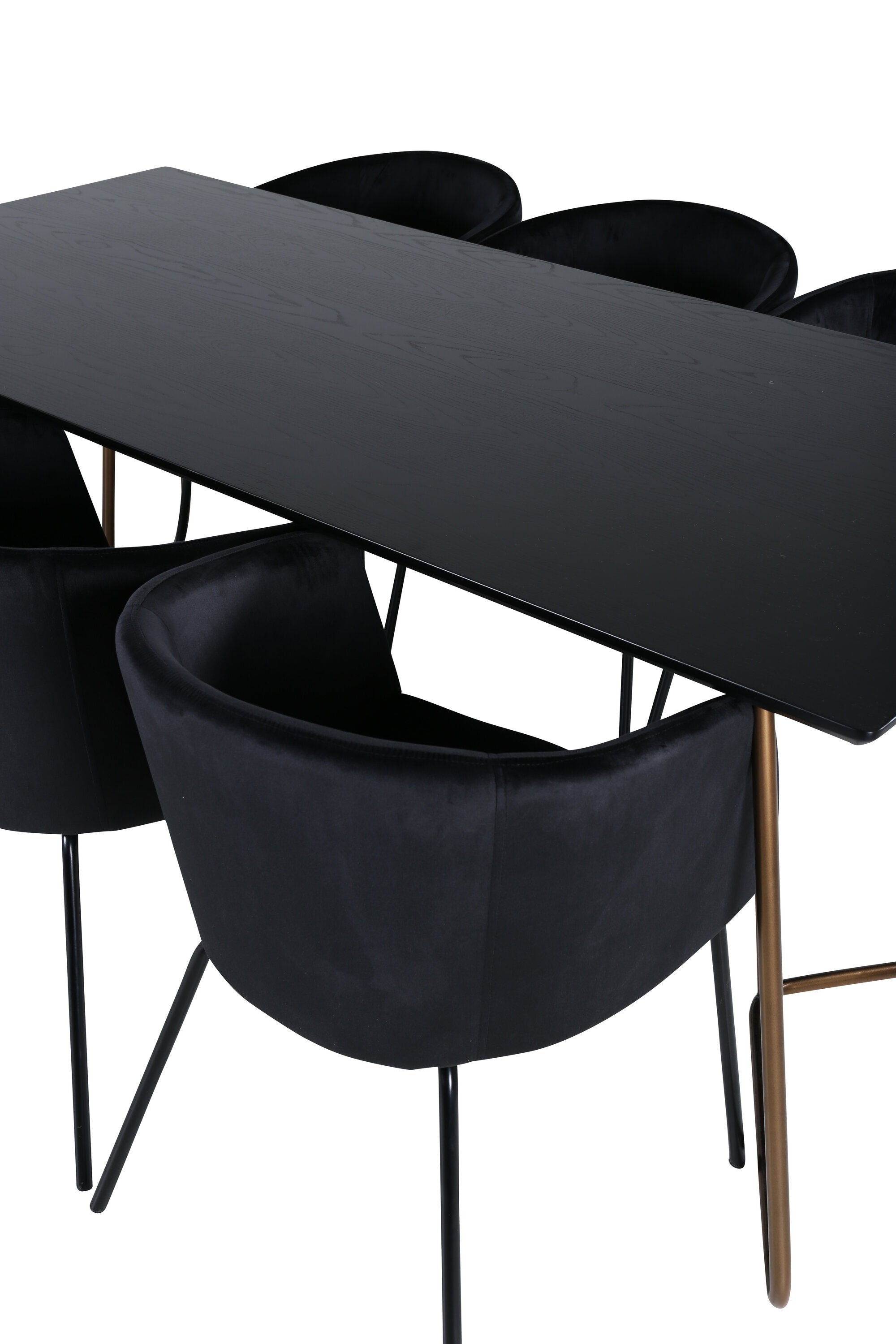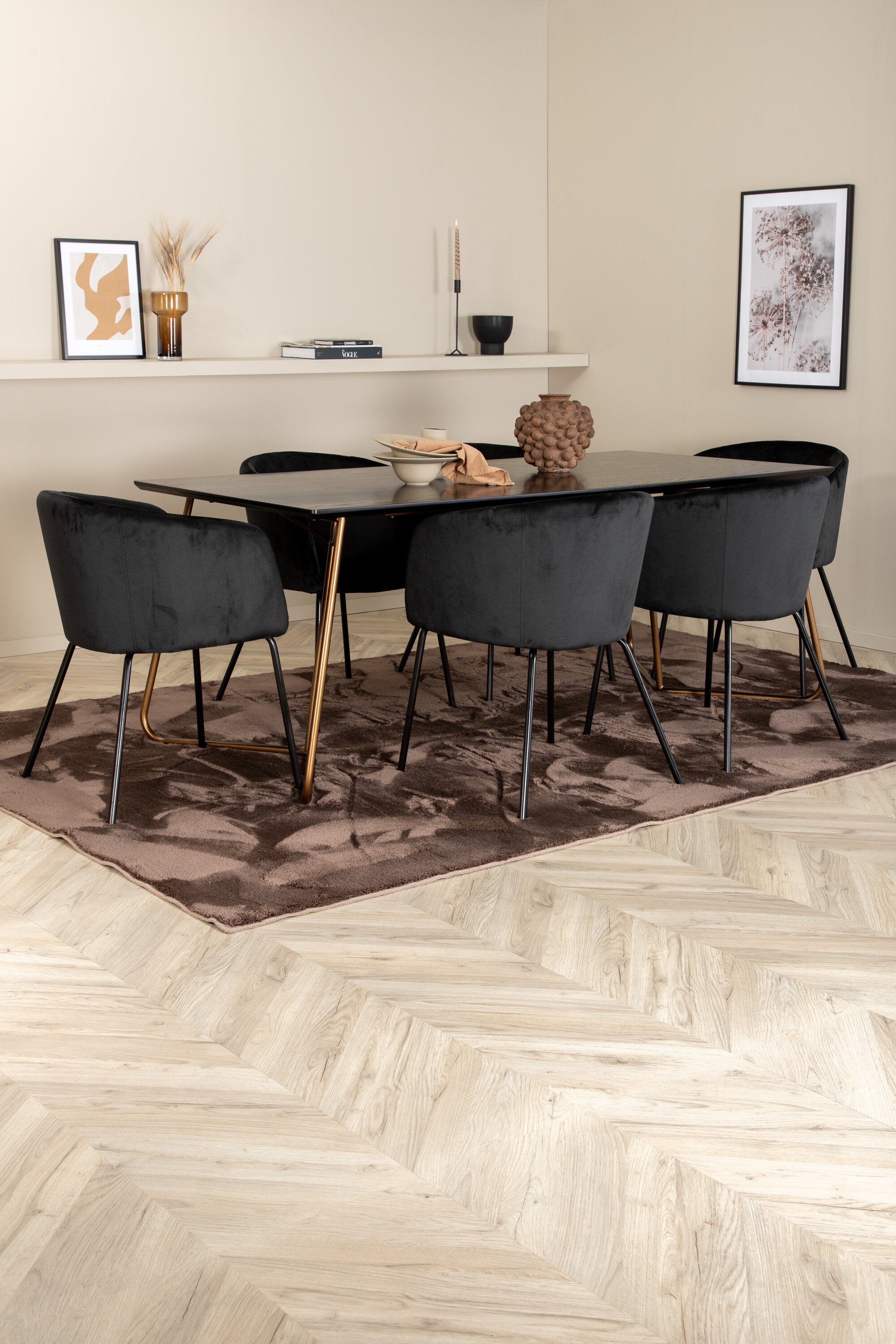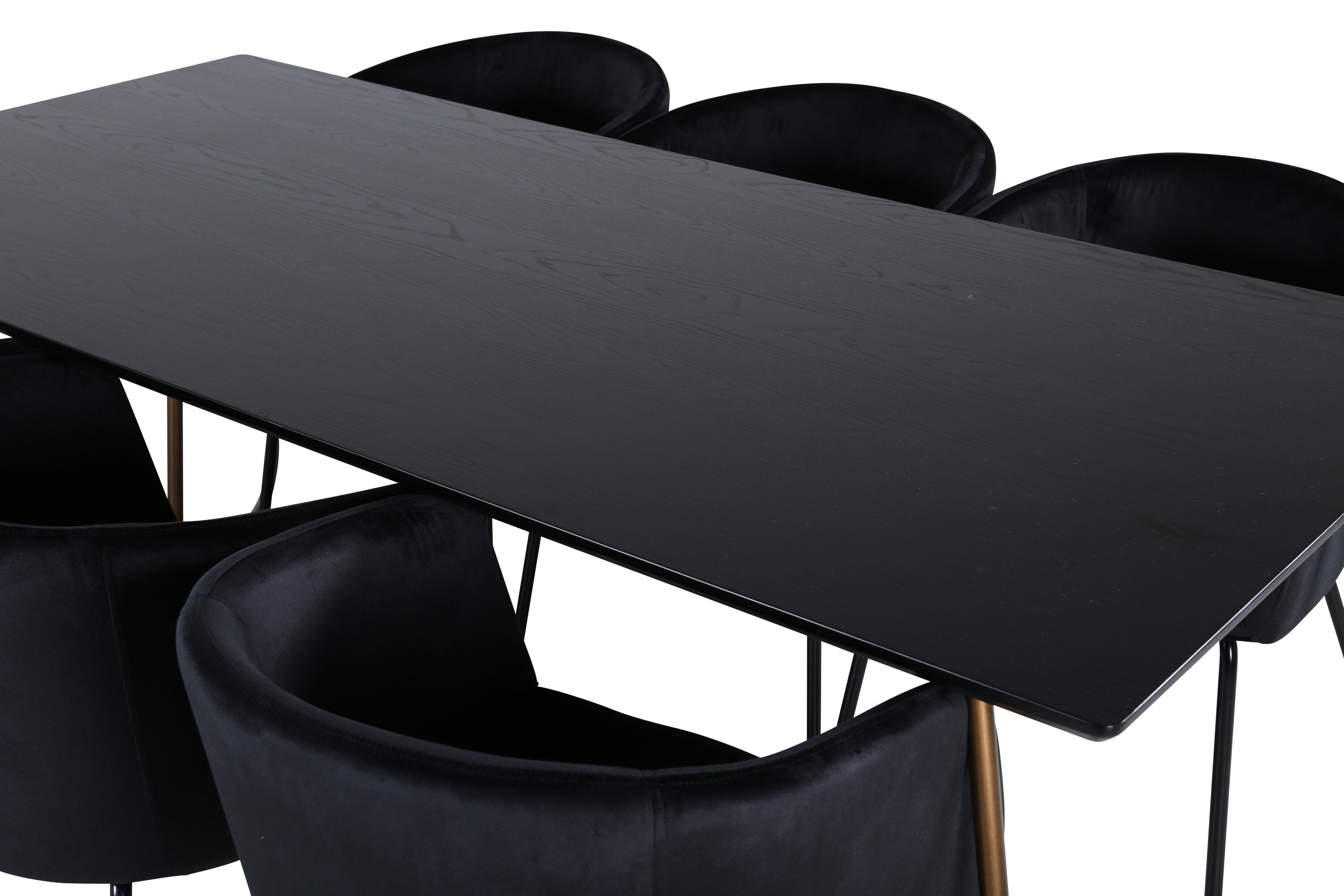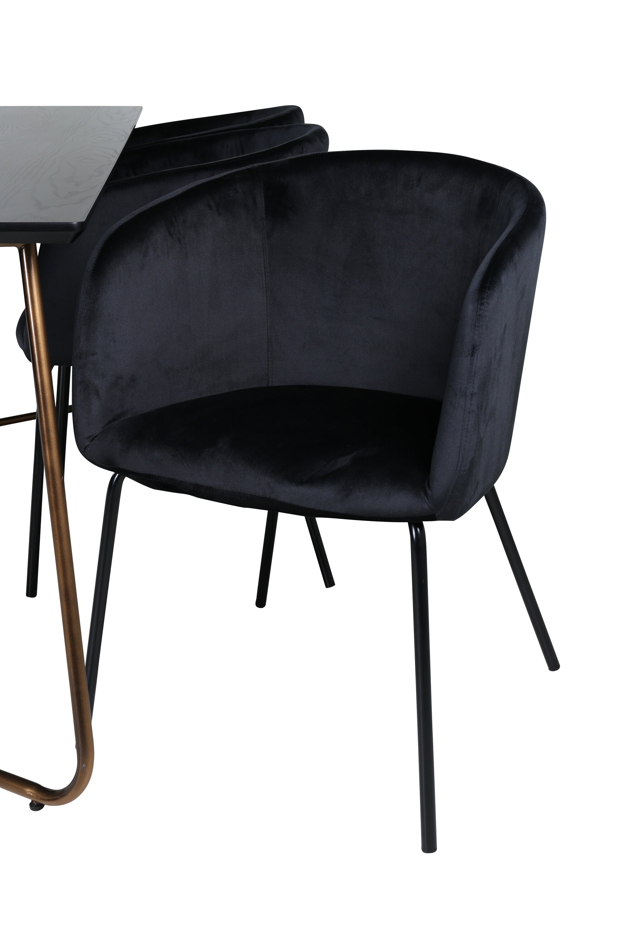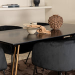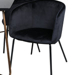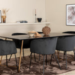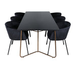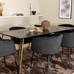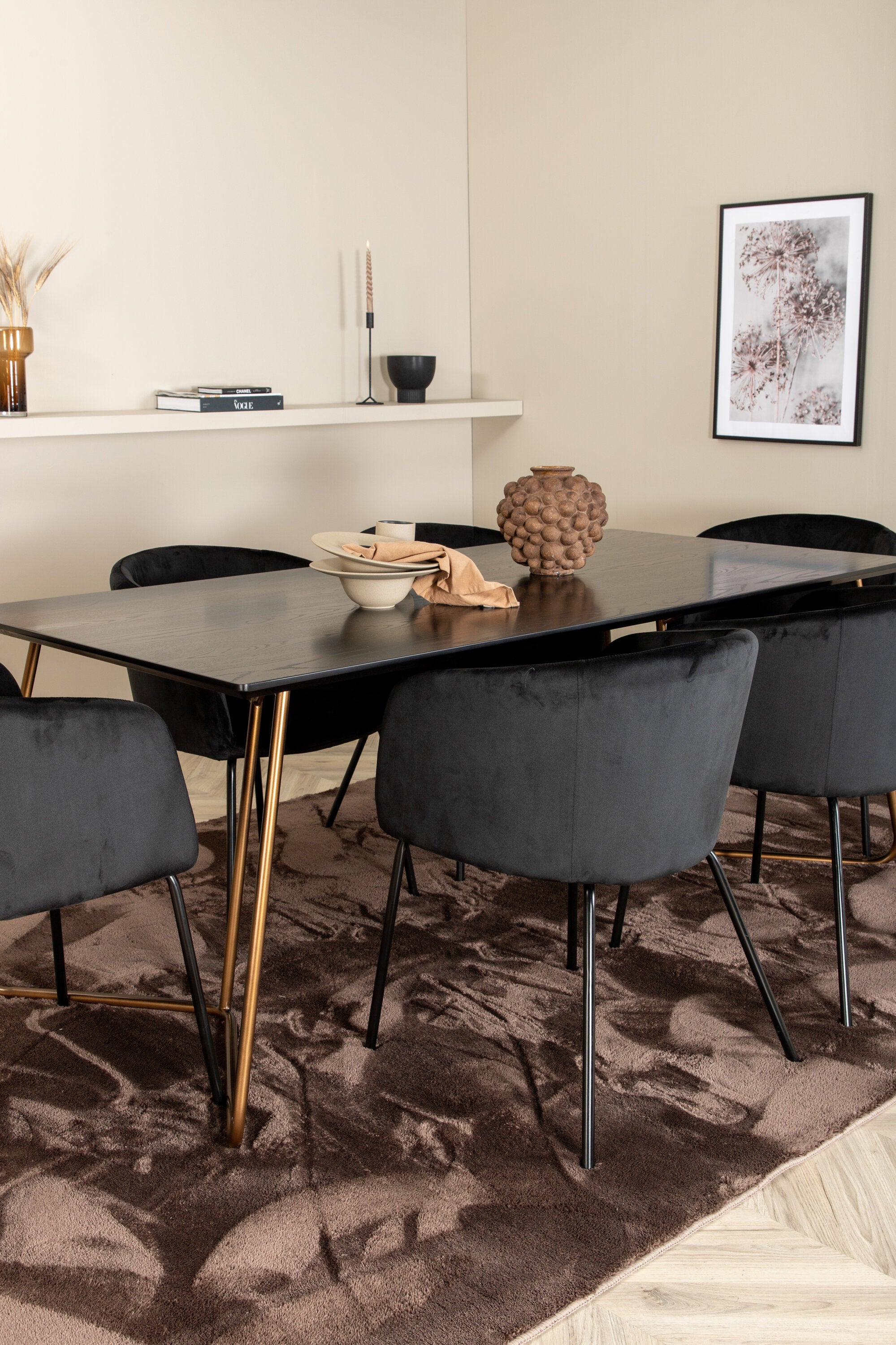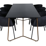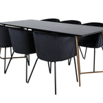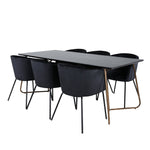 Ponořte se do této příjemné a stylové skupiny jídel na dlouhou večeři s rodinou a přáteli! Jídelní stůl Petra má promyšlený design se skandinávskými tvary, který působí stylově, úzké, lehce rozšířené nohy z měděného železa a stolní deska z černé MDF s dýhou. Rozměry stolu: Délka: 190 cm, Šířka: 90 cm, Výška: 75 cm. Zde v dokonalé kombinaci s pohodlnými jídelními židlemi ze série Berit. Nohy židle jsou z černého železa a plně oblečený sedák z měkké sametové látky. Rozměry židle: výška: 78 cm, výška sedáku: 49 cm, šířka: 55 cm, hloubka: 55 cm. Luxusní a stylová skupina jídel, která vás zve na dlouhé chvíle večeře!