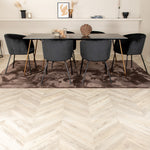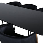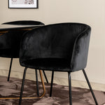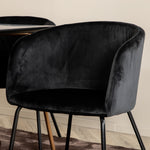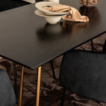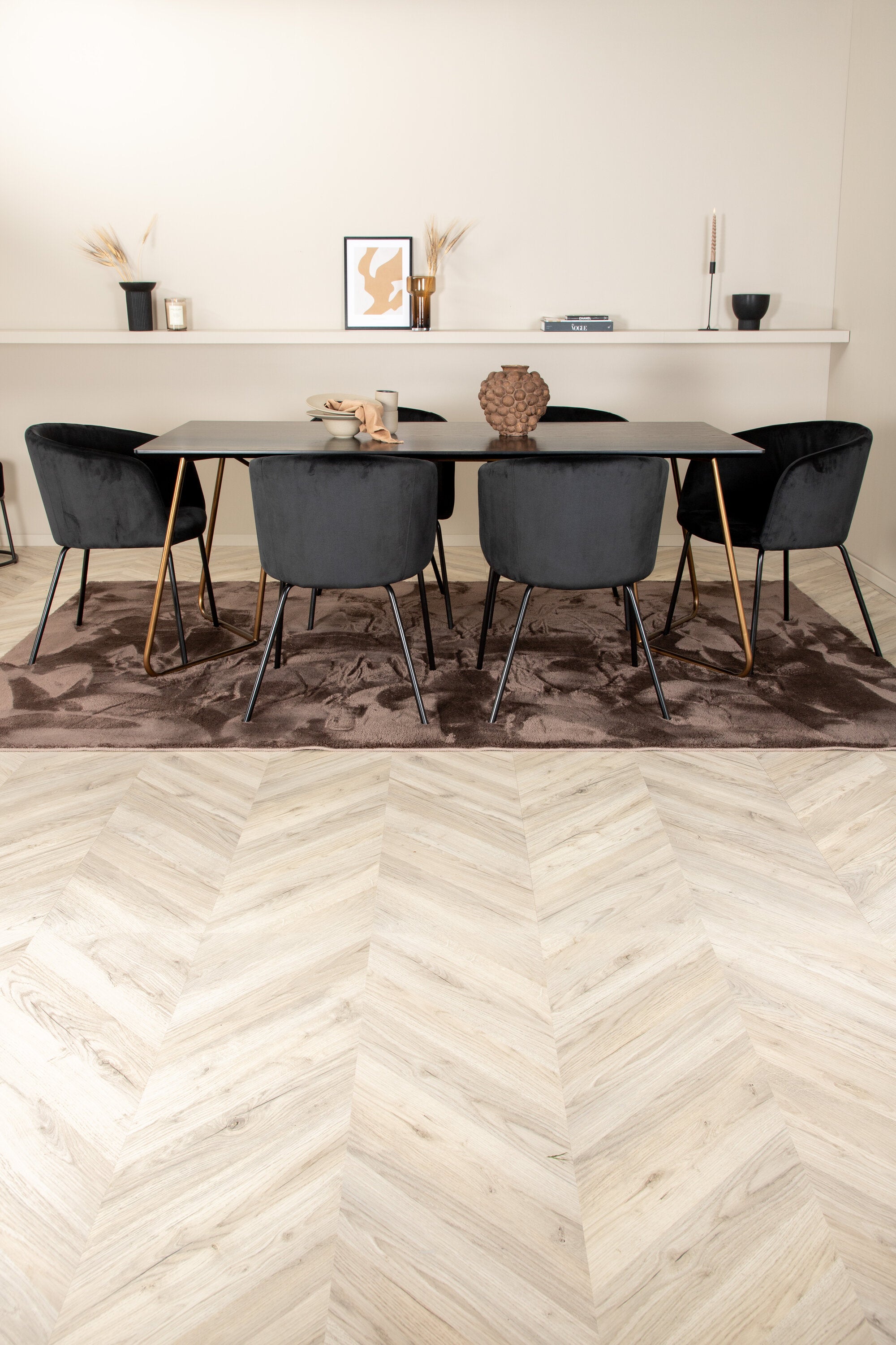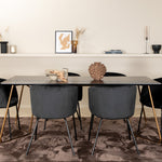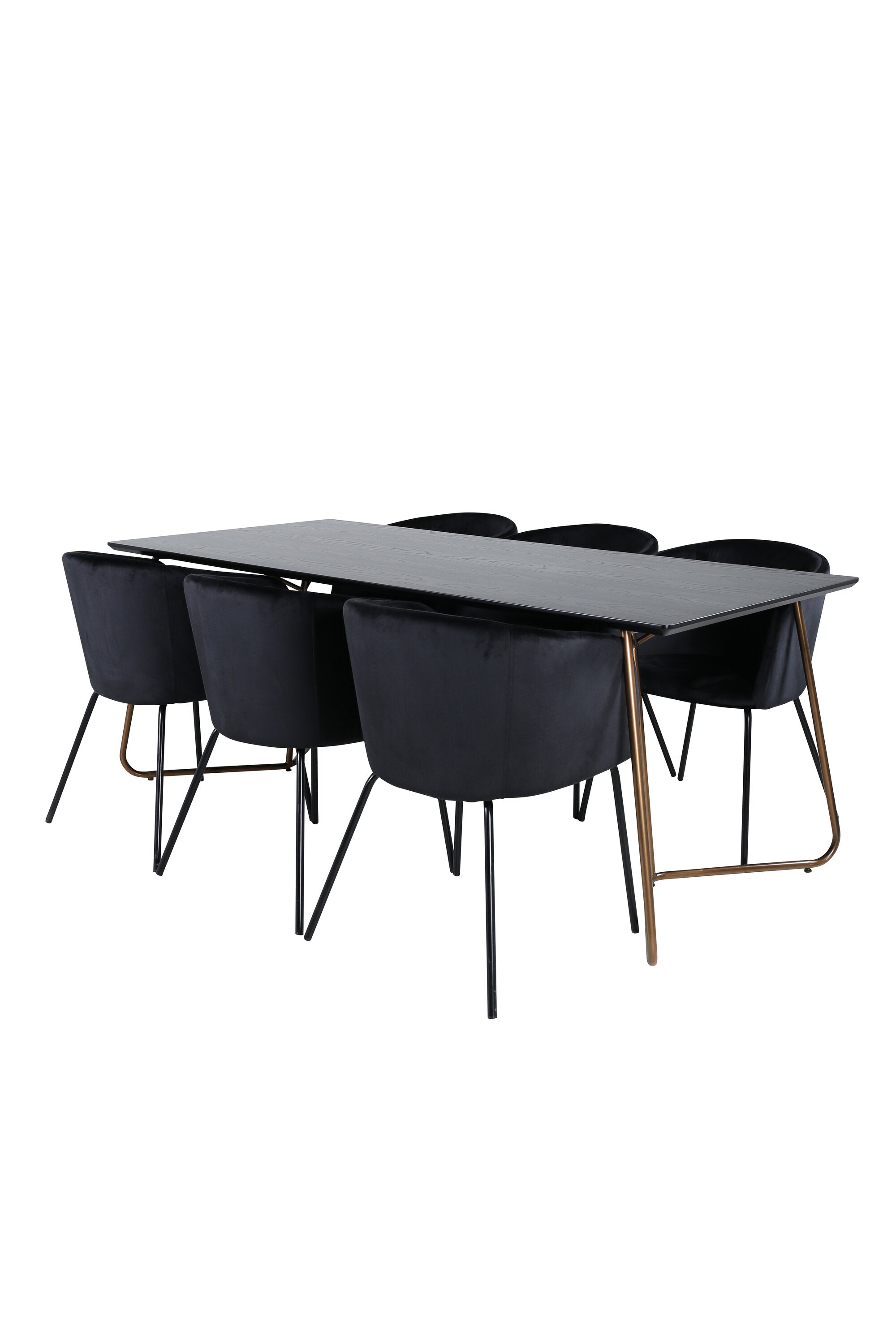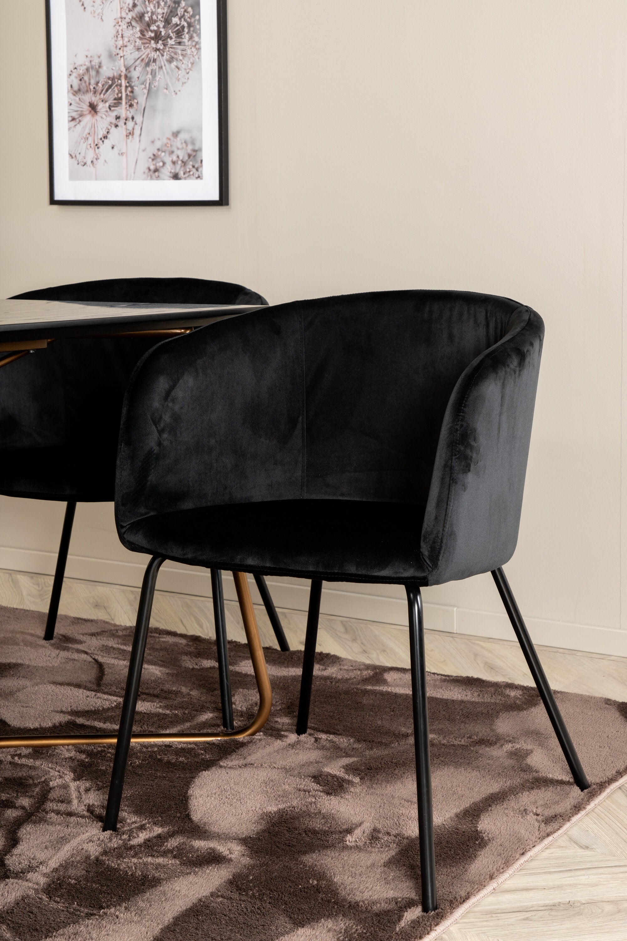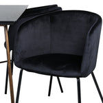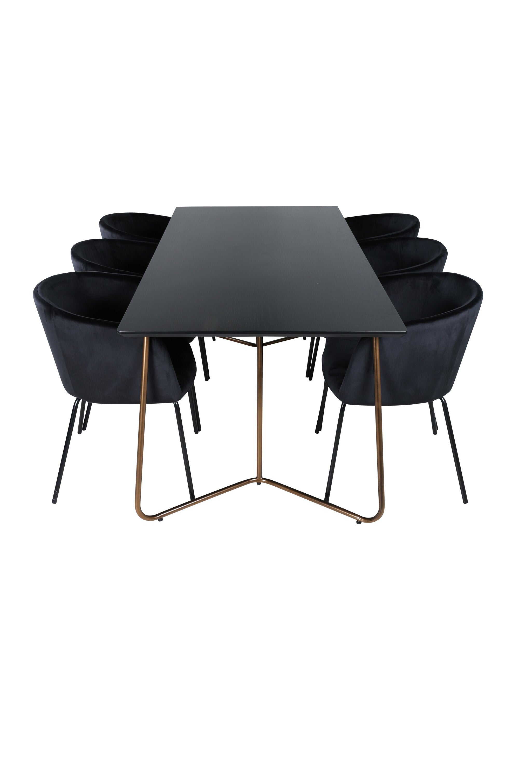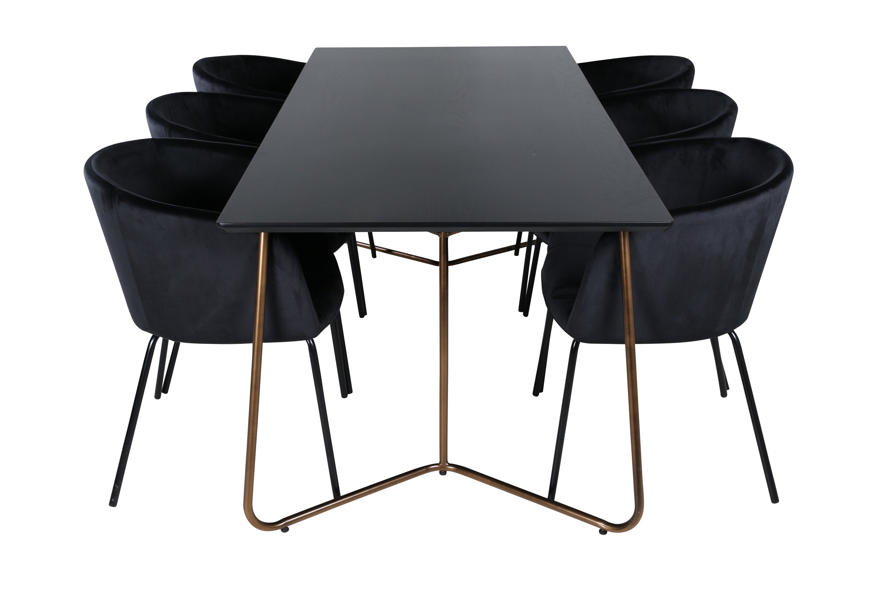 Ponořte se do této příjemné a stylové skupiny jídel na dlouhou večeři s rodinou a přáteli! Jídelní stůl Petra má promyšlený design se skandinávskými tvary, který působí stylově, úzké, lehce rozšířené nohy z měděného železa a stolní deska z černé MDF s dýhou. Rozměry stolu: Délka: 190 cm, Šířka: 90 cm, Výška: 75 cm. Zde v dokonalé kombinaci s pohodlnými jídelními židlemi ze série Berit. Nohy židle jsou z černého železa a plně oblečený sedák z měkké sametové látky. Rozměry židle: výška: 78 cm, výška sedáku: 49 cm, šířka: 55 cm, hloubka: 55 cm. Luxusní a stylová skupina jídel, která vás zve na dlouhé chvíle večeře!