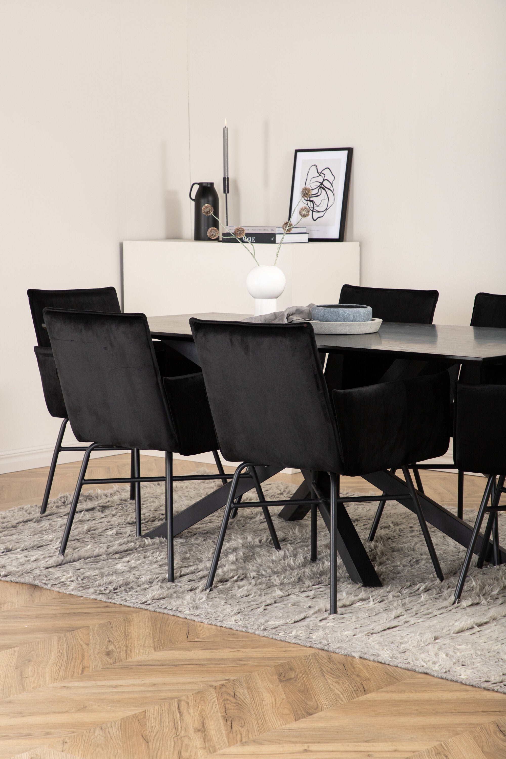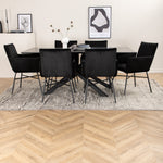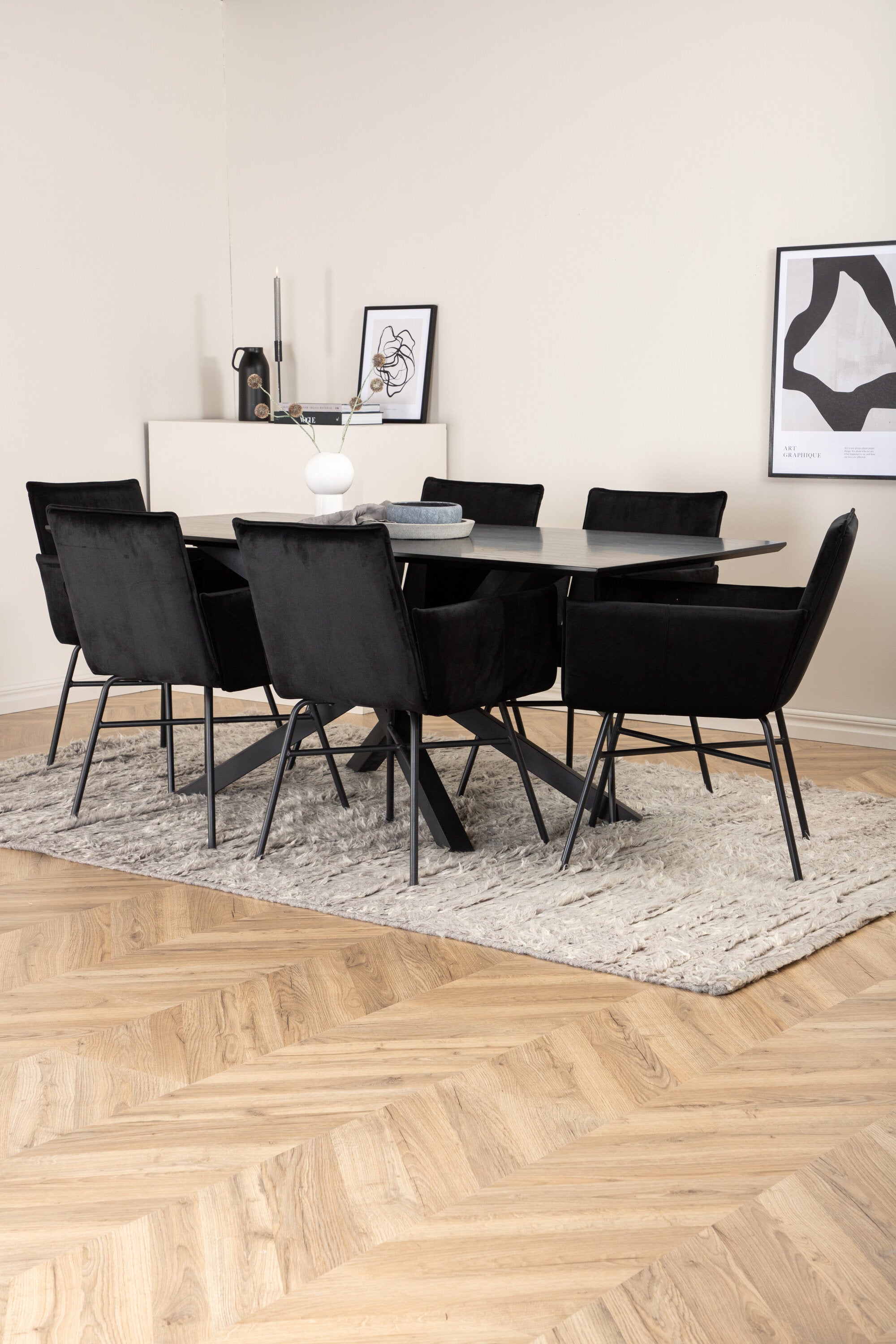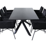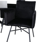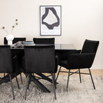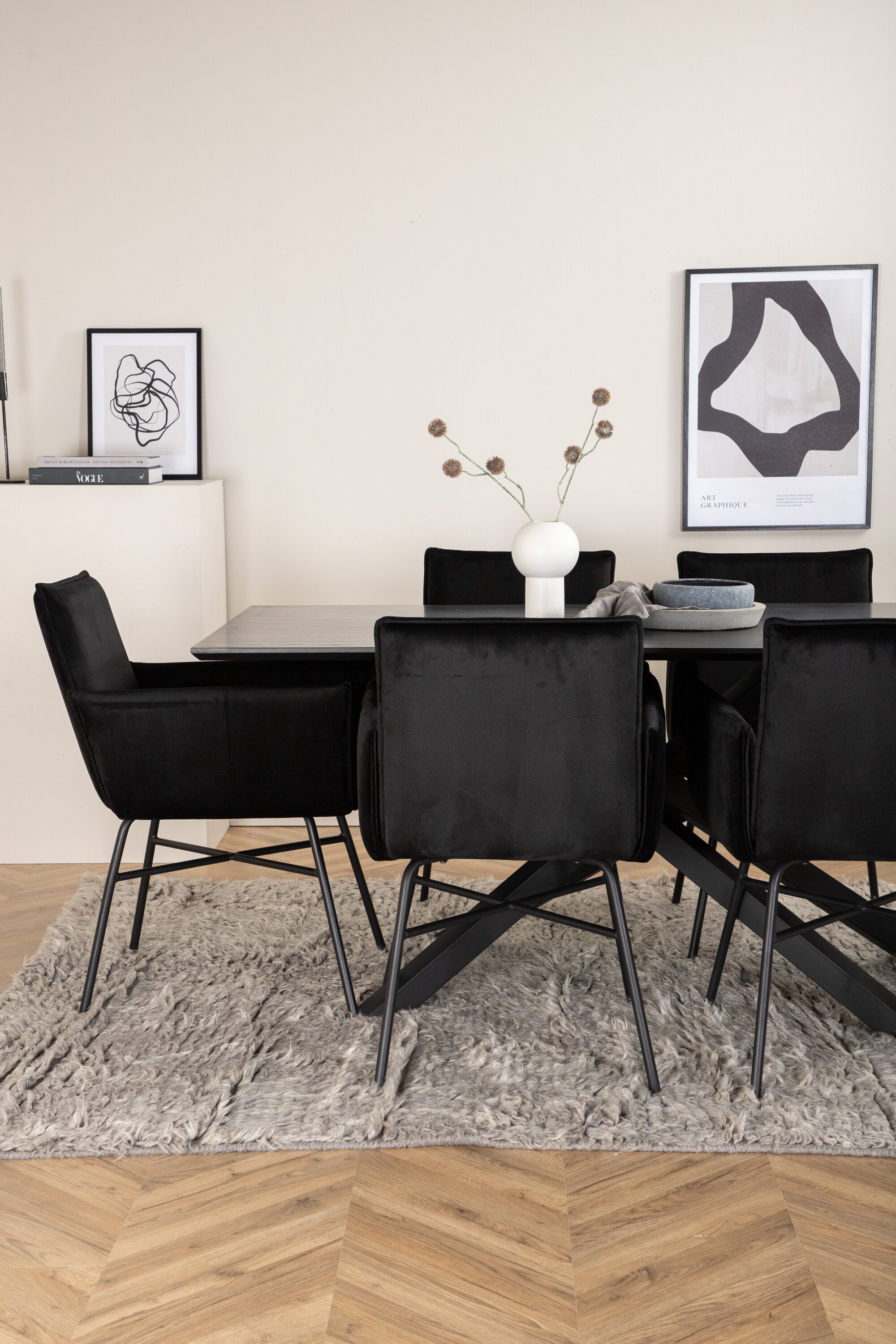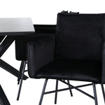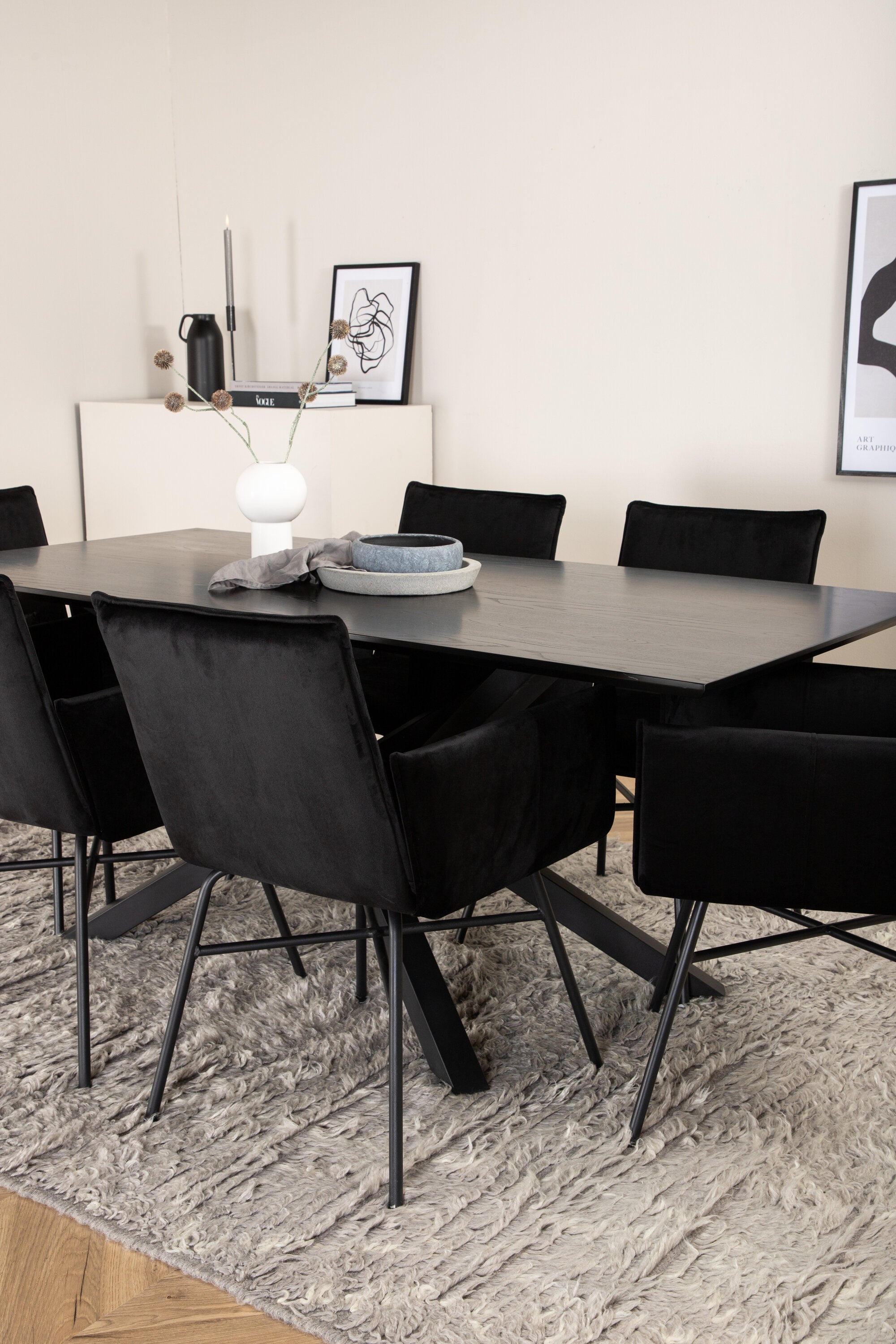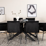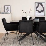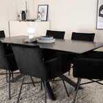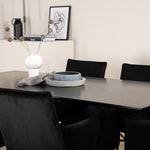 Stylové, pohodlné a elegantní – co víc si přát? Piazza je náš oblíbený obdélníkový jídelní stůl s luxusním dojmem a trendy detaily v designu. Deska stolu je vyrobena z MDF dýhy v mazané černé barvě a korpus tvoří pevný poutač s příčnými nohami z černého železa. Zde společně s našimi lahodnými jídelními židlemi Petra. Židle mají pohodlnou hloubku sedáku, nohy židle jsou stylově úzké ze železa a sedák je z černé sametové látky, která místnosti dodává pěkný lesk. Užijte si příjemná jídla dopředu!