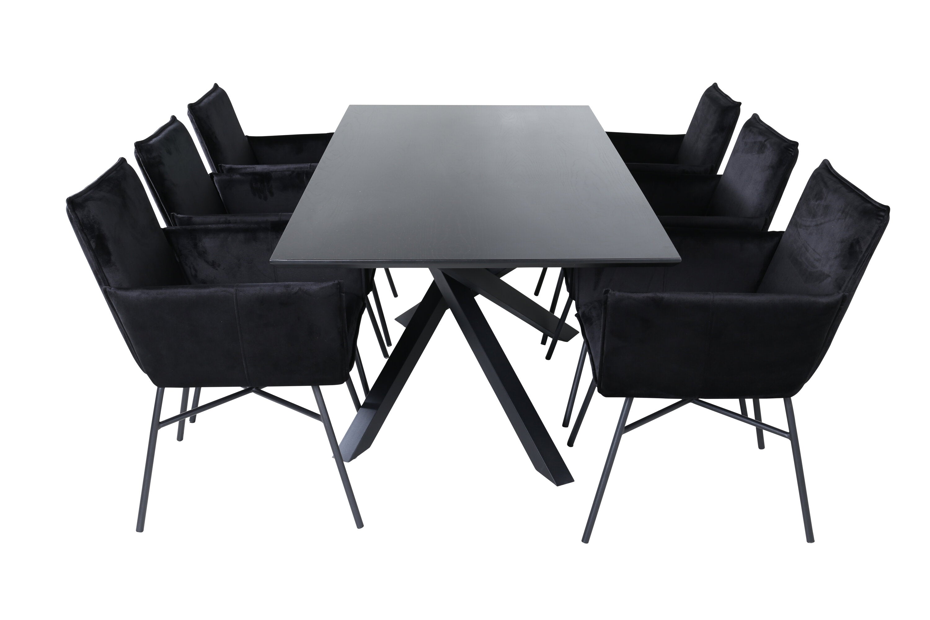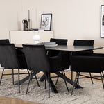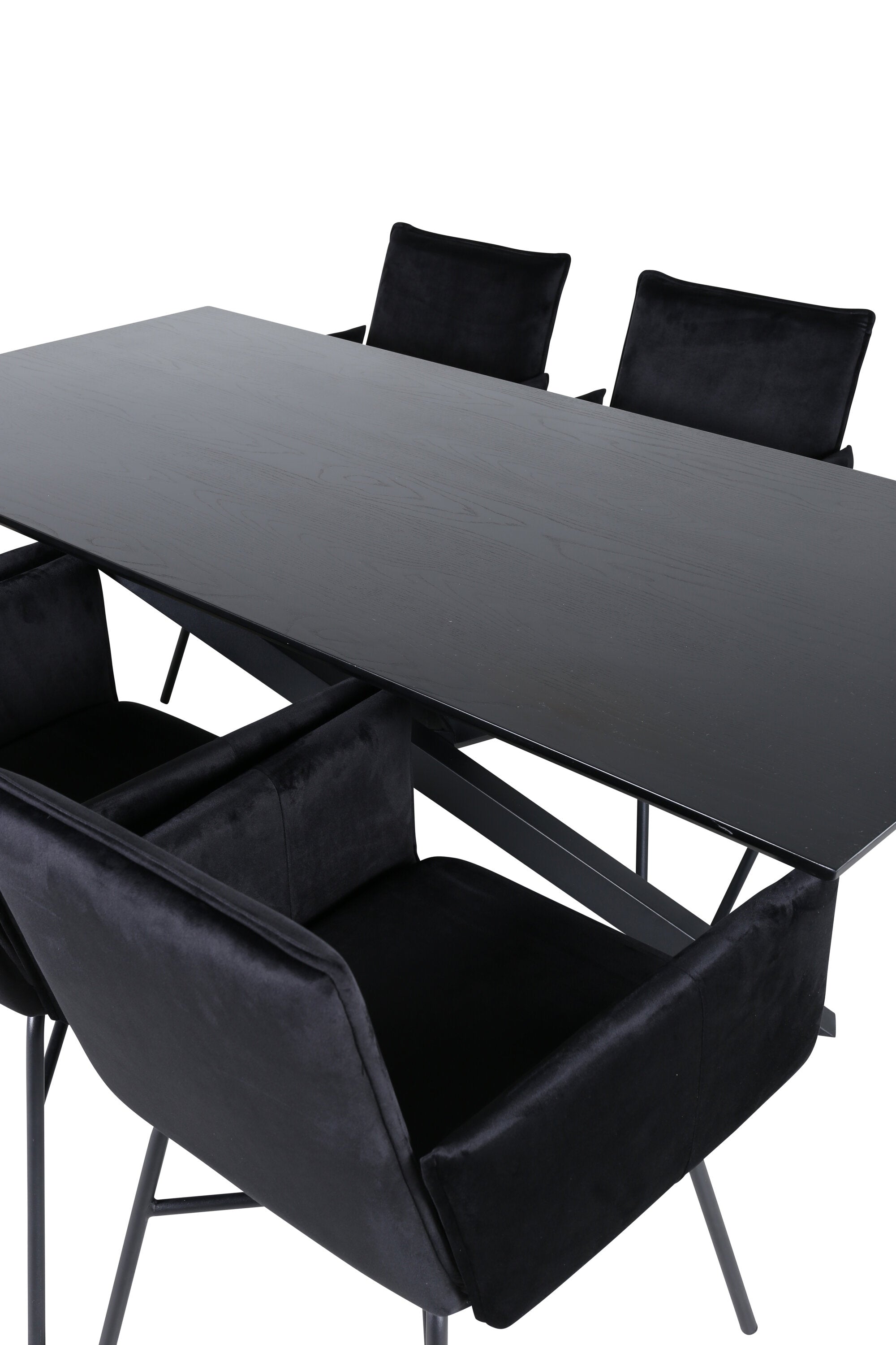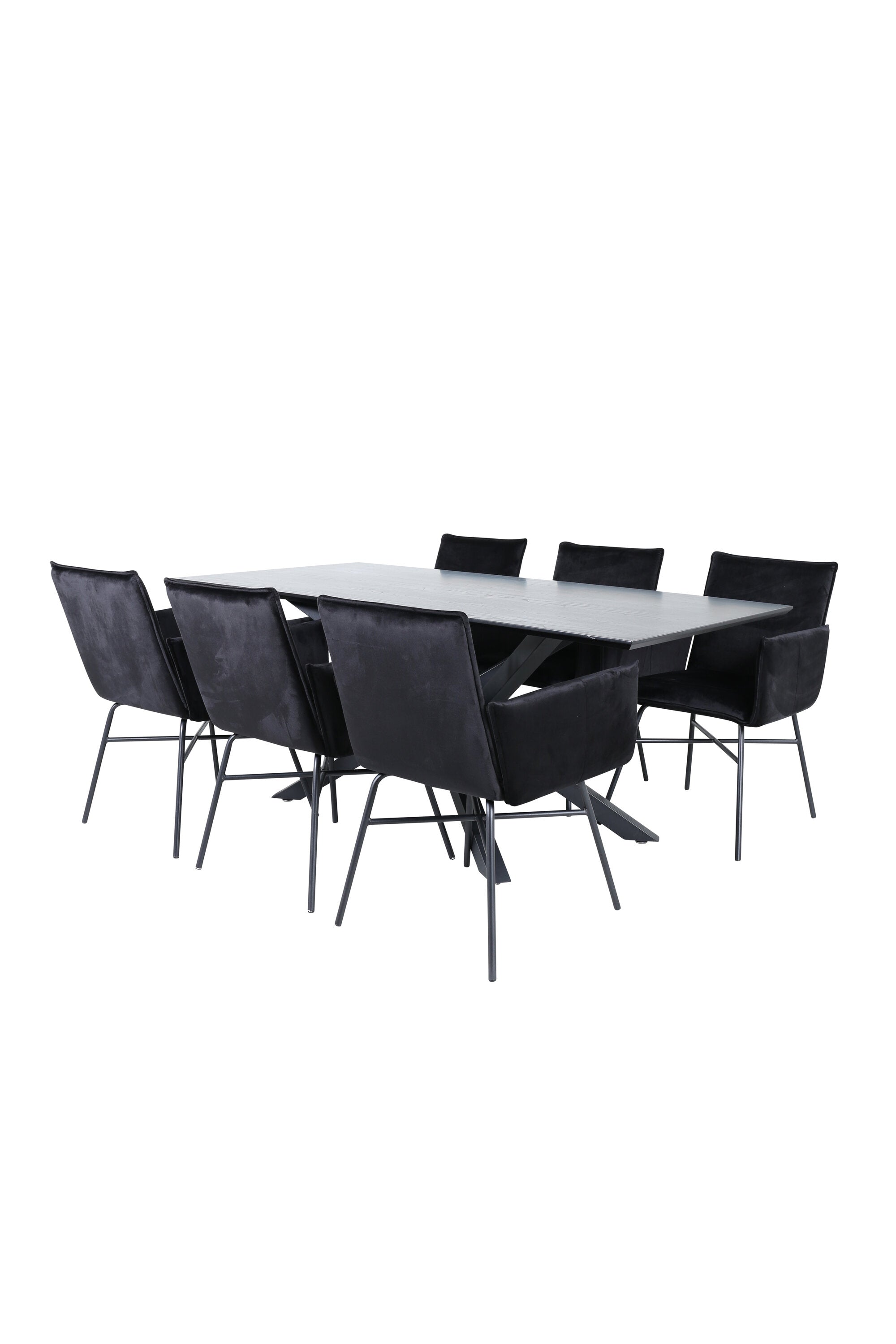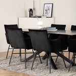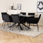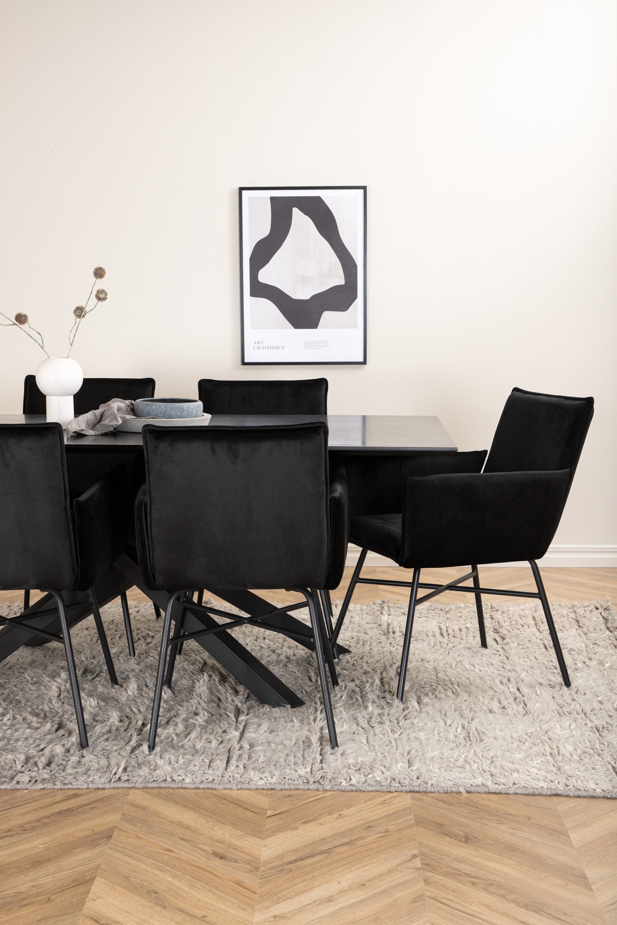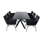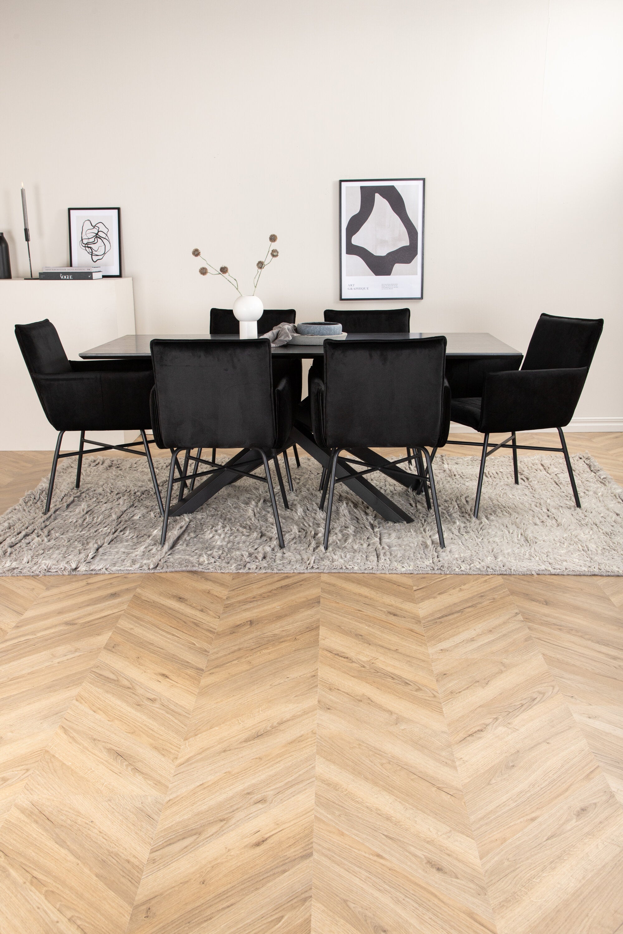 Stylové, pohodlné a elegantní – co víc si přát? Piazza je náš oblíbený obdélníkový jídelní stůl s luxusním dojmem a trendy detaily v designu. Deska stolu je vyrobena z MDF dýhy v mazané černé barvě a korpus tvoří pevný poutač s příčnými nohami z černého železa. Zde společně s našimi lahodnými jídelními židlemi Petra. Židle mají pohodlnou hloubku sedáku, nohy židle jsou stylově úzké ze železa a sedák je z černé sametové látky, která místnosti dodává pěkný lesk. Užijte si příjemná jídla dopředu!