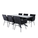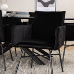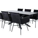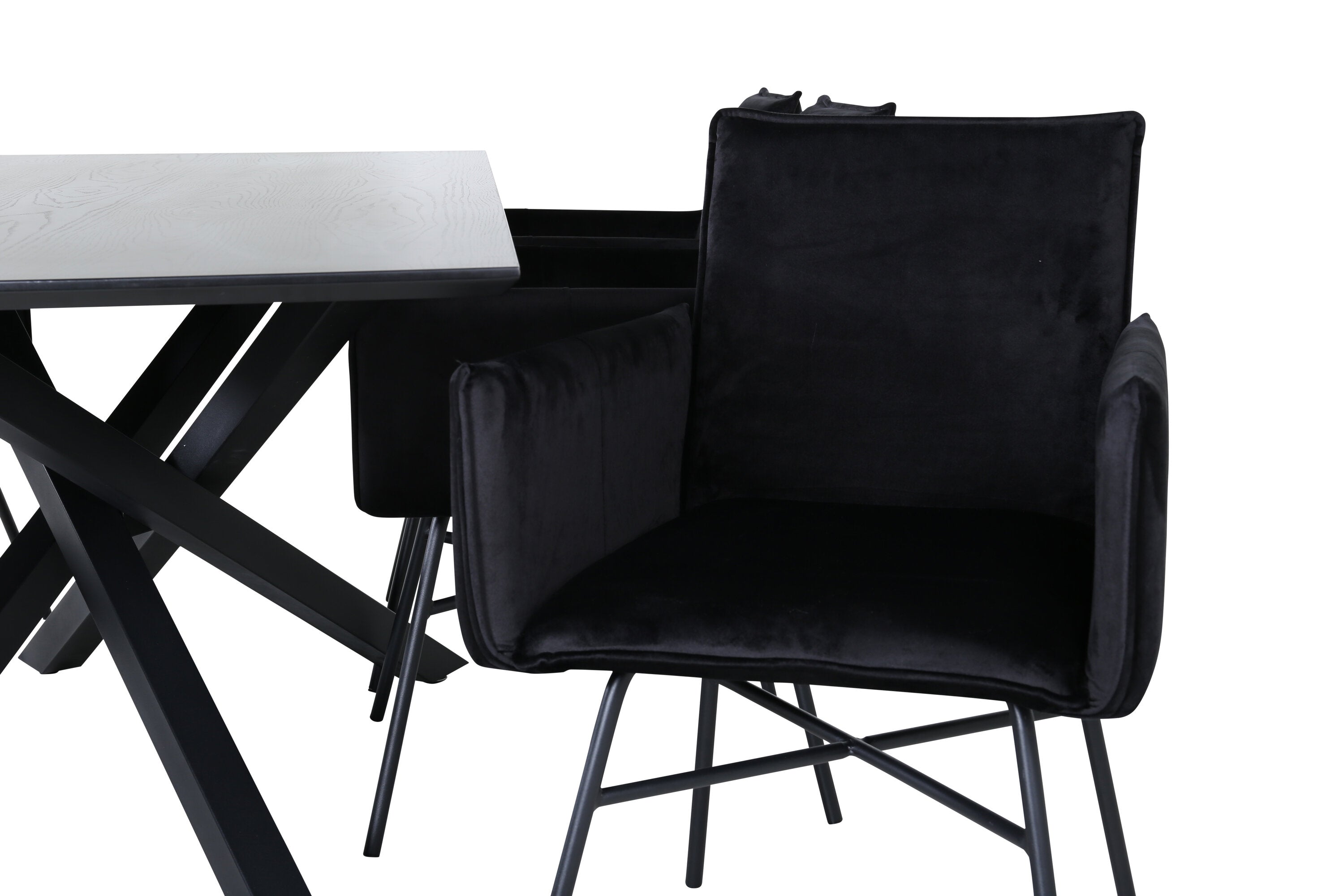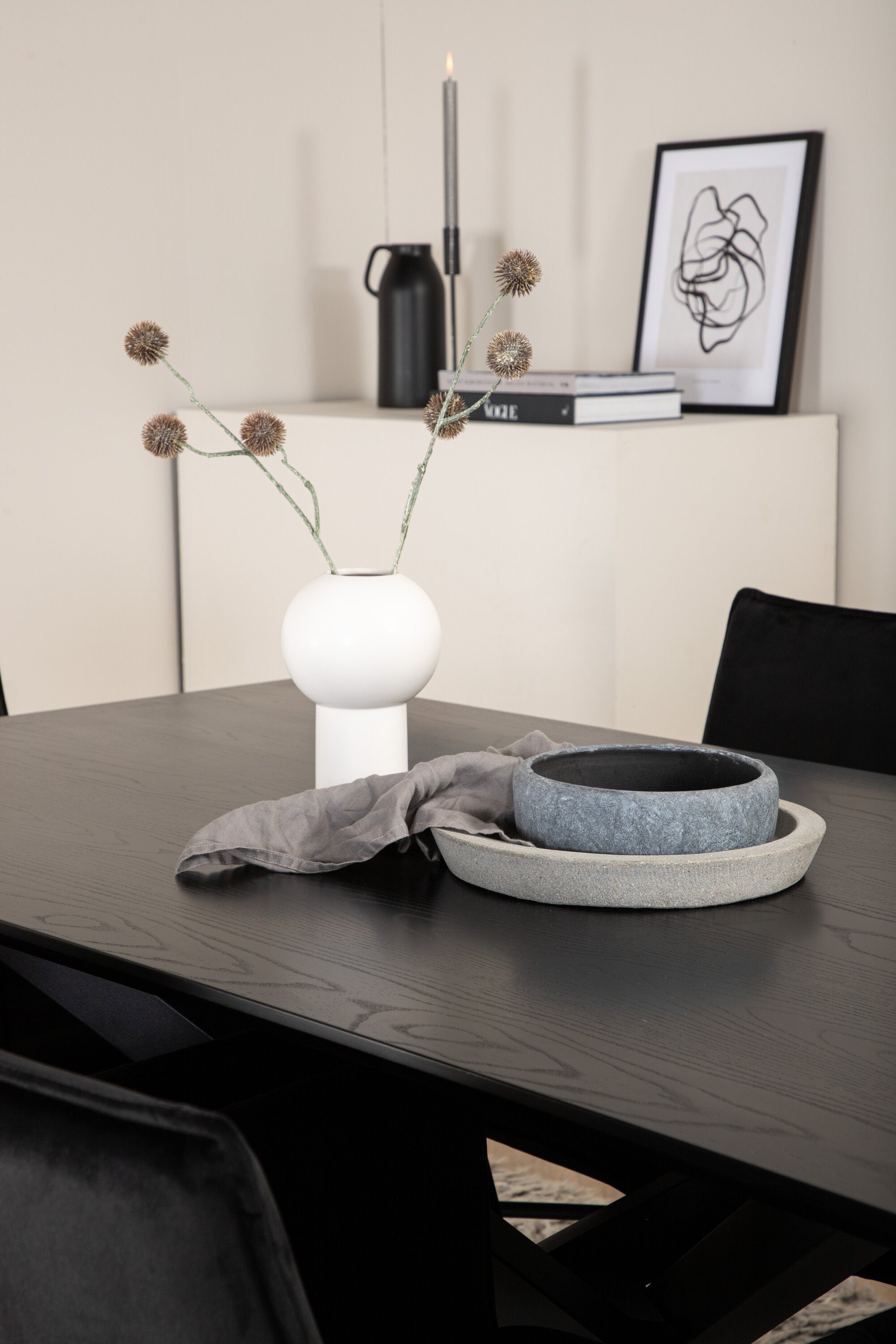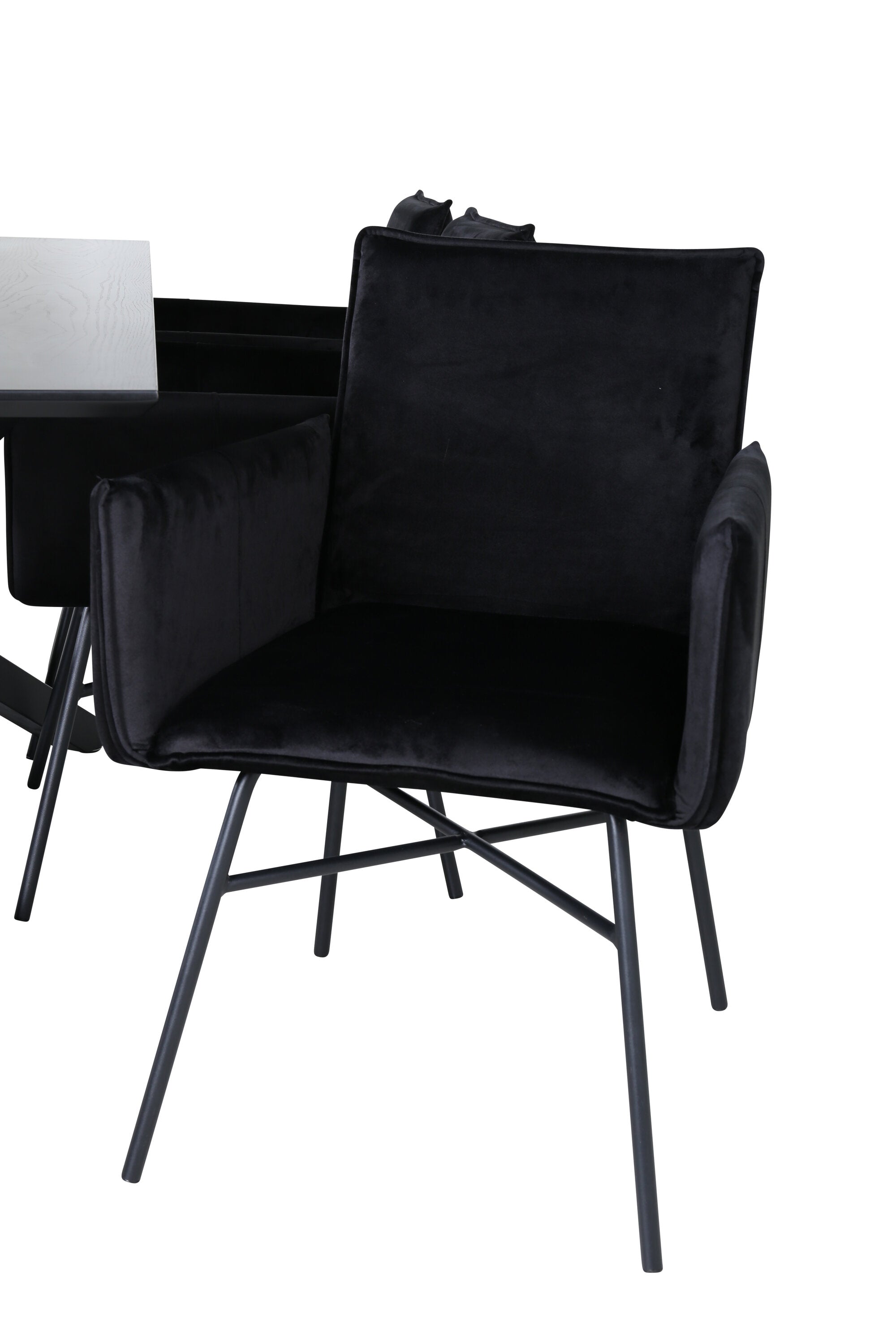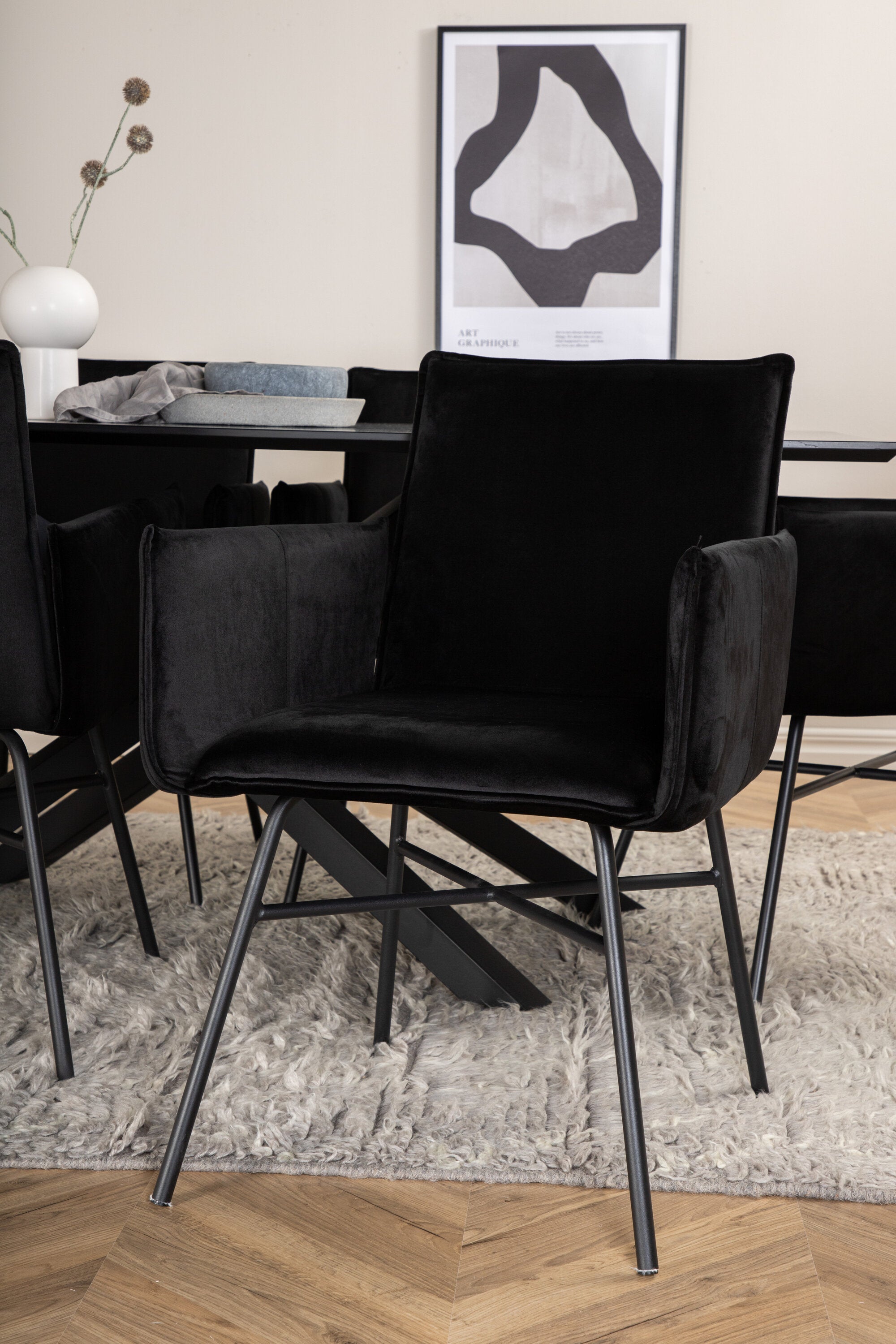Stylové, pohodlné a elegantní – co víc si přát? Piazza je náš oblíbený obdélníkový jídelní stůl s luxusním dojmem a trendy detaily v designu. Deska stolu je vyrobena z MDF dýhy v mazané černé barvě a korpus tvoří pevný poutač s příčnými nohami z černého železa. Zde společně s našimi lahodnými jídelními židlemi Petra. Židle mají pohodlnou hloubku sedáku, nohy židle jsou stylově úzké ze železa a sedák je z černé sametové látky, která místnosti dodává pěkný lesk. Užijte si příjemná jídla dopředu!