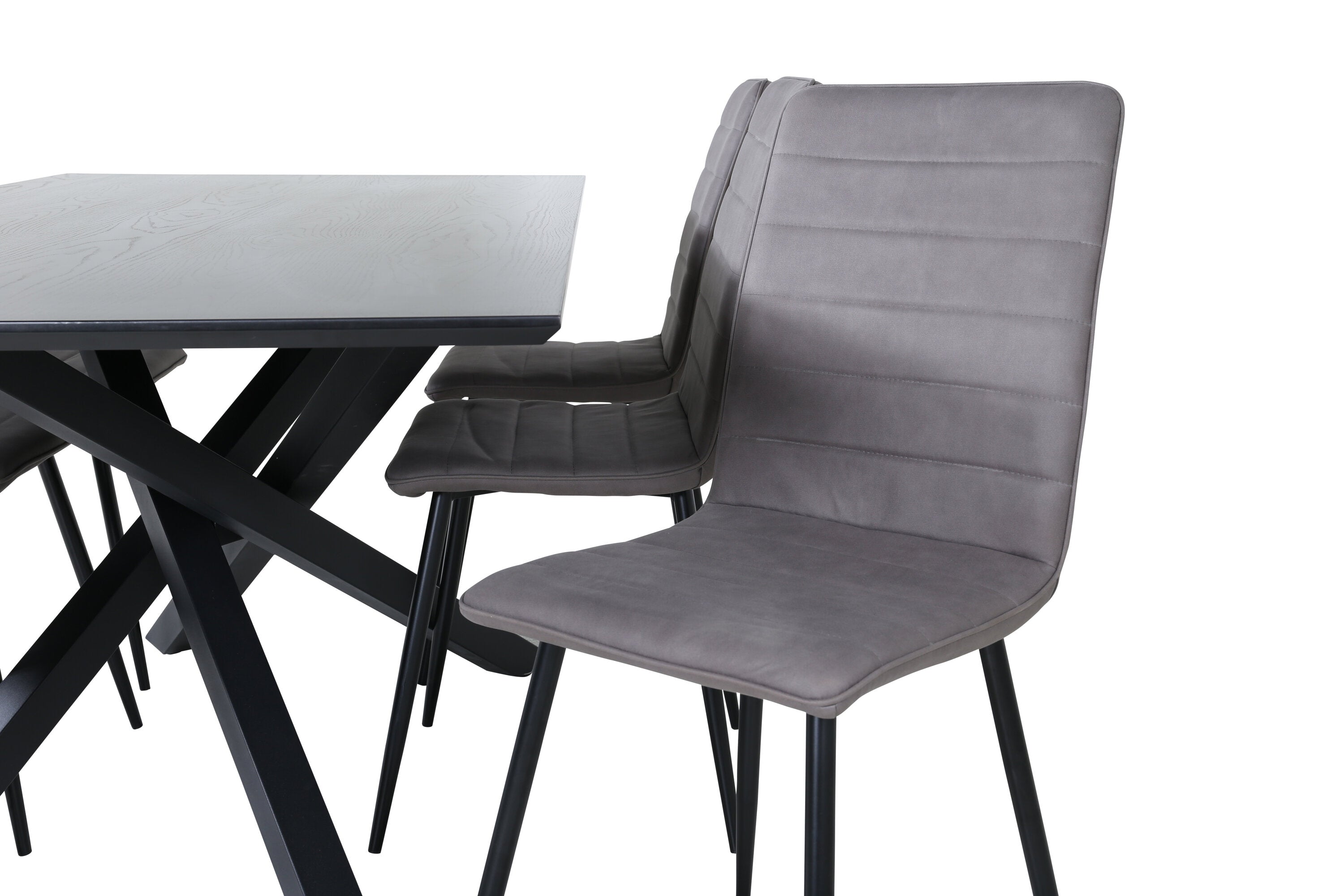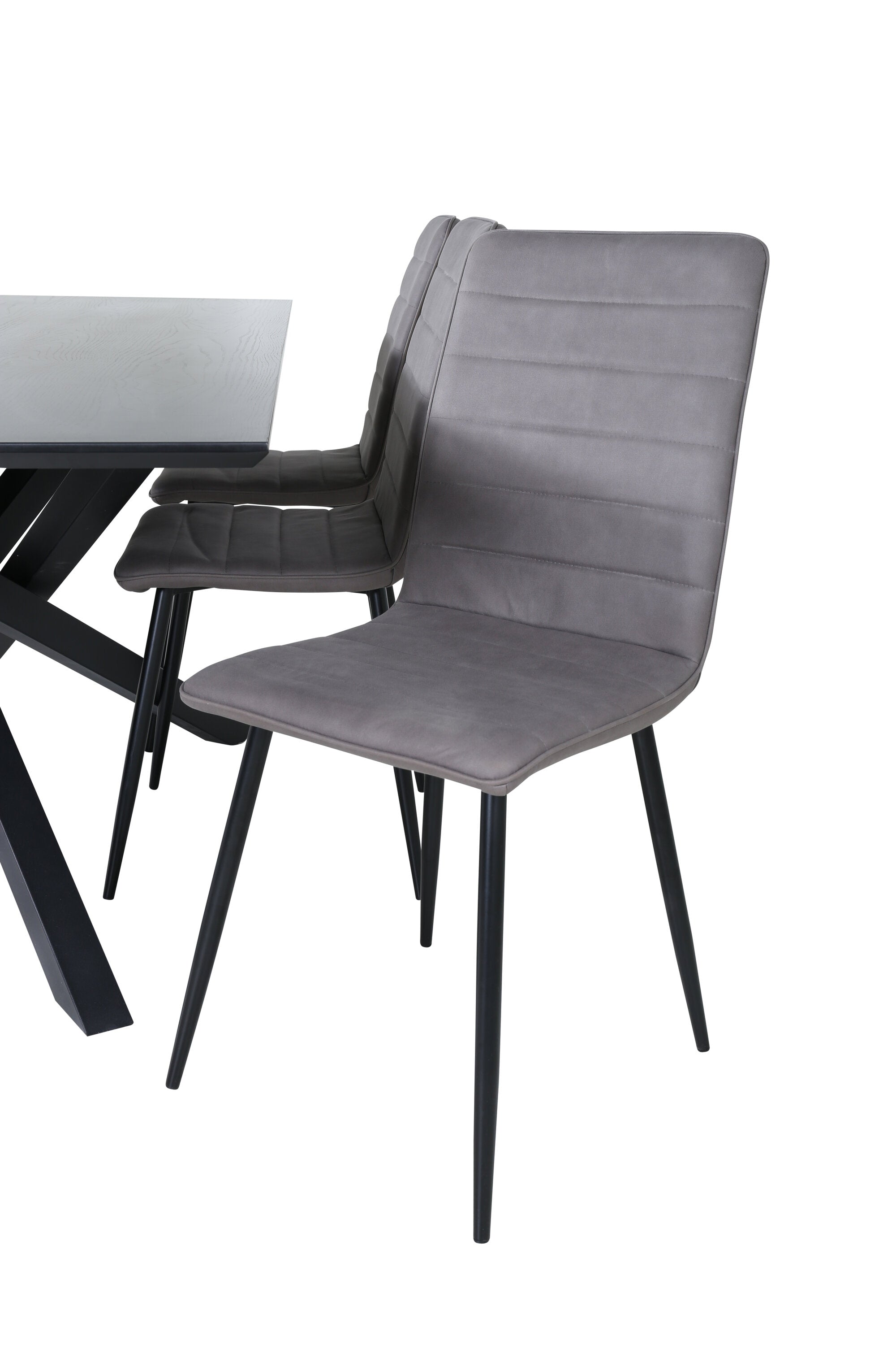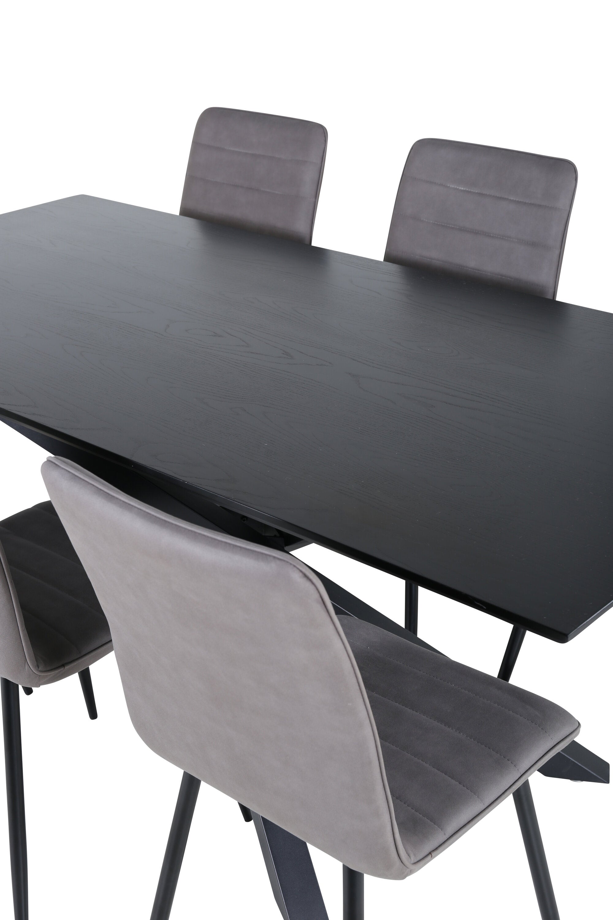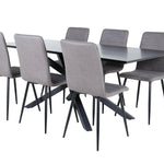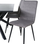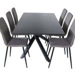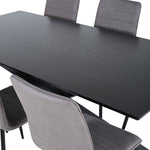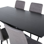 Vkusná skupina jídel, která vyzařuje eleganci a pohodlí! Piazza je náš oblíbený obdélníkový jídelní stůl s luxusním dojmem a trendy detaily v designu. Deska stolu je vyrobena z MDF dýhy v mazané černé barvě a korpus tvoří pevný poutač s příčnými nohami z černého železa. Zde spolu se 4 luxusními jídelními židlemi Windu s černými nohami židlí ze železa a šedými sedáky z mikrovlákna. Příjemná a pohodlná skupina jídel, která pozlátí okamžiky večeře!