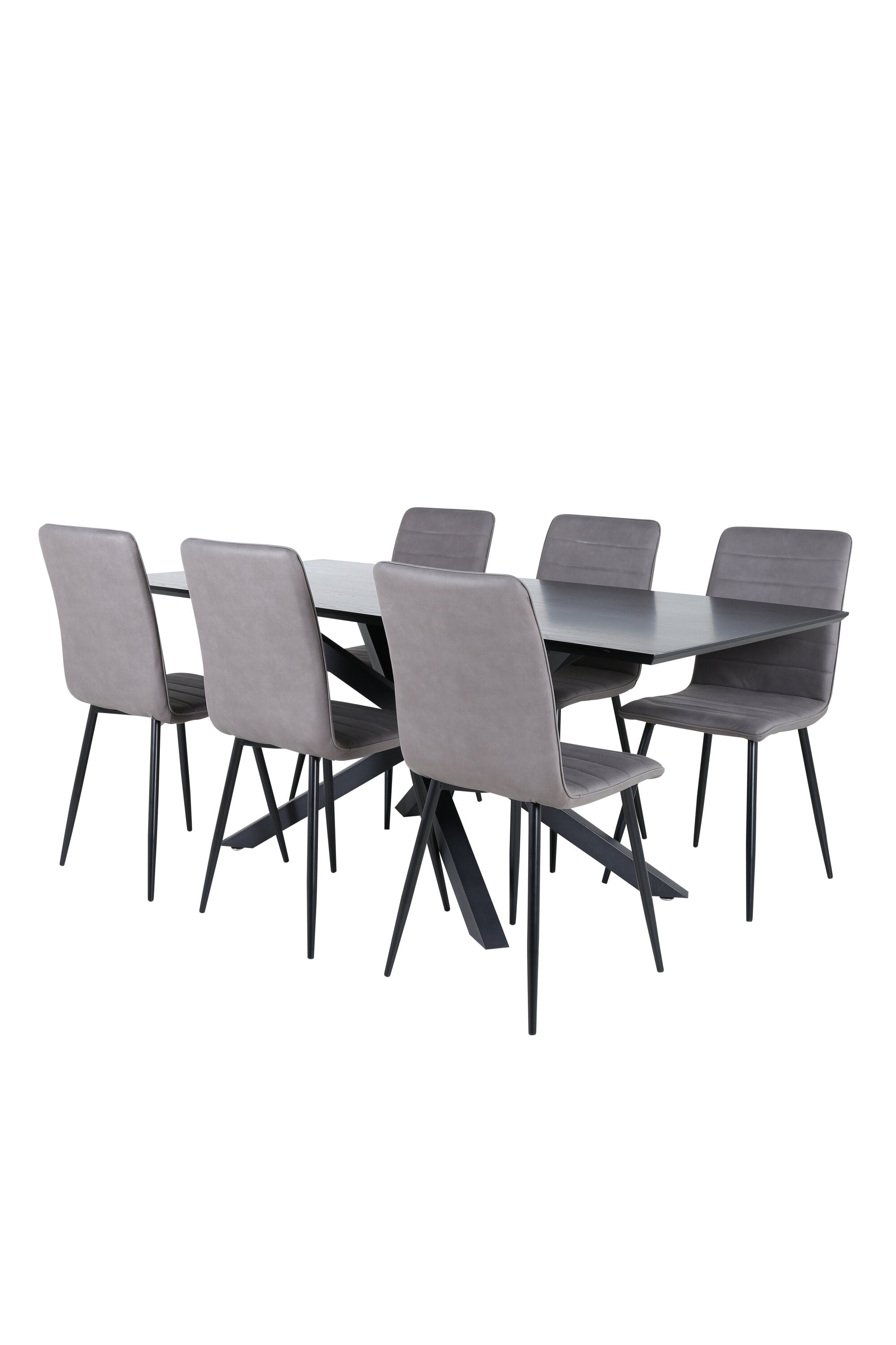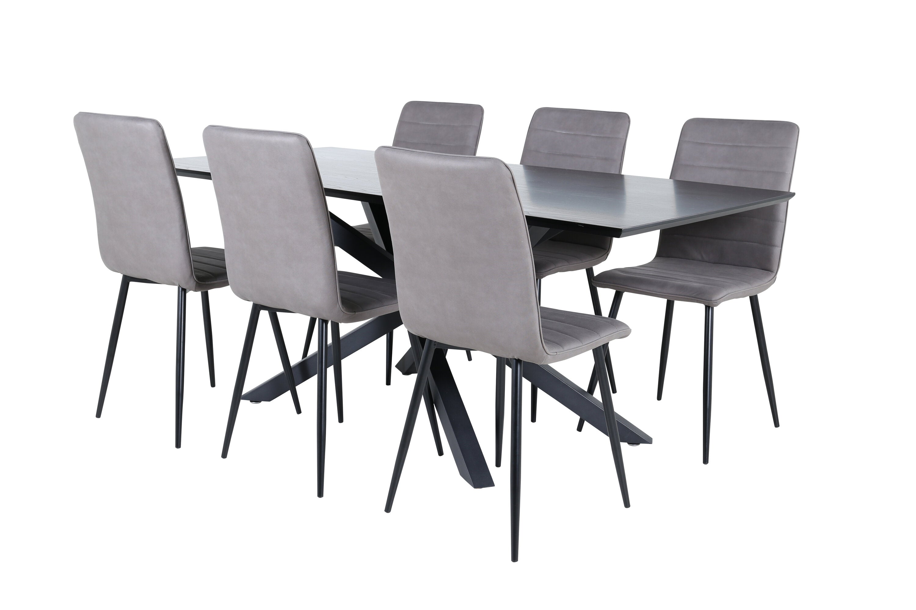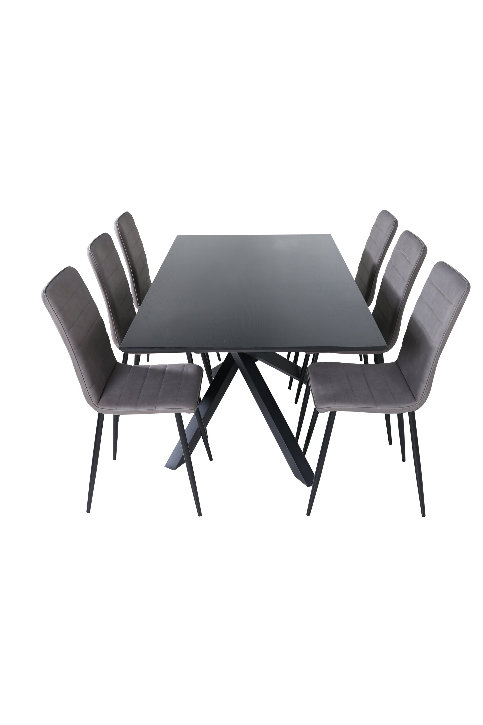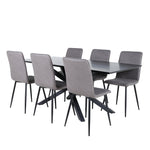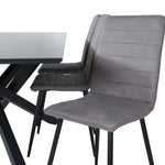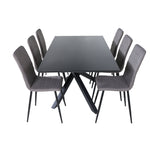 Vkusná skupina jídel, která vyzařuje eleganci a pohodlí! Piazza je náš oblíbený obdélníkový jídelní stůl s luxusním dojmem a trendy detaily v designu. Deska stolu je vyrobena z MDF dýhy v mazané černé barvě a korpus tvoří pevný poutač s příčnými nohami z černého železa. Zde spolu se 4 luxusními jídelními židlemi Windu s černými nohami židlí ze železa a šedými sedáky z mikrovlákna. Příjemná a pohodlná skupina jídel, která pozlátí okamžiky večeře!