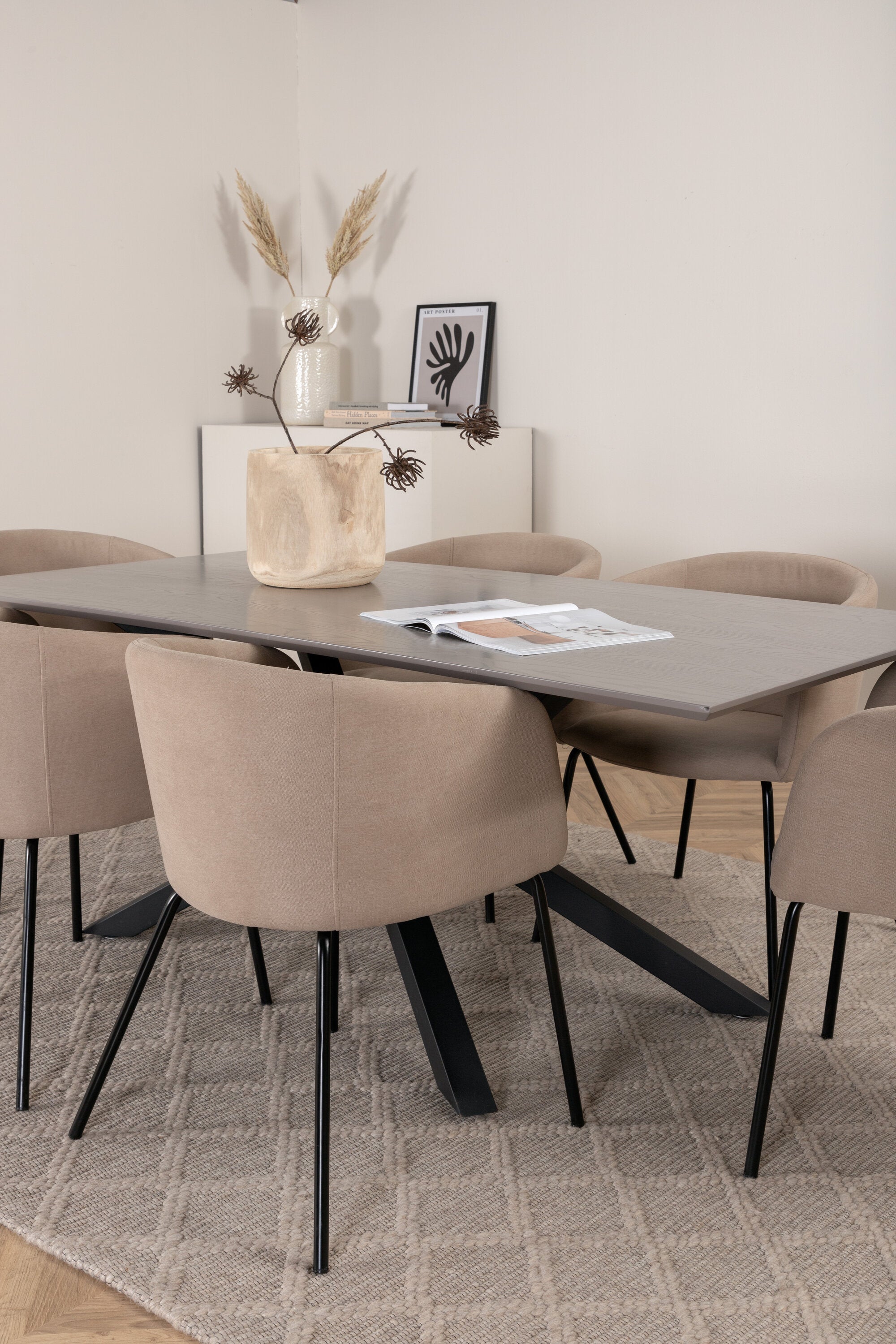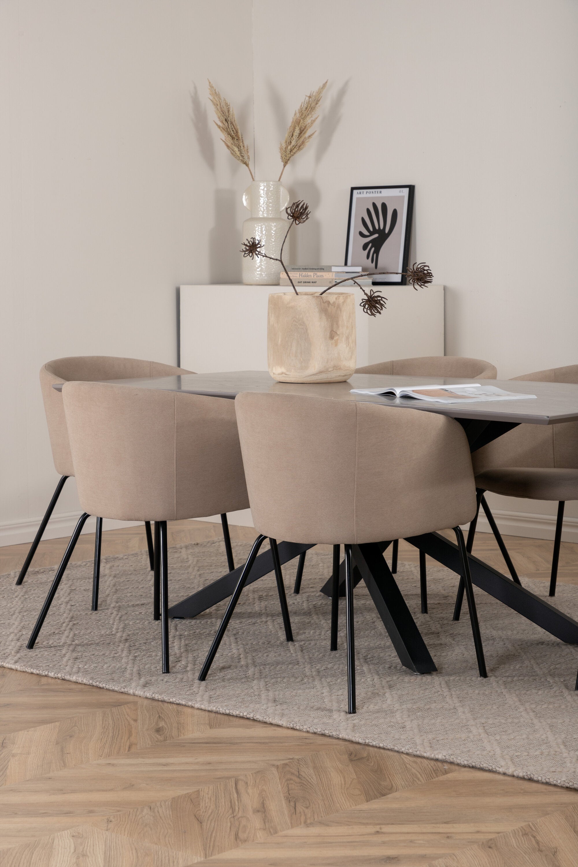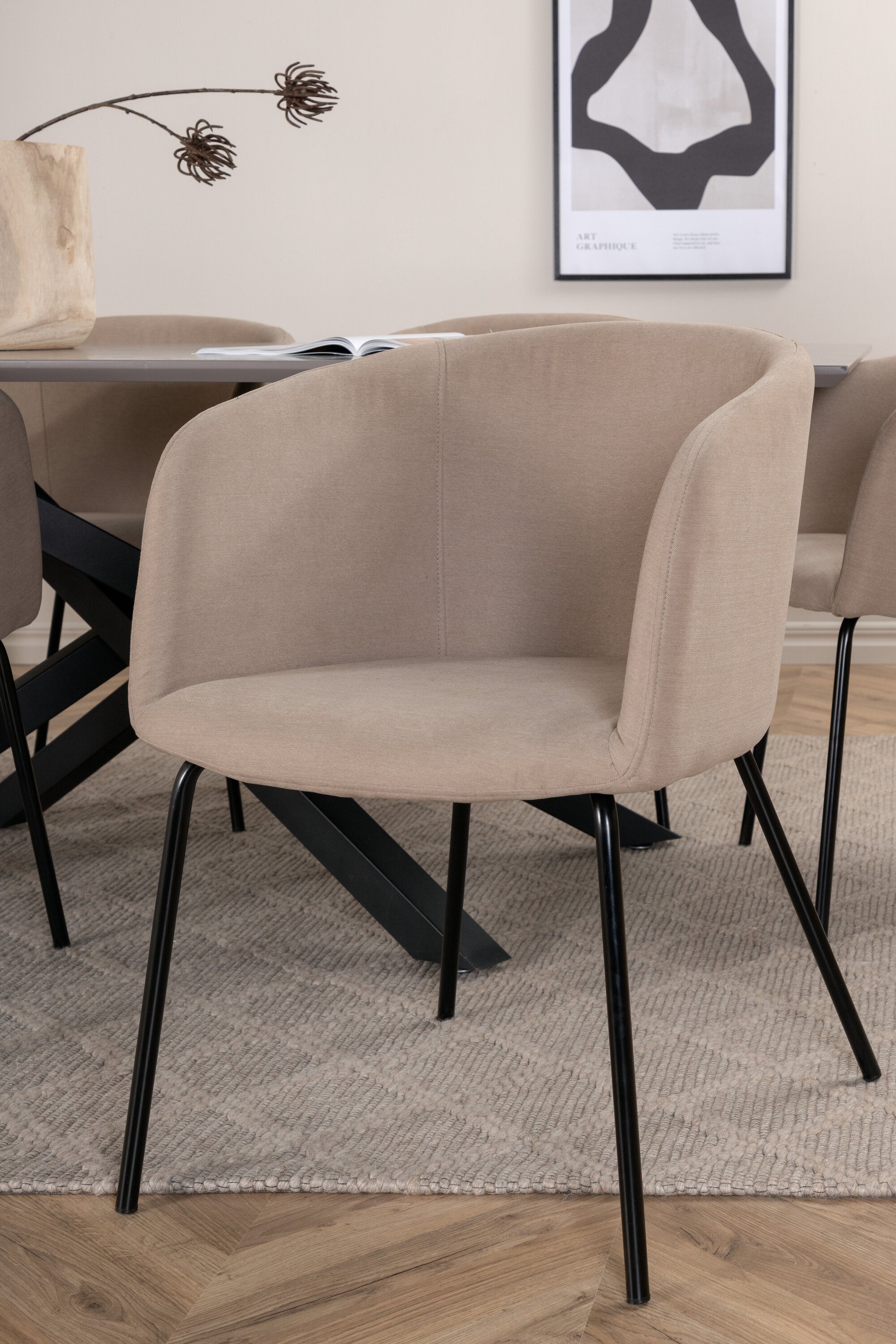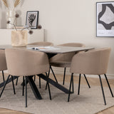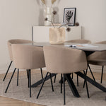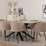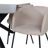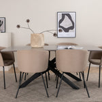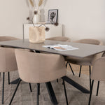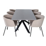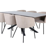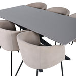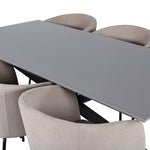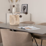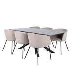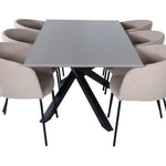 Piazza je náš oblíbený obdélníkový jídelní stůl s luxusním dojmem a trendy detaily v designu. Deska stolu je vyrobena z MDF dýhy v melírované šedé barvě a korpus tvoří pevný poutač s příčnými nohami z černého železa. Zde v nádherné kombinaci s našimi elegantními jídelními židlemi ze série Berit. Židle má luxusní design v béžovém polyesterovém lnu a nohy židle jsou stylově úzké v černém železe. Zařiďte lákavě a vytvořte si stylový vzhled vašeho domova!