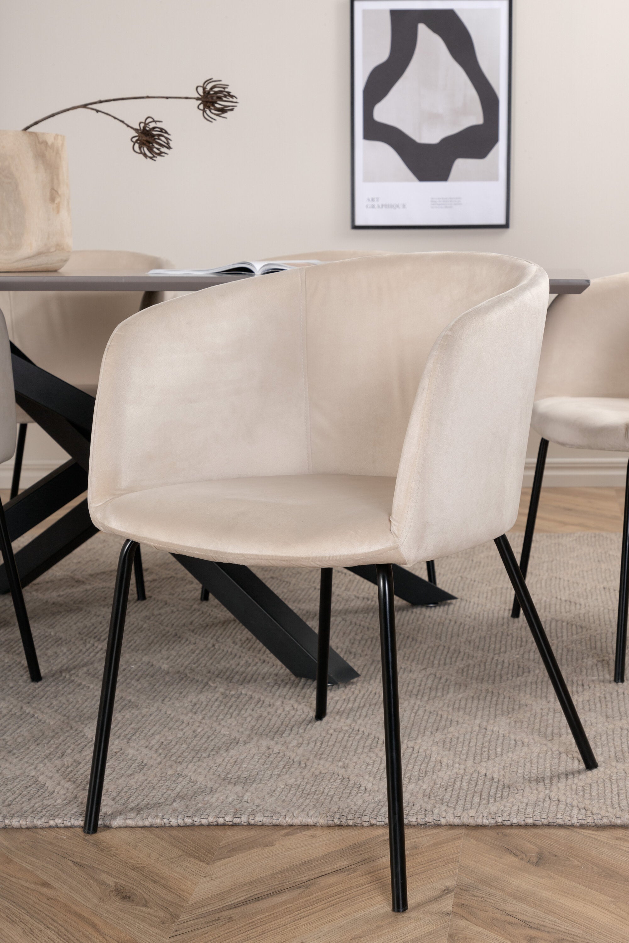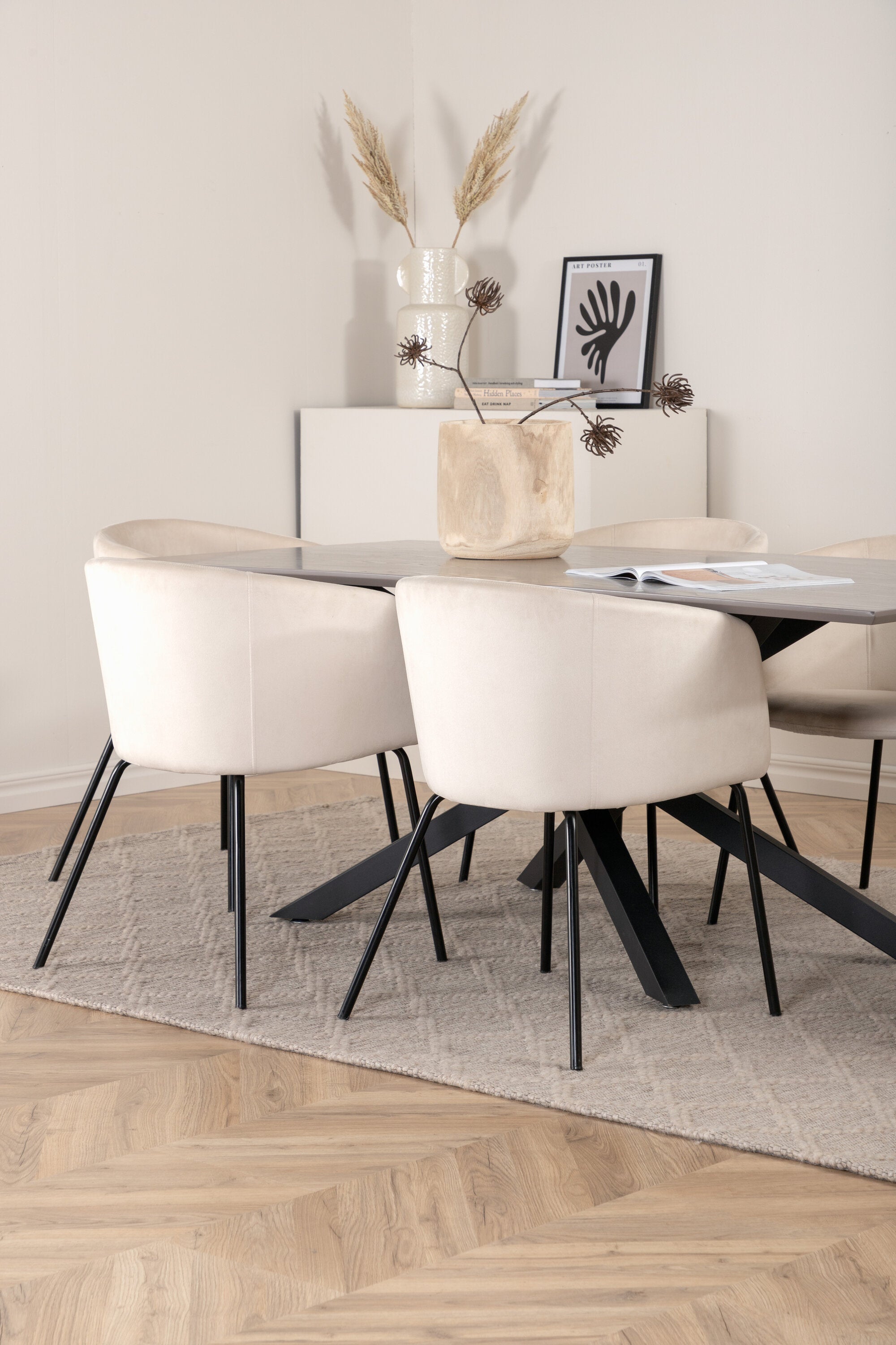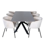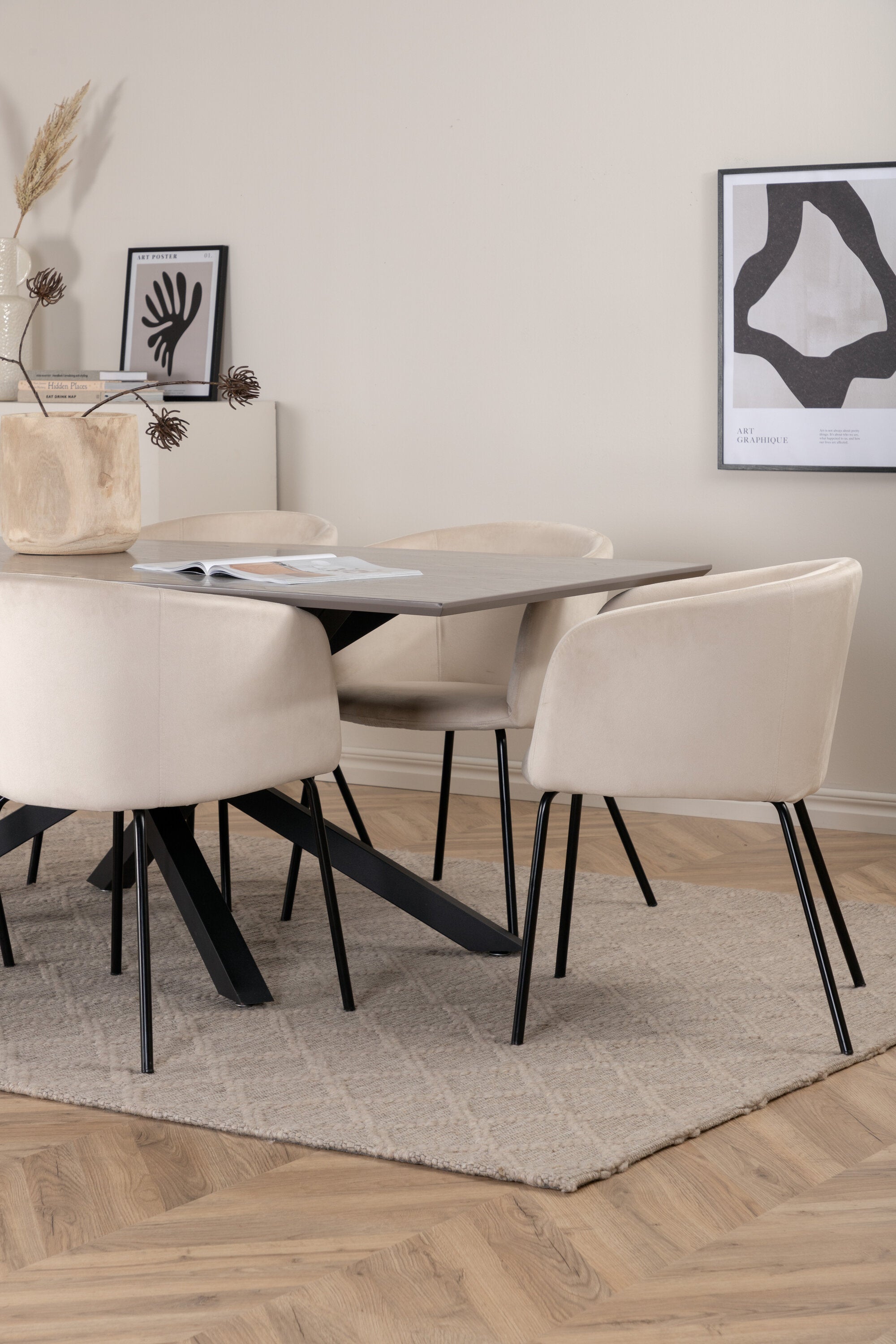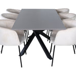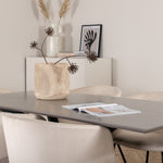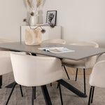 Vytvořte poutač, který zaujme! Piazza je náš oblíbený obdélníkový jídelní stůl s luxusním dojmem a trendy detaily v designu. Deska stolu je vyrobena z MDF dýhy v melírované šedé barvě a korpus tvoří pevný poutač s příčnými nohami z černého železa. Zde v nádherné kombinaci s našimi elegantními jídelními židlemi ze série Berit. Židle má luxusní design v béžovém sametu a nohy židle jsou stylově úzké v černém železe. Zařiďte lákavě a vytvořte si stylový vzhled vašeho domova!