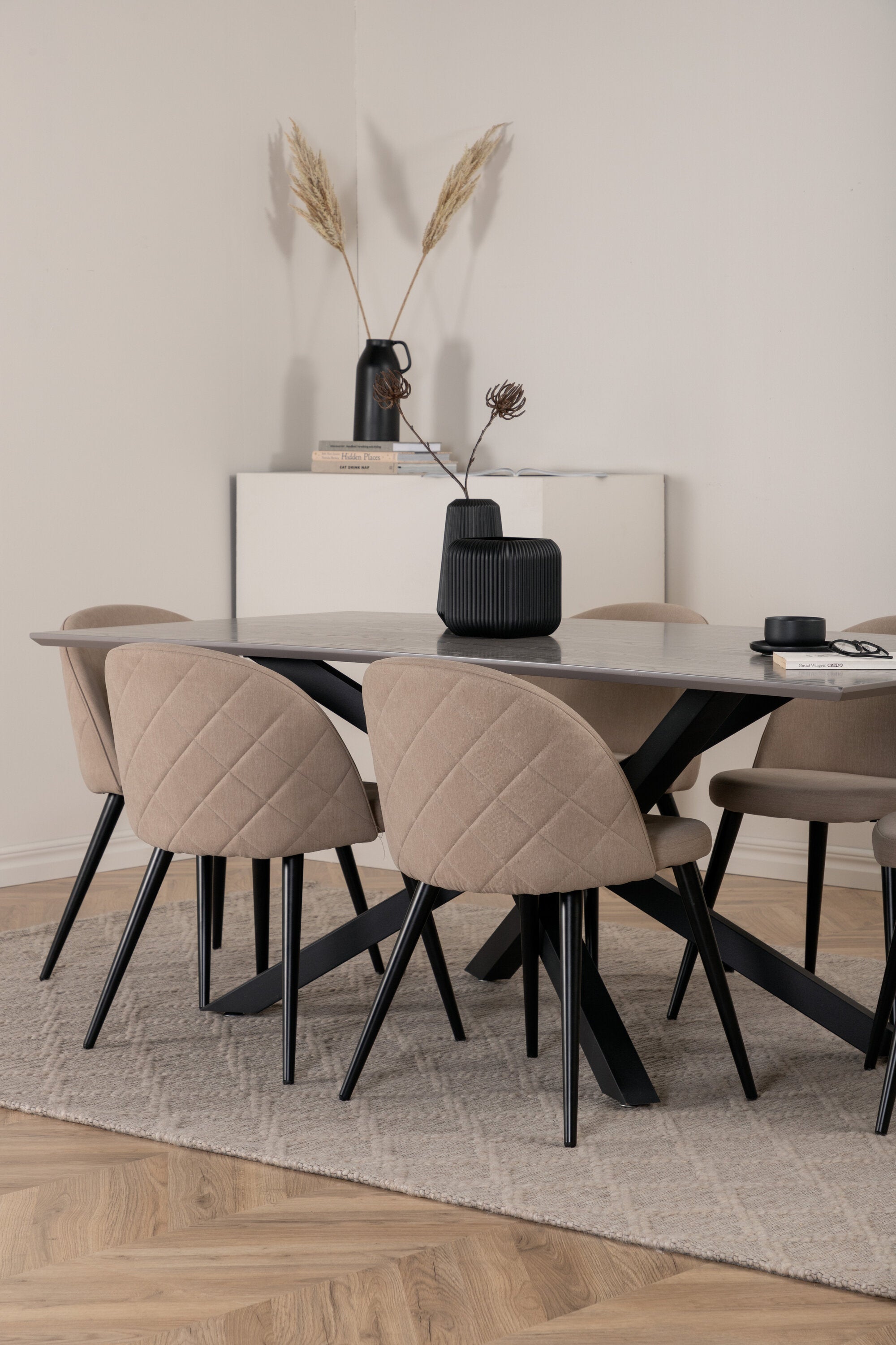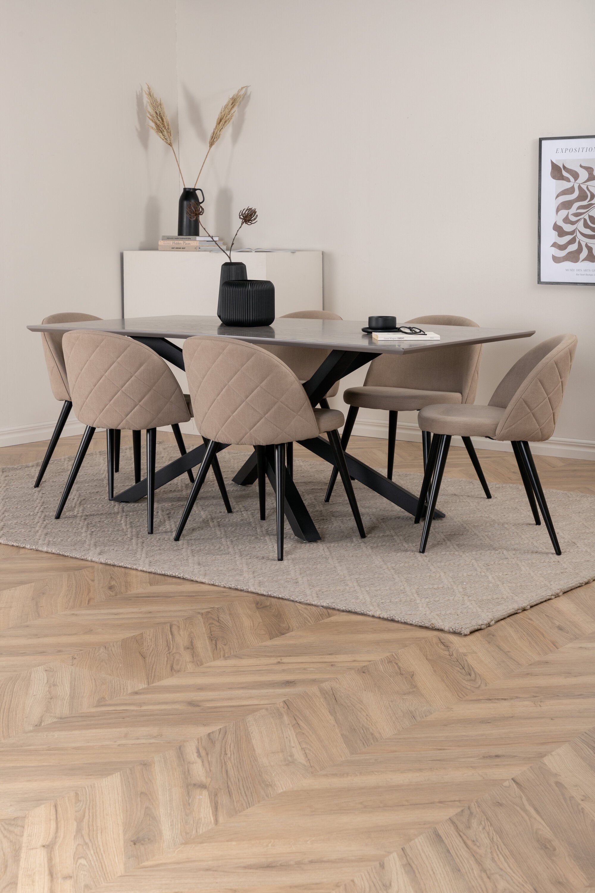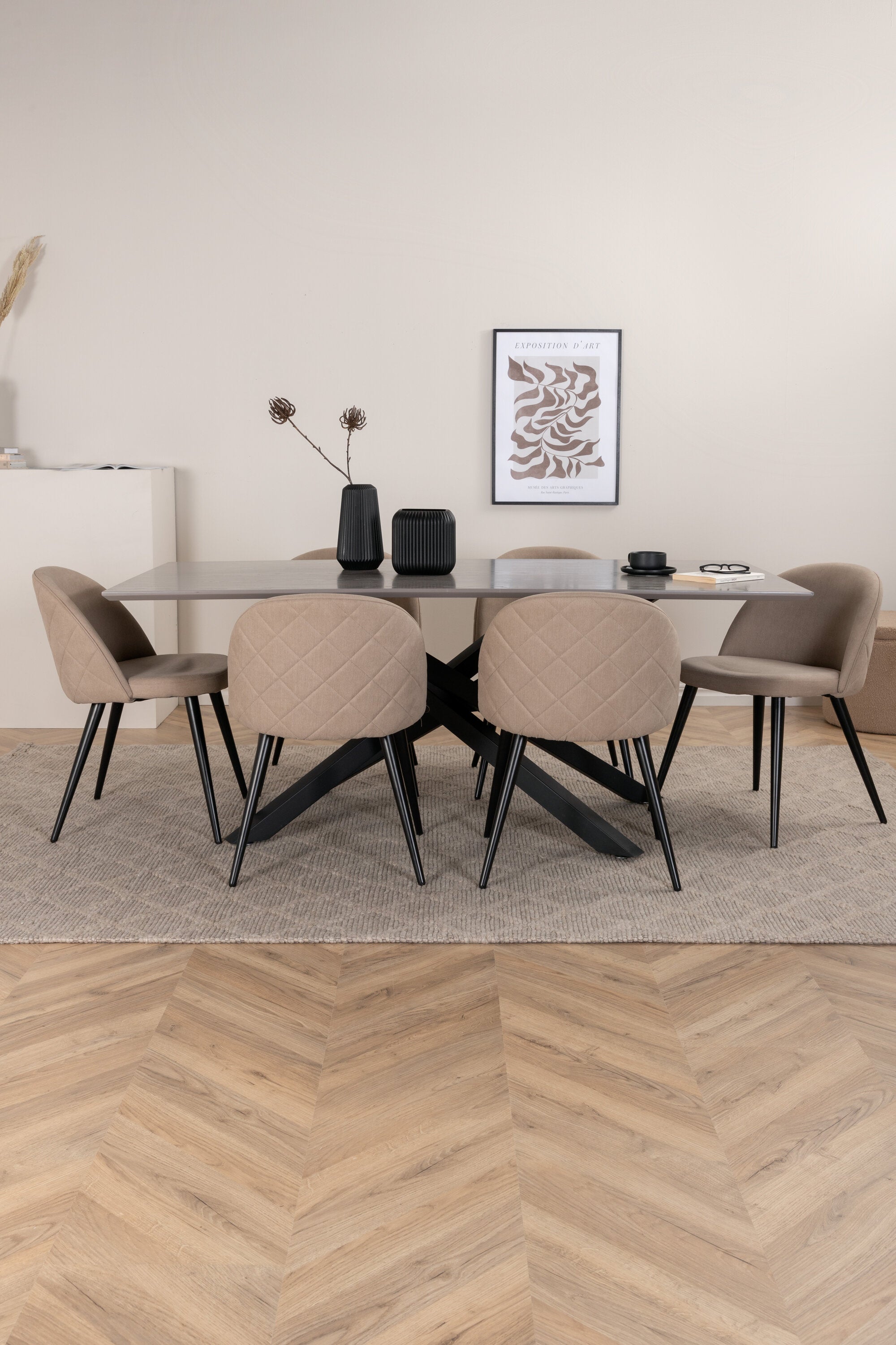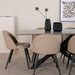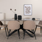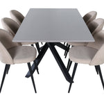 Vytvořte si domáckou atmosféru s okouzlující skupinou jídel! Piazza je náš oblíbený obdélníkový jídelní stůl s luxusním dojmem a trendy detaily v designu. Deska stolu je vyrobena z MDF dýhy v melírované šedé barvě a korpus tvoří pevný poutač s příčnými nohami z černého železa. Zde v lahodné kombinaci s jídelními židlemi ze série Velvet Stitches, která tvoří pěkný celek v obývacím pokoji. Nohy židle jsou snadno rozšířeny v černém železe a béžová sedadla jsou z polyesterového plátna. Užijte si příjemná jídla!