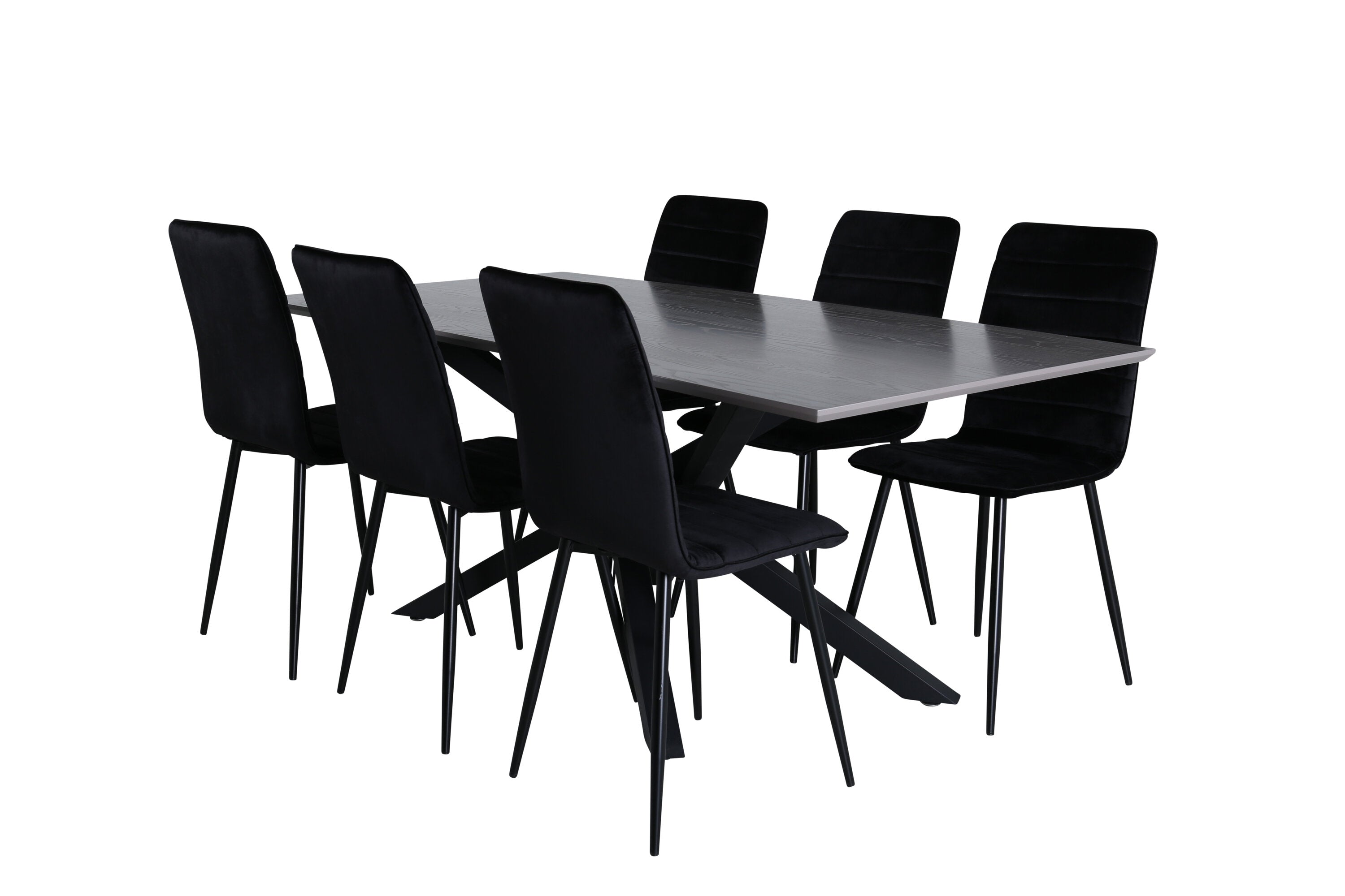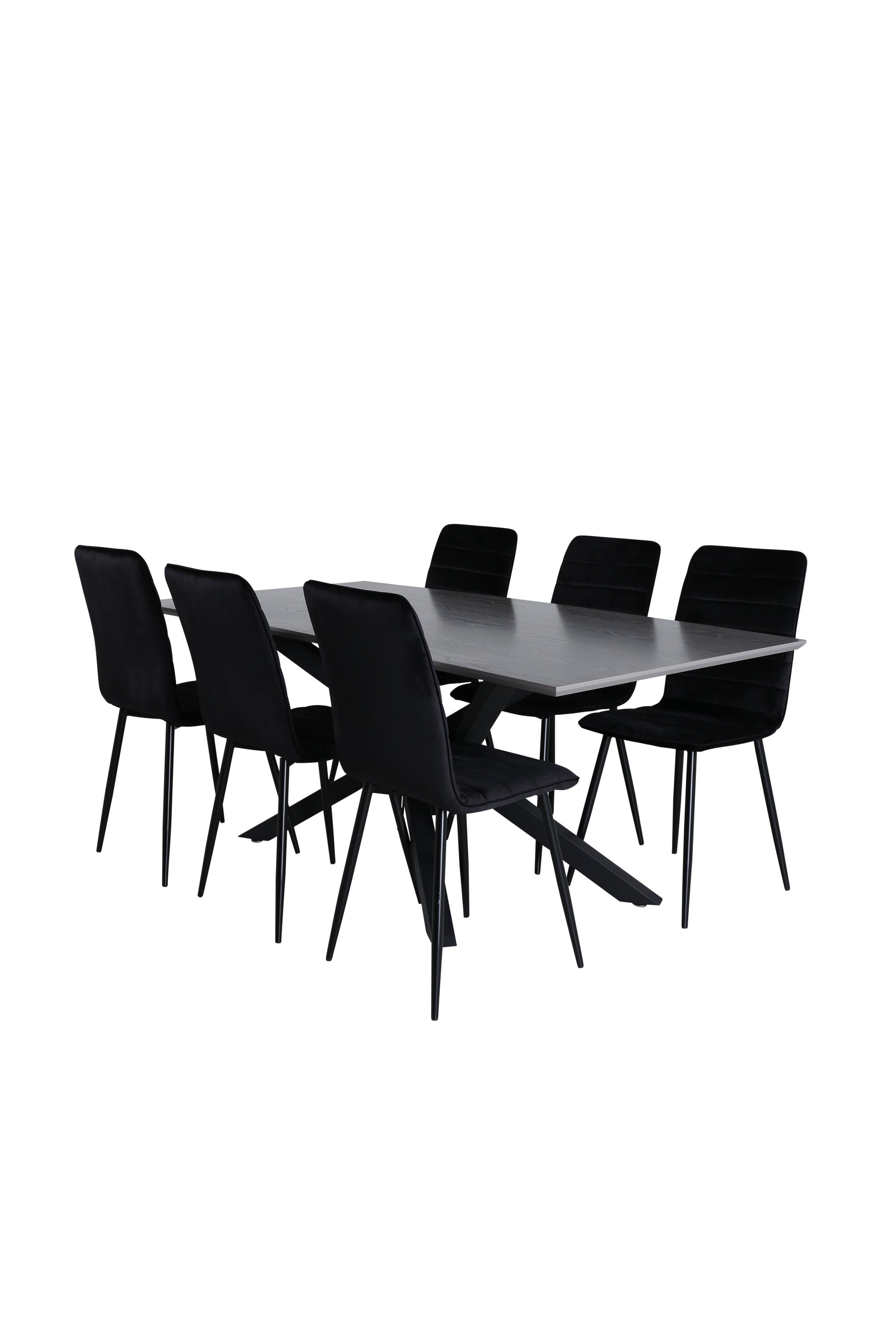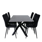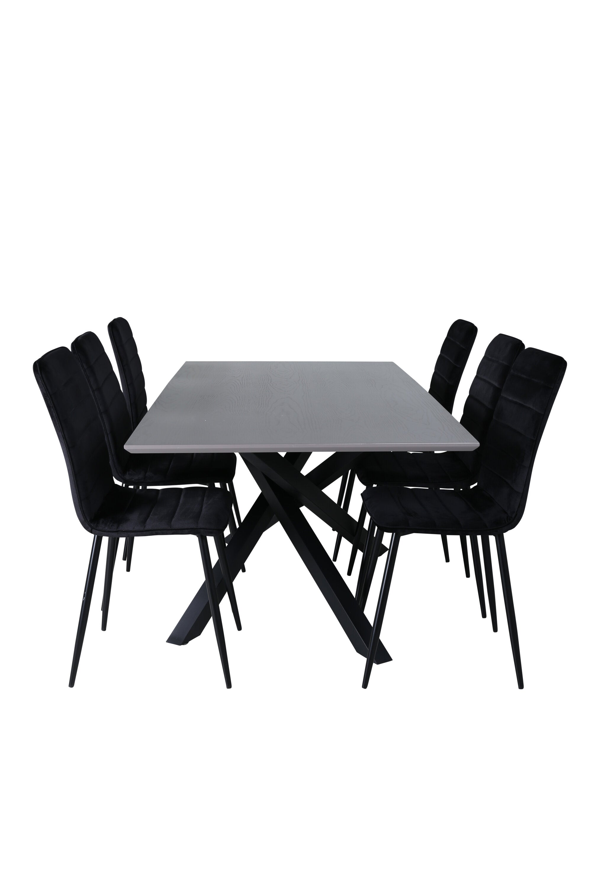 Skupina jídel v moderním designu a dekorativních detailech! Zde máme 6 luxusních jídelních židlí Windu v rovném provedení se sedáky v černém sametu a nohami židlí ze železa. Rozměry židle: Výška: 94 cm, výška sedáku: 47 cm, šířka: 43 cm, hloubka: 49 cm. Skvěle se hodí k našemu oblíbenému obdélníkovému jídelnímu stolu Piazza s luxusním dojmem a trendy detaily v designu. Deska stolu v šedé barvě je vyrobena z MDF. Tělo má lahodný vzhled se zkříženýma nohama z černého železa, které vytváří stabilní poutač. Rozměry stolu: Délka: 190 cm, Šířka: 90 cm, Výška: 76 cm. Nábytek pro zlatou hranu v každodenním životě - měl by se cítit příjemně!