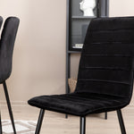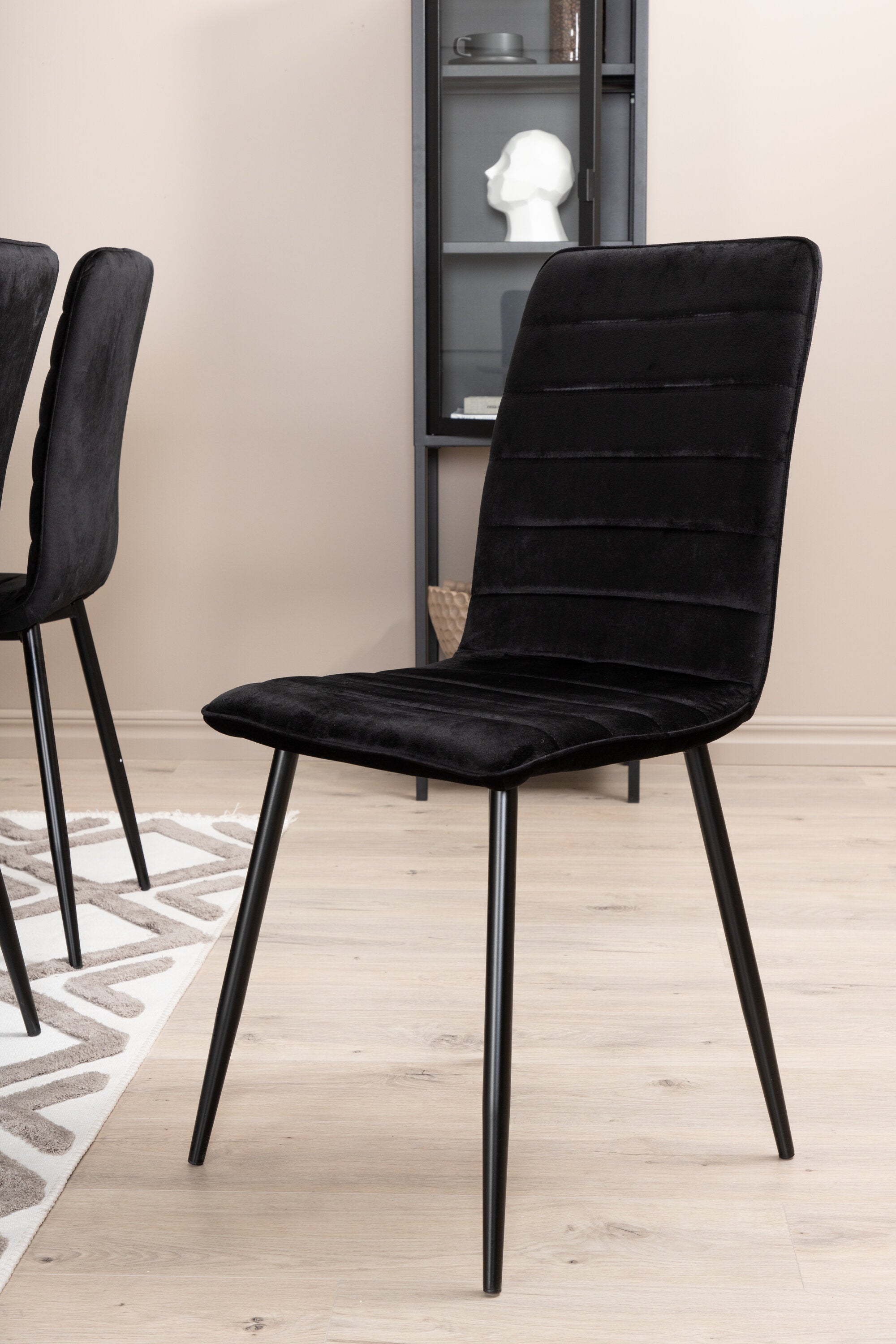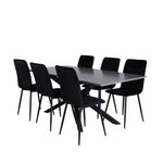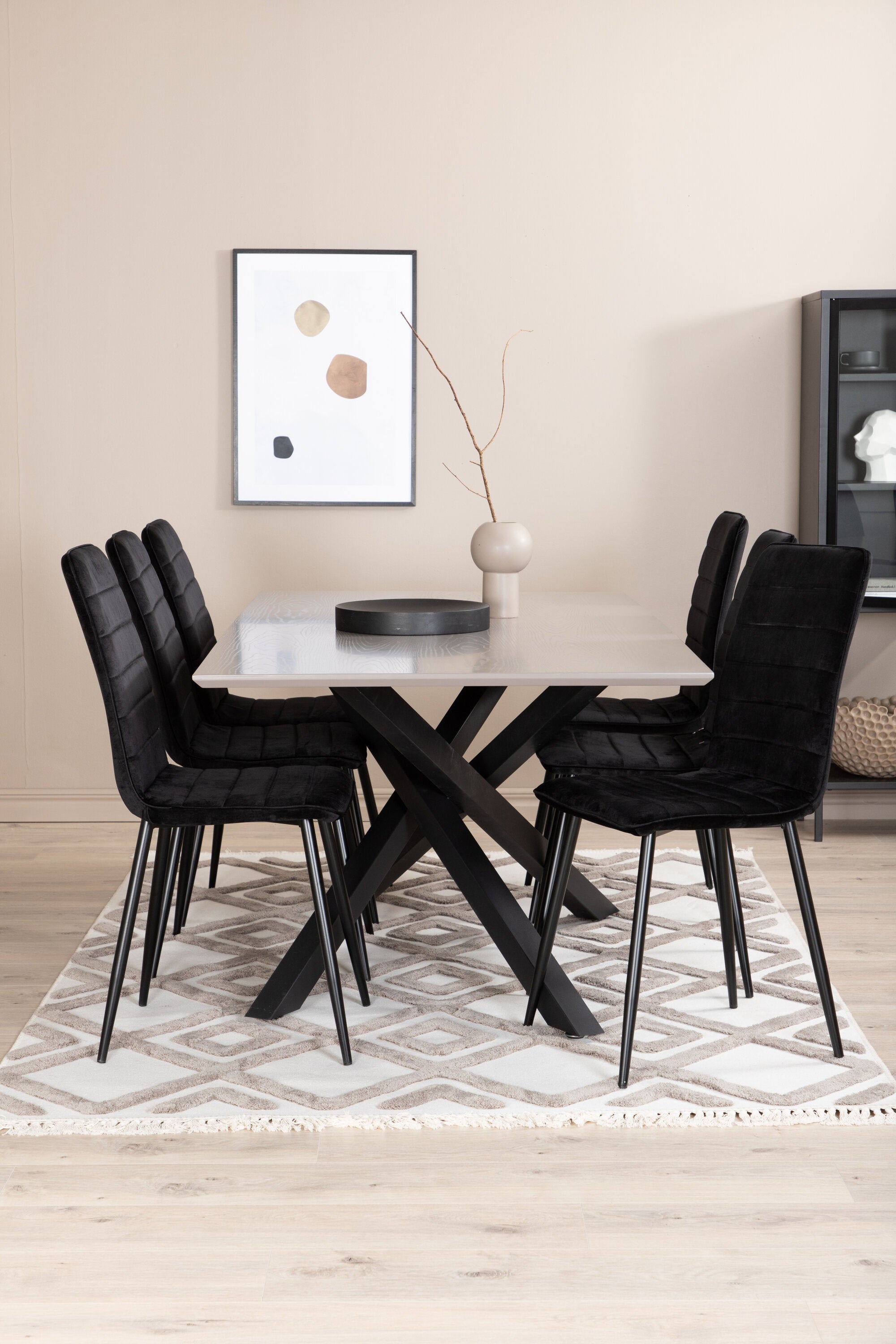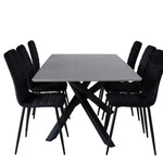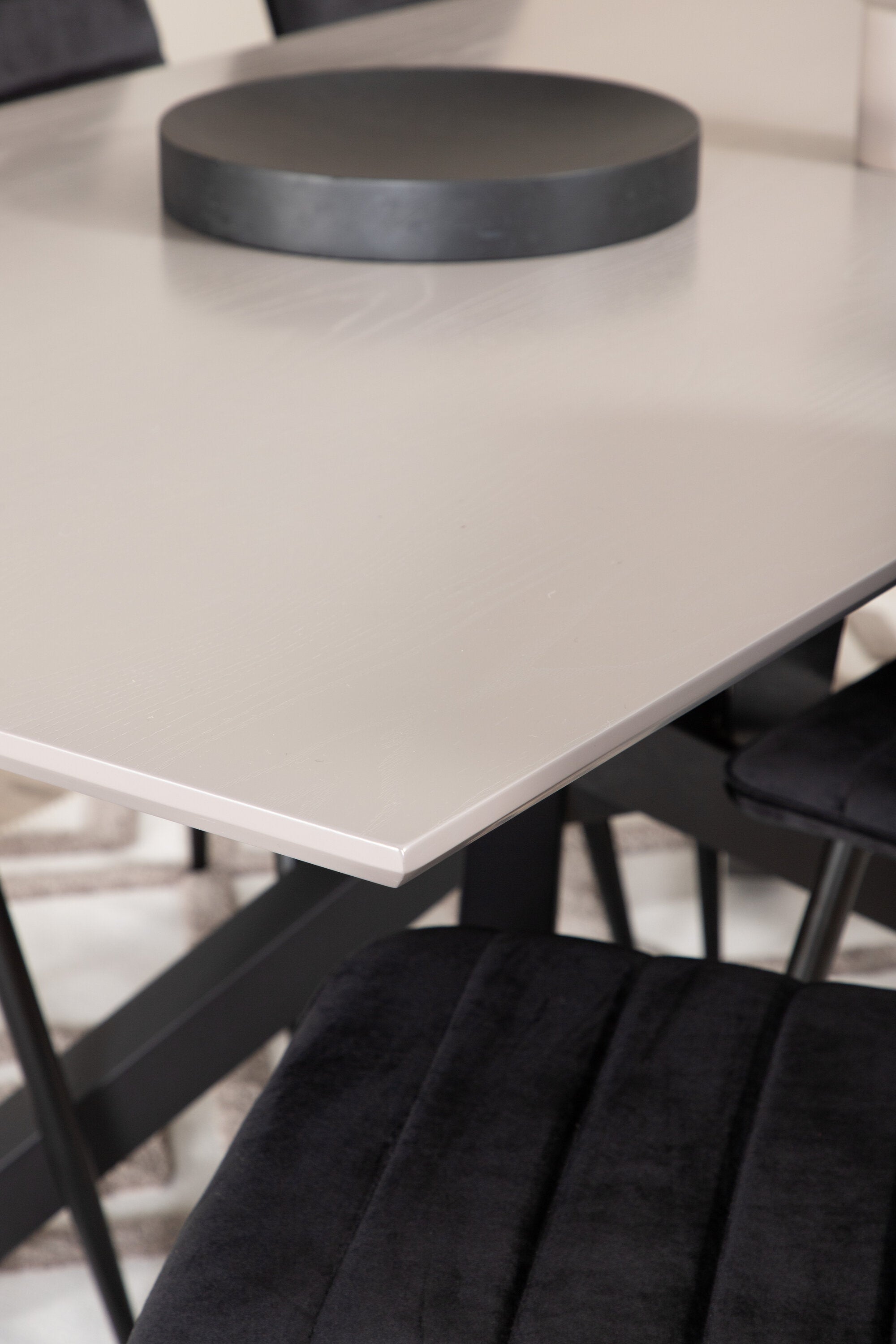 Skupina jídel v moderním designu a dekorativních detailech! Zde máme 6 luxusních jídelních židlí Windu v rovném provedení se sedáky v černém sametu a nohami židlí ze železa. Rozměry židle: Výška: 94 cm, výška sedáku: 47 cm, šířka: 43 cm, hloubka: 49 cm. Skvěle se hodí k našemu oblíbenému obdélníkovému jídelnímu stolu Piazza s luxusním dojmem a trendy detaily v designu. Deska stolu v šedé barvě je vyrobena z MDF. Tělo má lahodný vzhled se zkříženýma nohama z černého železa, které vytváří stabilní poutač. Rozměry stolu: Délka: 190 cm, Šířka: 90 cm, Výška: 76 cm. Nábytek pro zlatou hranu v každodenním životě - měl by se cítit příjemně!