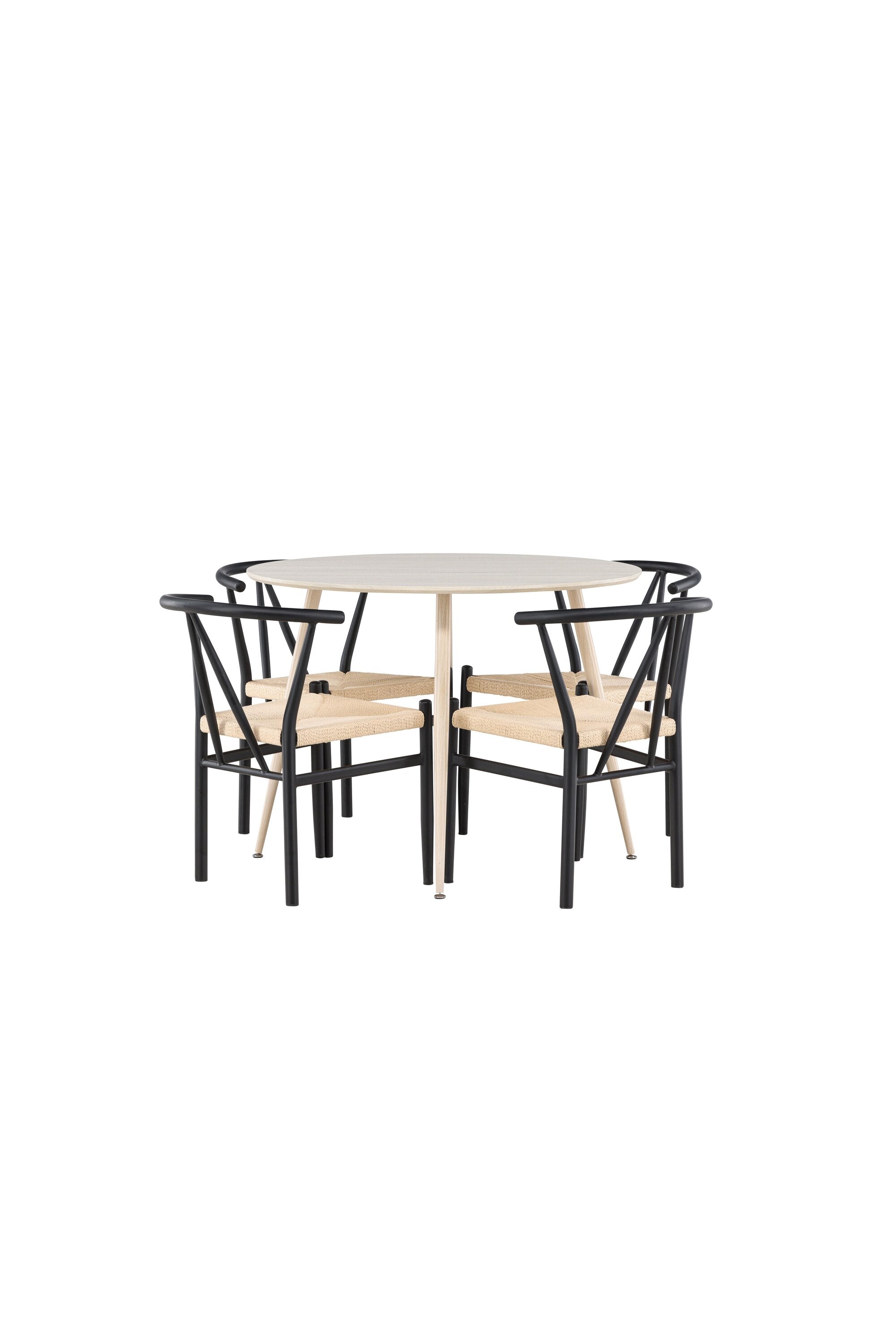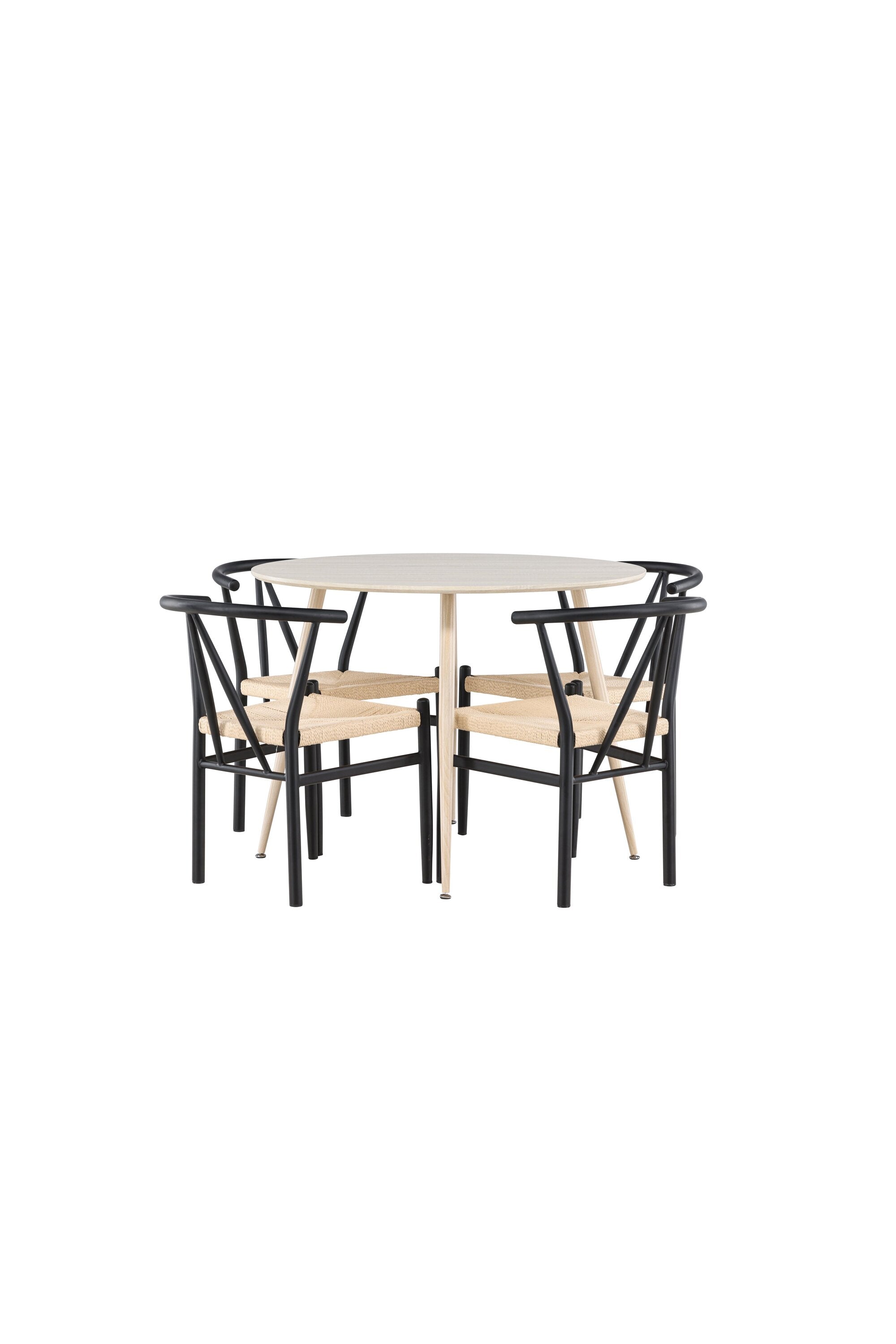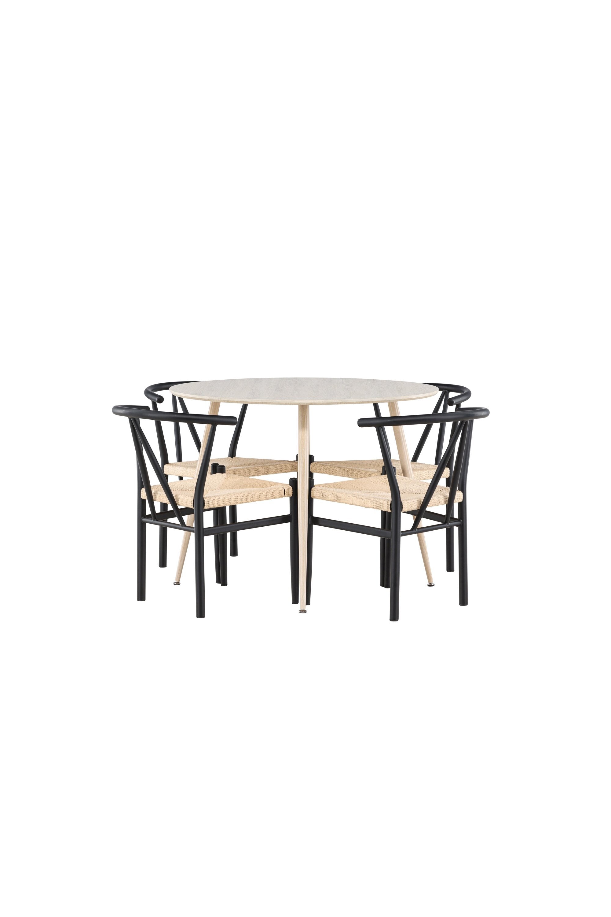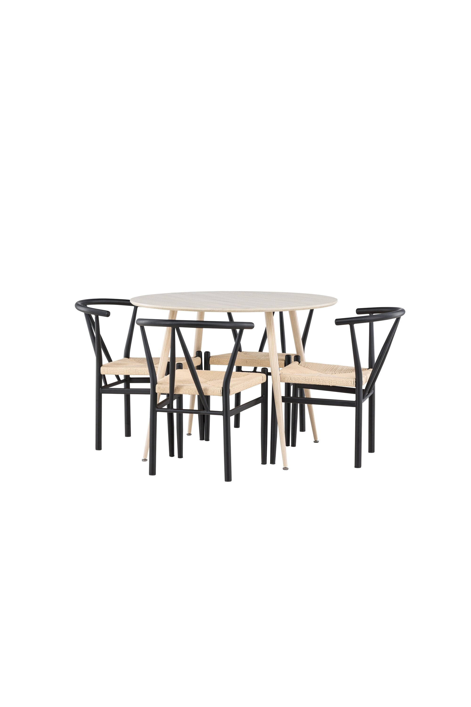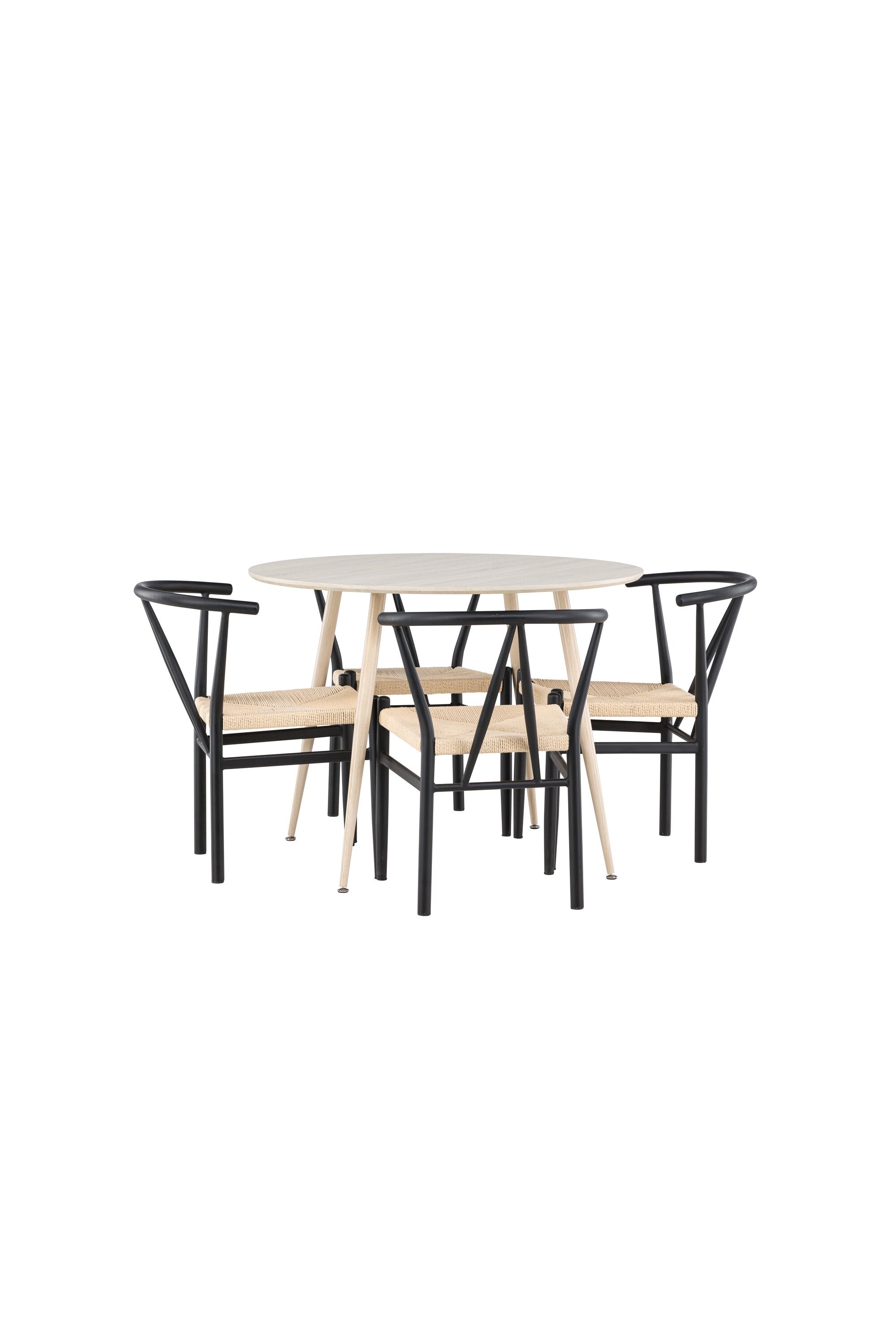 Objevte perfektní jídelní set pro váš domov s jídelním stolem Plaza a jídelními židlemi Alfons. Jídelní stůl Plaza s velkorysým průměrem 100 cm je vyroben z odolného MDF materiálu a má bíle pigmentovanou barvu, která dodává místnosti hřejivý a příjemný pocit. Jeho moderní design a čisté linie vytvářejí klidnou a harmonickou atmosféru, díky níž je každé jídlo relaxačním zážitkem. Díky kompaktnímu formátu je Plaza ideální pro menší prostory a zároveň nabízí dostatek prostoru pro pohodlné jídlo s rodinou a přáteli. Doplňte svůj jídelní stůl o naše stylové jídelní židle Alfons, které elegantním způsobem spojují styl a funkčnost. Se sedákem z béžového ratanu a rámem z černé oceli dodají vašemu jídelnímu stolu nadčasový a klasický vzhled. Jídelní židle Alfons nabízejí nejen pohodlné místo k sezení a vychutnávání si jídla, ale také příležitost vytvořit komunitu kolem stolu. Díky robustní konstrukci a pevnému materiálu je Alfons připraven odolat mnoha večeřím a setkáním, které přijdou. Dodejte svému domovu moderní a stylový nádech s jídelním stolem Plaza a jídelními židlemi Alfons – dokonalá kombinace pro každého, kdo si cení stylu i funkce ve svém zařízení.