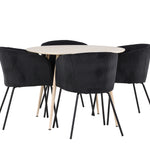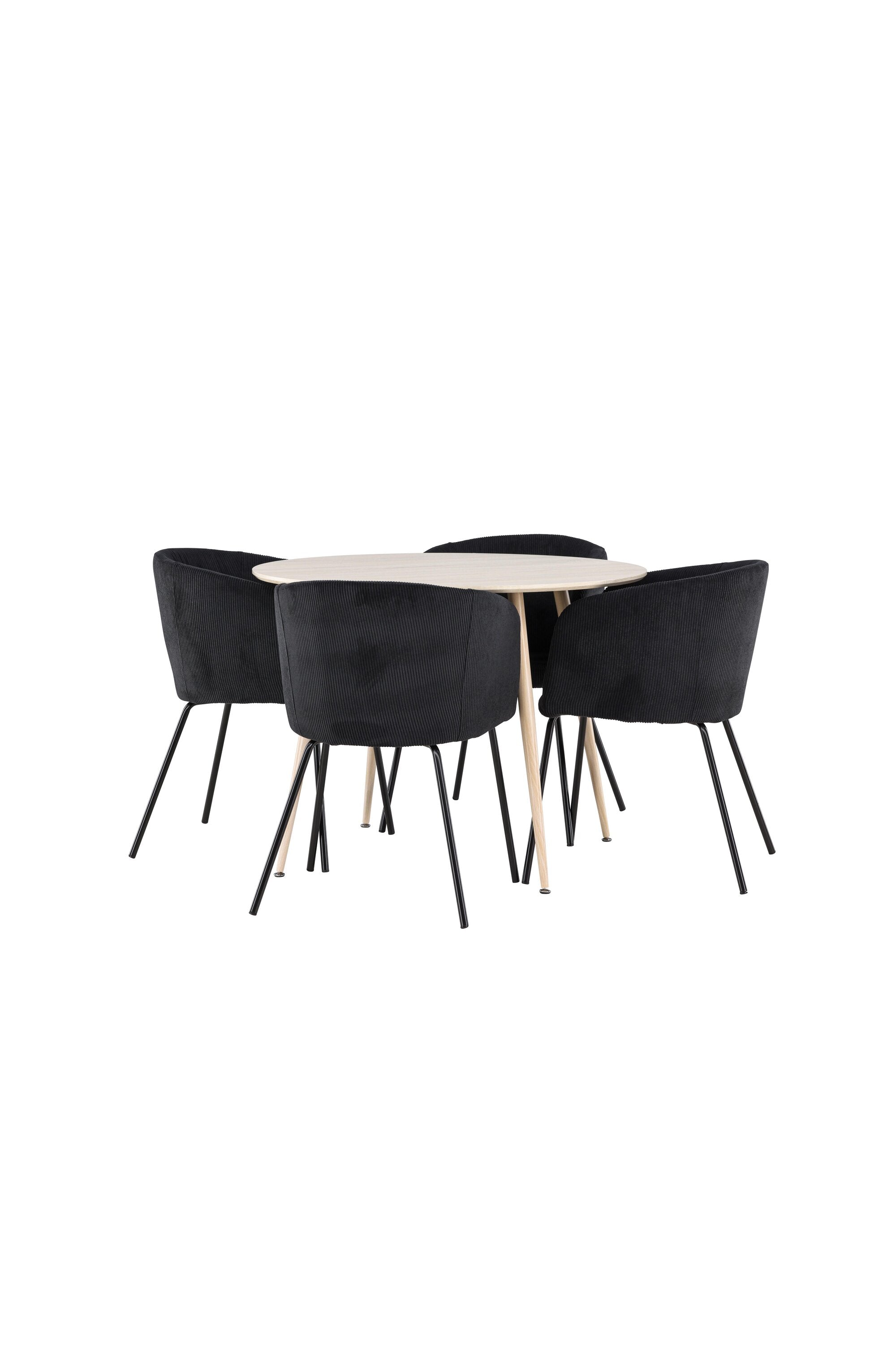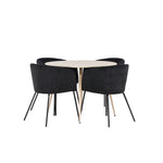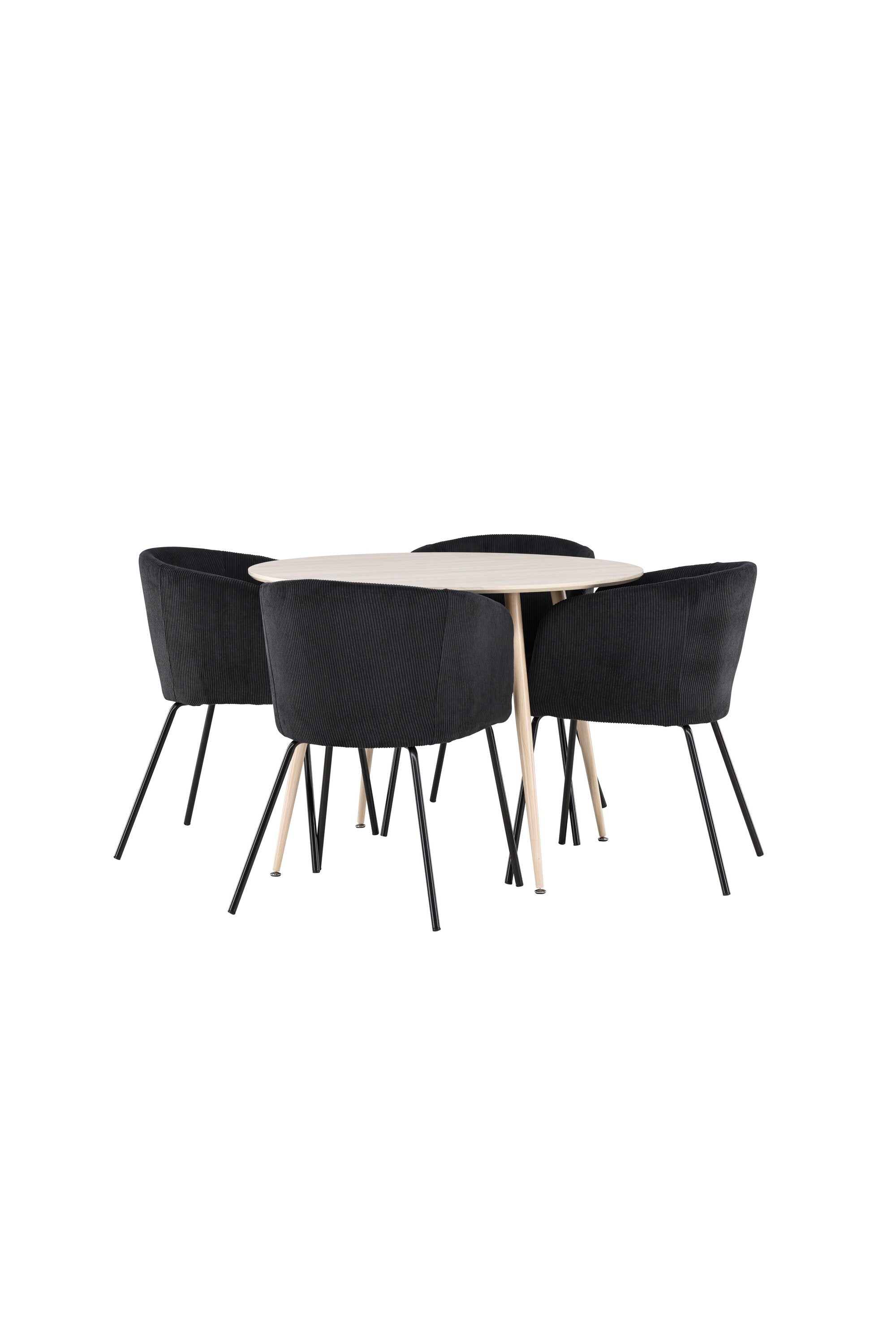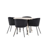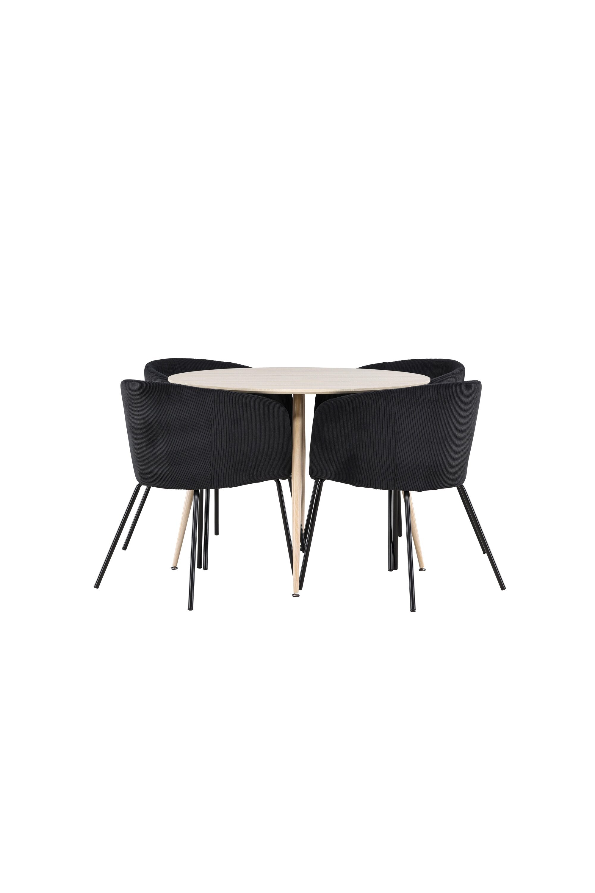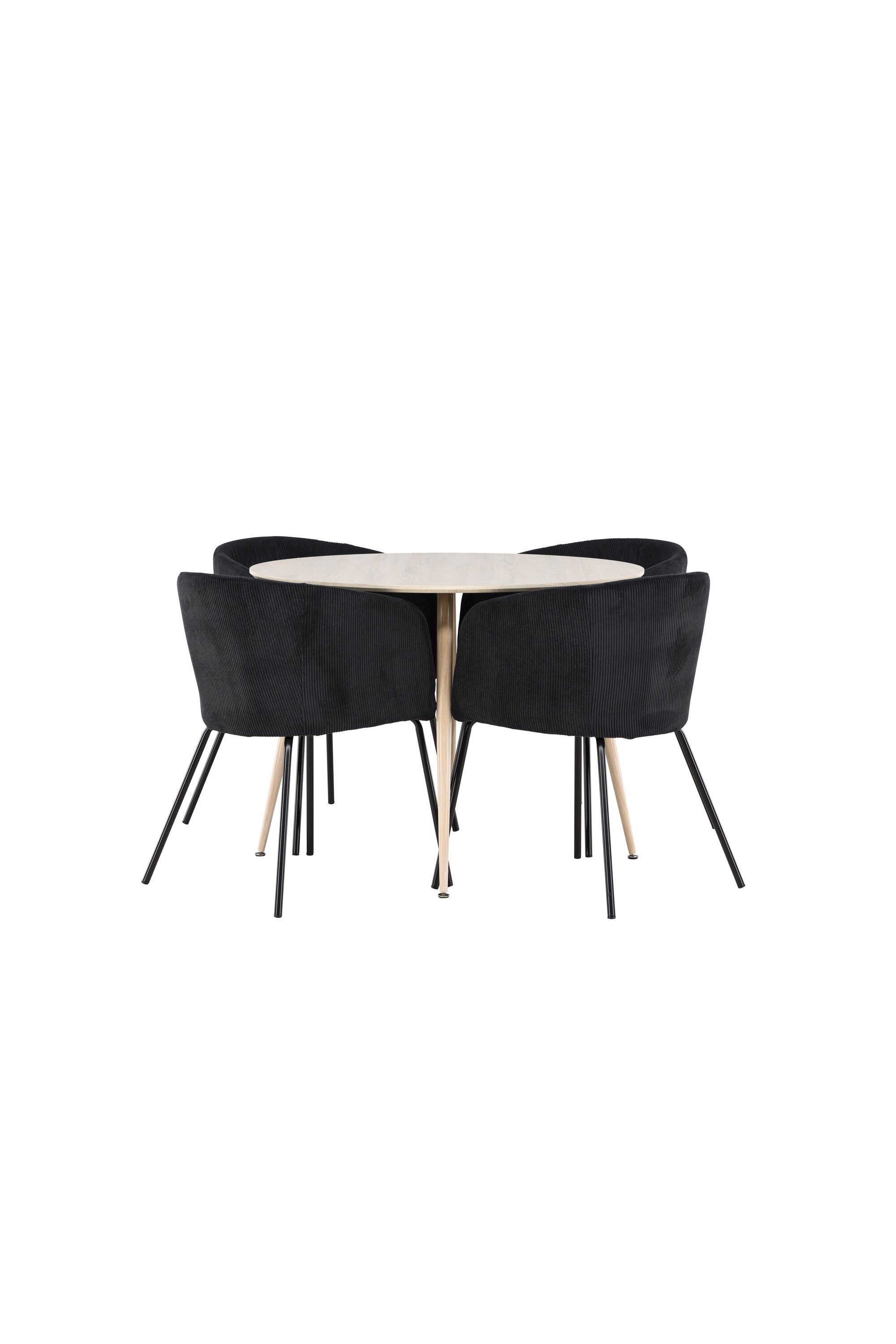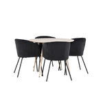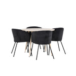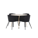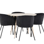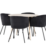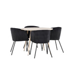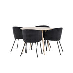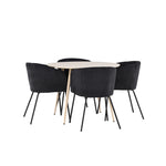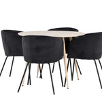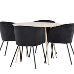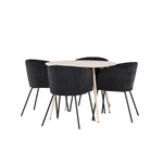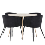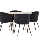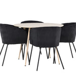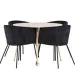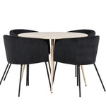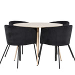 Objevte perfektní jídelní set pro váš domov s jídelním stolem Plaza a jídelními židlemi Berit. Jídelní stůl Plaza s velkorysým průměrem 100 cm je vyroben z odolného MDF materiálu a má bíle pigmentovanou barvu, která dodává místnosti hřejivý a příjemný pocit. Jeho moderní design a čisté linie vytvářejí klidnou a harmonickou atmosféru, díky níž je každé jídlo relaxačním zážitkem. Díky kompaktnímu formátu je Plaza ideální pro menší prostory a zároveň nabízí dostatek prostoru pro pohodlné jídlo s rodinou a přáteli. Doplňte svůj jídelní stůl jídelními židlemi Berit, které lákají k luxusnímu pohodlí a modernímu stylu. Se svým elegantním černým sametovým čalouněním a elegantními černými ocelovými nohami je Berit dokonalou kombinací sofistikovaného designu a pohodlí. Berit zaujme svým širokým sedákem, který poskytuje dostatek prostoru pro pohodlné sezení při jídle nebo dlouhých rozhovorech u jídelního stolu. Jeho moderní vzhled a stylové černé ocelové nohy dodávají Beritu osobitý a stylový charakter, který pozvedne každou jídelnu. Dodejte své jídelně pocit luxusu a modernosti s tímto jídelním setem, který kombinuje styl a funkčnost tím nejlepším způsobem. S jídelním stolem Plaza a jídelními židlemi Berit získáte elegantní a pohodlné řešení pro všechna vaše jídla.