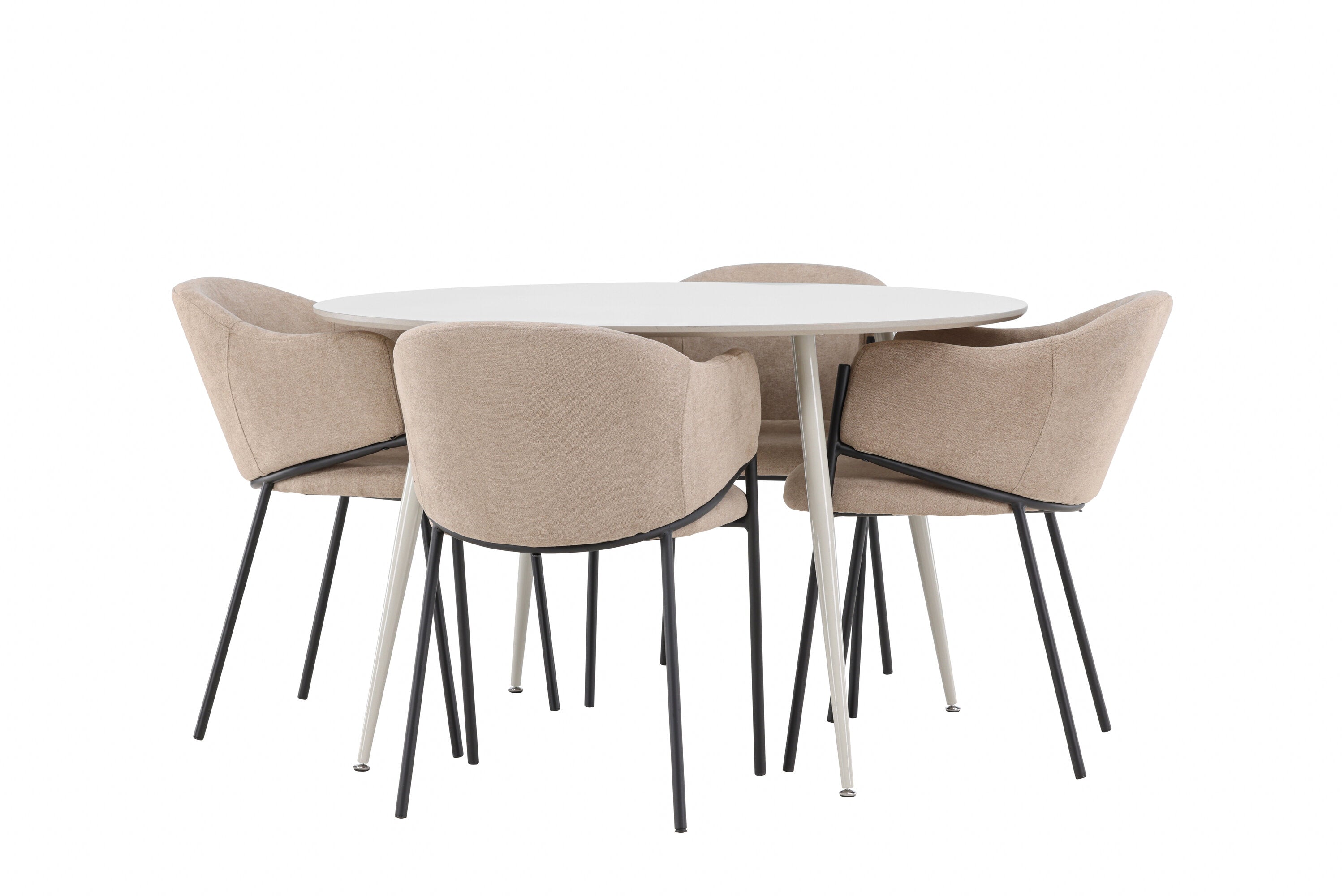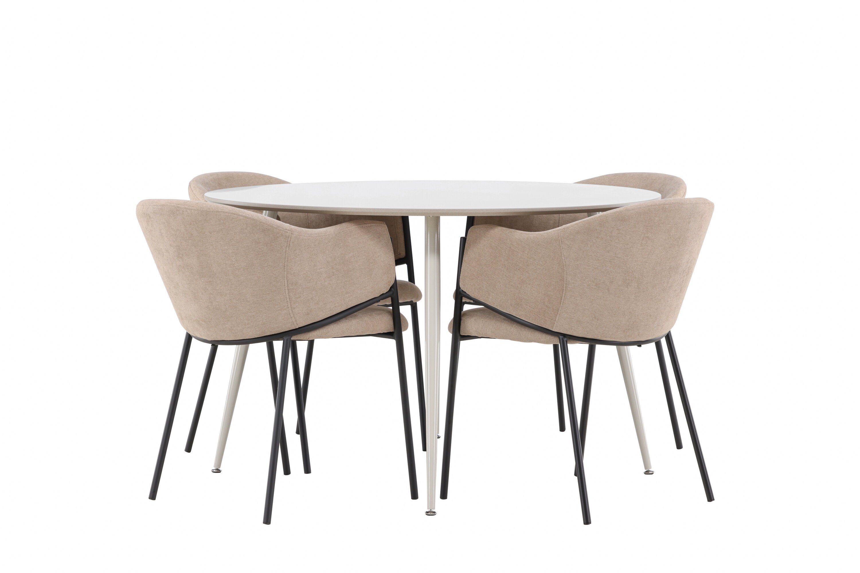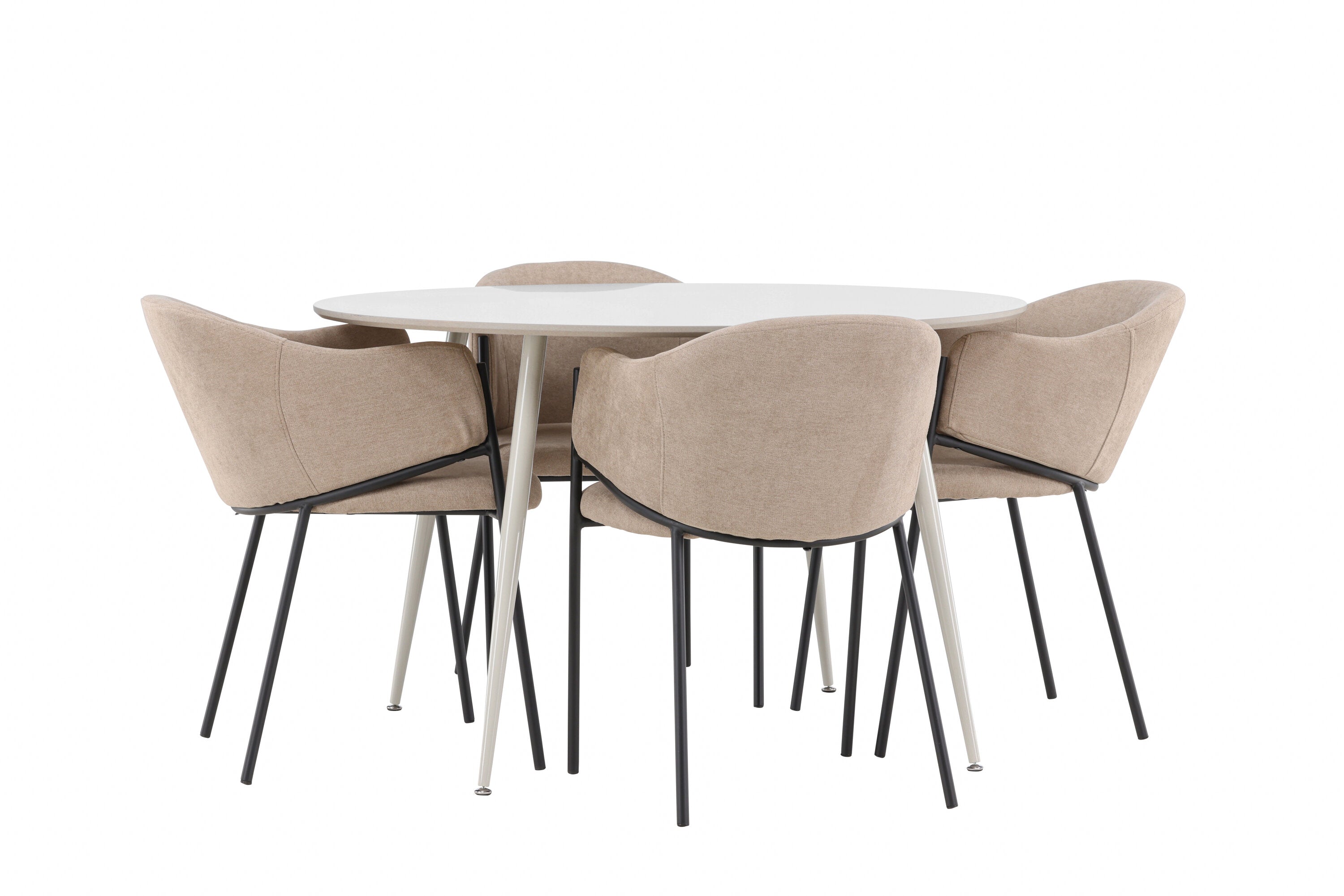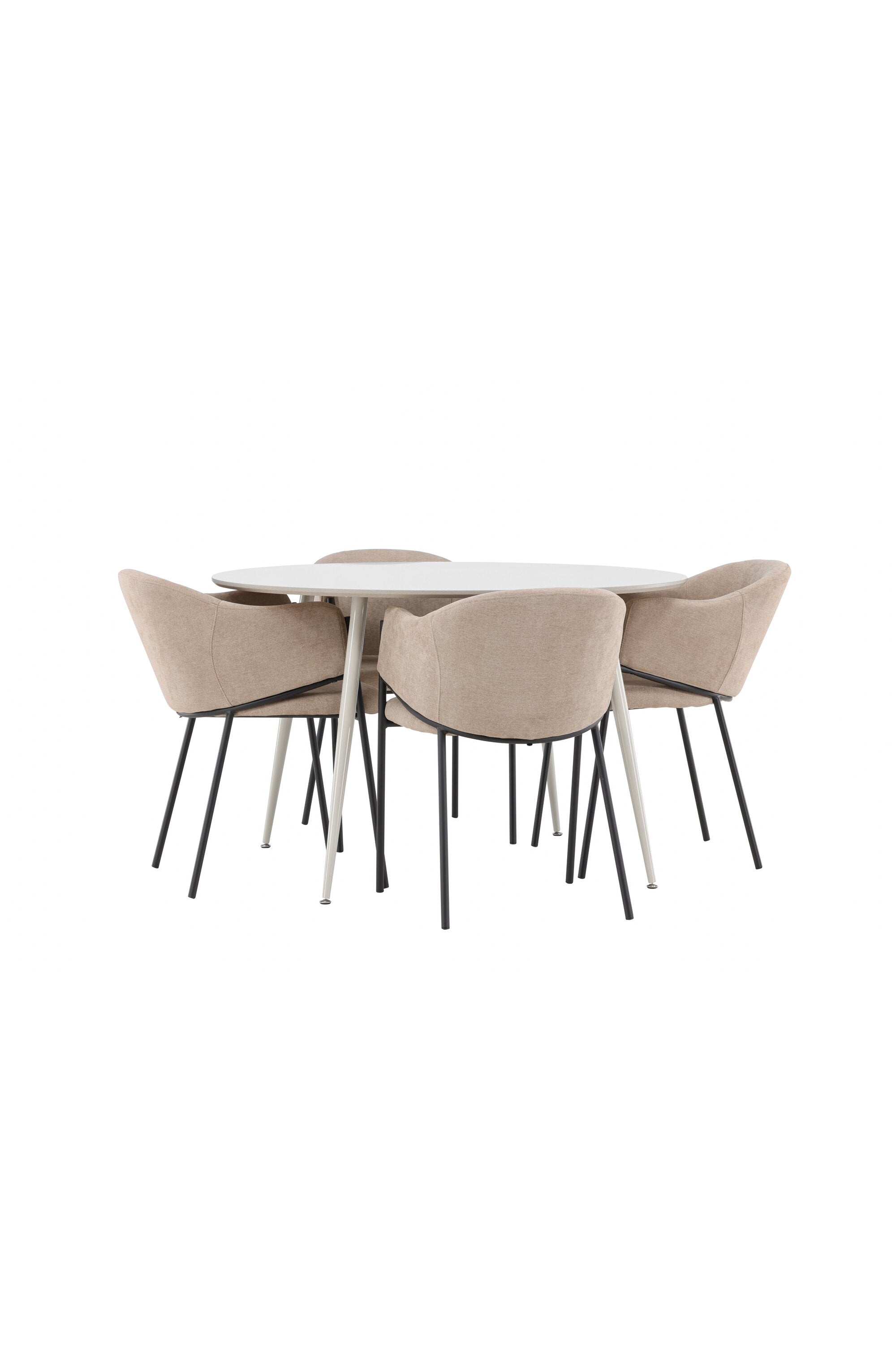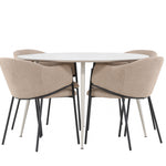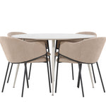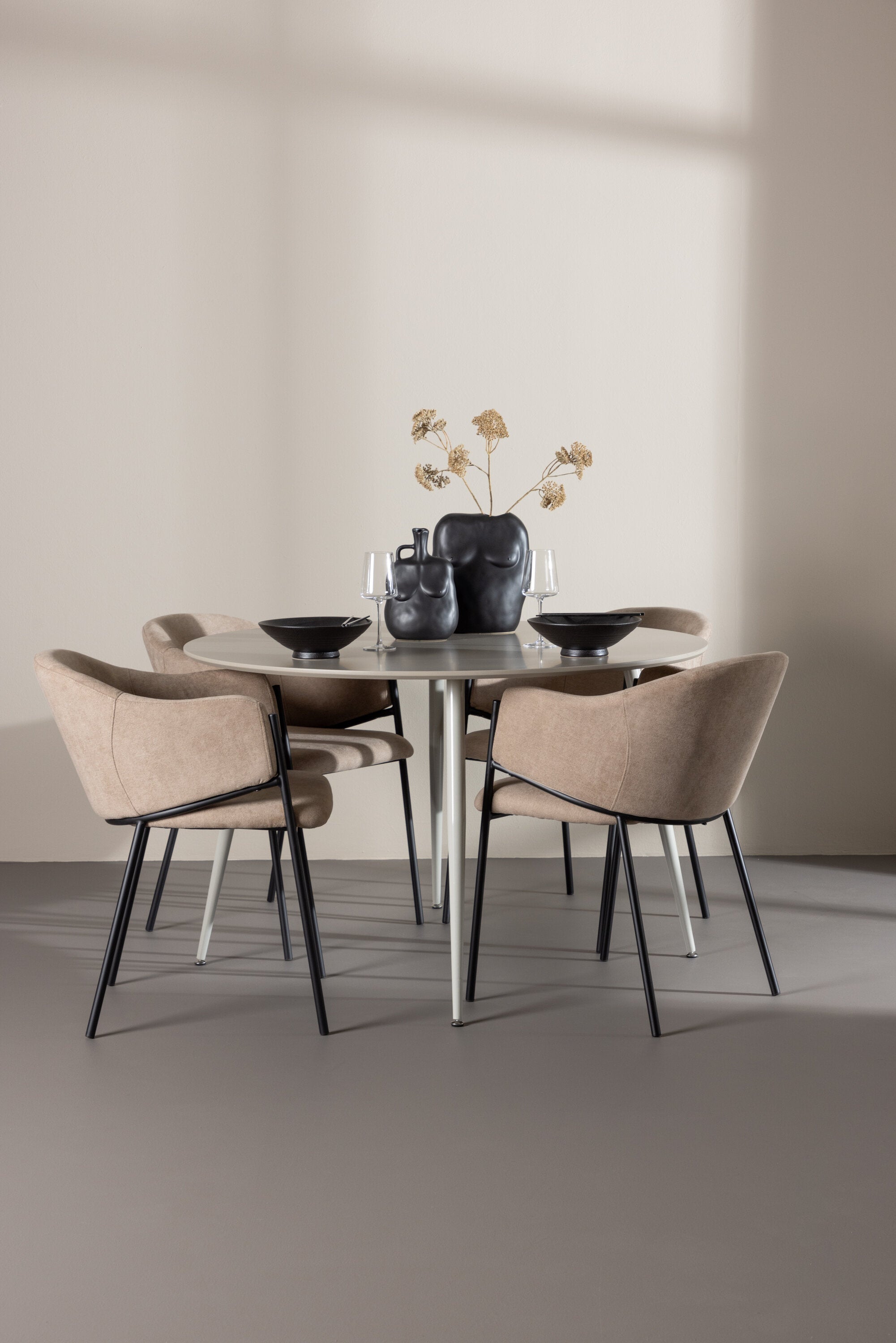 Dodejte své jídelně moderní a elegantní vylepšení s naší stylovou jídelní sadou, která kombinuje sofistikovaný stůl Plaza s pohodlnými židlemi Evelina. Tato jídelní souprava je ideální jak pro každodenní večeři, tak pro zvláštní příležitosti, vytváří příjemnou a harmonickou atmosféru ve vašem domově. Stůl Plaza, vyrobený z MDF, má světle béžovou barvu, která dodá vaší jídelně měkký a hřejivý pocit. Stůl s velkorysým průměrem 120 cm nabízí dostatek prostoru pro jídlo i rozhovory, přičemž jeho kulatý tvar přispívá k vyváženému a útulnému prostředí. Robustní konstrukce stolu zajišťuje dlouhodobé používání a stabilitu. Čtyři židle Evelina skvěle doplňují stůl s elegantními sedáky čalouněnými béžovým lnem a elegantními černými nohami. Tyto židle nabízejí pohodlí i styl, díky čemuž jsou ideální pro dlouhé a příjemné stolování s rodinou a přáteli. Jejich moderní design s vysokými opěradly a pohodlnými sedadly dodá vaší jídelně sofistikovaný a moderní nádech. Tento jídelní set je dokonalou kombinací estetiky a funkčnosti, takže je vynikající volbou pro ty, kteří hledají elegantní a pohodlný jídelní kout. Vylepšete svou jídelnu stylovou kombinací stolu Plaza a židlí Evelina a vytvořte si místo, kde se budou sdílet vzpomínky a radost.