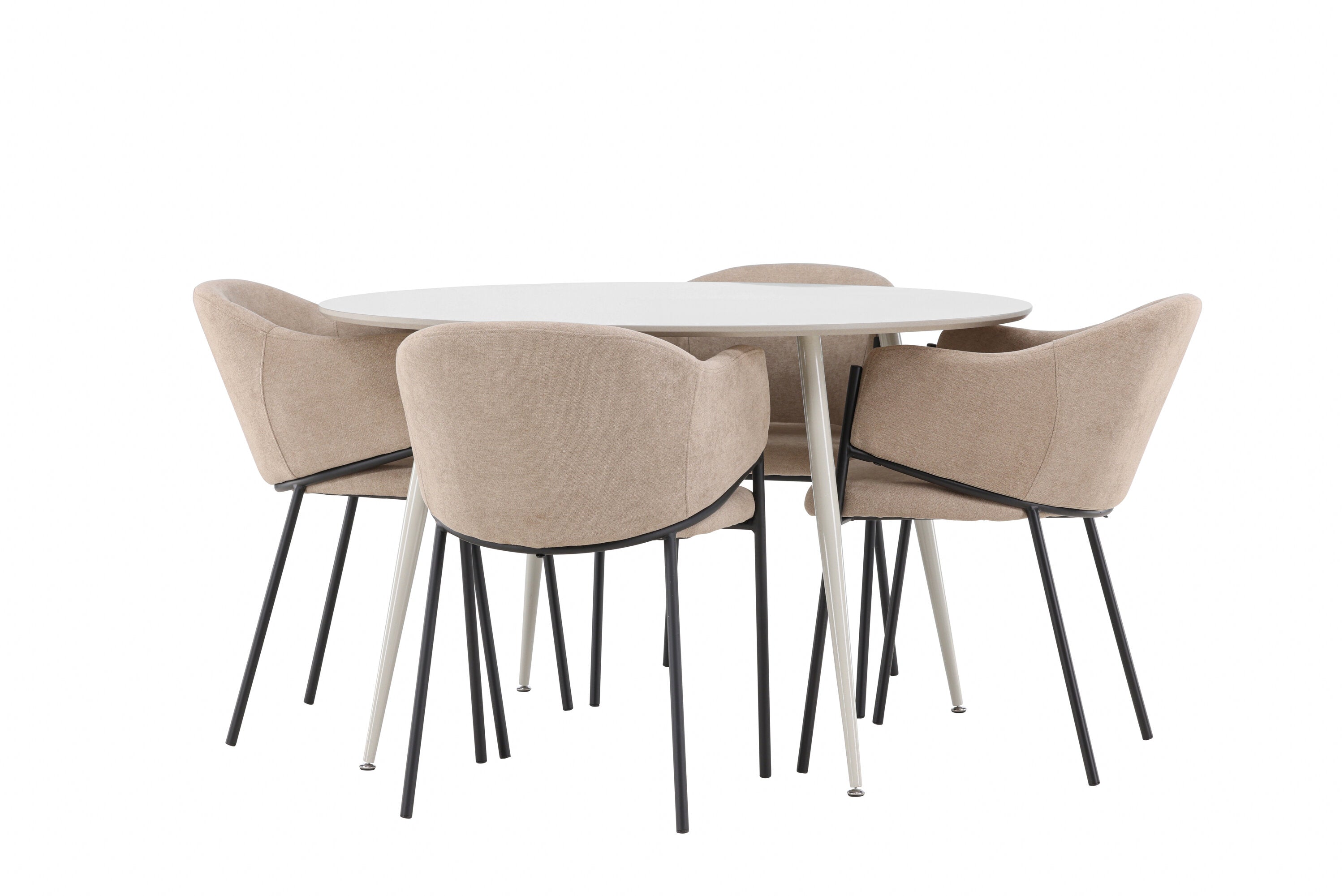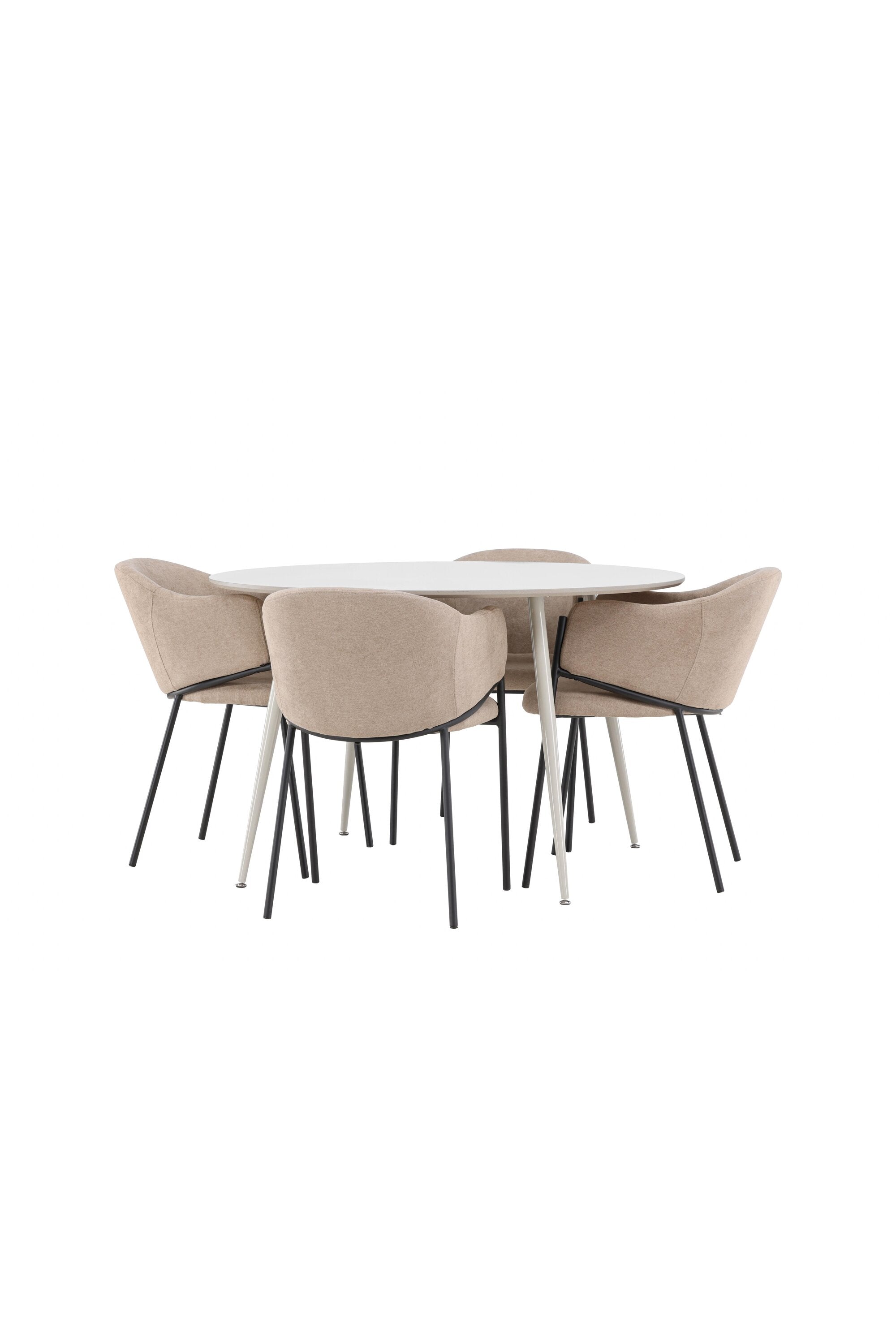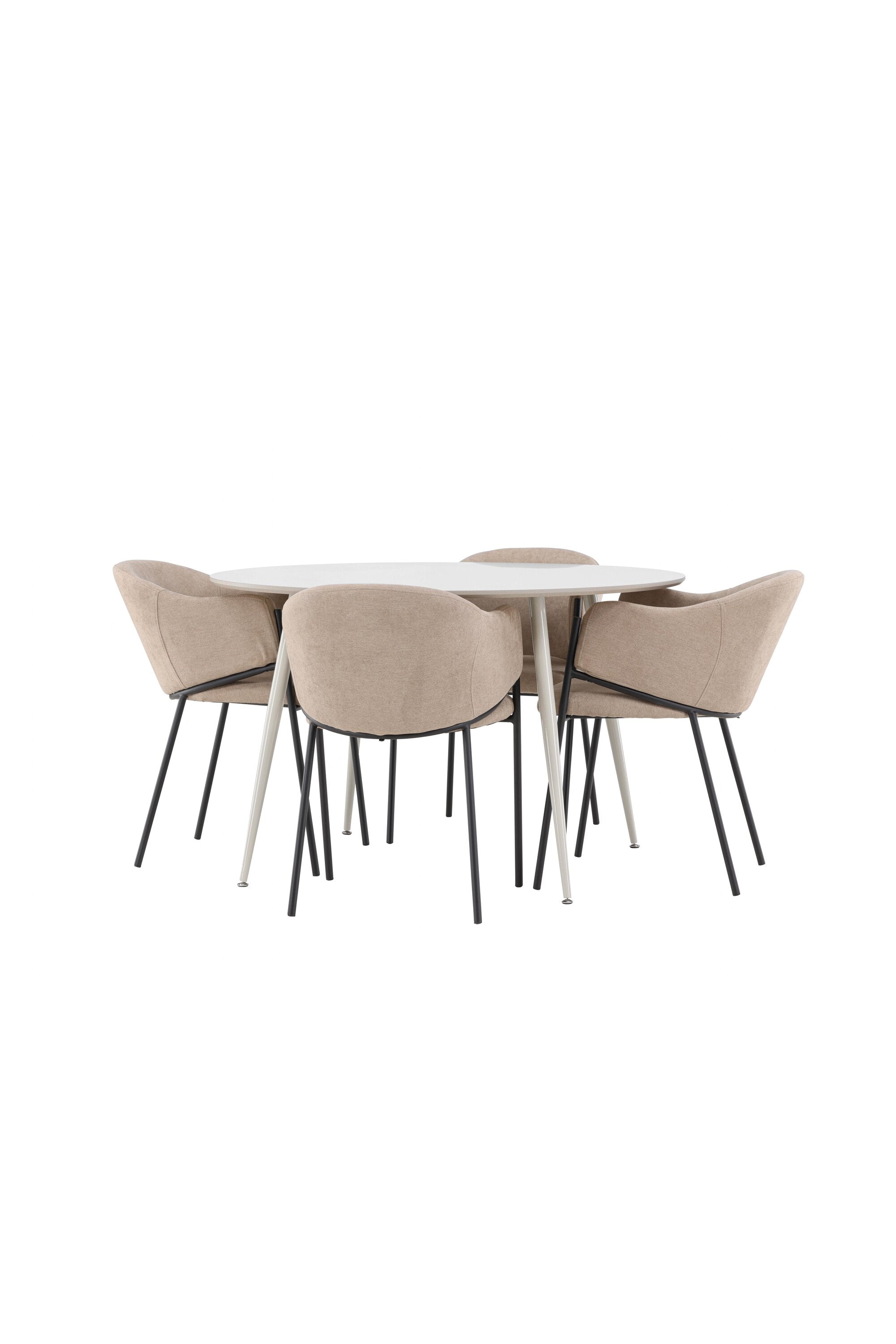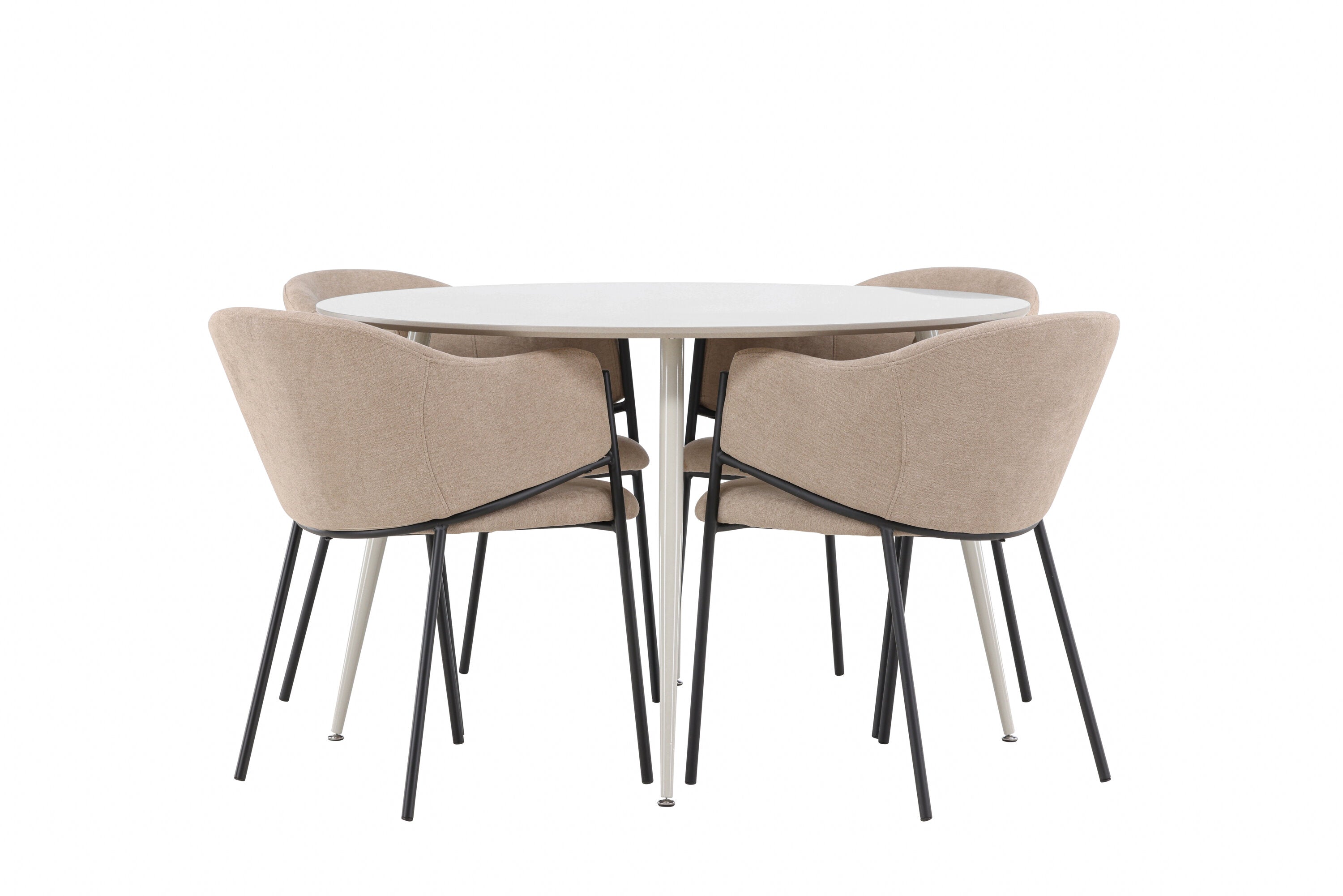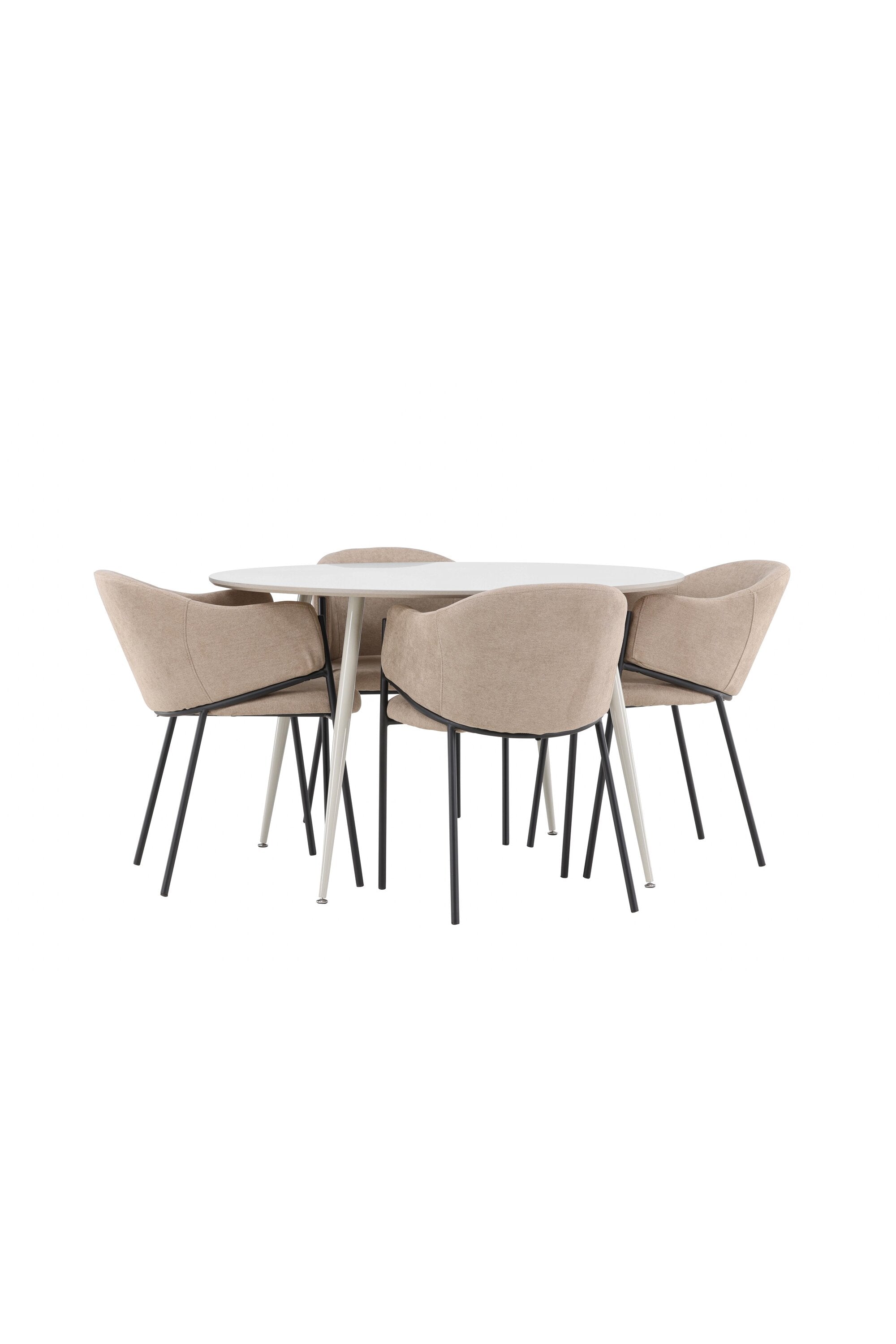 Dodejte své jídelně moderní a elegantní vylepšení s naší stylovou jídelní sadou, která kombinuje sofistikovaný stůl Plaza s pohodlnými židlemi Evelina. Tato jídelní souprava je ideální jak pro každodenní večeři, tak pro zvláštní příležitosti, vytváří příjemnou a harmonickou atmosféru ve vašem domově. Stůl Plaza, vyrobený z MDF, má světle béžovou barvu, která dodá vaší jídelně měkký a hřejivý pocit. Stůl s velkorysým průměrem 120 cm nabízí dostatek prostoru pro jídlo i rozhovory, přičemž jeho kulatý tvar přispívá k vyváženému a útulnému prostředí. Robustní konstrukce stolu zajišťuje dlouhodobé používání a stabilitu. Čtyři židle Evelina skvěle doplňují stůl s elegantními sedáky čalouněnými béžovým lnem a elegantními černými nohami. Tyto židle nabízejí pohodlí i styl, díky čemuž jsou ideální pro dlouhé a příjemné stolování s rodinou a přáteli. Jejich moderní design s vysokými opěradly a pohodlnými sedadly dodá vaší jídelně sofistikovaný a moderní nádech. Tento jídelní set je dokonalou kombinací estetiky a funkčnosti, takže je vynikající volbou pro ty, kteří hledají elegantní a pohodlný jídelní kout. Vylepšete svou jídelnu stylovou kombinací stolu Plaza a židlí Evelina a vytvořte si místo, kde se budou sdílet vzpomínky a radost.
