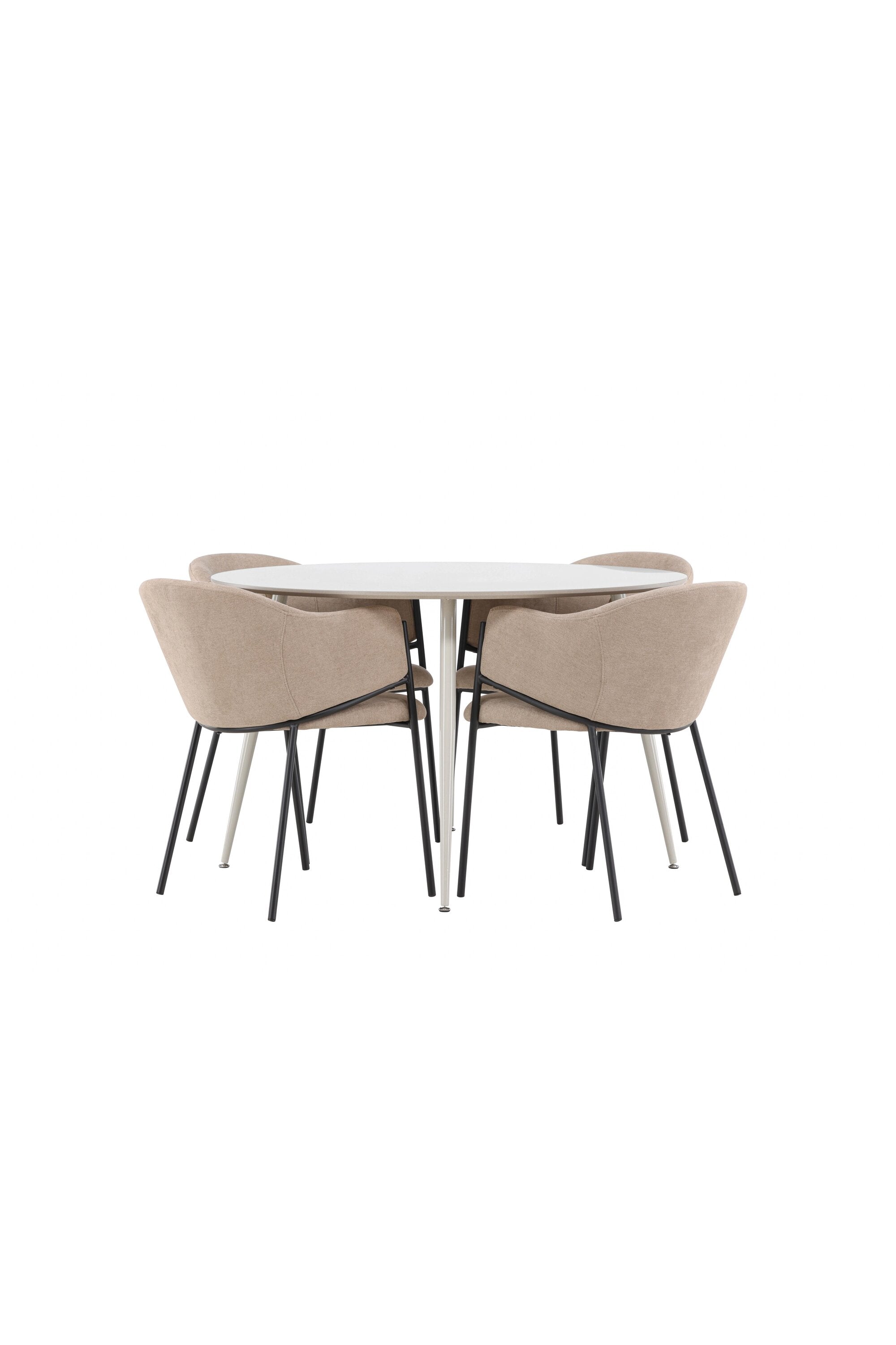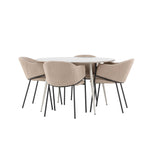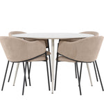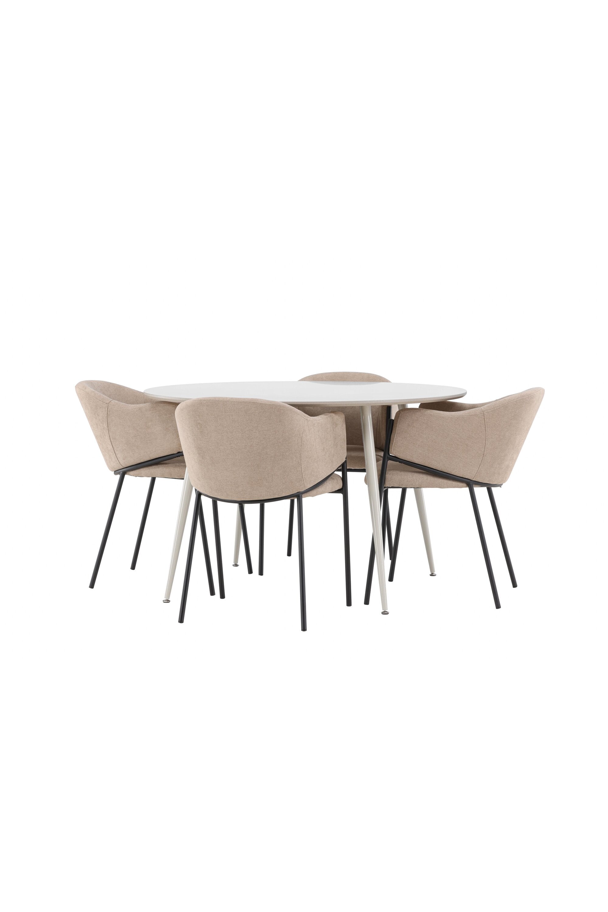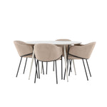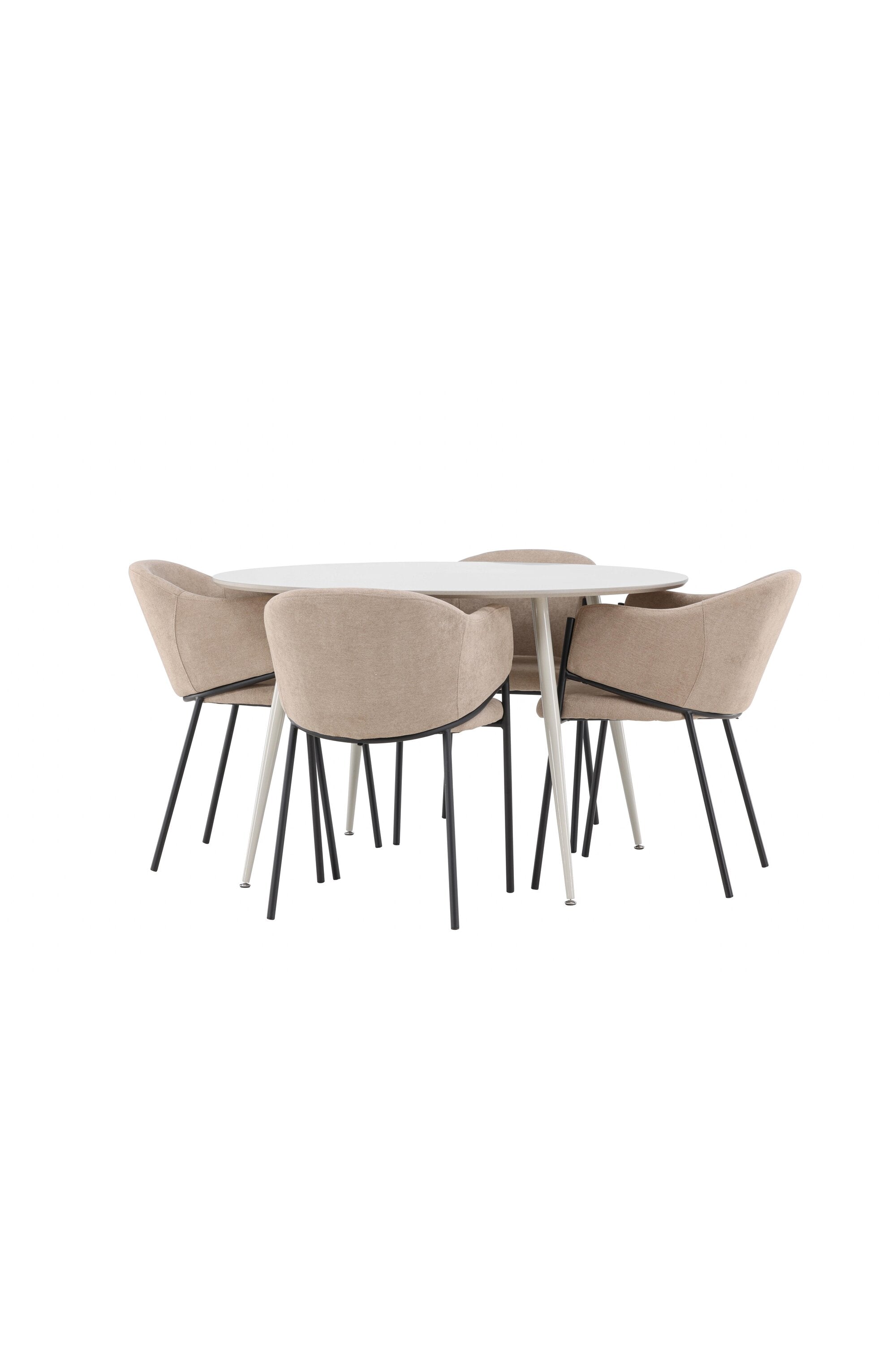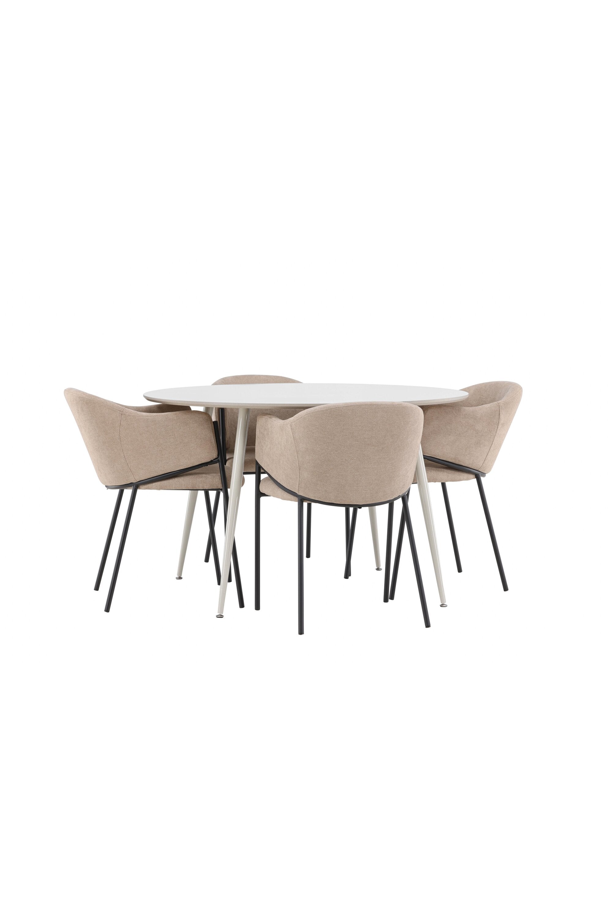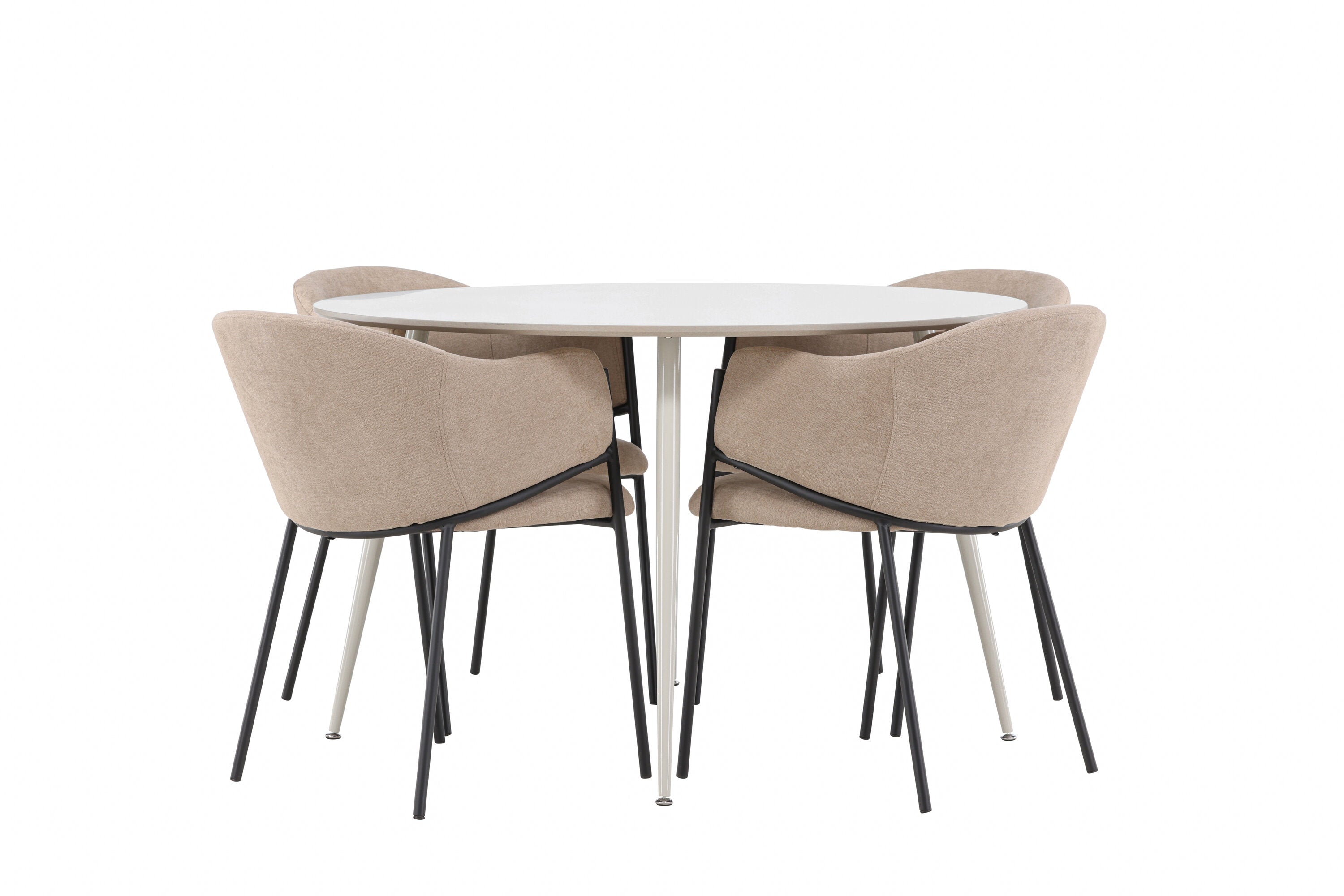 Dodejte své jídelně moderní a elegantní vylepšení s naší stylovou jídelní sadou, která kombinuje sofistikovaný stůl Plaza s pohodlnými židlemi Evelina. Tato jídelní souprava je ideální jak pro každodenní večeři, tak pro zvláštní příležitosti, vytváří příjemnou a harmonickou atmosféru ve vašem domově. Stůl Plaza, vyrobený z MDF, má světle béžovou barvu, která dodá vaší jídelně měkký a hřejivý pocit. Stůl s velkorysým průměrem 120 cm nabízí dostatek prostoru pro jídlo i rozhovory, přičemž jeho kulatý tvar přispívá k vyváženému a útulnému prostředí. Robustní konstrukce stolu zajišťuje dlouhodobé používání a stabilitu. Čtyři židle Evelina skvěle doplňují stůl s elegantními sedáky čalouněnými béžovým lnem a elegantními černými nohami. Tyto židle nabízejí pohodlí i styl, díky čemuž jsou ideální pro dlouhé a příjemné stolování s rodinou a přáteli. Jejich moderní design s vysokými opěradly a pohodlnými sedadly dodá vaší jídelně sofistikovaný a moderní nádech. Tento jídelní set je dokonalou kombinací estetiky a funkčnosti, takže je vynikající volbou pro ty, kteří hledají elegantní a pohodlný jídelní kout. Vylepšete svou jídelnu stylovou kombinací stolu Plaza a židlí Evelina a vytvořte si místo, kde se budou sdílet vzpomínky a radost.